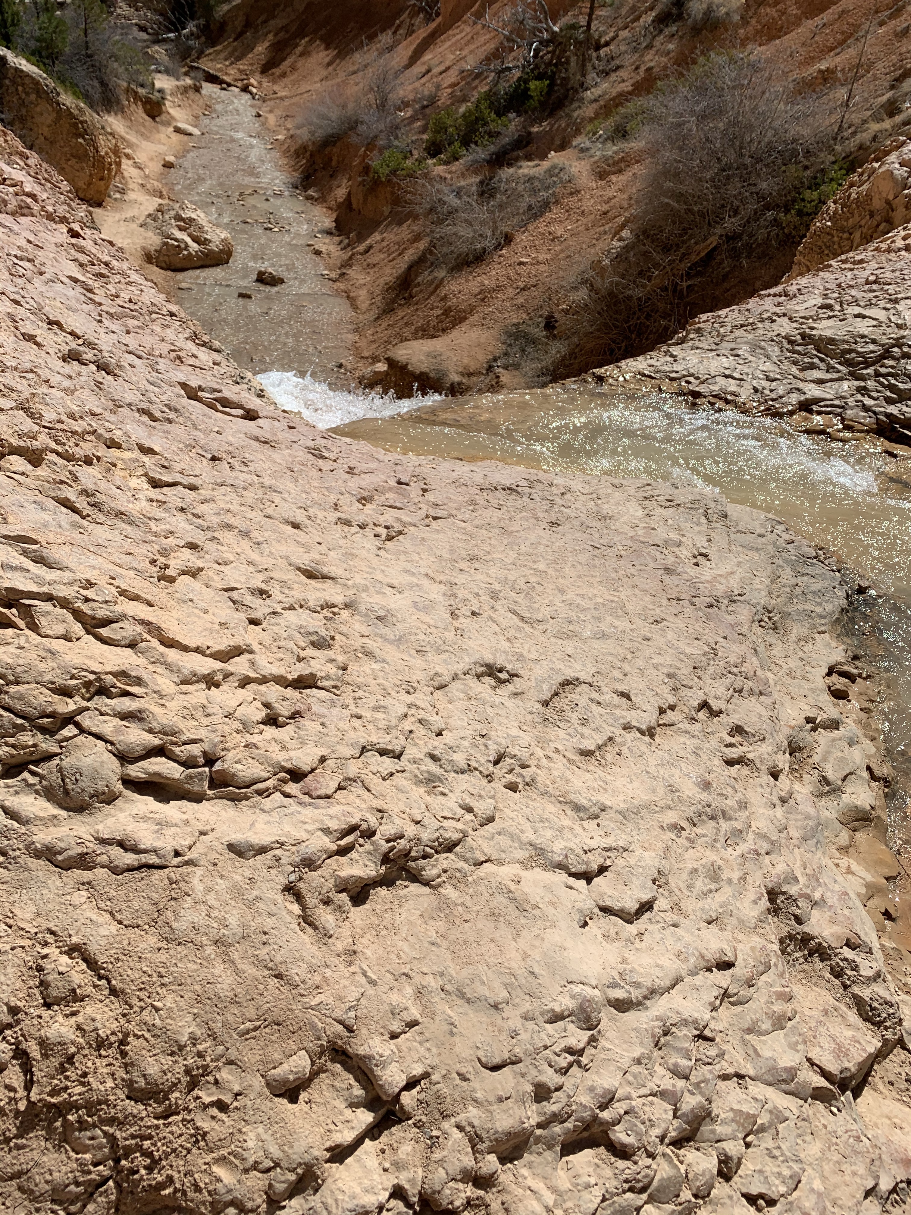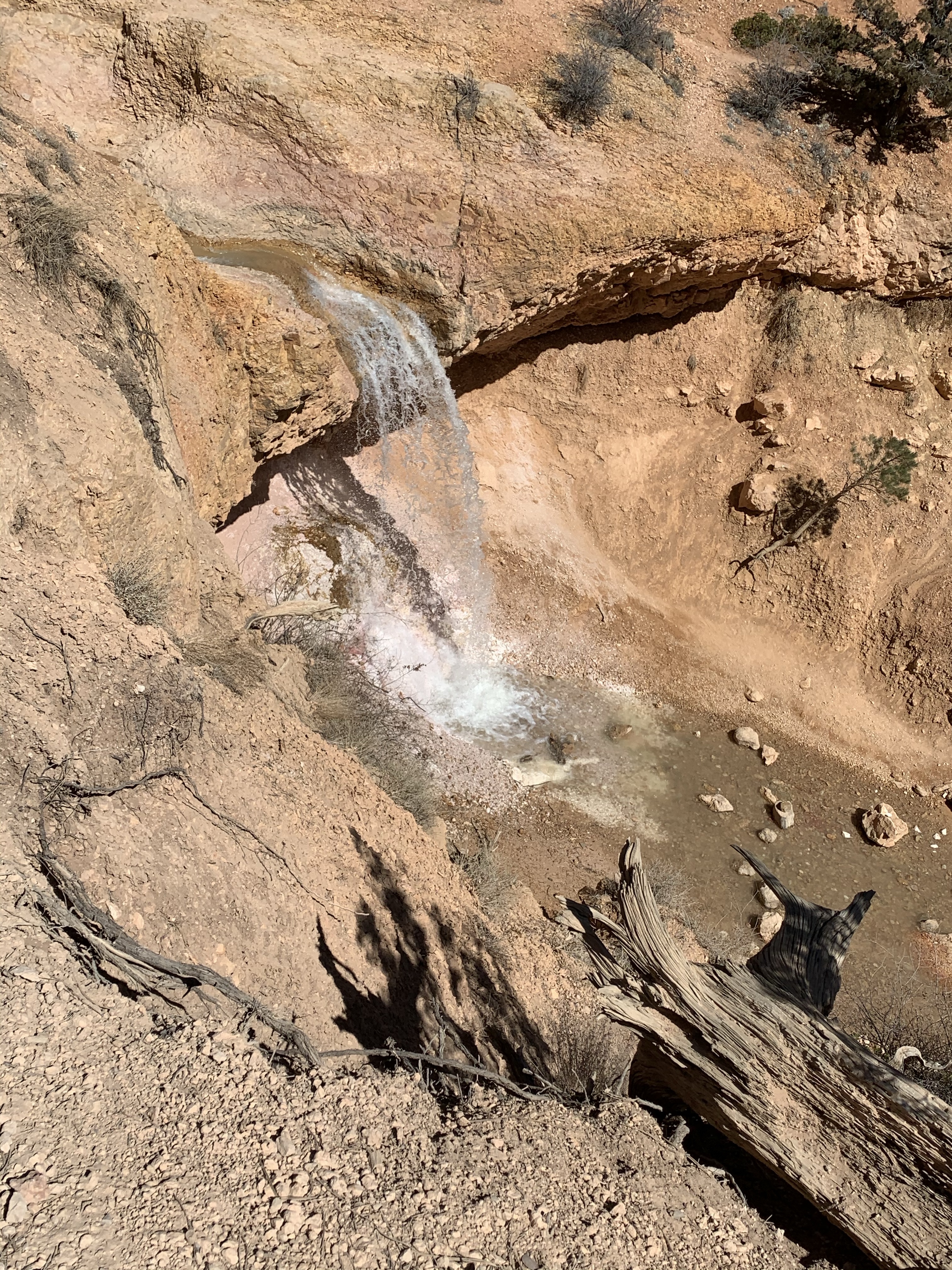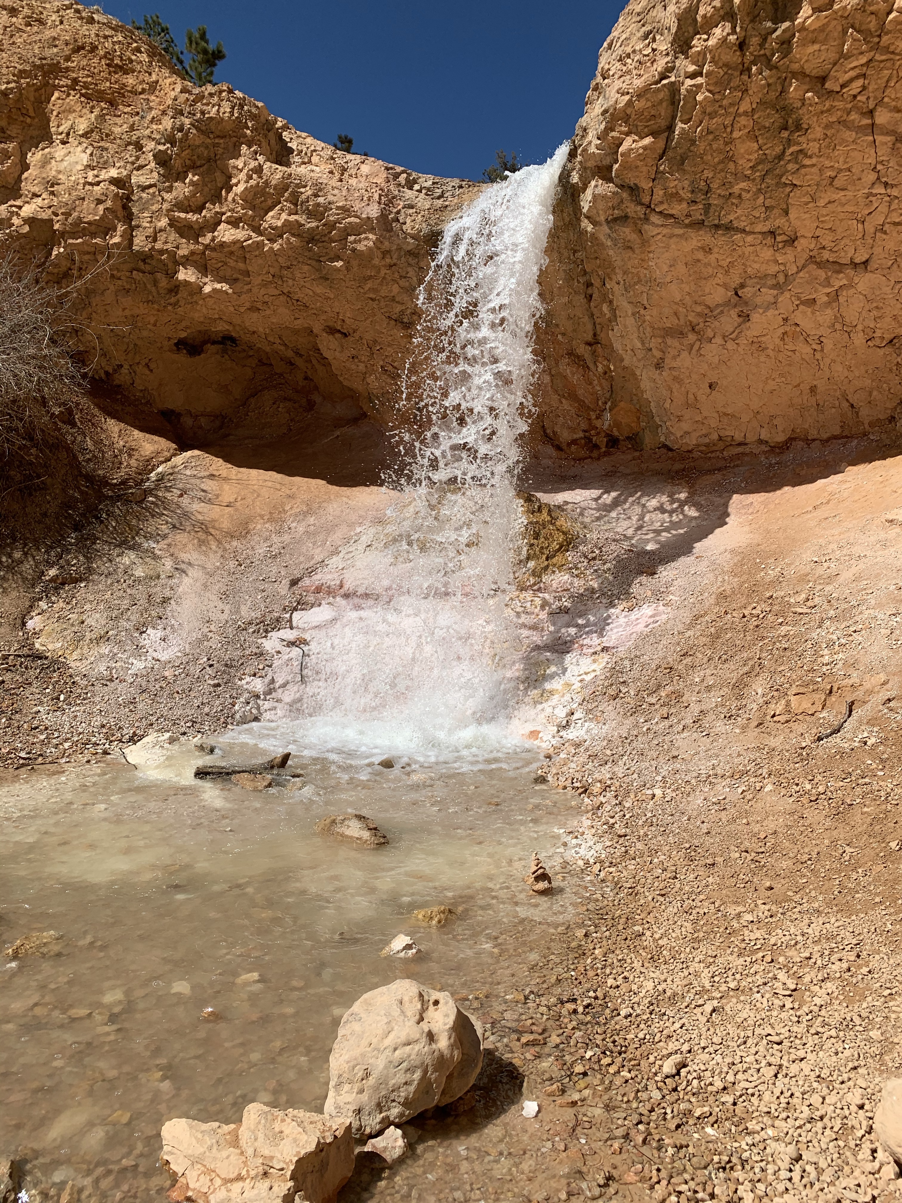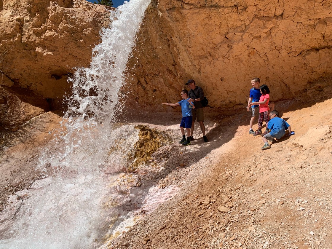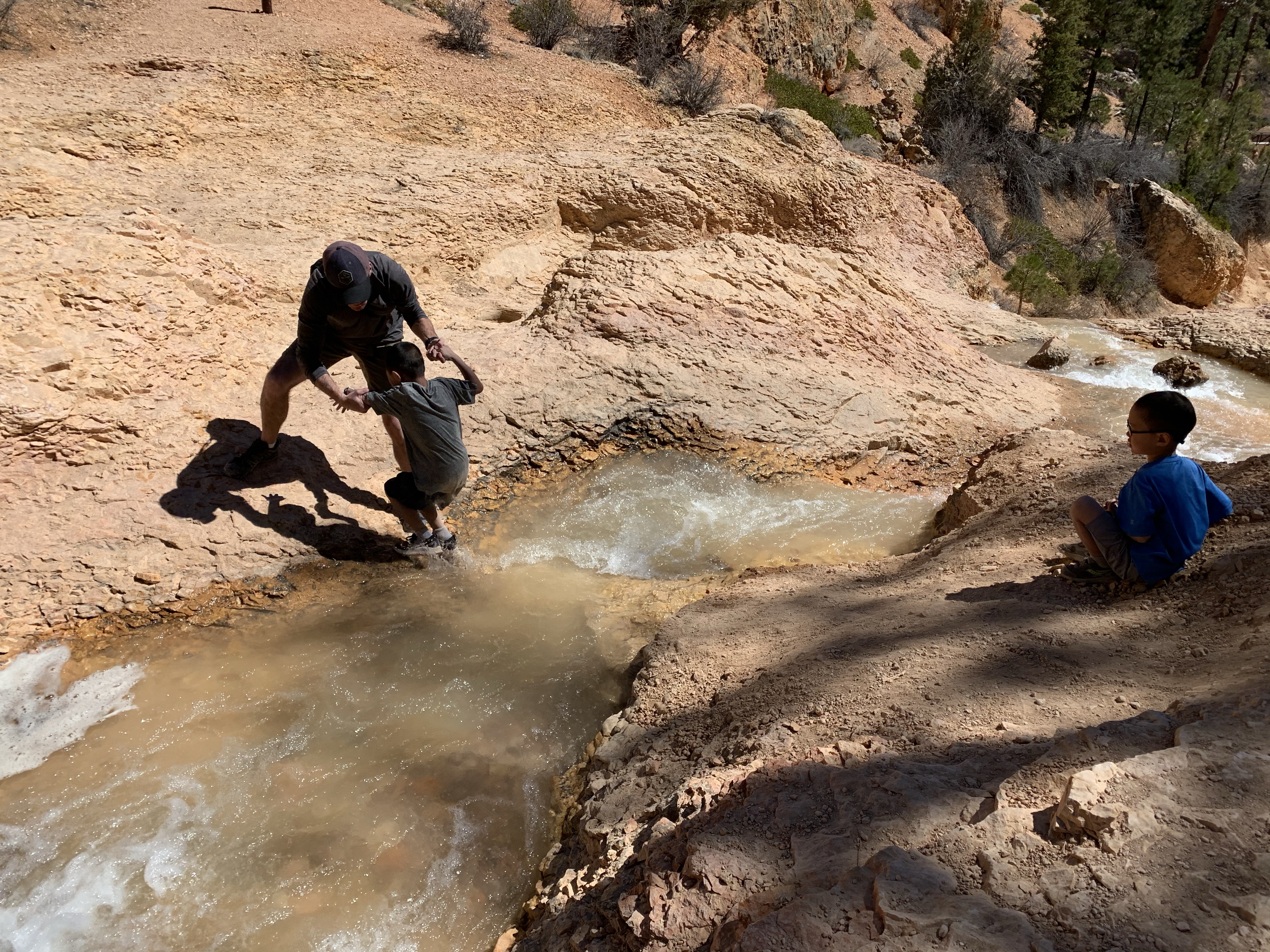 After having an amazing morning hiking at Willis Creek Slot Canyon on our way back to the cabin we stopped on the edge of Bryce Canyon and hiked the Mossy Cave Trail. It is within the National Park but not through the main entrance. We had already hiked 5 miles at Willis Creek so this was a nice hike a little over 2 miles which everyone enjoyed. It was a warm afternoon, high 60s/low 70s. The hike goes up to a cave that still had snow and ice in it but is a spring that feeds mosses and ferns year round. Caedmon really enjoyed that part. Then we followed the trail back down to the Tropic Ditch which was built years ago as a water passage to get water to the little town of Tropic and followed it along to a waterfall. We climbed up to the top of the water fall and crossed the river up there and saw some hoodoos. We then meandered back down the trail and walked along another trail along the water path up to the underside of the waterfall. It was a great little trail to explore and have fun with.