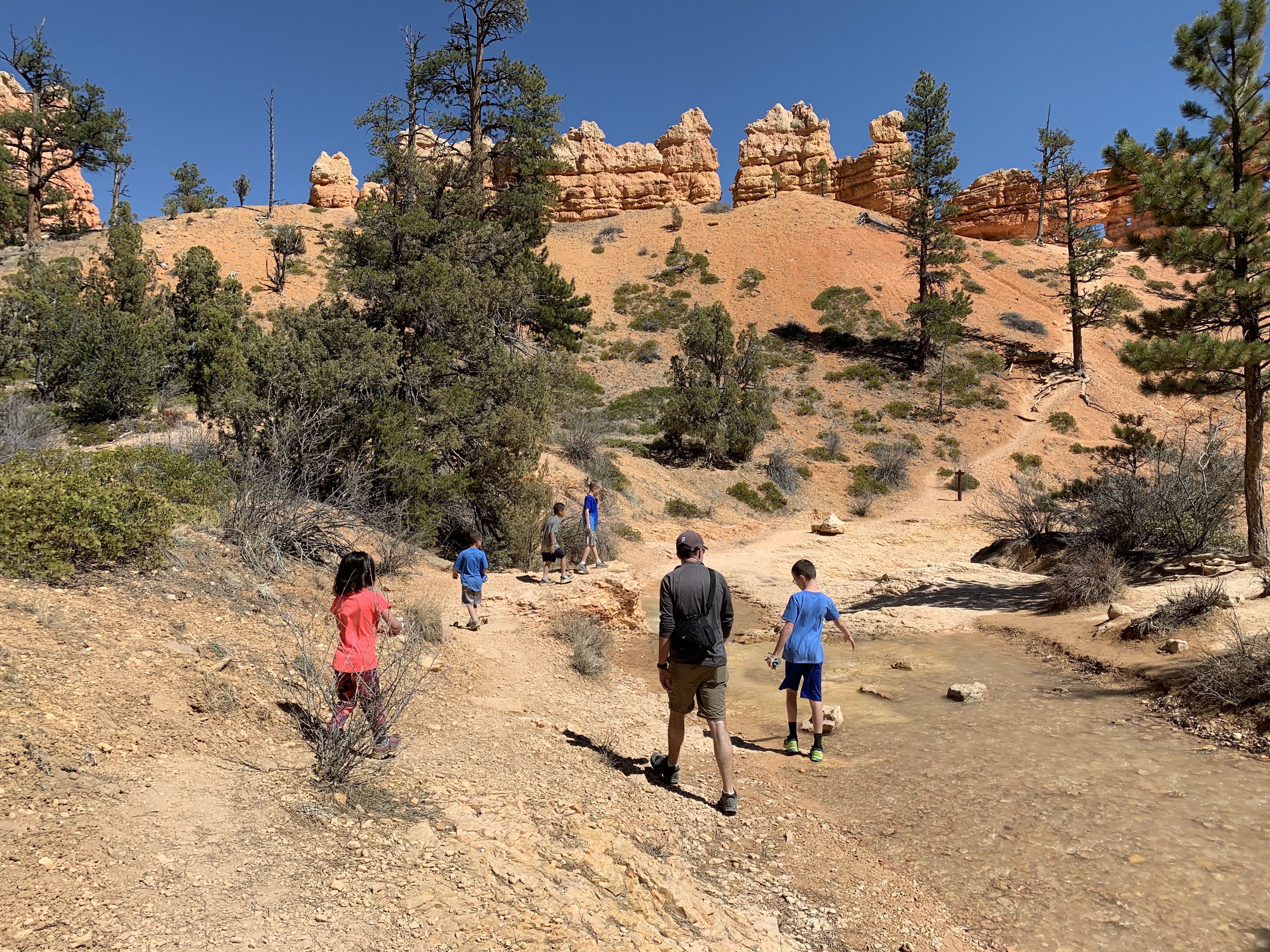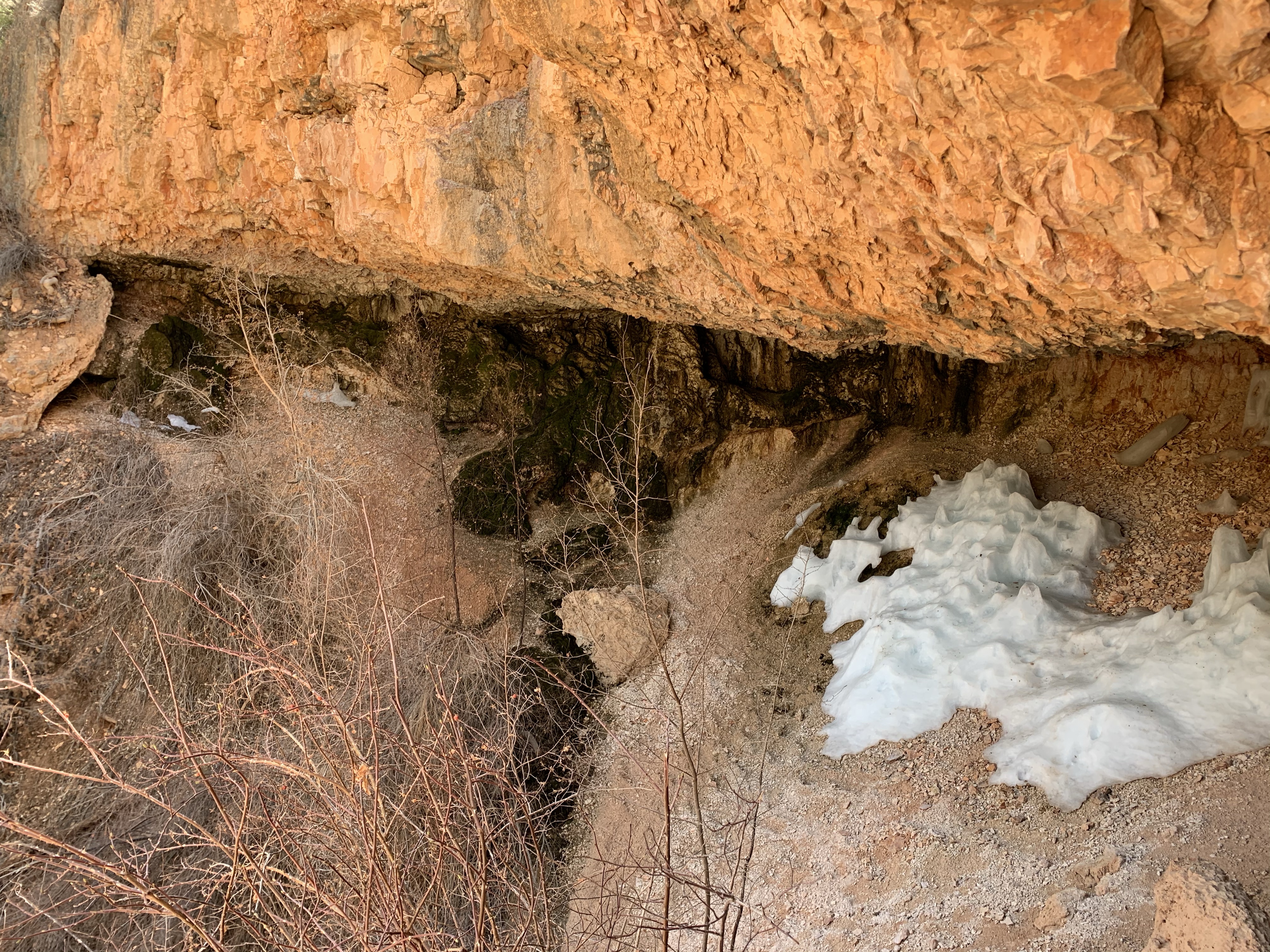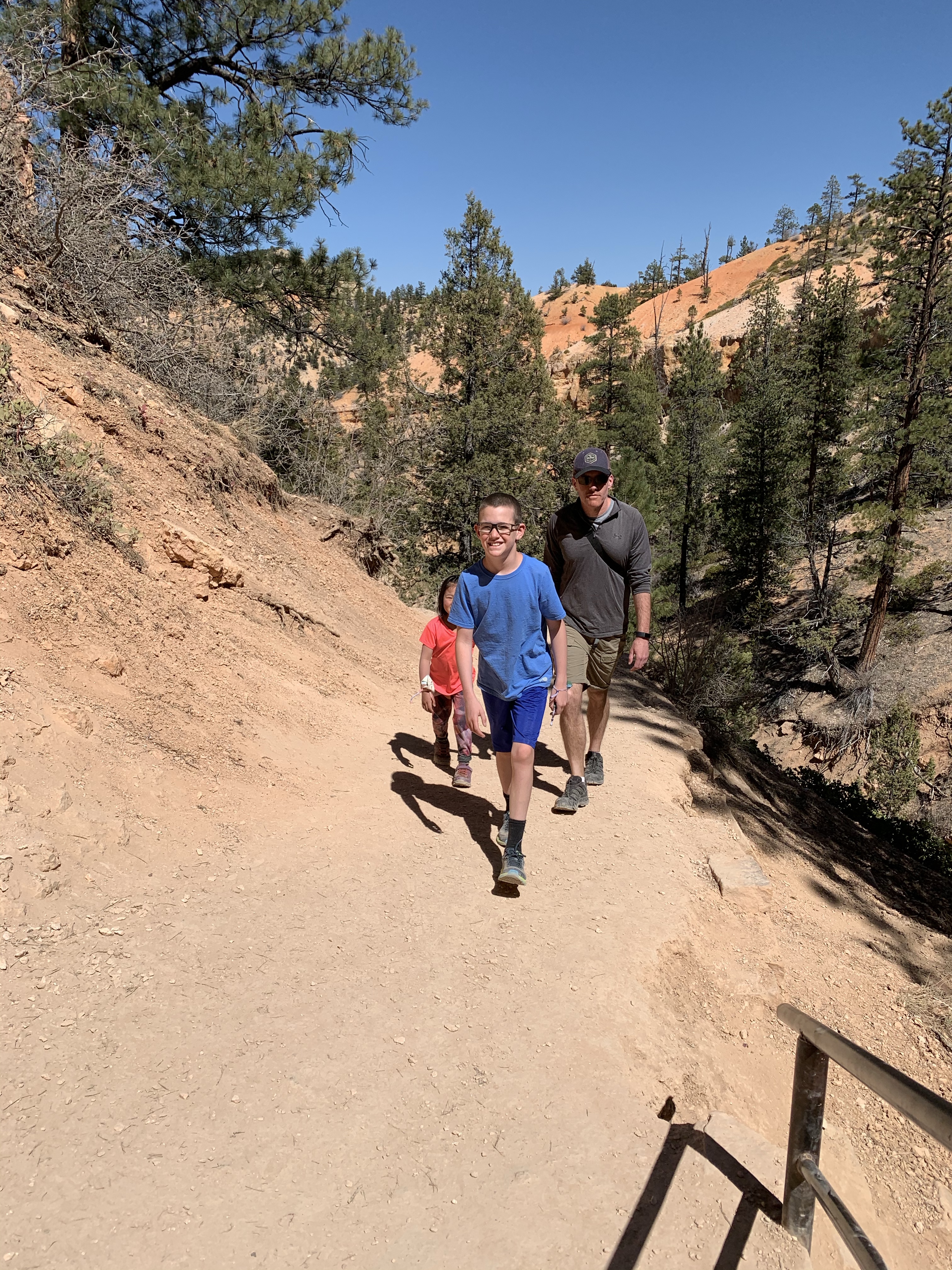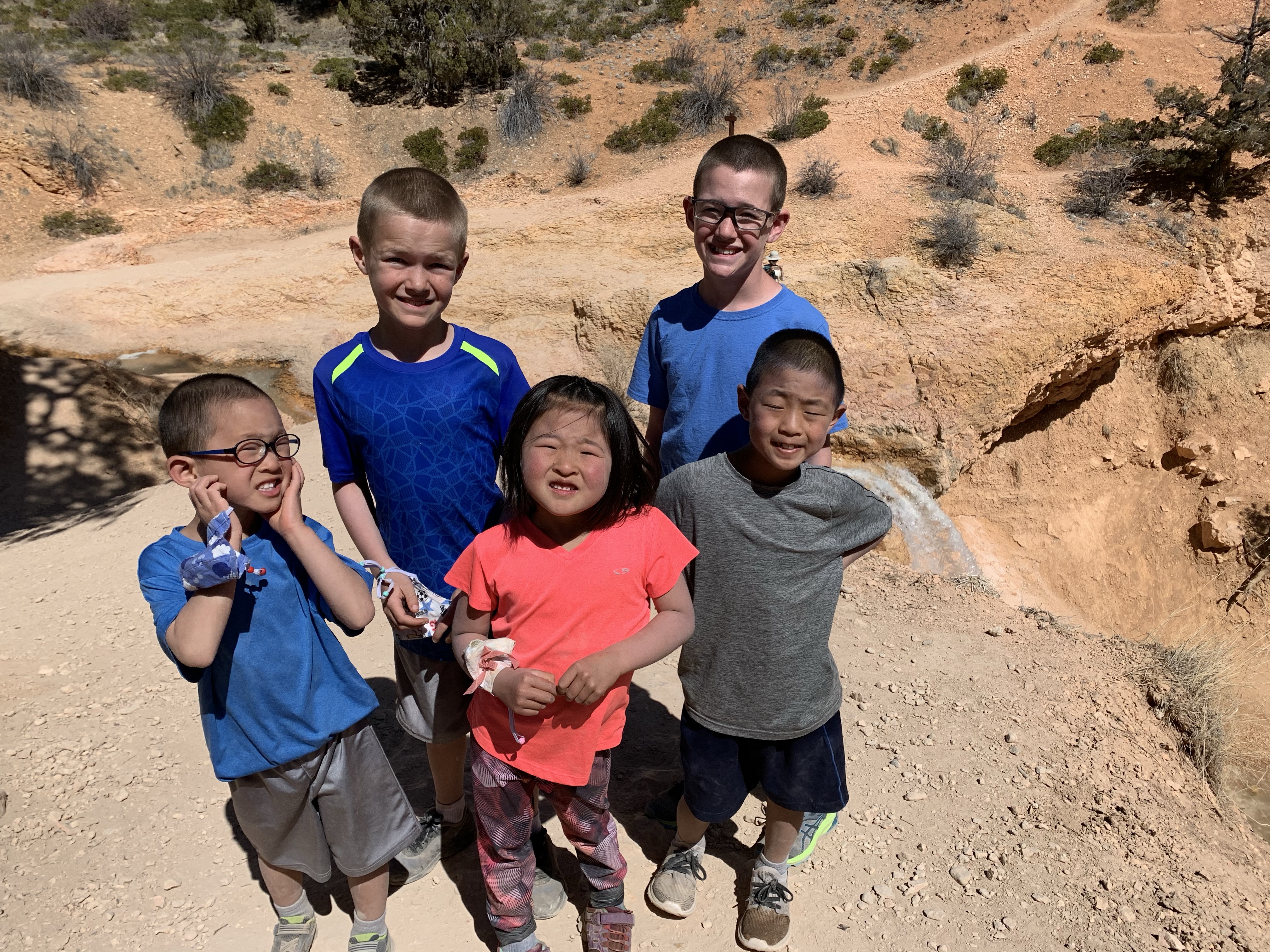 After having an amazing morning hiking at Willis Creek Slot Canyon on our way back to the cabin we stopped on the edge of Bryce Canyon and hiked the Mossy Cave Trail. It is within the National Park but not through the main entrance. We had already hiked 5 miles at Willis Creek so this was a nice hike a little over 2 miles which everyone enjoyed. It was a warm afternoon, high 60s/low 70s. The hike goes up to a cave that still had snow and ice in it but is a spring that feeds mosses and ferns year round. Caedmon really enjoyed that part. Then we followed the trail back down to the Tropic Ditch which was built years ago as a water passage to get water to the little town of Tropic and followed it along to a waterfall. We climbed up to the top of the water fall and crossed the river up there and saw some hoodoos. We then meandered back down the trail and walked along another trail along the water path up to the underside of the waterfall. It was a great little trail to explore and have fun with.