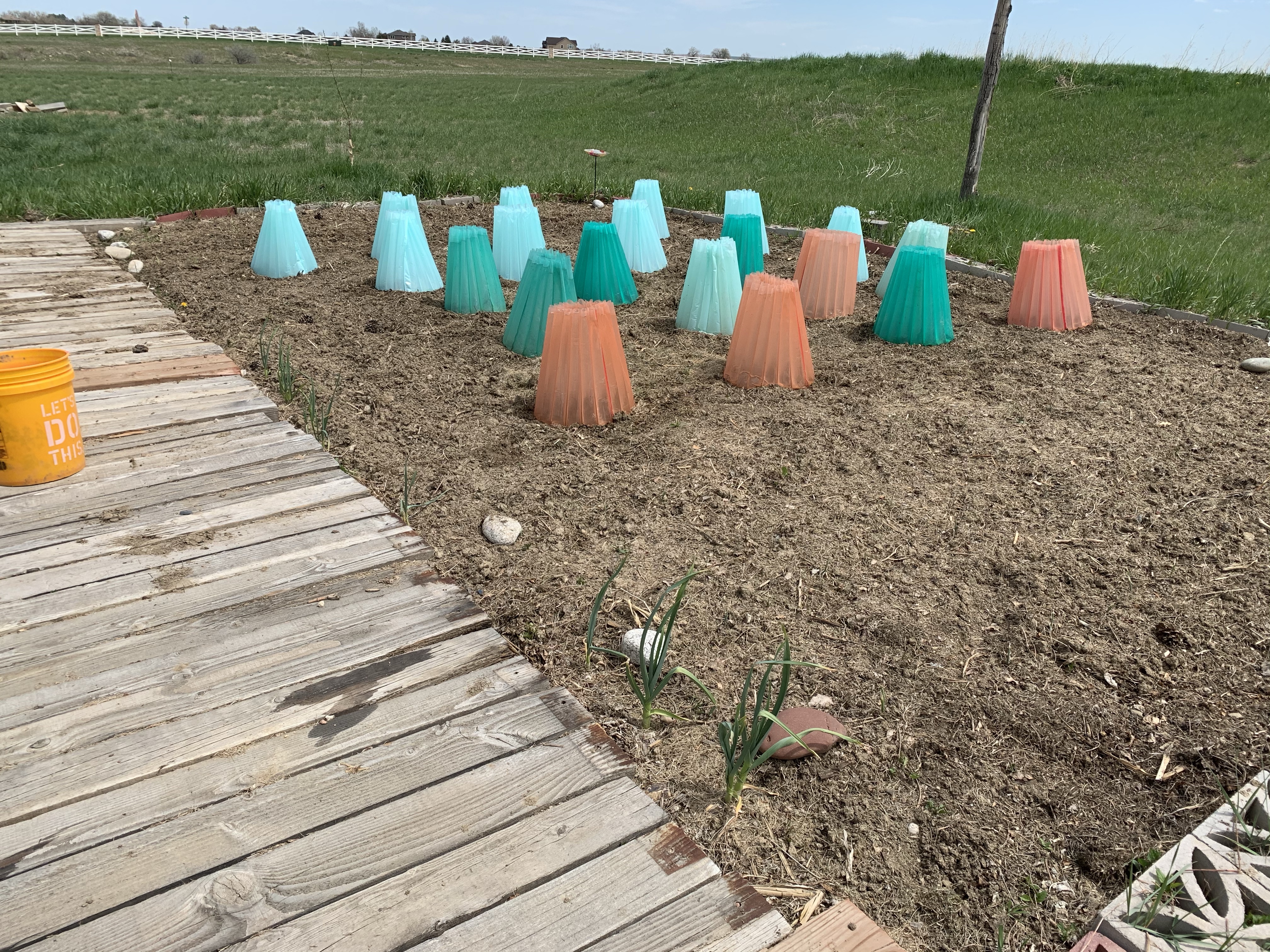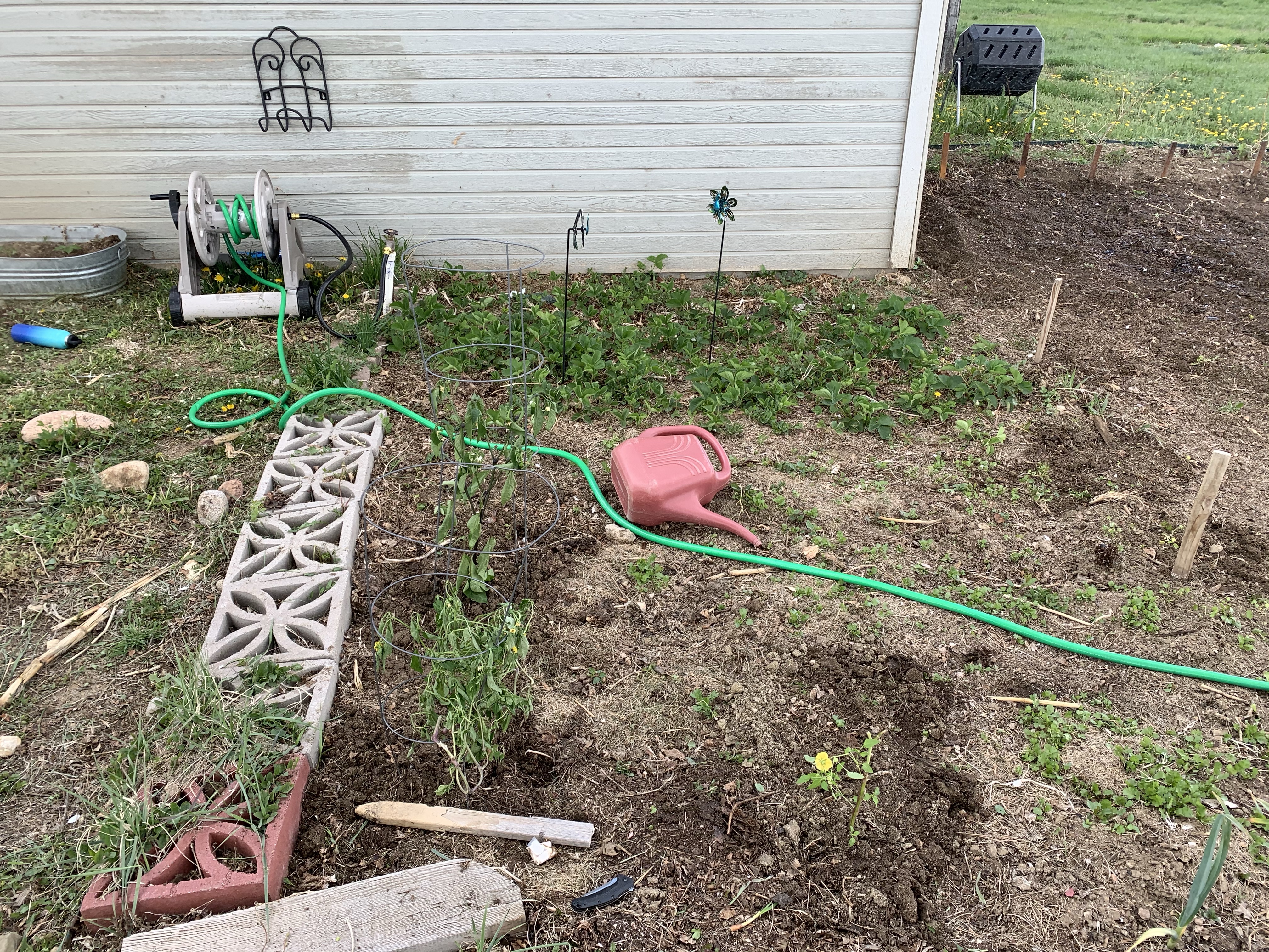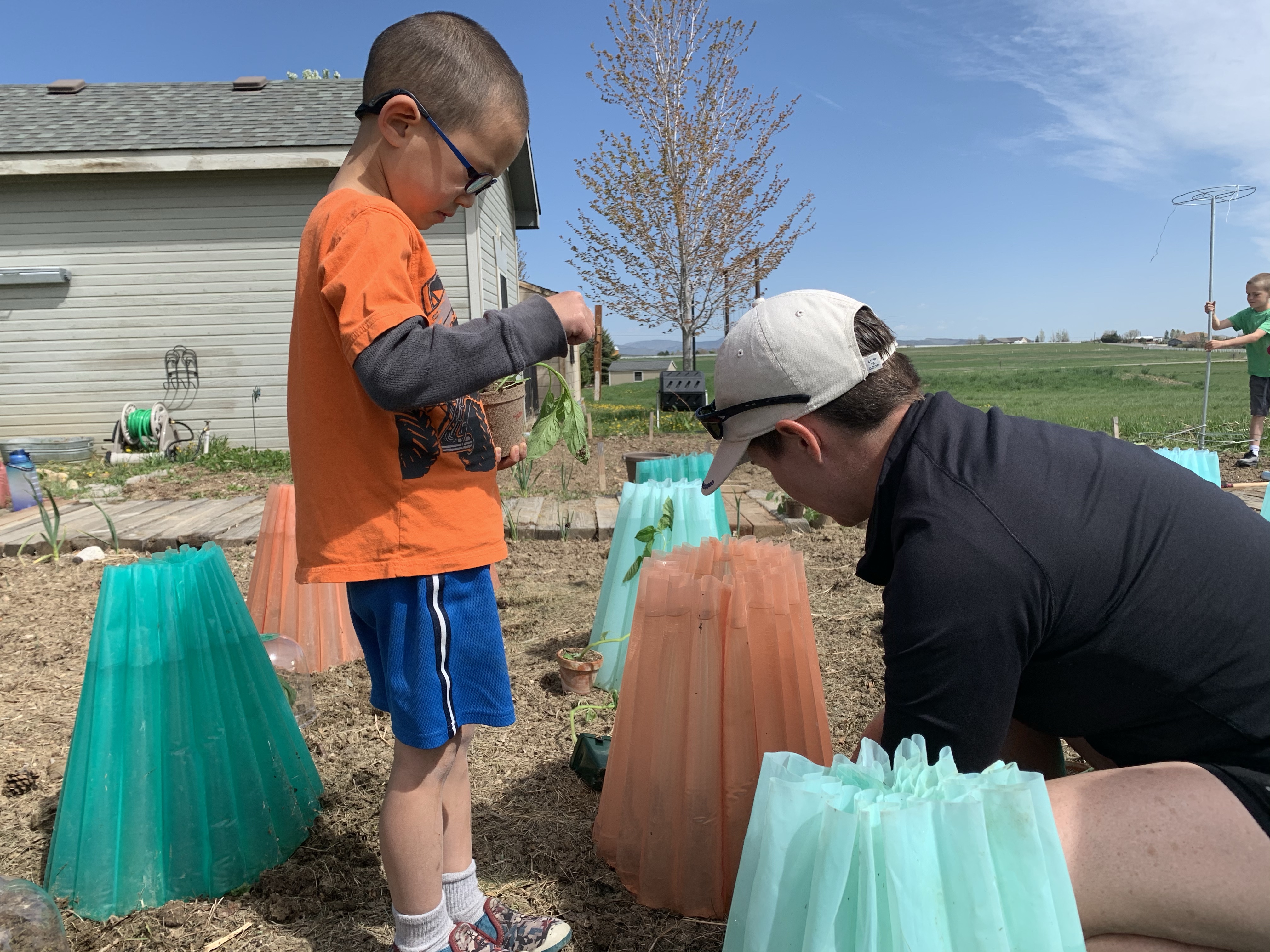Saturday was gorgeous and so it was time to plant my garden. I started tomatillo plants and peppers and kale inside weeks ago and they really took off. I love gardening and told Clint for Mother’s Day I just wanted a chance to get my garden all planted. We set up our walls of water for the tomatillos the day before so they were ready and then got all my peppers and everything moved outside. Our sweet little friends Brooklyn and Olivia joined us for the planting which was super fun as well. I found some new little pepper covers to act as mini greenhouses for them and the kids helped put each one on as we planted their plants. Unfortunately just as we were finishing up the planting of the peppers and tomatillos and getting ready to plant all the seeds one of my bees, who I think was upset because I had moved their water station out of the middle of the garden where it had been all winter, stung Caedmon and then shortly there after another bee stung Clint. We moved everyone to the front yard at that time and our sweet friends headed home. Clint got the kids lunch and I ventured back out to the garden and the bees left me alone and I got the beans, corn, lettuce, carrots, cucumbers, zucchini, and watermelon all planted. Of course a snow storm moved in Sunday evening so just before that started I got every bucket I could find to cover all my peppers and kale plants. And when I was finally able to take the buckets all down on Wednesday everything looked really good and survived the May snow storm. I’m looking forward to tending my garden this summer.