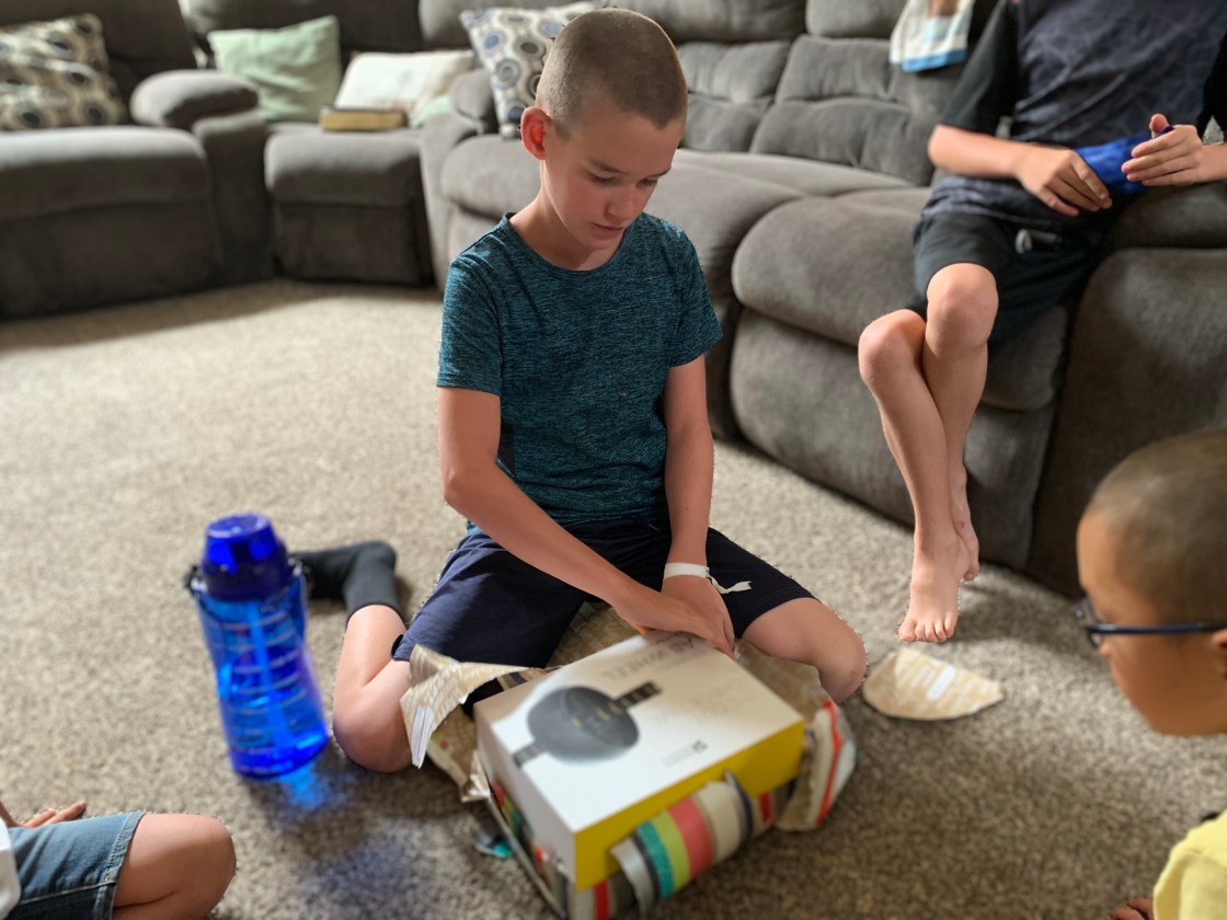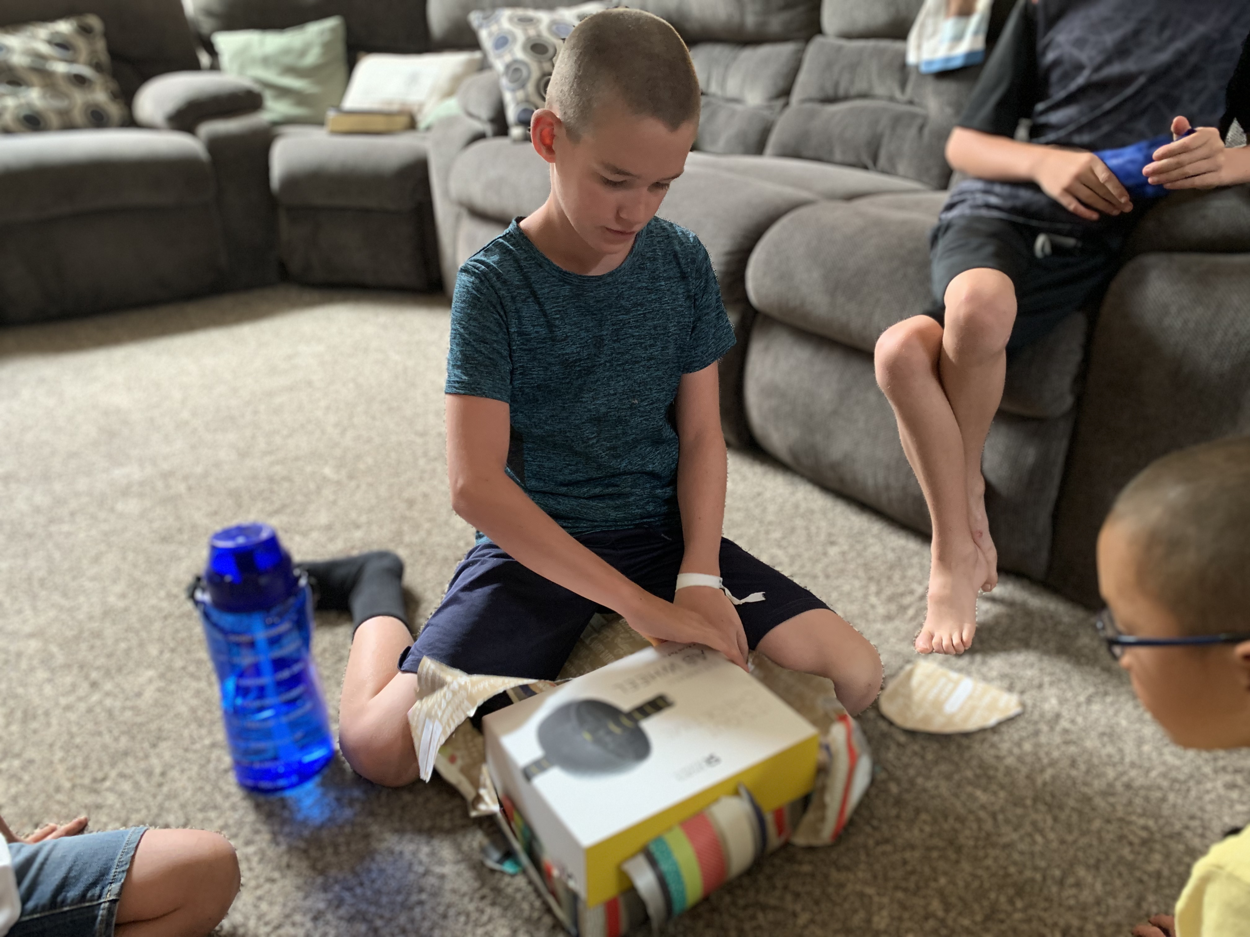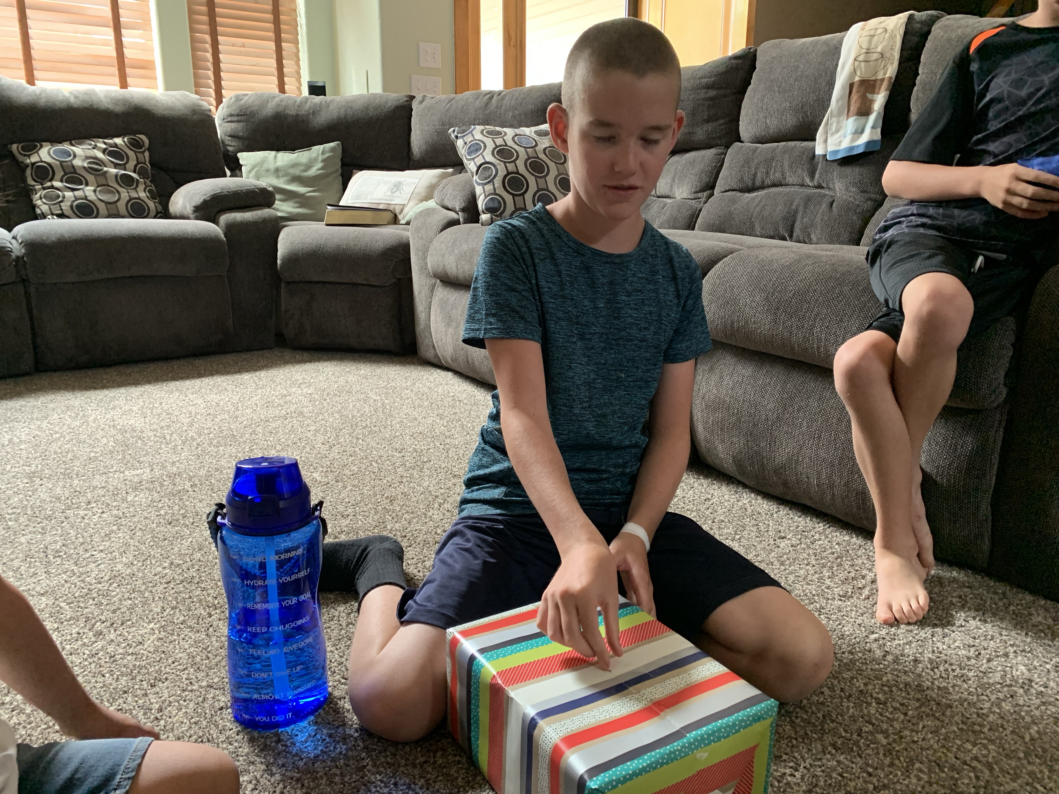 Leighton turned 12 on July 16th. Crazy to think it has been 12 years since he arrived so early and needing help breathing and having an adventurous first couple of weeks at life. No signs of those early struggles now. He had gymnastics practice early that morning and finished up practice with popsicles with his team and coach. After getting home he and I started to make cookies which was his birthday dessert request. He also opened up a couple presents from us including an ab roller and large water bottle. Since he was 12 he was finally eligible to get his COVID vaccine so that afternoon we drove over to Walgreens and he got his first shot. He is not a fan of shots and gets very anxious with them, but he did a good job of being brave despite a little hyperventilating during the process. The tech giving him his shot even commented, “wow, he really tensed up with that didn’t he”. After getting home he spoke with Clint’s parents and enjoyed that time. Then he was goofy with his brothers and dressed up just for fun. For dinner he requested pesto pasta, kielbasa, fruit salad and veggies. My parents joined us for dinner and after dinner and his cookies he opened 2 gifts from them. The first was a brick and some sticks as it is the running joke with my parents and the kids that they are going to get bricks and sticks for their birthdays. Then he opened a study Bible which he has been asking for. After dinner we sent him on a hunt to find his gift from us which wasn’t really all that well hidden, it was under a blanked in our room. But it was large and that was the best we could do. He uncovered a weight set which he was very excited about as were his siblings and he quickly got them all doing weights which was funny to watch. Leighton you are a joy in our lives, I love your kind and thoughtful heart and care for others and hard work. Happy birthday buddy.