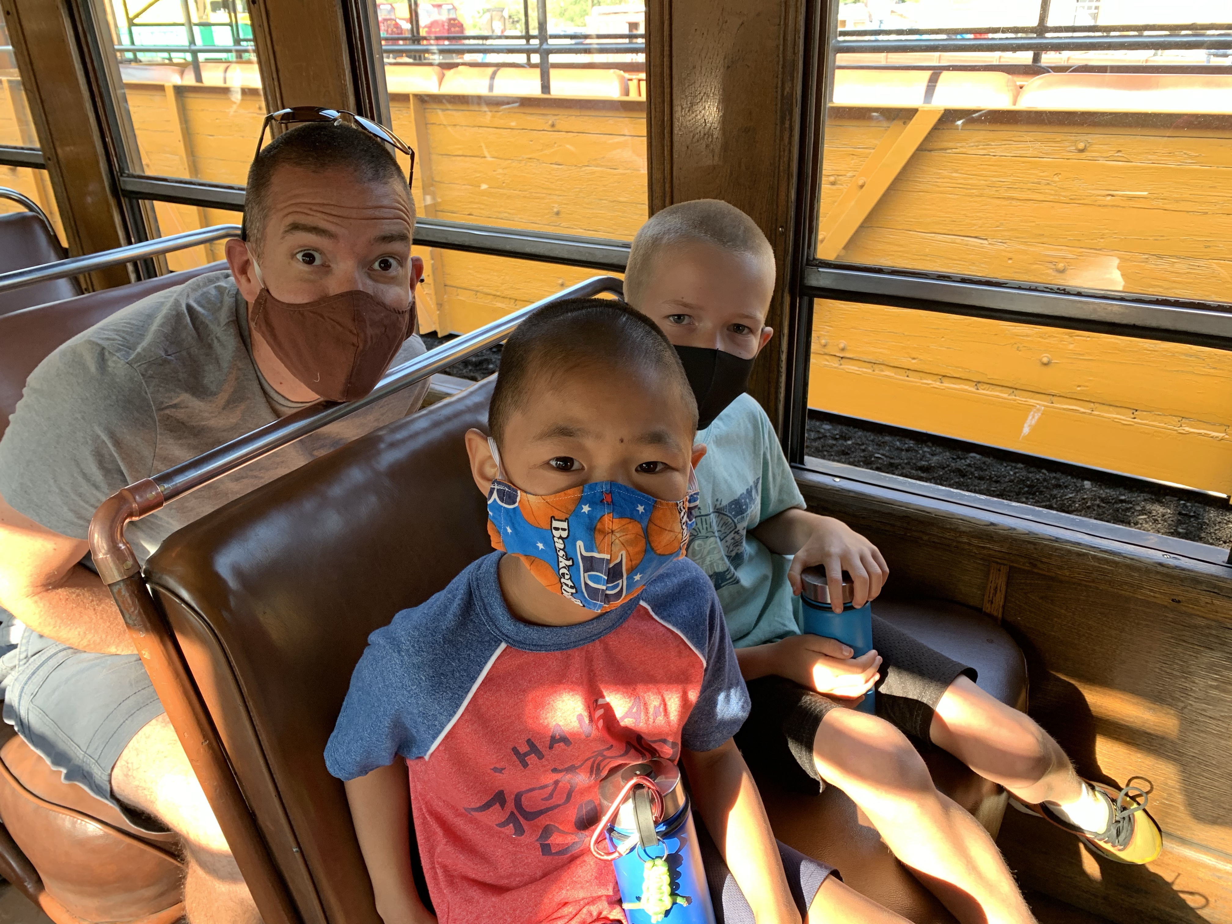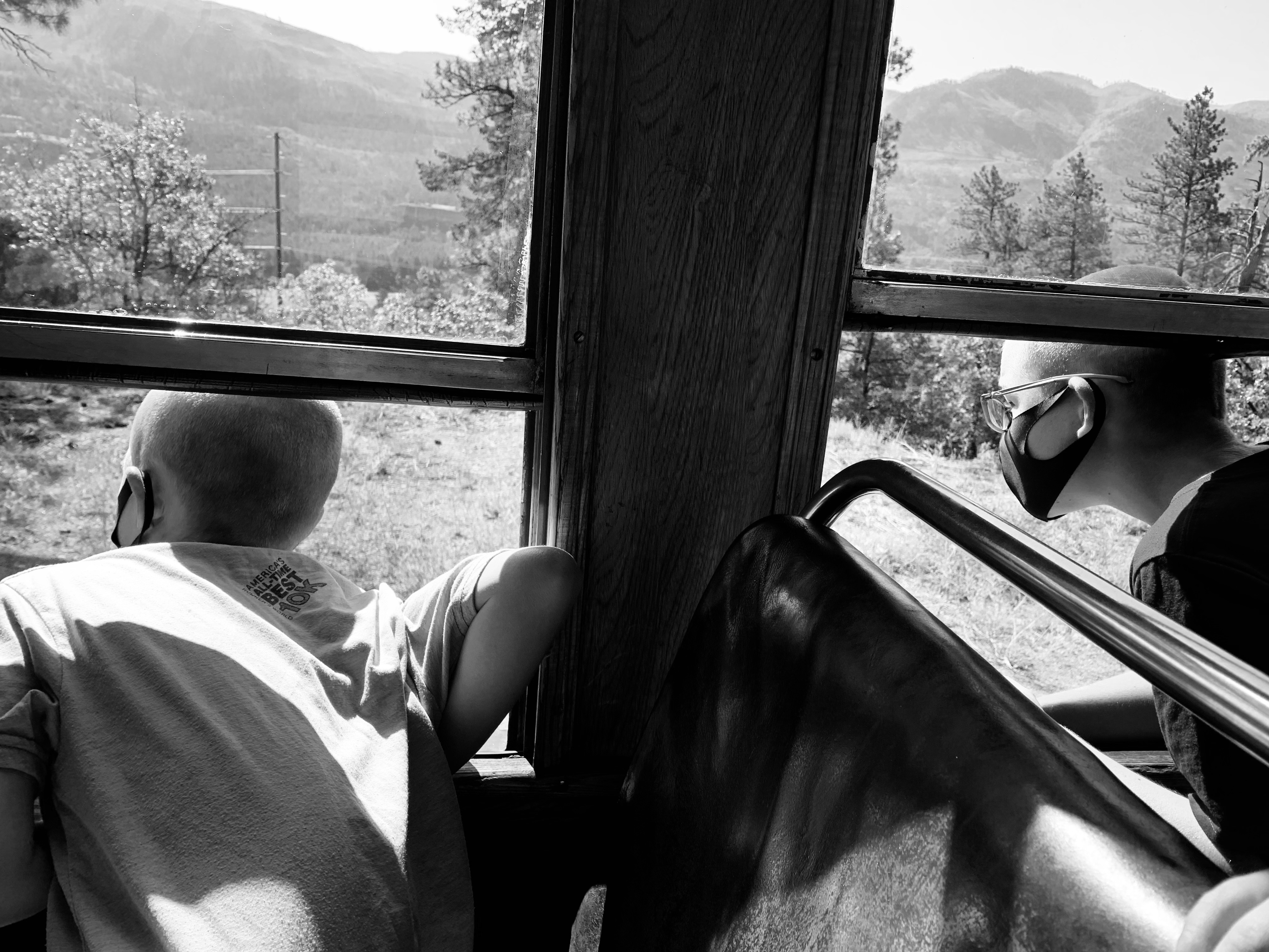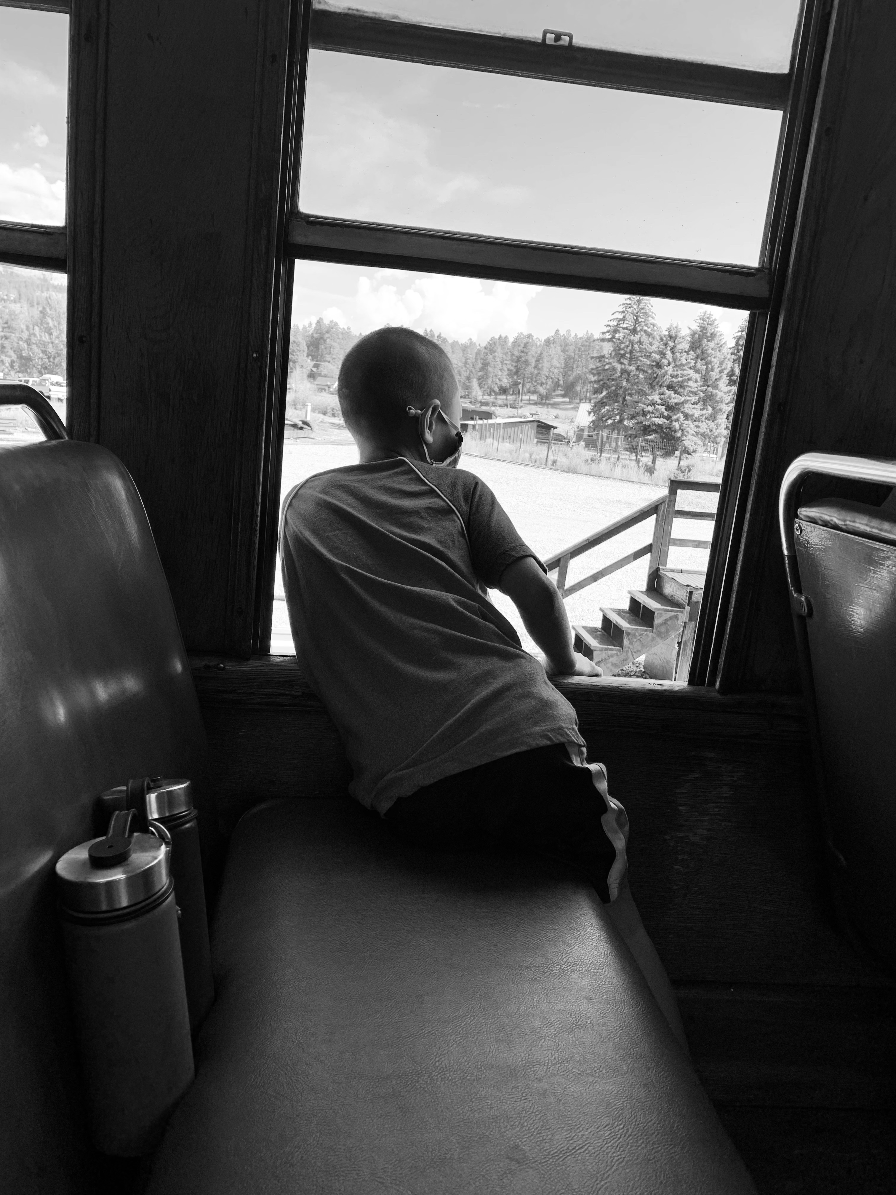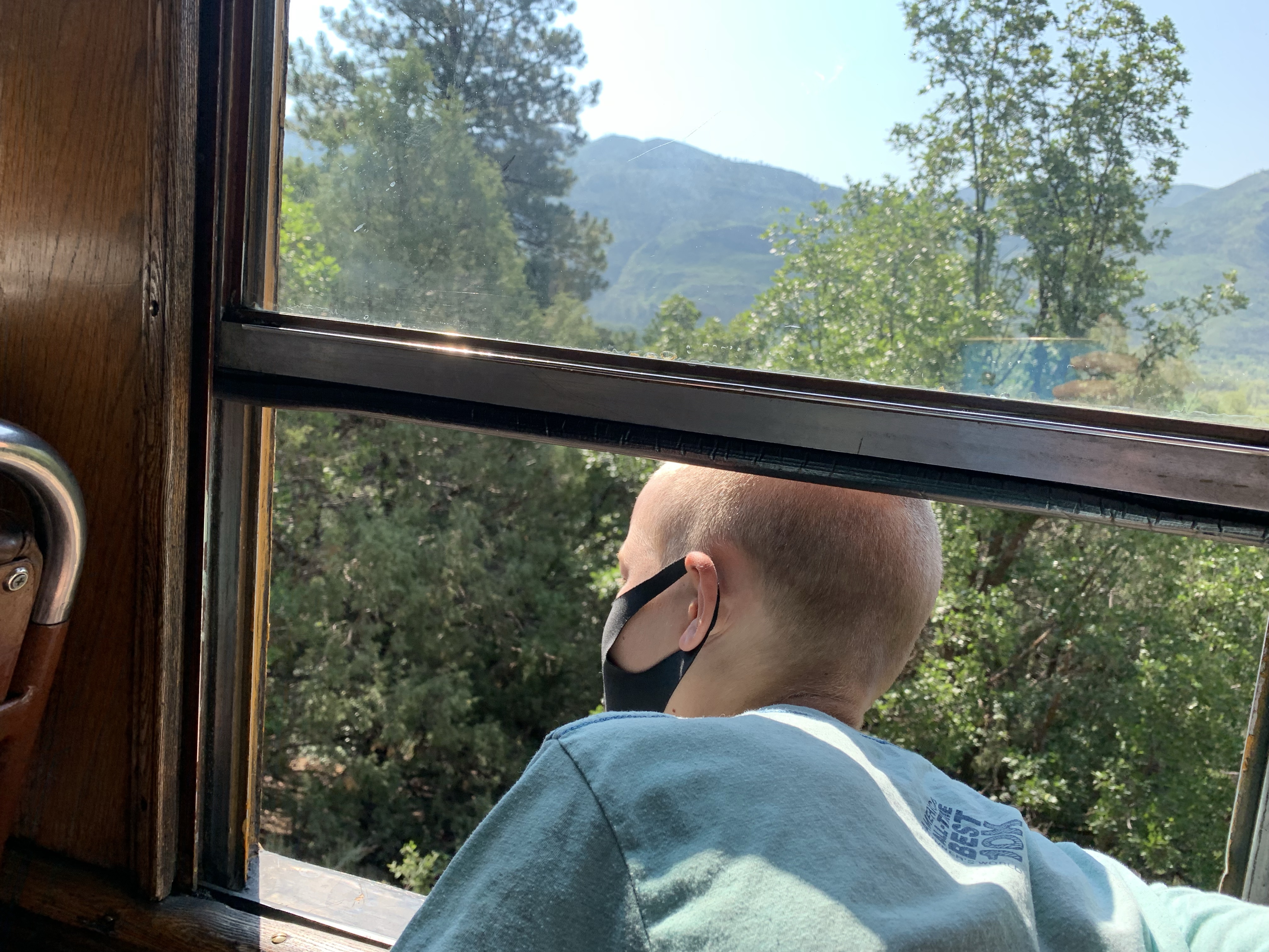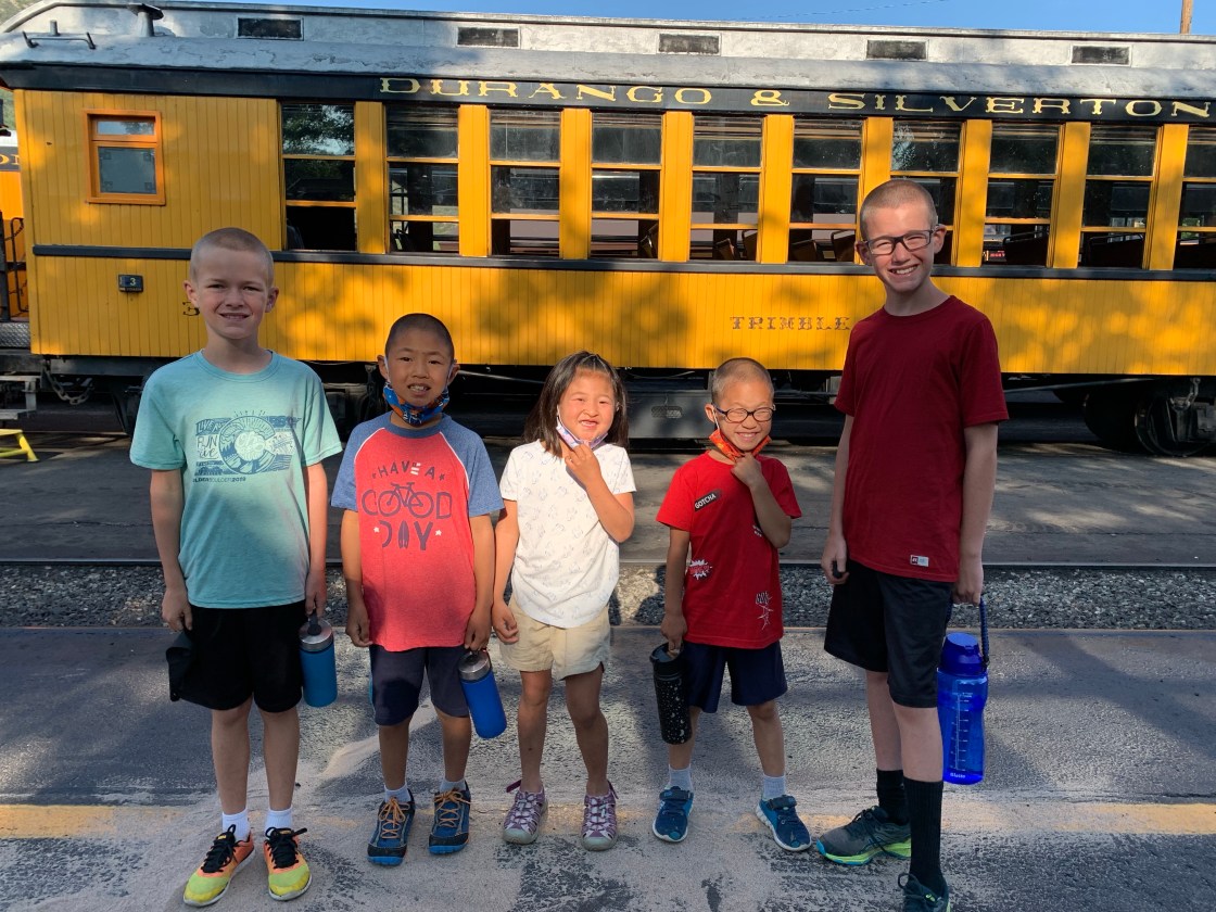 As part of our adventures to southern Colorado Clint and I decided to take the kids on the Durango-Sliverton steam train. We kept it a surprise for the two months leading up to the morning of the trip and didn’t tell them till we pulled into the parking lot at the train depot. They were beyond excited. I was a little worried because the train was a little over 3 hours one way and then a bit of time in Sliverton for lunch and then the 3 hour trip back, I didn’t know how the kids would do confined for that long. In all honesty I don’t know why I worried, they were so excited to be on the train and they loved looking out the windows and talking to the conductor that the time flew and they were great. The conductor even came by at one point and told us that she had never seen such well behaved kids and they were doing better than some of the adults on the train. We had seats on both sides of the train car and so they would switch with each other to see things. We had a bit of a delay getting to Sliverton so we didn’t have as long as planned for lunch. We found a little hamburger place and enjoyed out lunch and some ice cream and as we were finishing up it began to rain. And RAIN, and RAIN and we ended up running back to the train in a huge down pour. We made it but we all looked like we had gone swimming. I was super thankful that I had spent a couple extra dollars on each ticket for the closed car that had windows that could open and close. I felt bad for the people in the open air car because they just got pummeled with the rain. Whoever was selling ponchos that day in town made quite the haul. The train ride back was just as fun, Caedmon and Paxton both took little naps on me, but those didn’t last long before they were looking out the window again. We had a blast and everyone enjoyed the day.