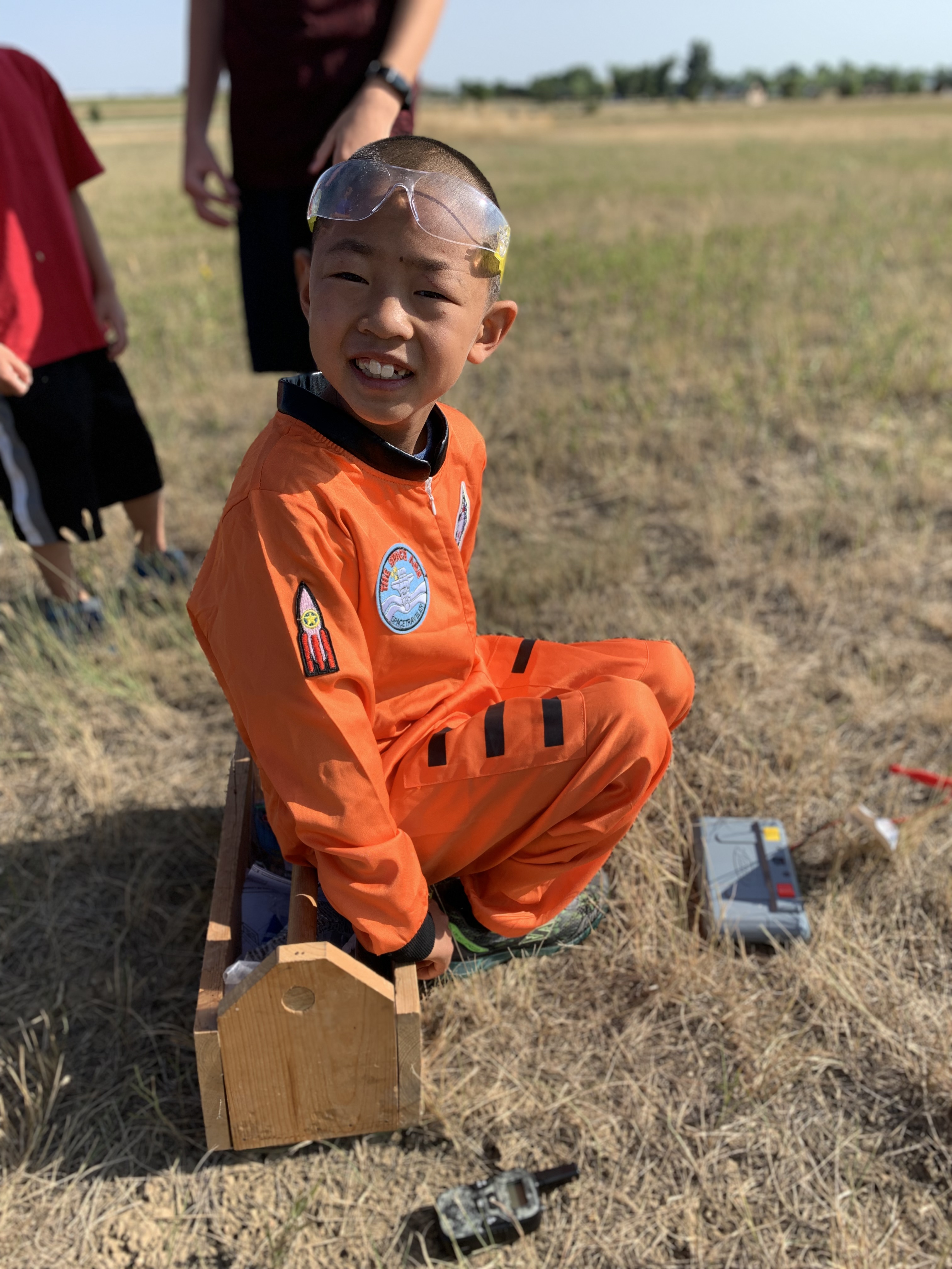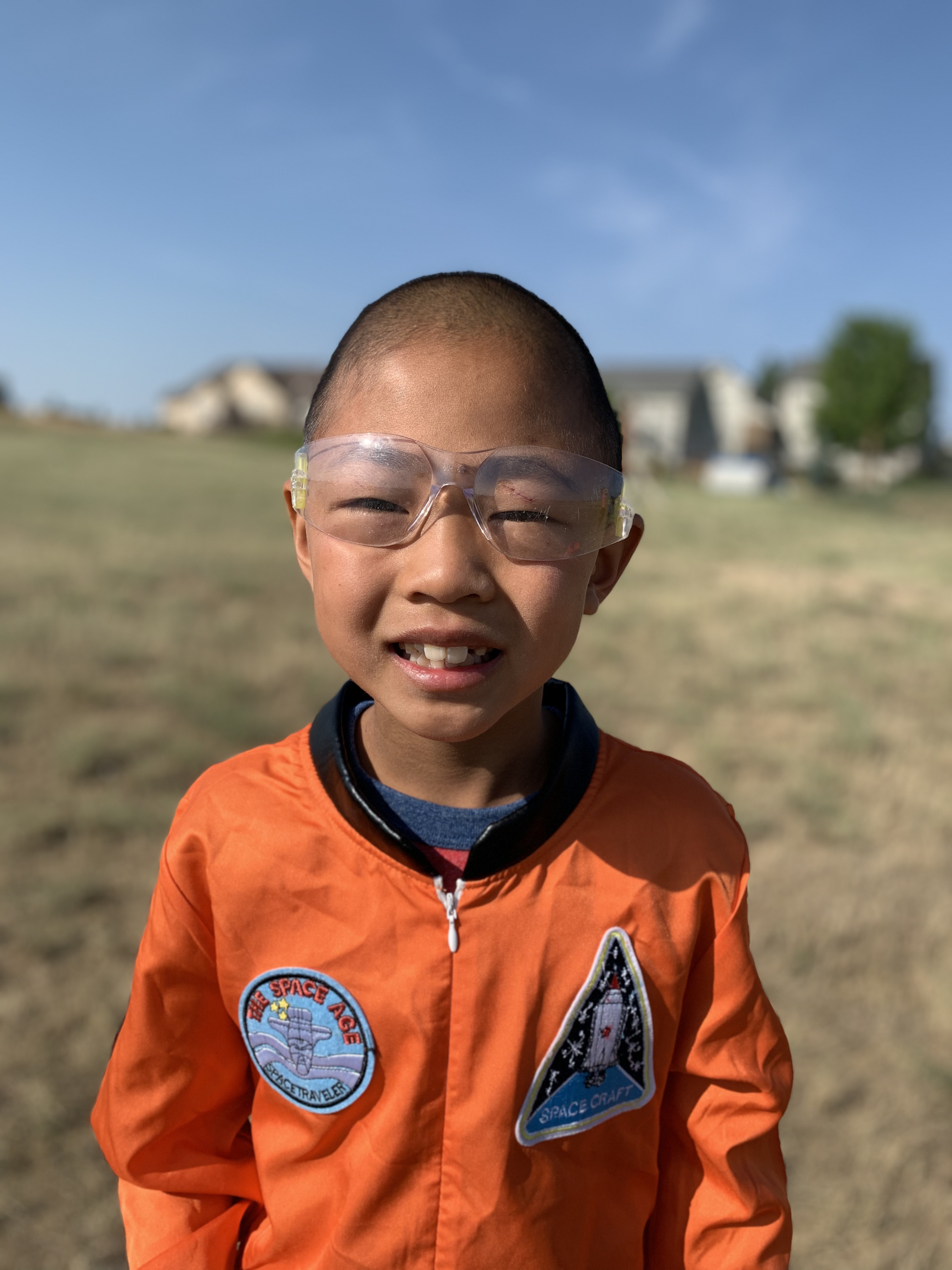 A couple of years ago Edric won through the summer reading program at the library a model rocket. He and Clint put it together and then just recently started getting all the supplies and parts and pieces to actually launch it. He has been so excited and unfortunately the first day we picked it was super windy and not safe to launch and he was quite disappointed. But we only had to delay it a day ad the next day was gorgeous. When he woke up he put on his astronaut suite (thank you second hand store!) and was ready to go. The first couple of attempts didn’t work because the fuse wasn’t working, but then he was able to launch it and it went very high. I think way higher than any of us expected. The rocket returned to the field and Edric and Daddy can now repair it and get it ready to launch again.