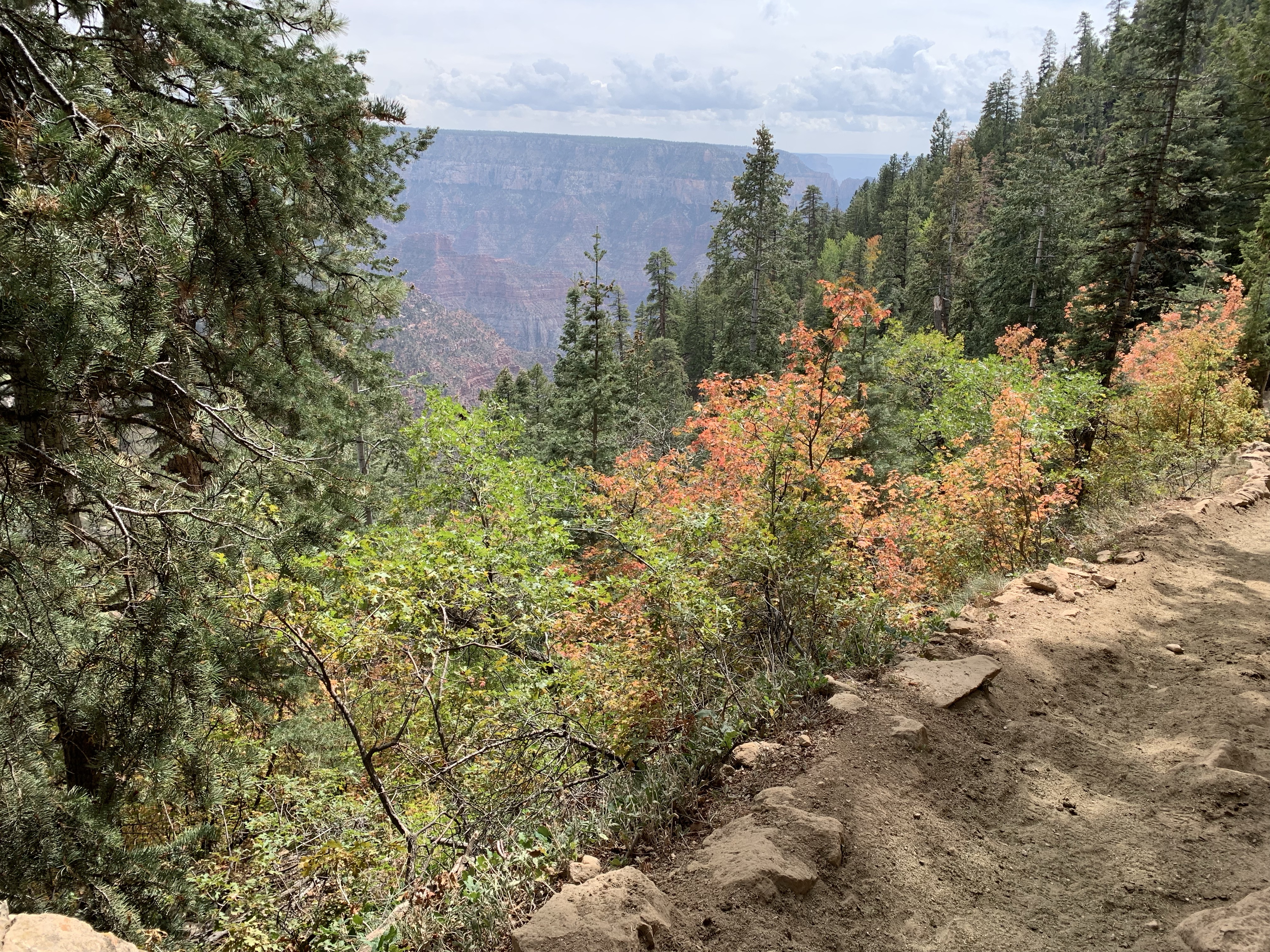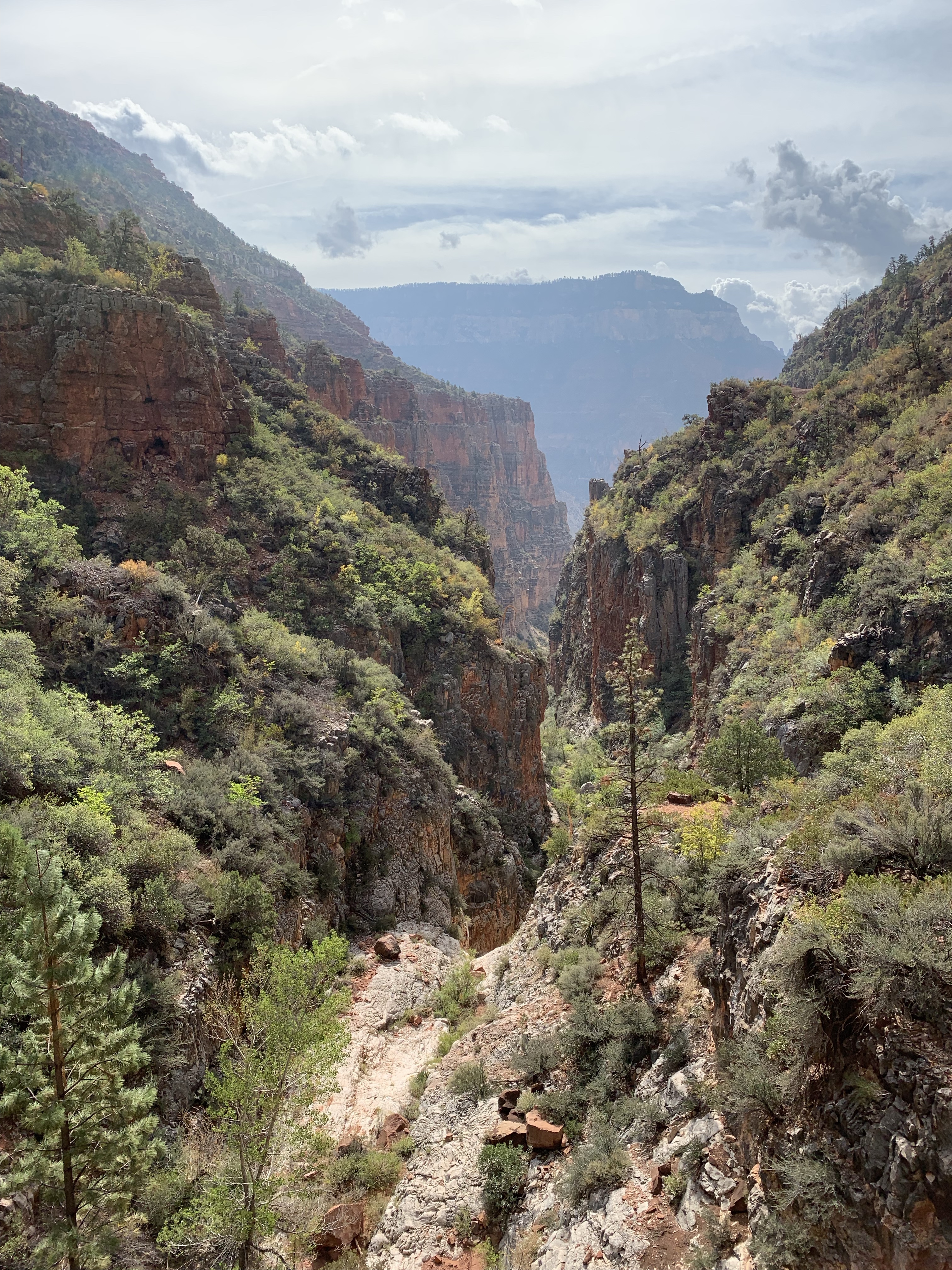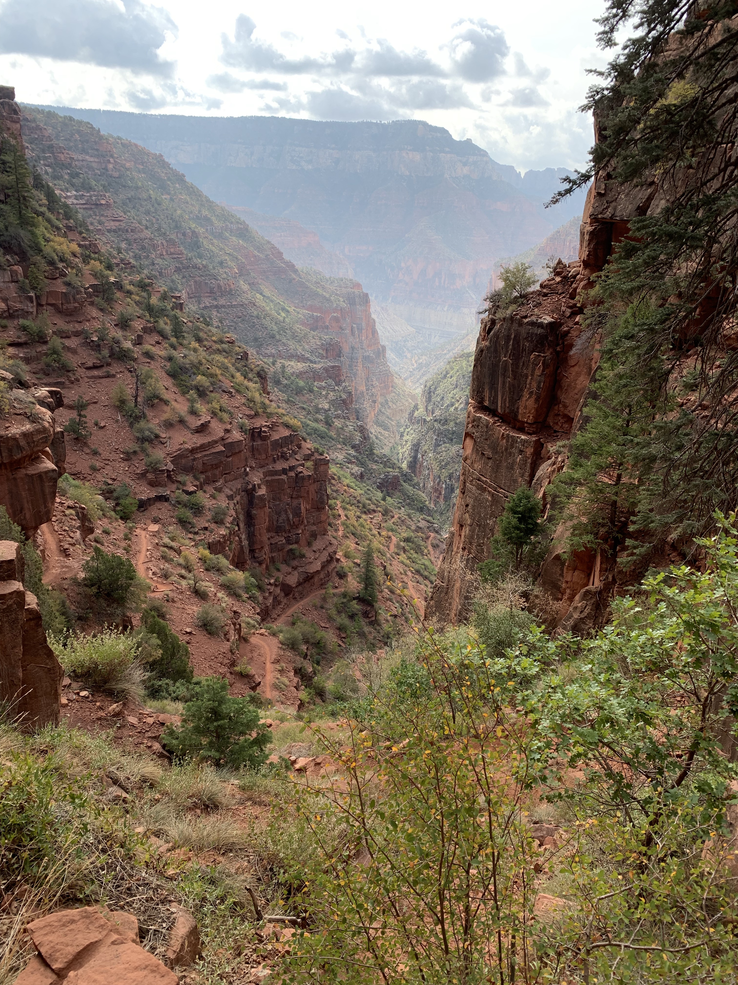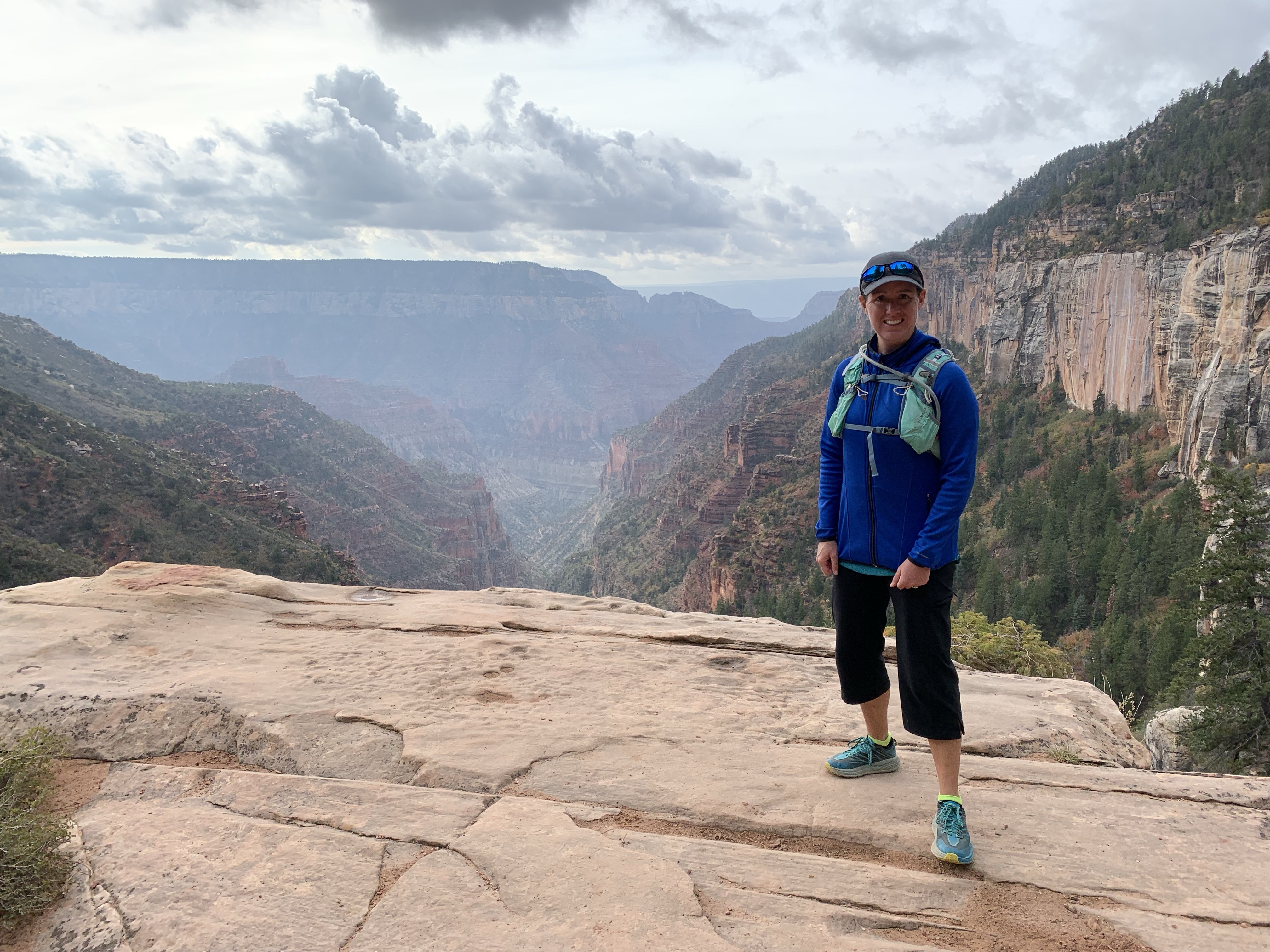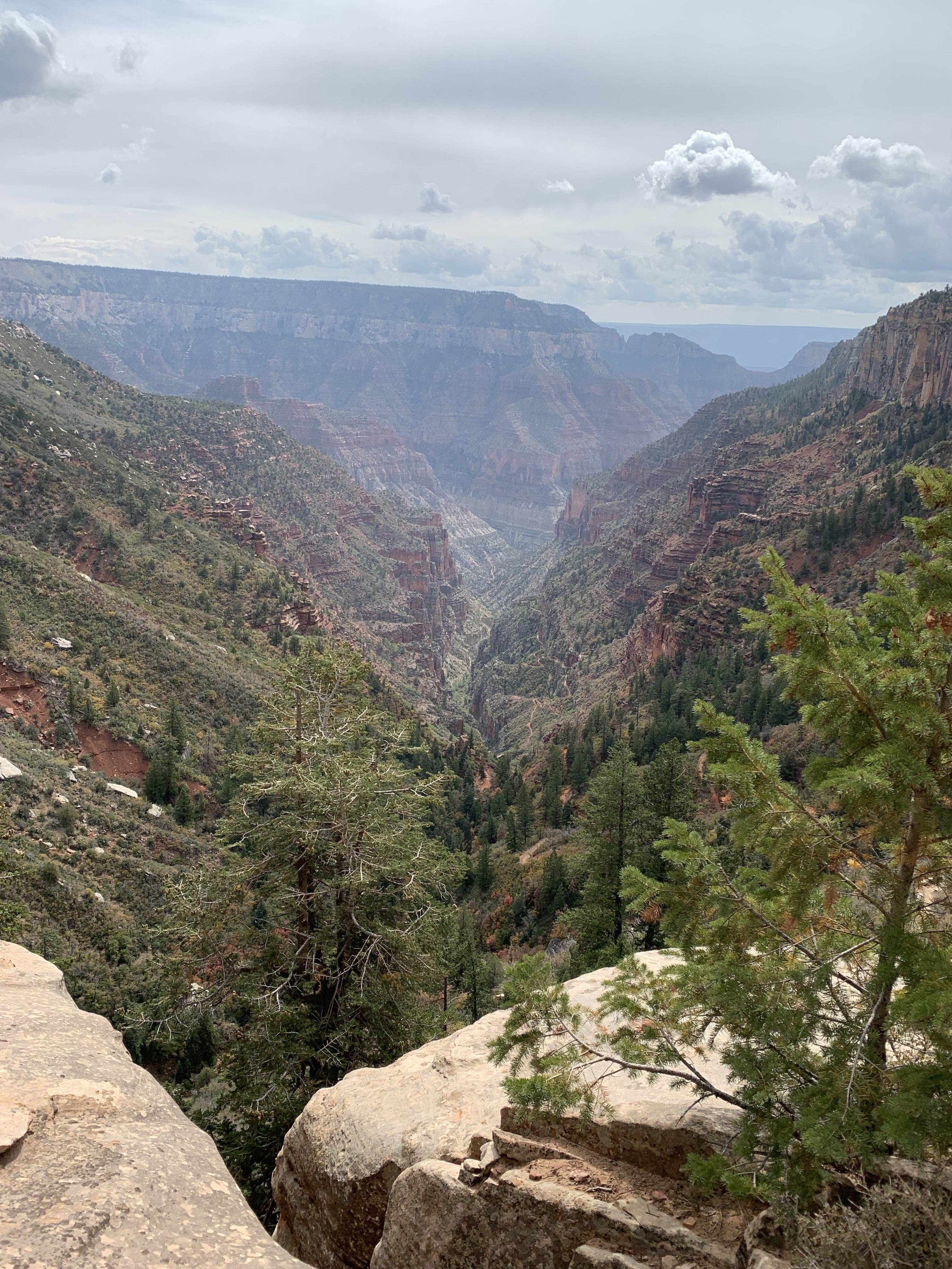 Clint and I traveled to southern Utah to do a 3 day trail running festival. Since we were only about an hour or so from the North Rim of the Grand Canyon, the day before the trail festival when we should have been resting our legs we decided to go and explore. It was a somewhat cloudy and overcast day but that didn’t stop us. I think one does not realize how big the Grand Canyon is until one is standing on the rim or even hiking down below the rim. We chose to do the North Kaibab Trail which travels all the way down to the bottom and the Colorado River and then connects either with the South Kaibab Trail or the Bright Angel Trail to hike out of the canyon on the other side. I knew we weren’t going to go all the way down to the Colorado River because that would mean we would have to go all 5000 ft back up and out, but we wanted to at least travel down a ways into the canyon. As it was we ended up hiking 3 miles down but actually dropped a little over 2000 feet down in elevation. The trail and views even with the clouds and haze were still amazing. We ended up hiking all the way to the Redwall Bridge and then began our climb back out of the canyon. It was steep but still amazing. After making our way out we drove a bit to the Visitor Center and walked the rim to some of the outlooks. I hope to go in the next year or two with the kids all the way down to the river and camp and then work our way back out over a few days. The Grand Canyon truly is amazing and breathtaking.