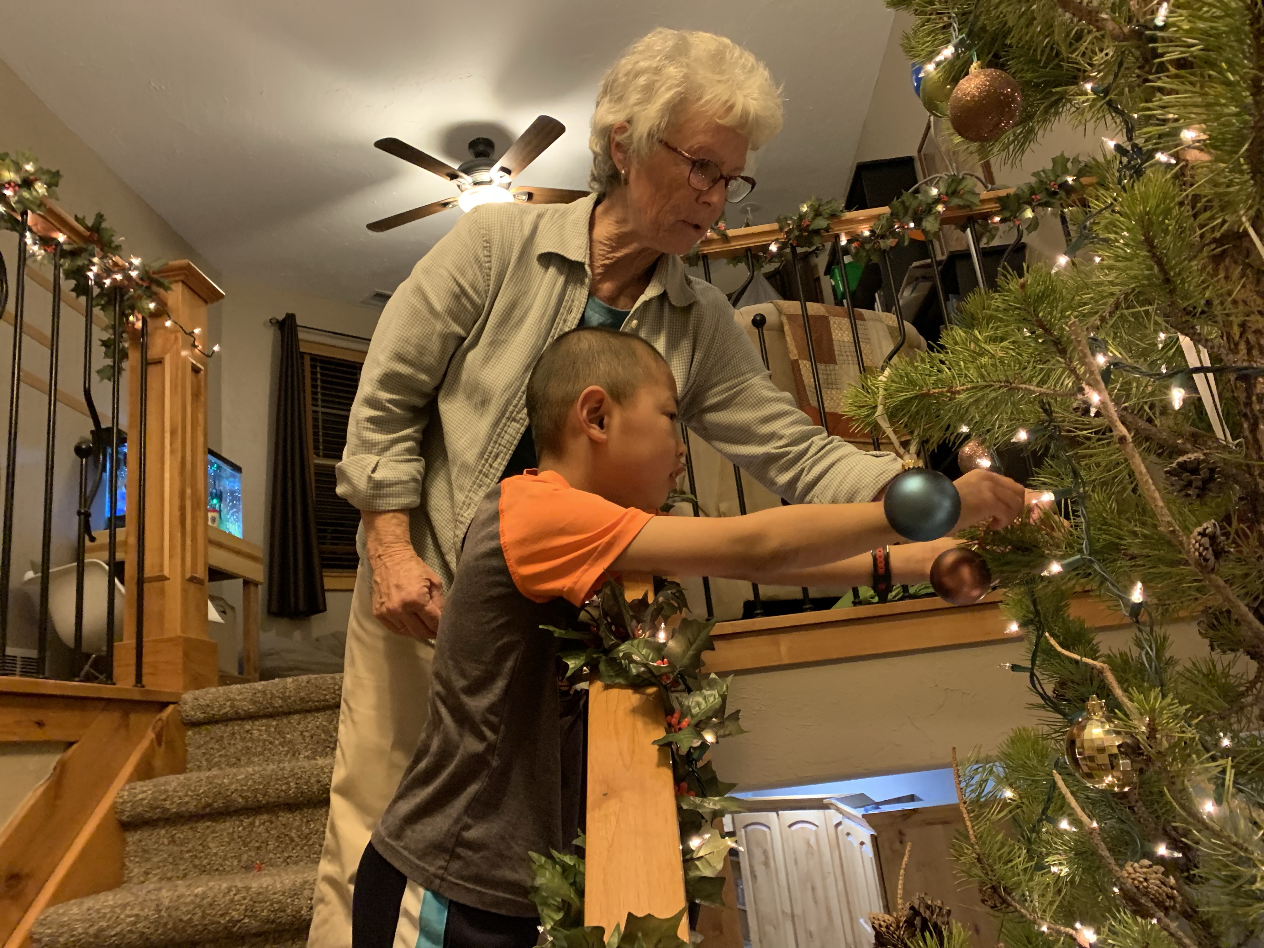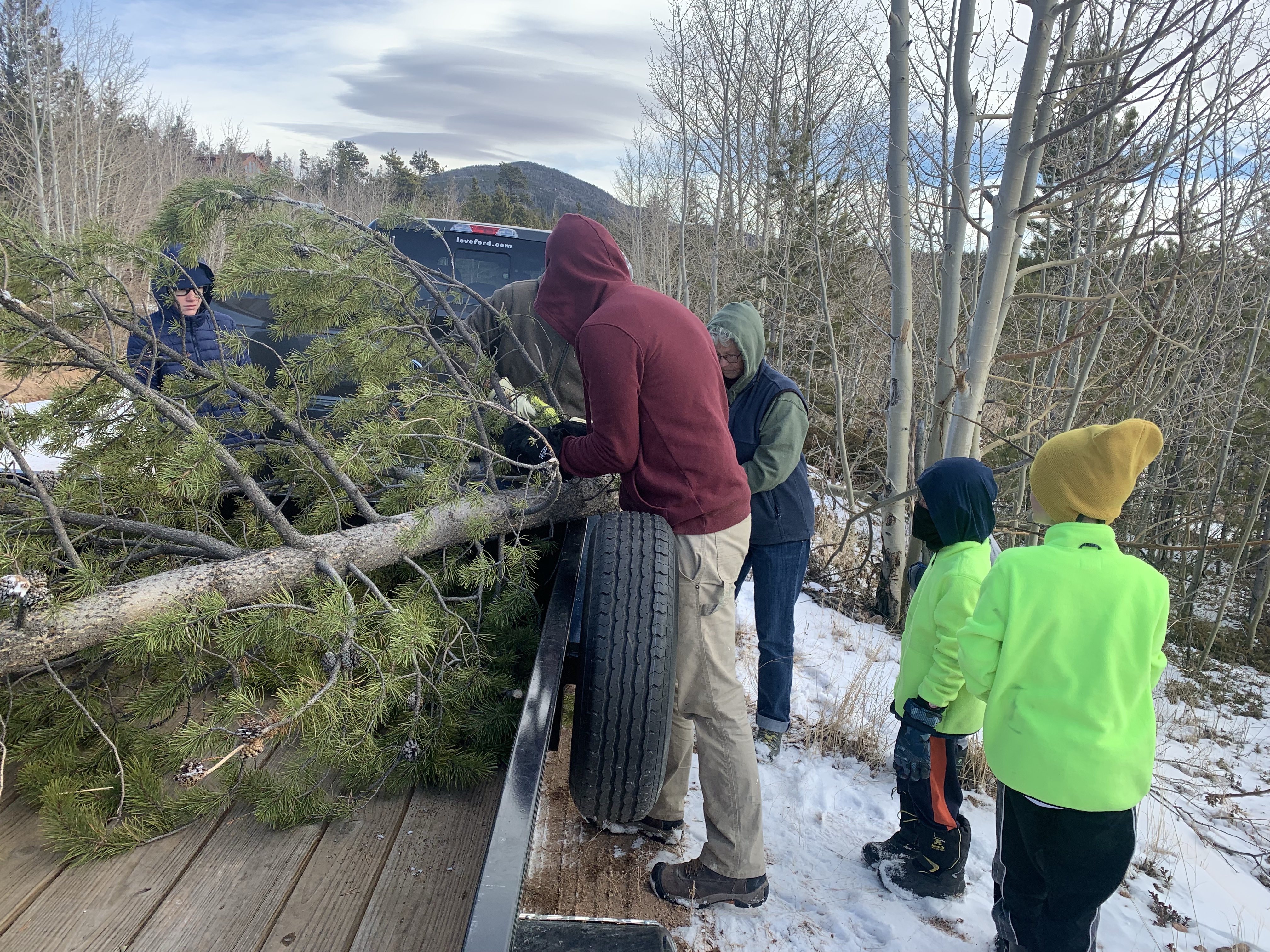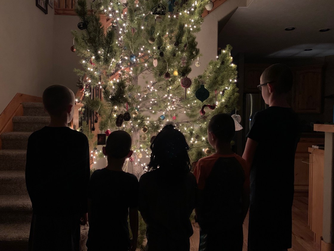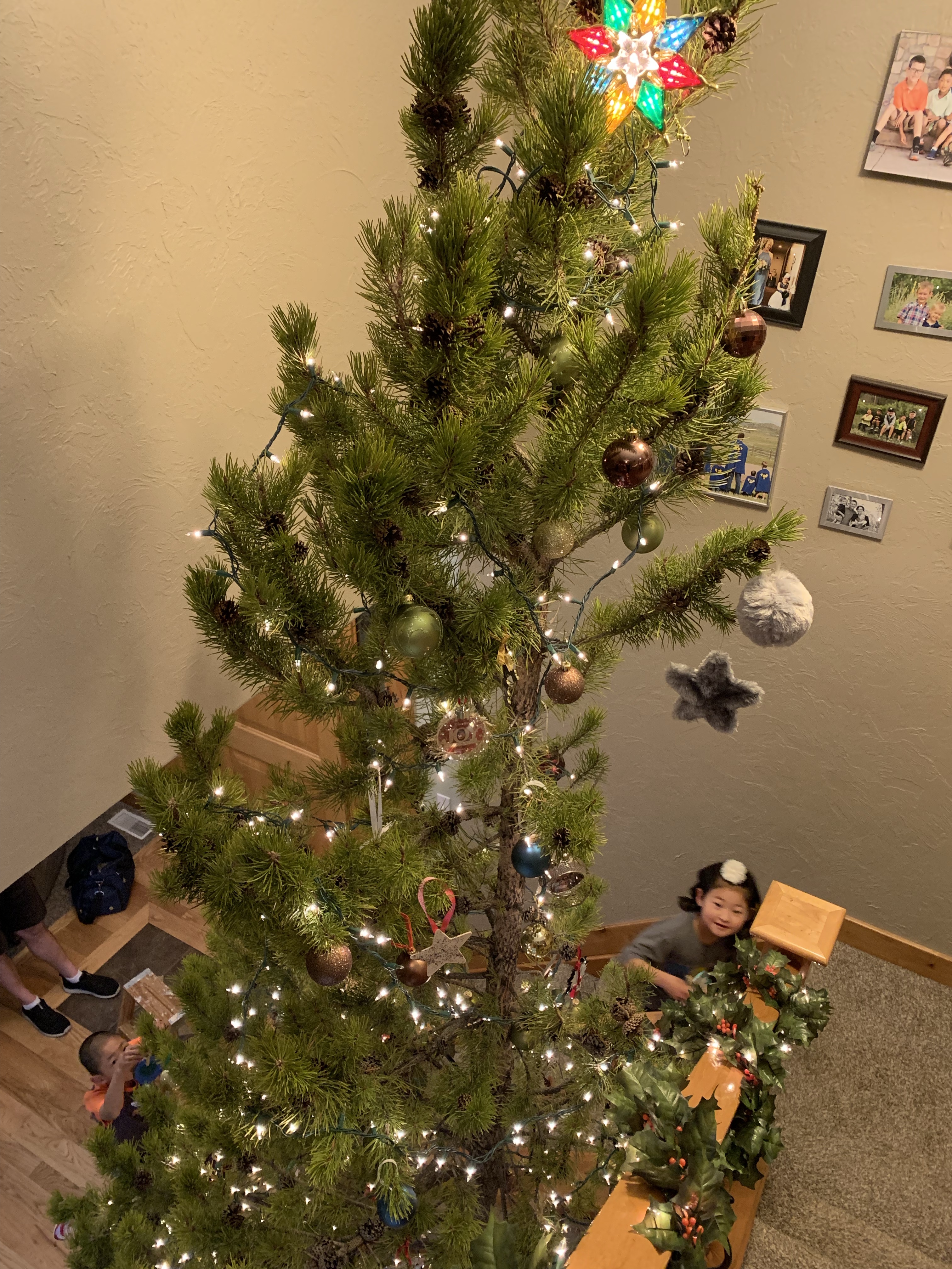 Our Christmas tree was done in two parts this year. We headed up the mountain the day after Thanksgiving to find a tree. The sun was out but there was a chilly breeze. I expected it to take a good while for everyone to decided on a tree but the reality was that I’m pretty sure it took longer for everyone to put on their boots than to decide on the tree. Last year they took way longer. But they were happy with their choice, Paxton actually just wanted a big stick and made sure that we loaded his stick up with the tree. I had to then work Friday afternoon so after Clint and my dad got the tree standing upright we had to postpone decorating it. We spent Sunday evening after the Sugar Plum Tea Party decorating it and my parents were a huge help as well. Leighton and my dad worked on getting strands of lights to work….they all worked last year when I packed them away but this year a number didn’t want to work. While Clint and Paxton (who had at least 3 screwdrivers in his pants) put lights on the tree the rest of us decorated the railings and such. Then everyone helped out with the ornaments and did a good job of spreading them out and after a bit of a discussion, not arguing about who got to climb the ladder and step stool. In the end the tree was gorgeous and they all did a great job.