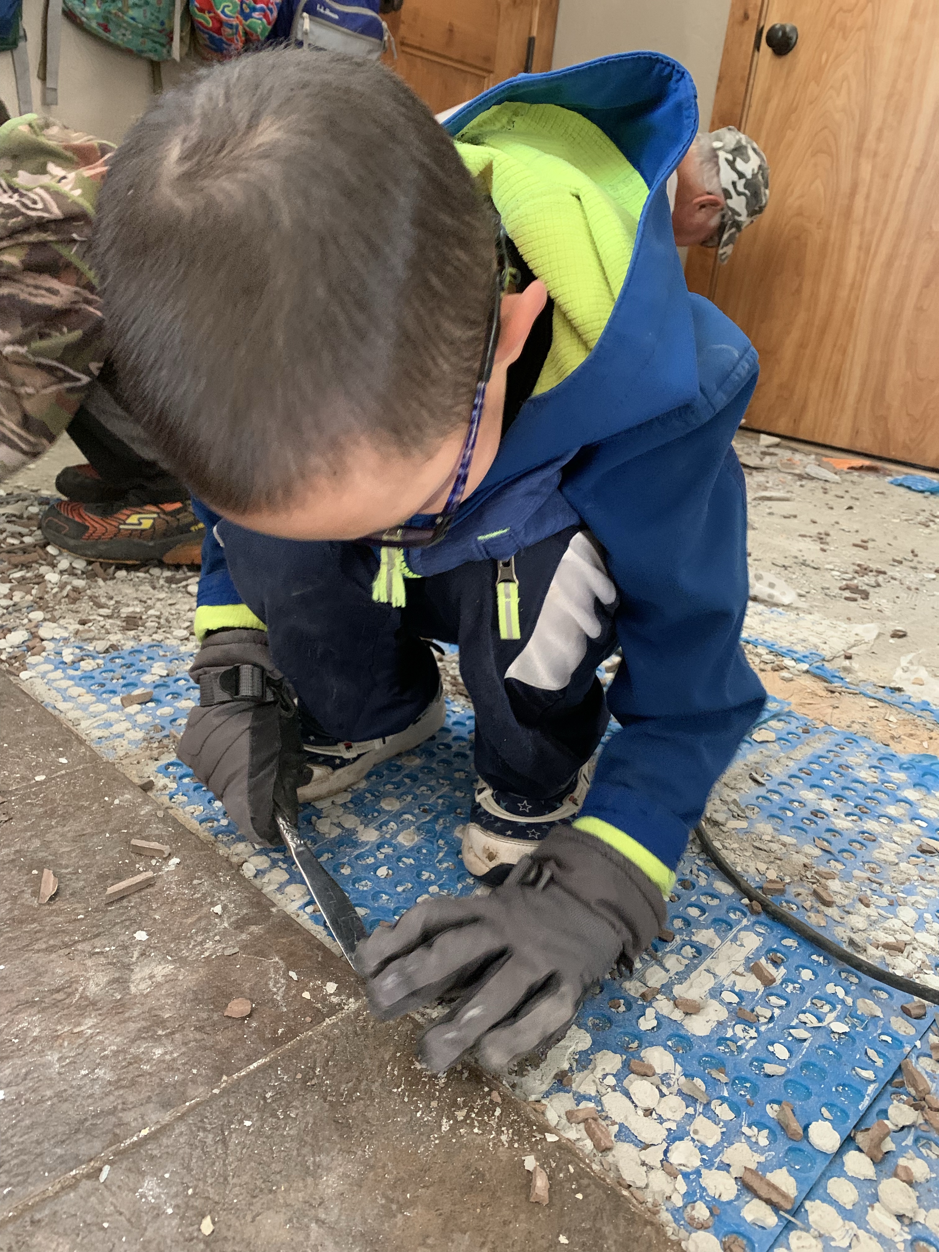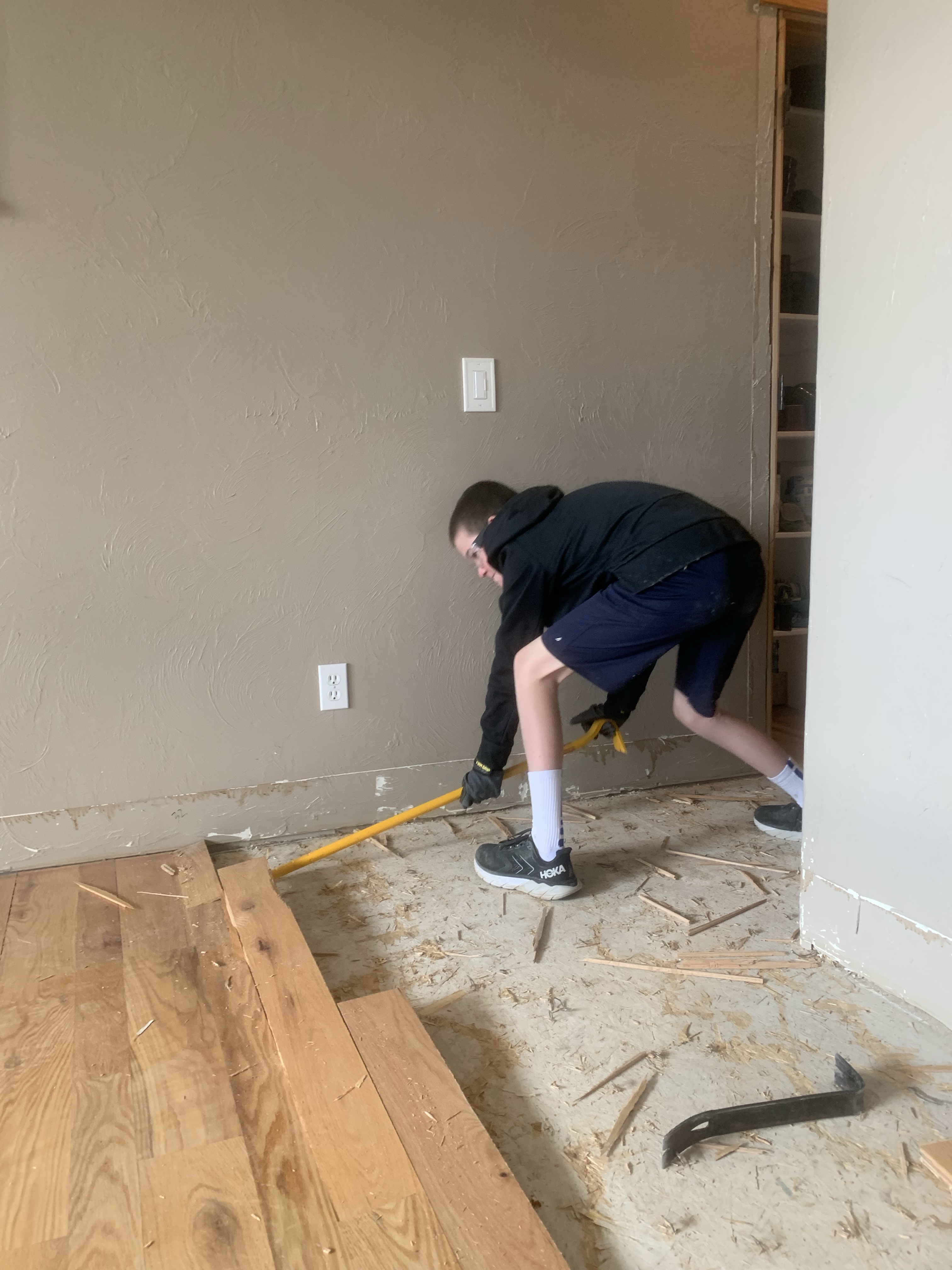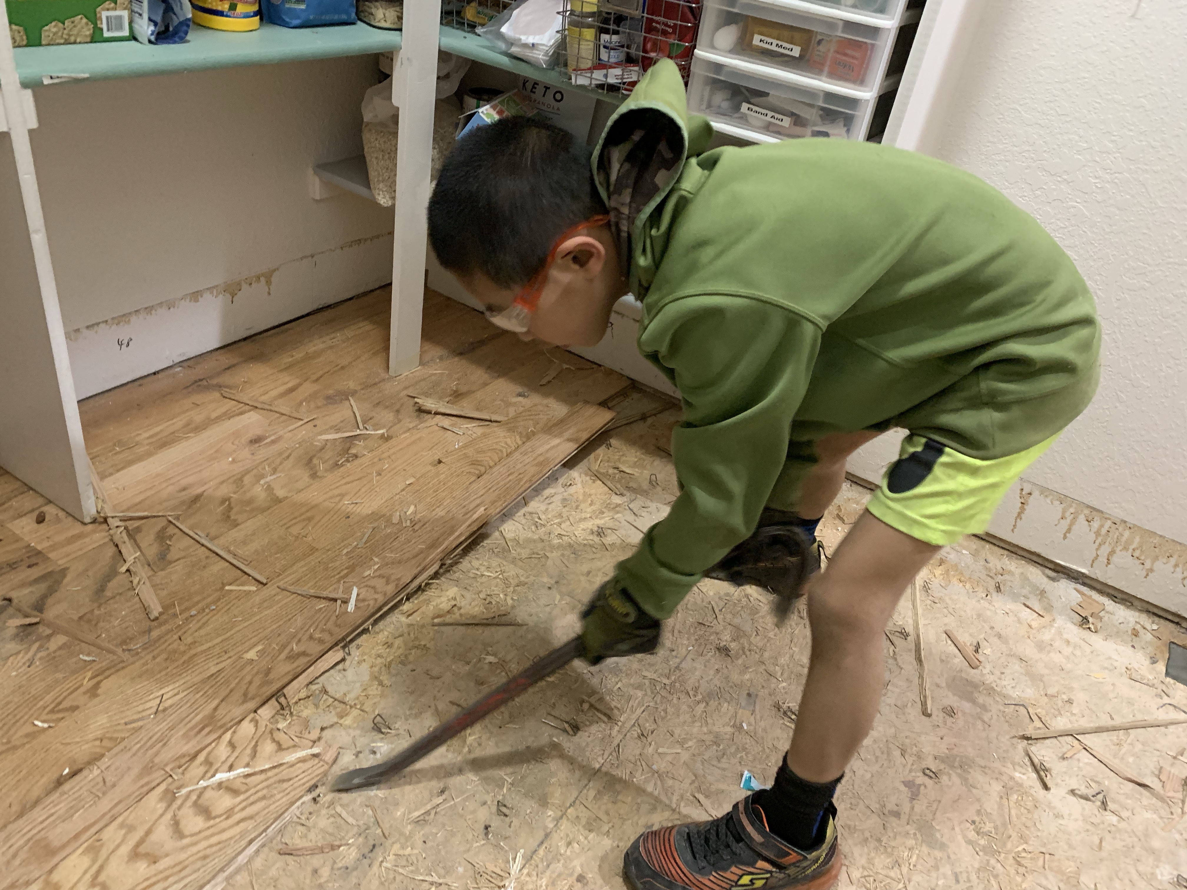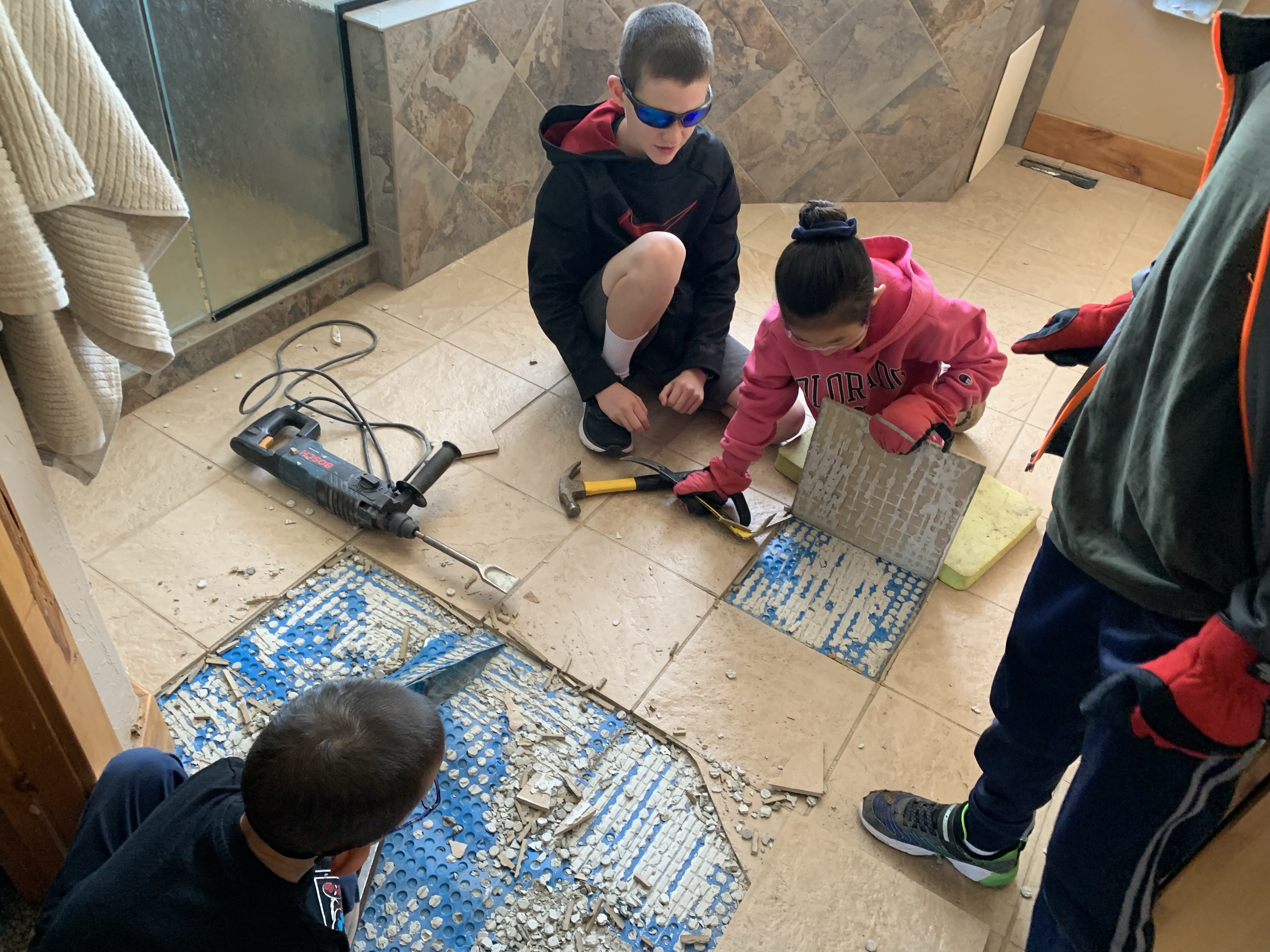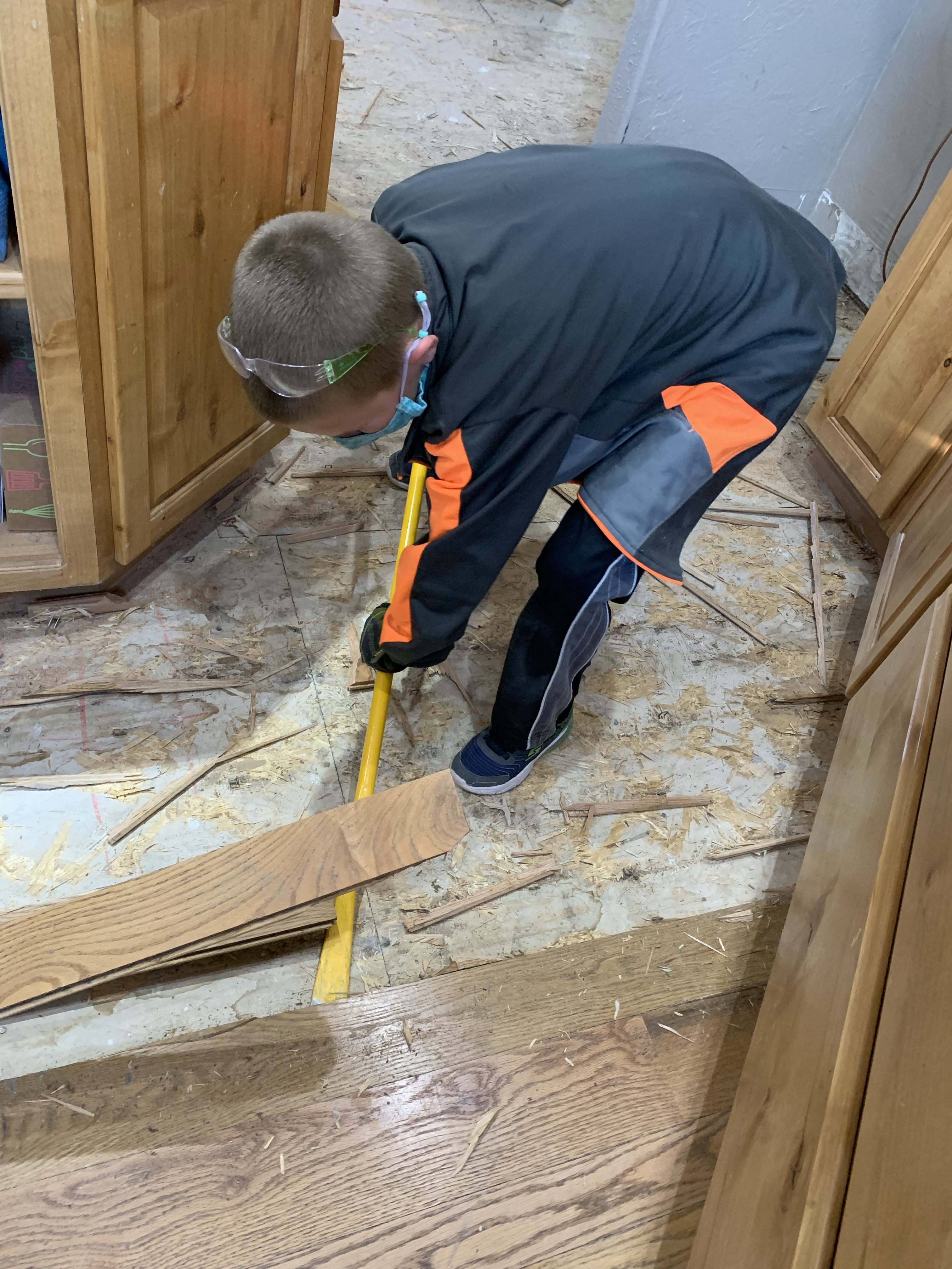 So we decided to put in new floor in our main floor and our master bath. Luckily we had some really good helpers to help take out all the old floor. The kids had a lot of fun with the crow bars and worked really hard. We had smiles and everyone no matter their size went to town and did a great job. Paxton was excited to use his dump truck to haul things out to the dumpster and Caedmon had fun relaxing in the wheelbarrow. Coppelia was persistent with each piece she worked on and Leighton traded his safety goggles for sun glasses for some reason. Edric was a workhorse as well. The kids definitely made a tough job more enjoyable with their positive attitudes, smiles and laughs.