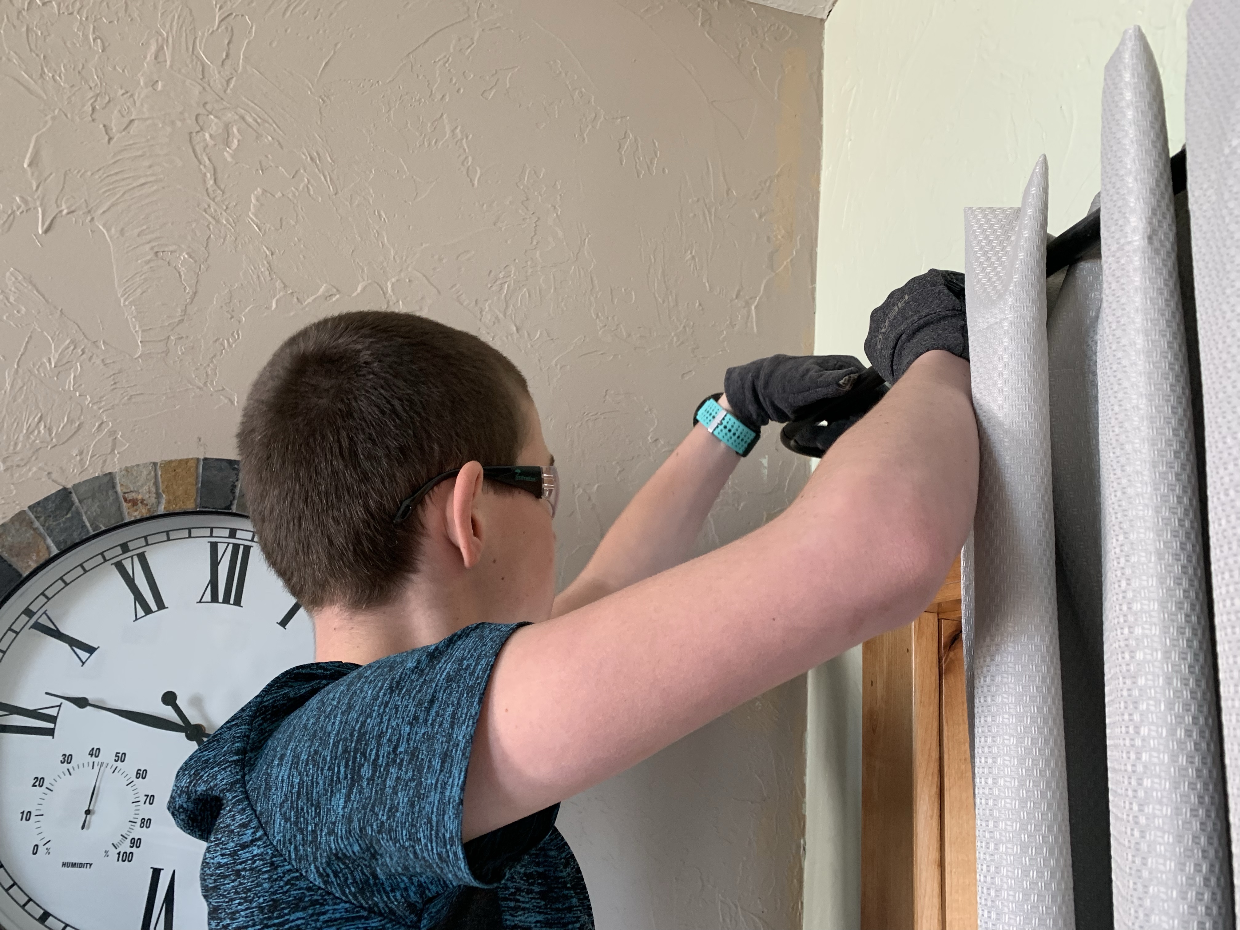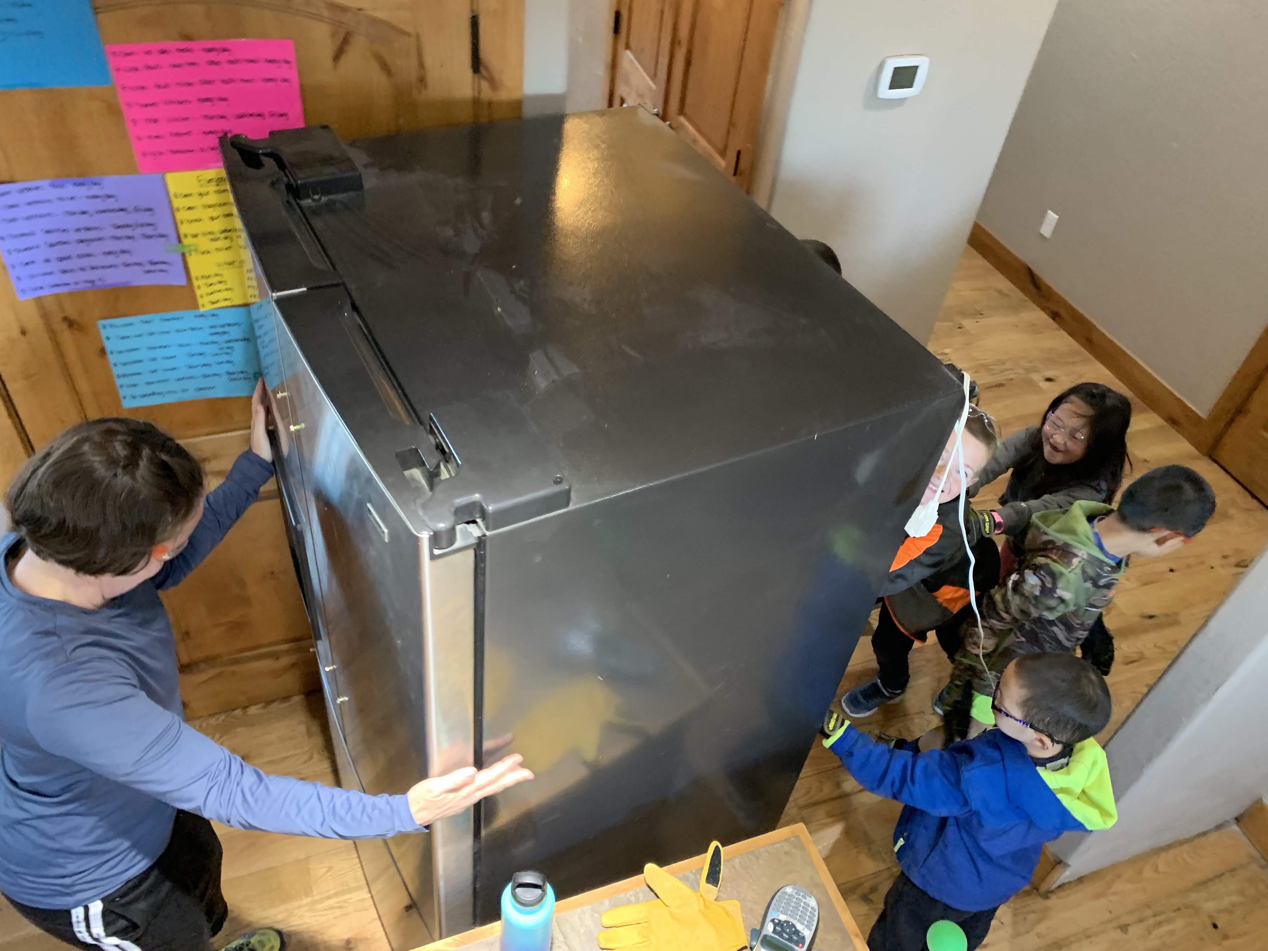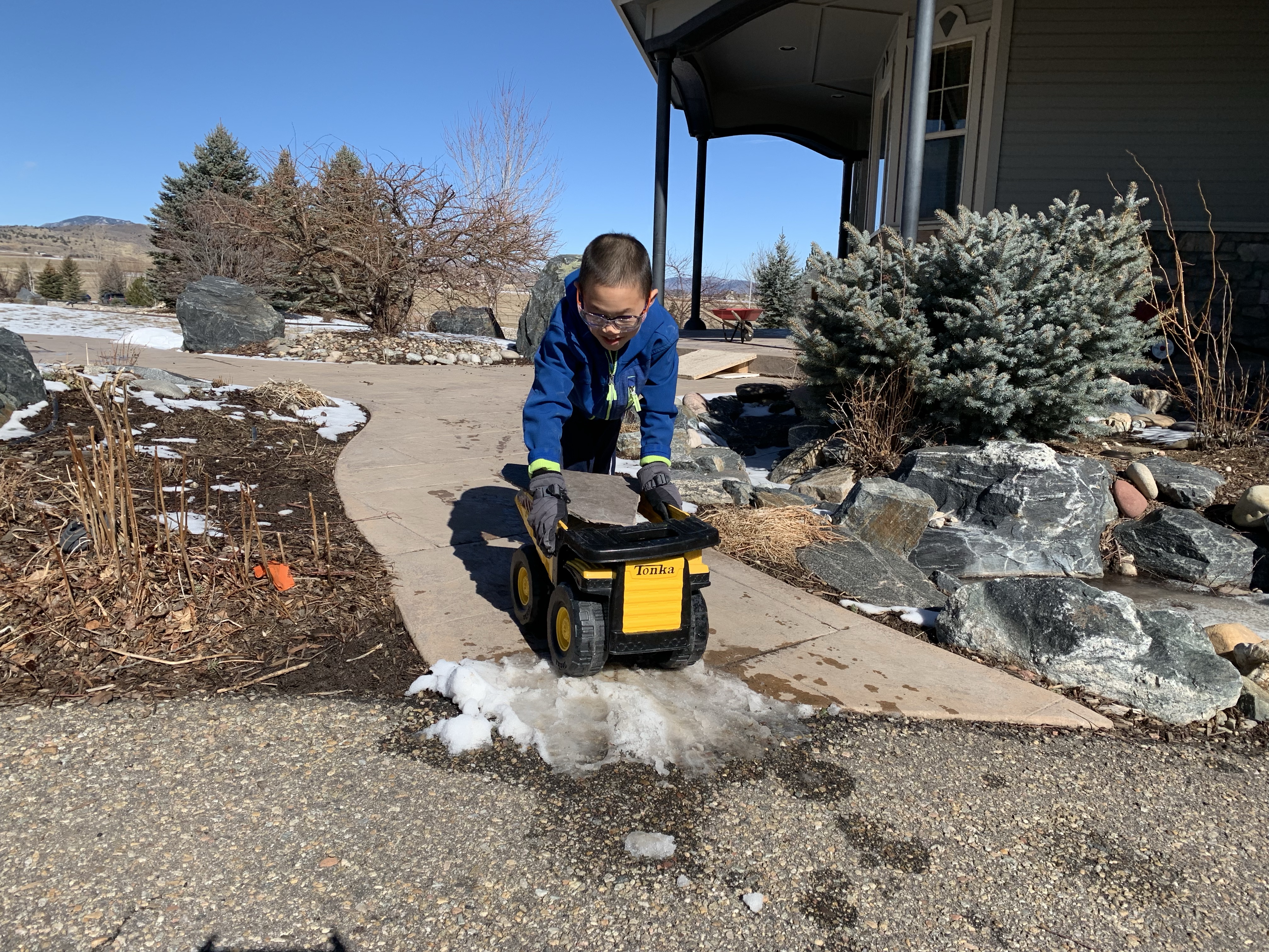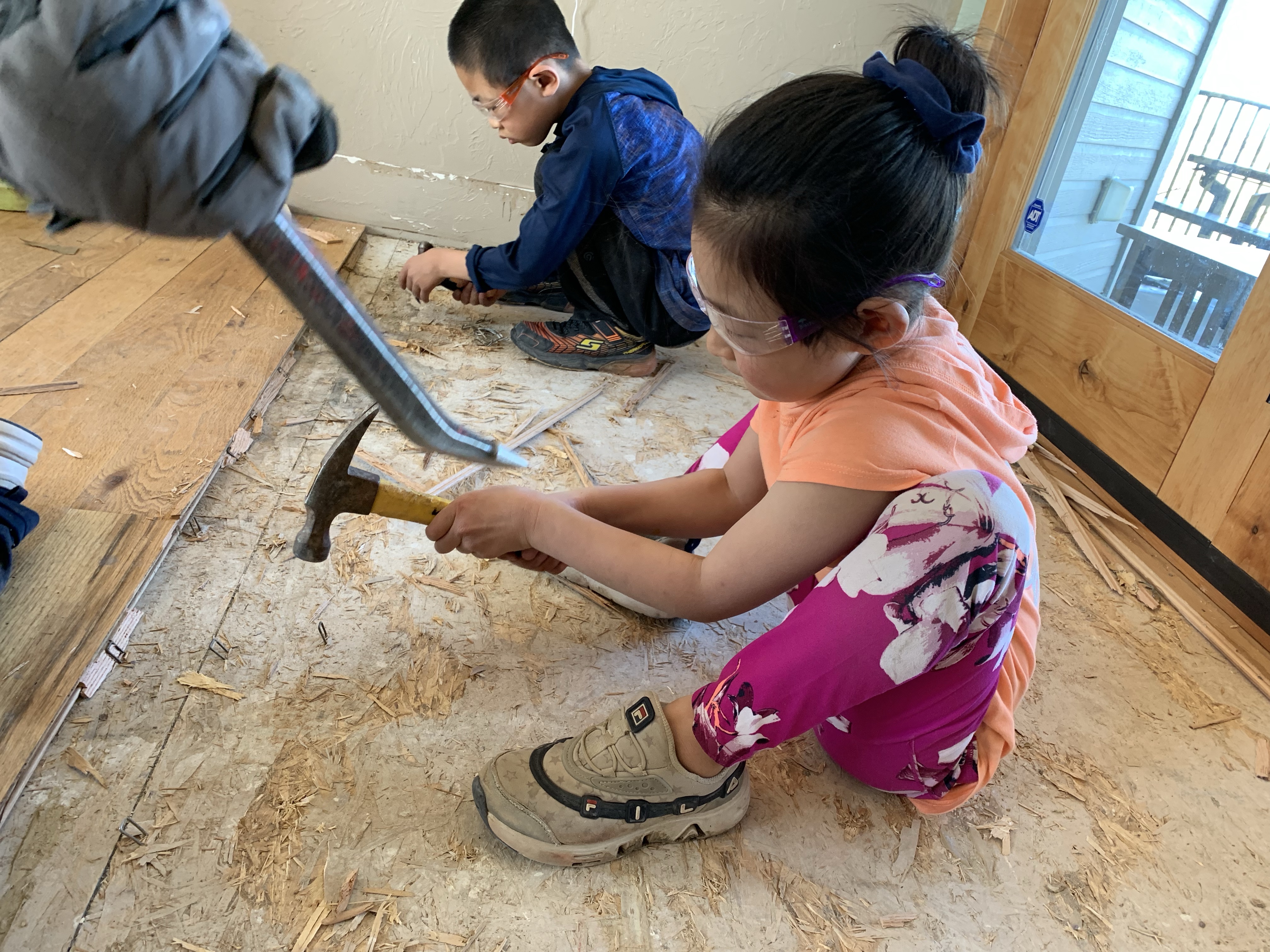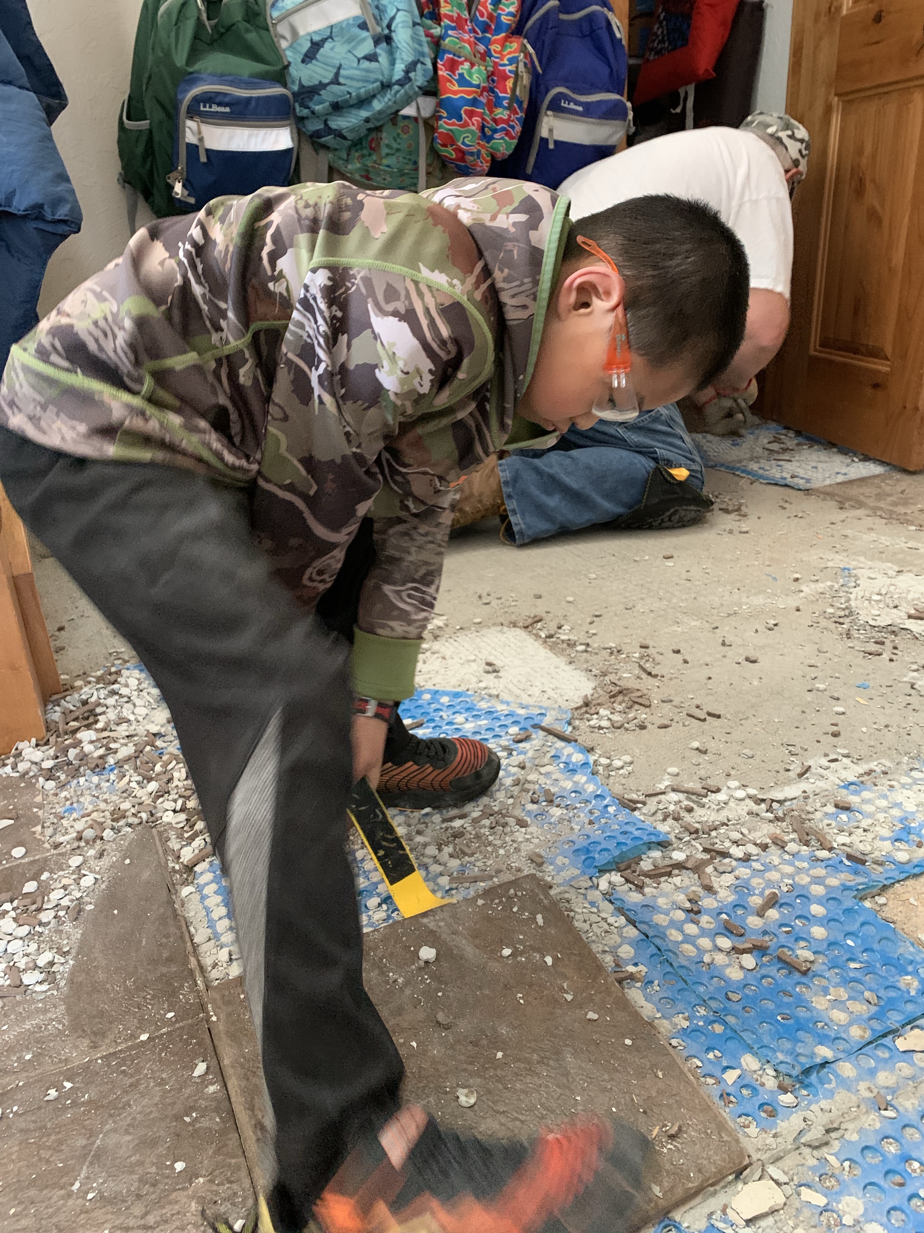 So we decided to put in new floor in our main floor and our master bath. Luckily we had some really good helpers to help take out all the old floor. The kids had a lot of fun with the crow bars and worked really hard. We had smiles and everyone no matter their size went to town and did a great job. Paxton was excited to use his dump truck to haul things out to the dumpster and Caedmon had fun relaxing in the wheelbarrow. Coppelia was persistent with each piece she worked on and Leighton traded his safety goggles for sun glasses for some reason. Edric was a workhorse as well. The kids definitely made a tough job more enjoyable with their positive attitudes, smiles and laughs.