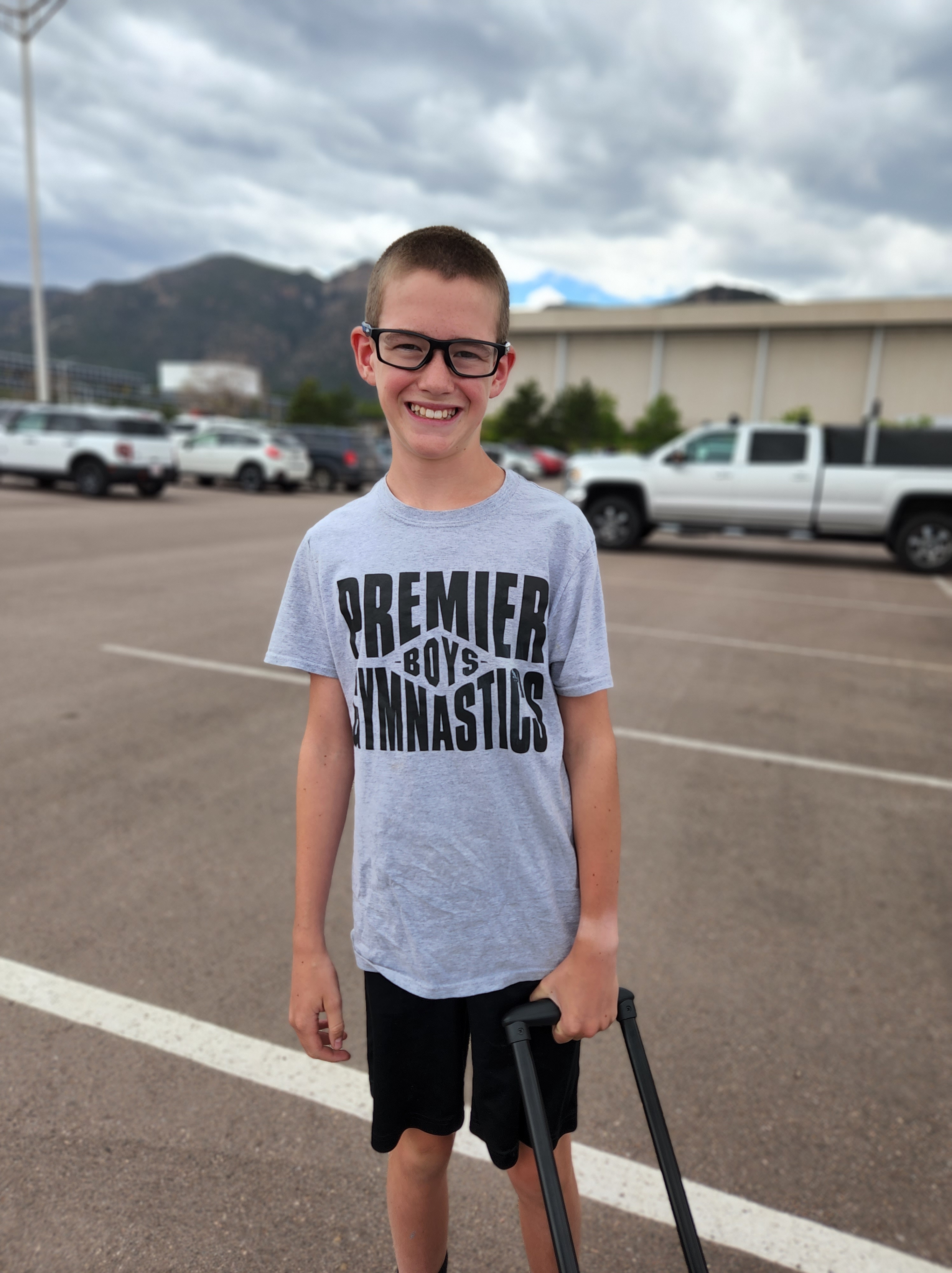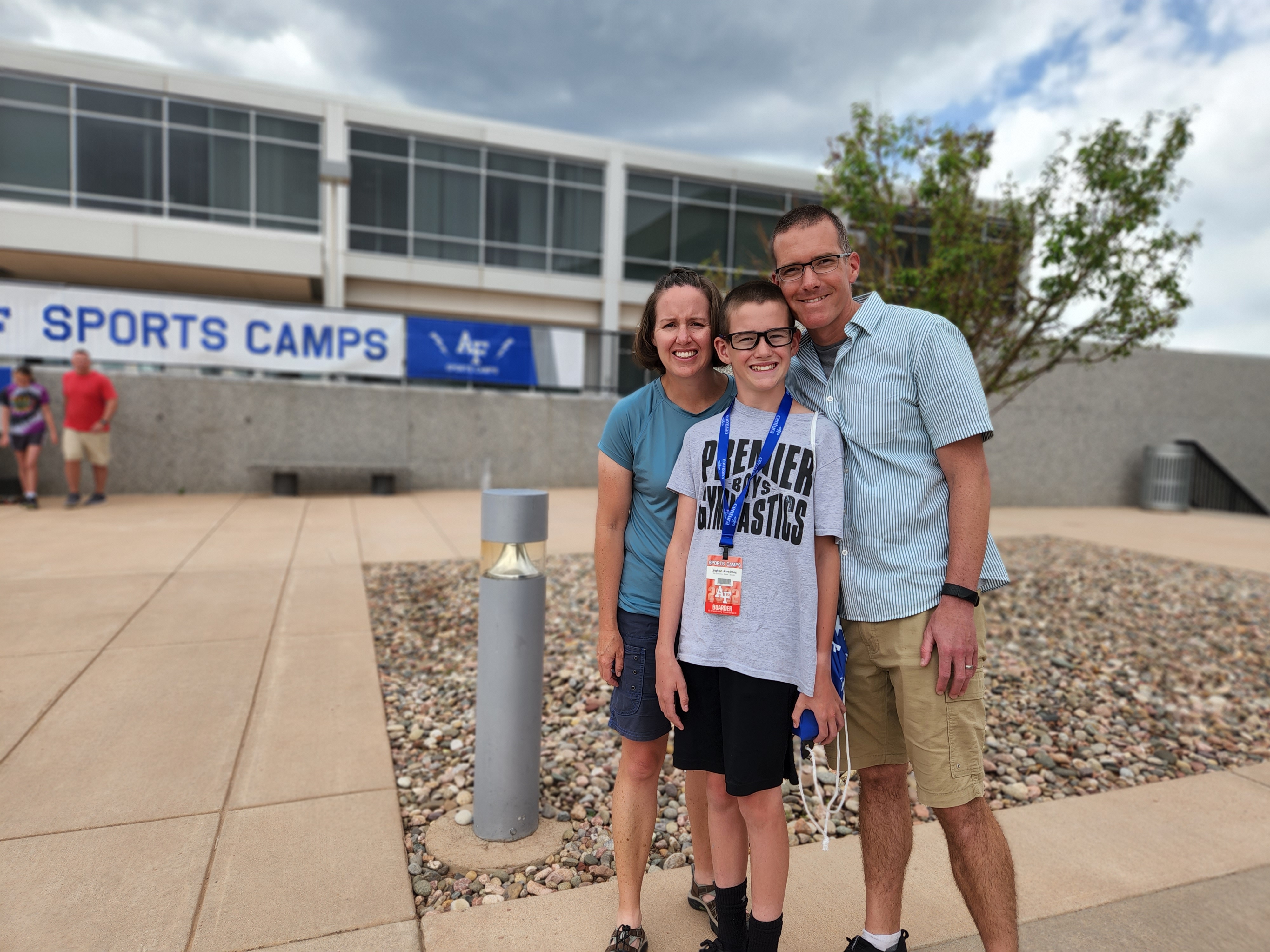 Leighton did his first away camp a week or so ago. He did gymnastics camp at the Air Force Academy in Colorado Springs. Everyone was excited to drop him off and explore the Air Force Academy a little. We weren’t allowed to go with him to his dorm, so after we said goodbye at the bus we drove up to the visitor’s center and explored a little more. Each of the other kids picked a plane they wanted their photo in front of and from there we could see the backside of the dorm that Leighton was staying in. He sent us a photo of his dorm. He spent all week working on different gymnastics skills and working with some different coaches. He usually sent me a brief update each evening. He mastered a couple new skills and made friends with his roommate. He struggled a bit with the meals because of his Celiacs but we had prepared and packed him some food that he could eat when he had foods he couldn’t. On Friday we got to go and watch his last workout session and he showed us his new skills and it was super fun to see how much he had grown. Clint had decorated the driveway and Leighton was glad to be home.