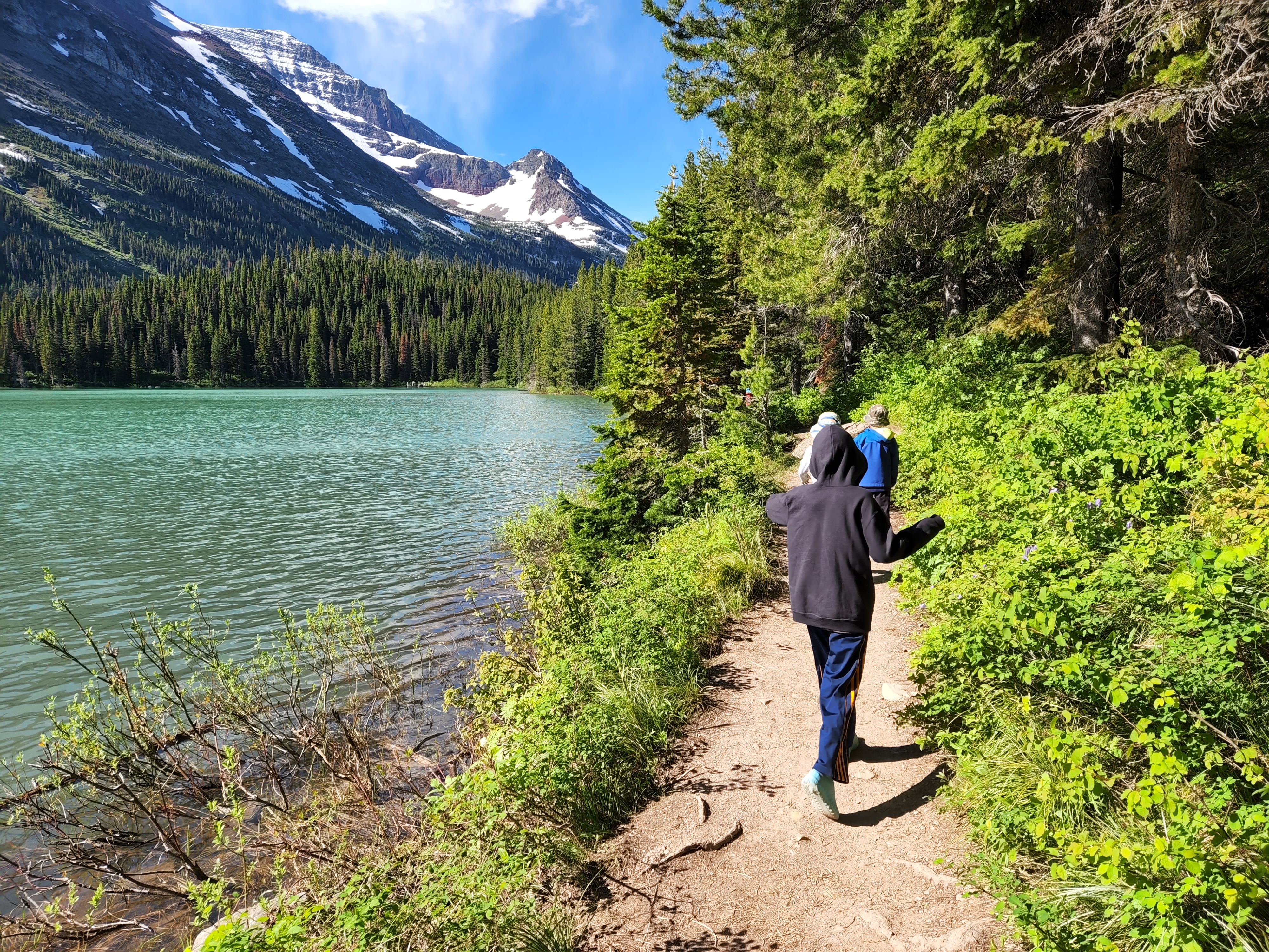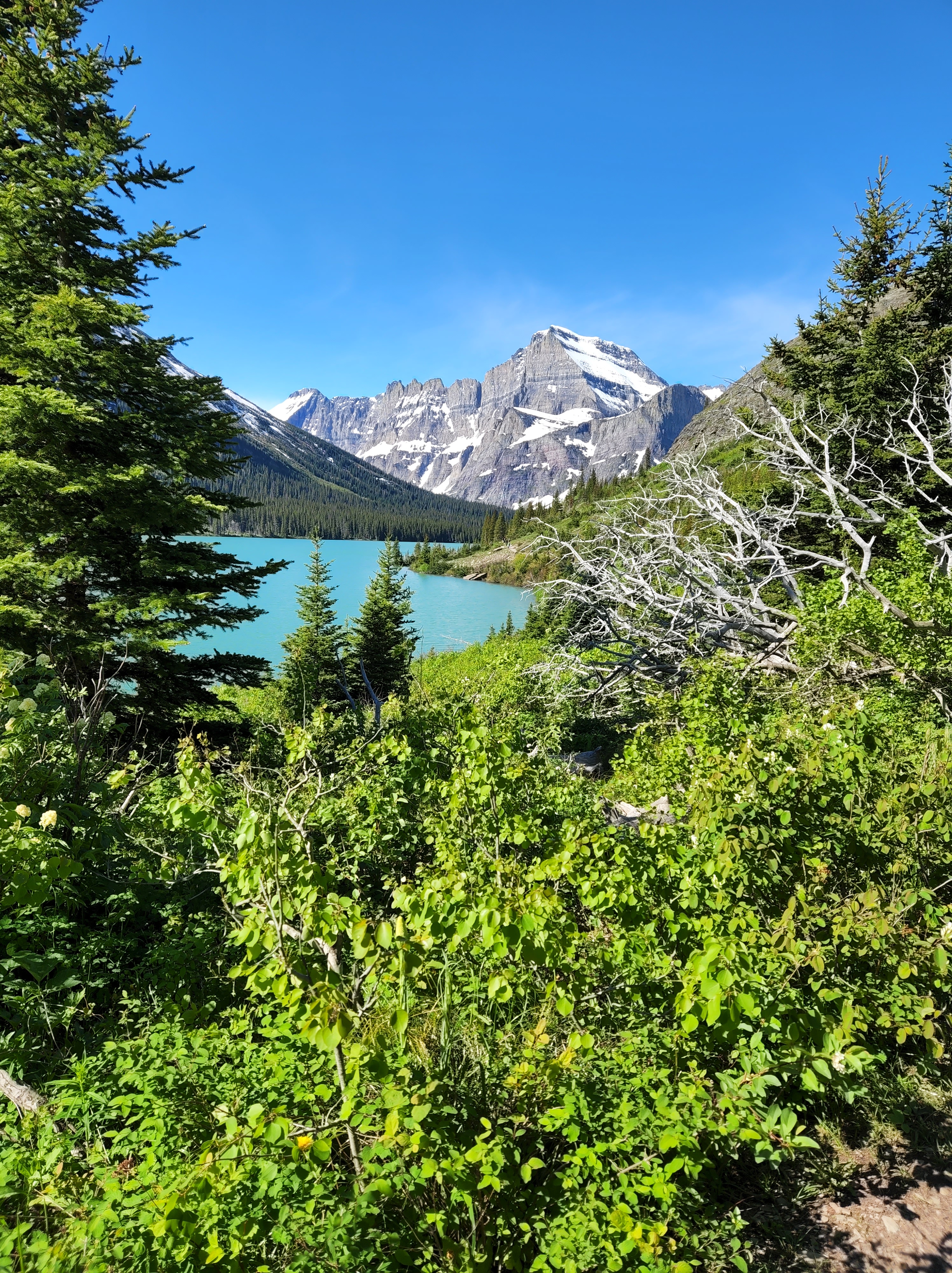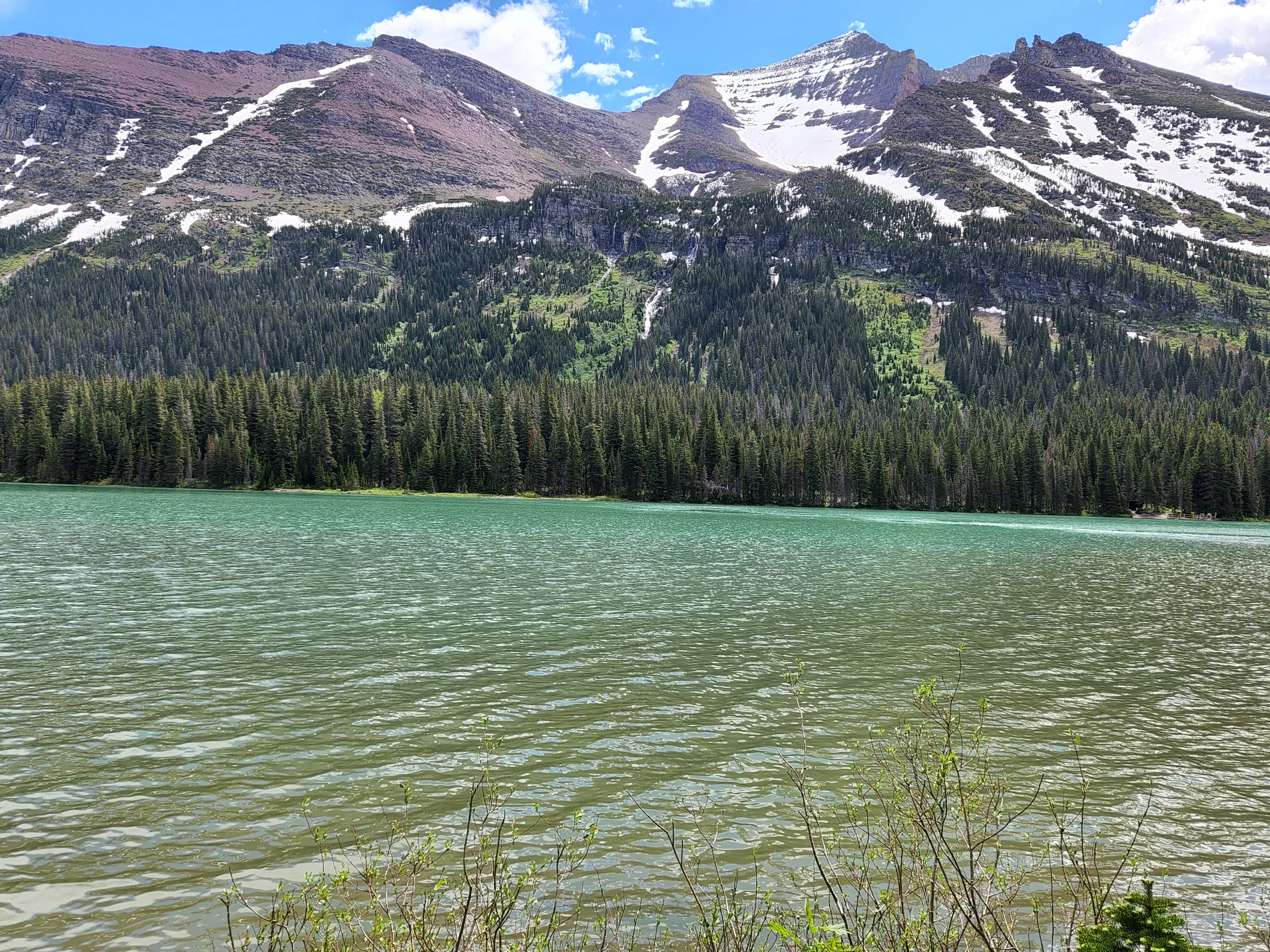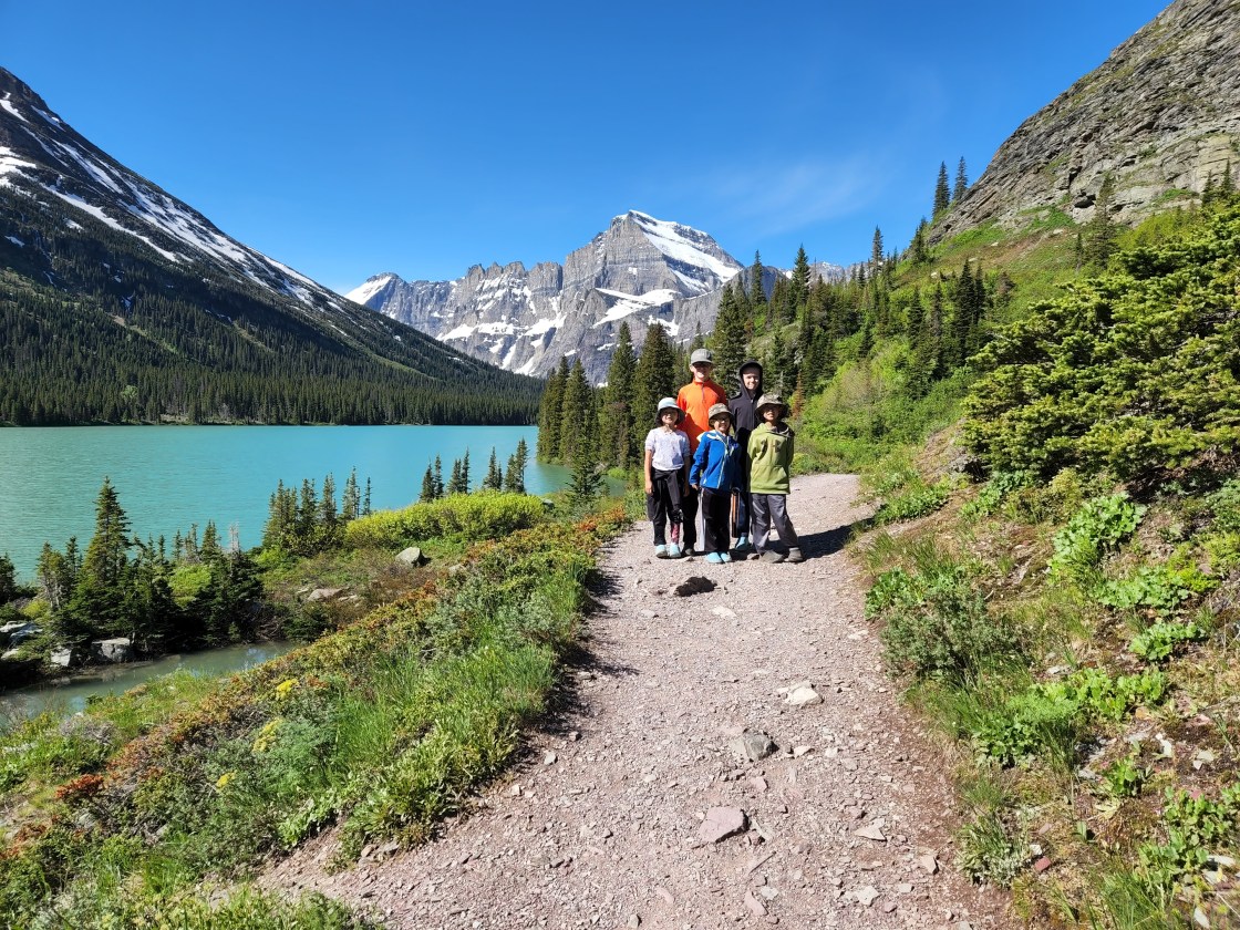 We started day 2 in Glacier early and were very excited to hike. Luckily thanks to Alltrails app I had read before we left that there was a lot of water crossing on the trail and so a quick amazon order got us some rubber shoe protectors which worked really well. They were fairly well shredded by the end of our hike, but they kept our feet a whole lot drier then they would’ve been. We also knew starting the hike that the trail was closed before the glacier because of all the snow fall that they have received so we knew we weren’t going to be able to see the glacier but knew the hike was going to be breathtaking nonetheless. We were not disappointed either. We hiked along Swiftcurrent Lake, Lake Josephine and then up over Grinnell Lake. And they were amazing and the colors were so vivid. And the waterfalls were amazing, I don’t know how many we crossed along the trail but each one was unique and beautiful. The weather was perfect as well, we started out with pretty cool weather but the sun slowly warmed up. By the end of the hike after lunch there was a storm moving in and we had a few raindrops but we couldn’t have asked for better weather. After getting back in our car we encountered two more grizzlies on the road as we were headed out.