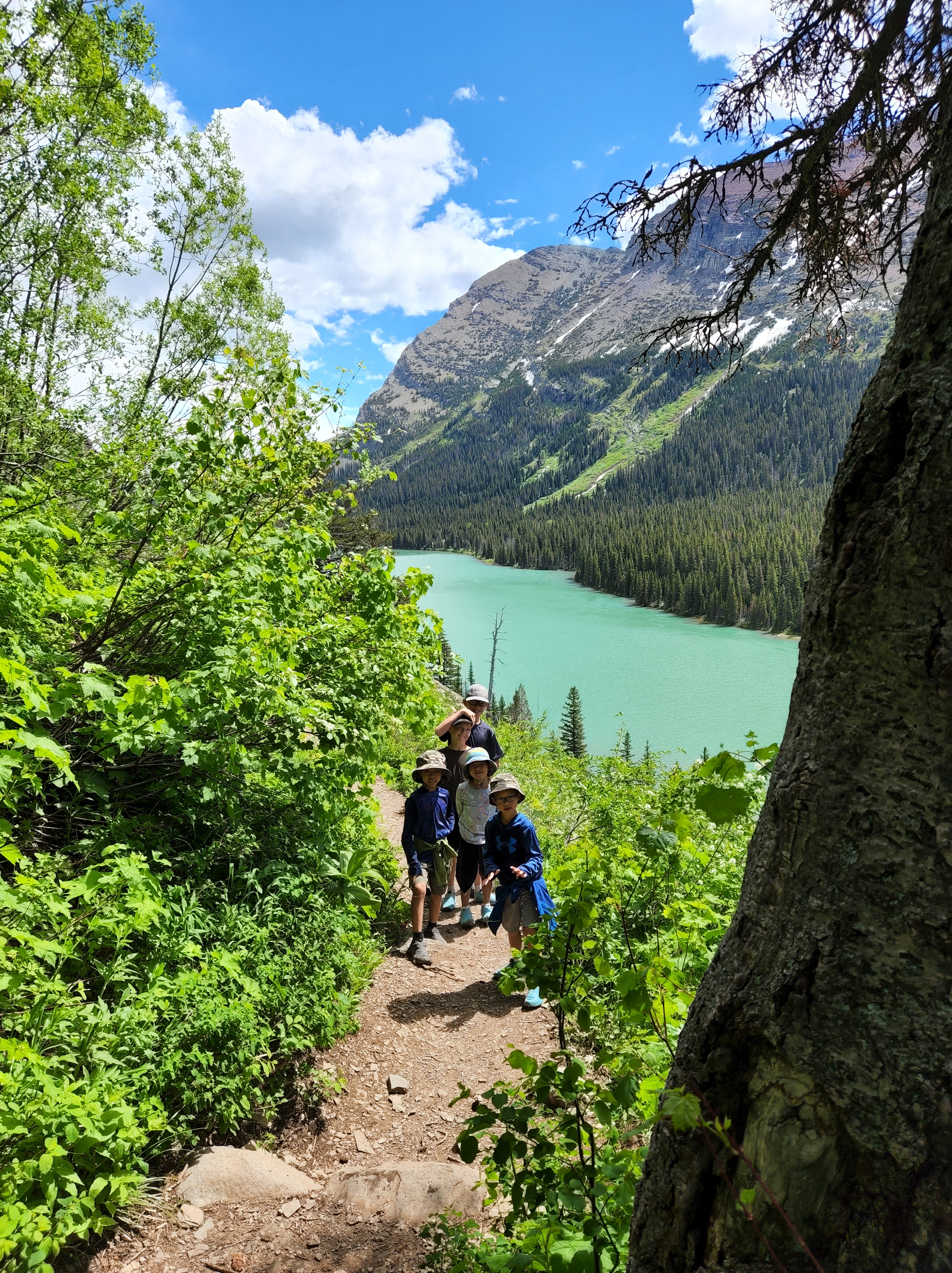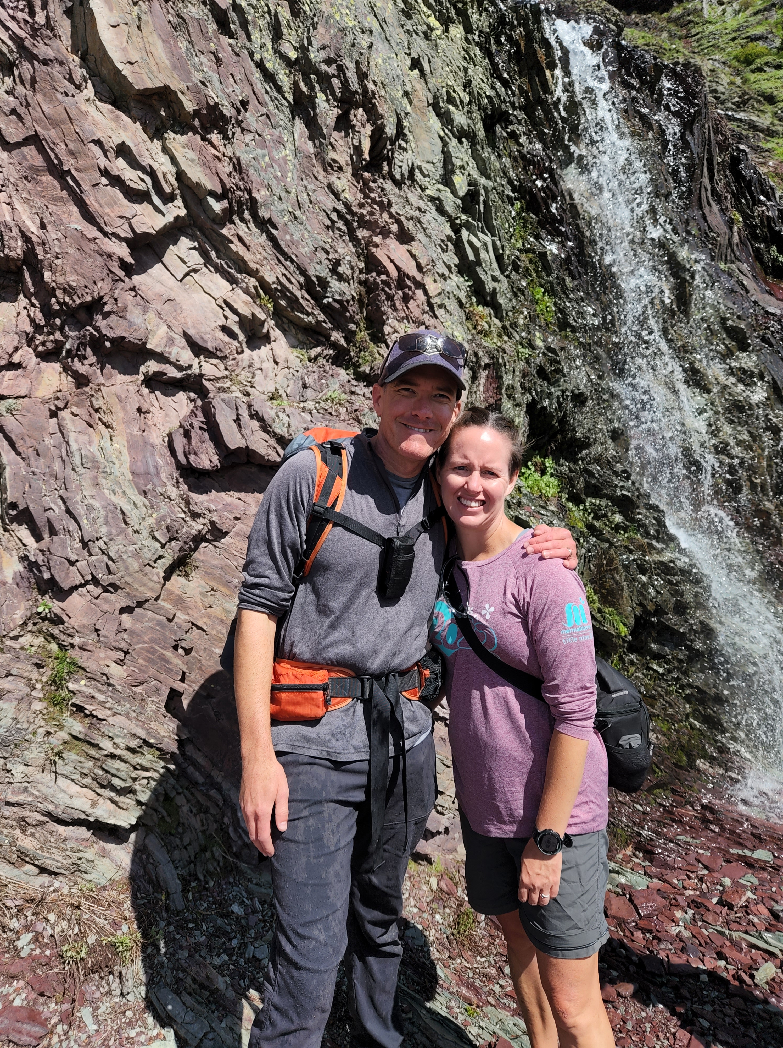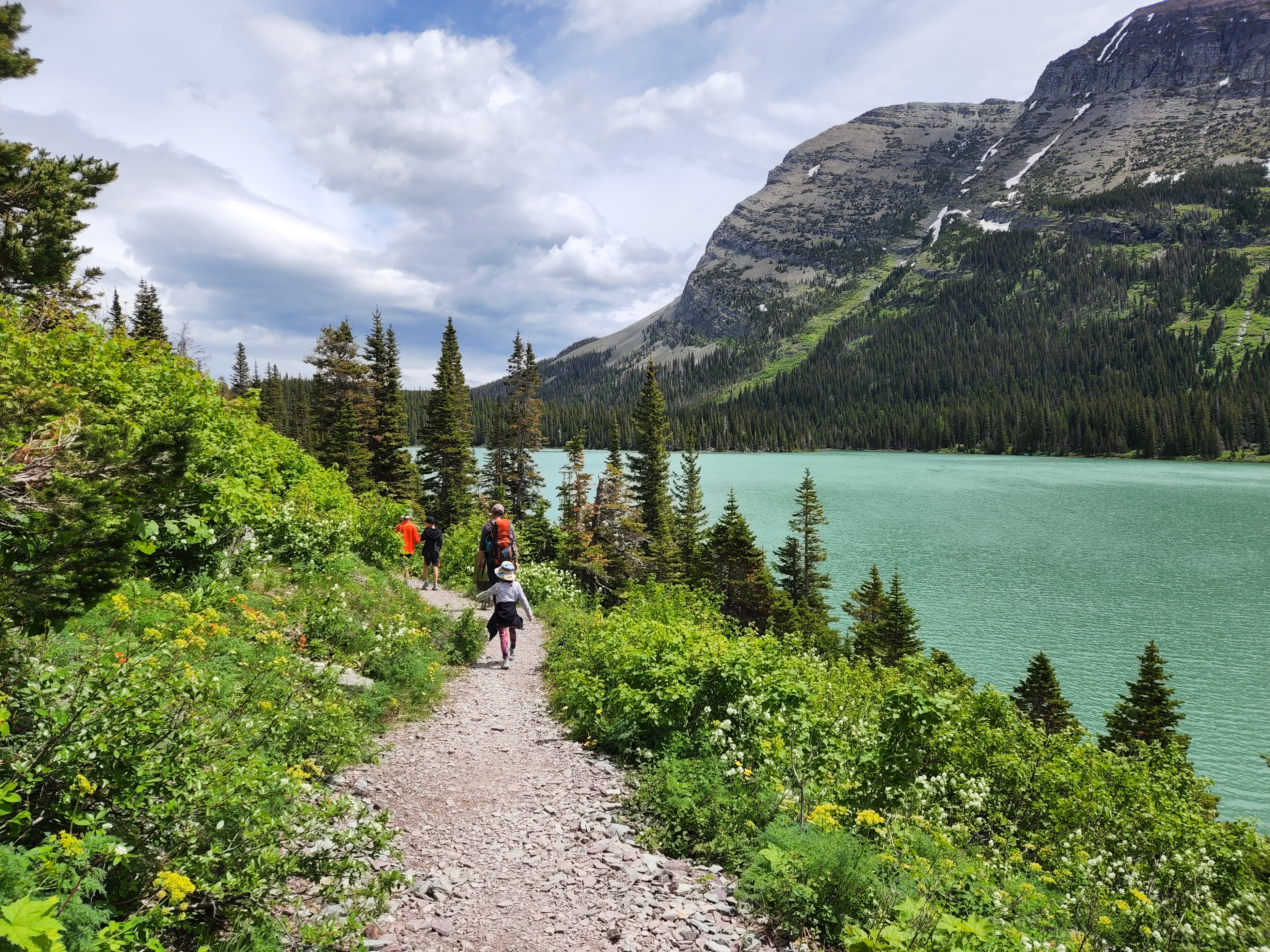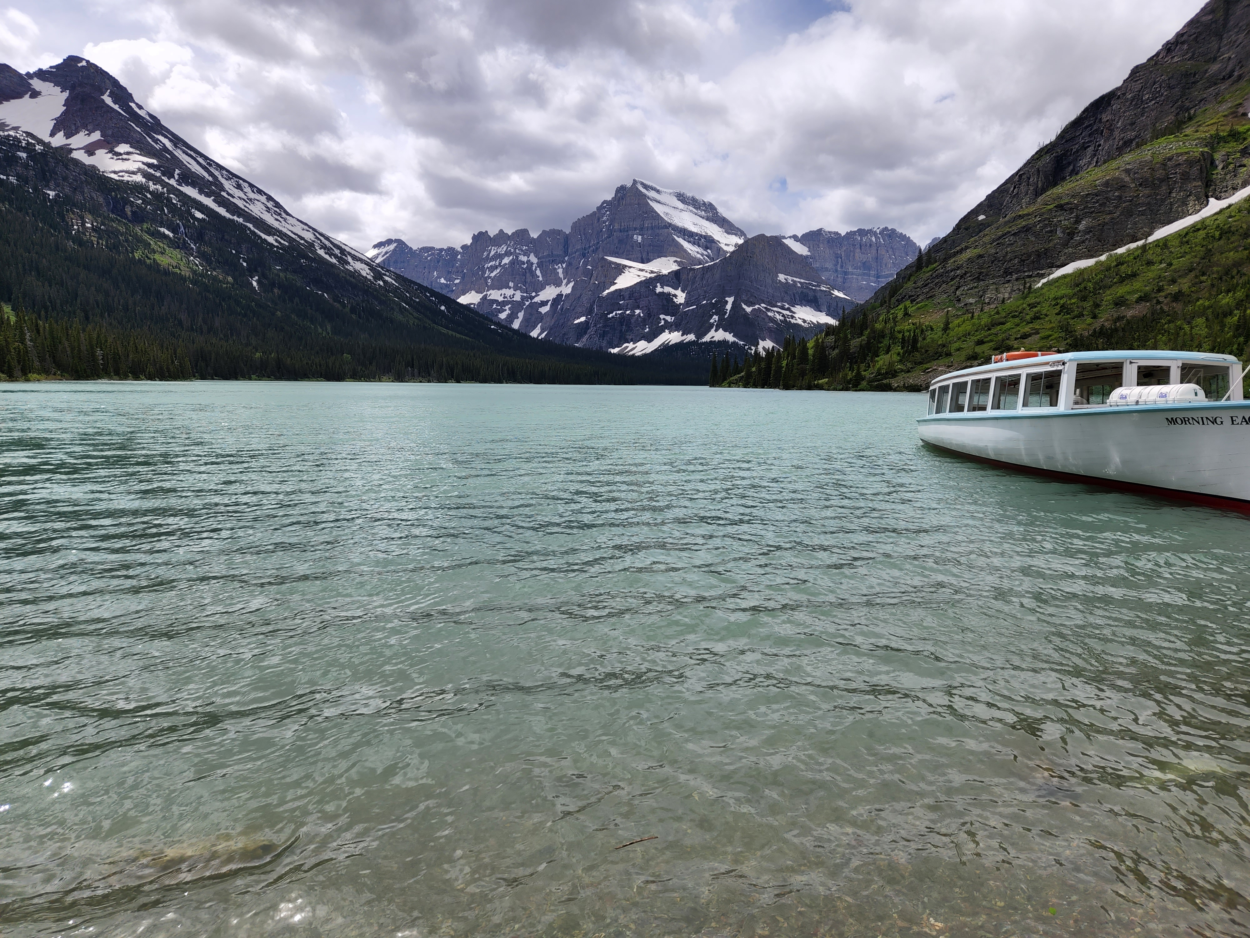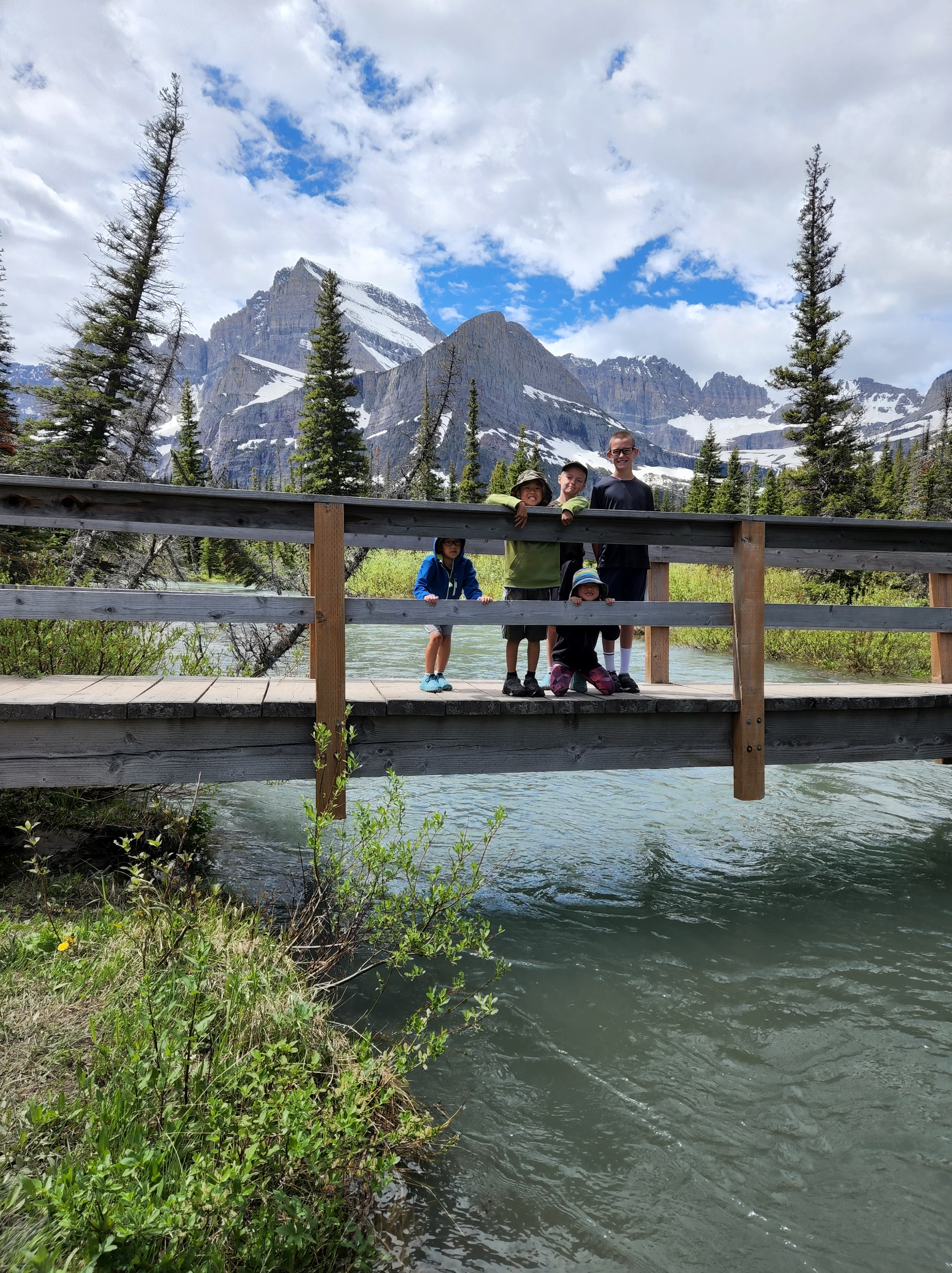 We started day 2 in Glacier early and were very excited to hike. Luckily thanks to Alltrails app I had read before we left that there was a lot of water crossing on the trail and so a quick amazon order got us some rubber shoe protectors which worked really well. They were fairly well shredded by the end of our hike, but they kept our feet a whole lot drier then they would’ve been. We also knew starting the hike that the trail was closed before the glacier because of all the snow fall that they have received so we knew we weren’t going to be able to see the glacier but knew the hike was going to be breathtaking nonetheless. We were not disappointed either. We hiked along Swiftcurrent Lake, Lake Josephine and then up over Grinnell Lake. And they were amazing and the colors were so vivid. And the waterfalls were amazing, I don’t know how many we crossed along the trail but each one was unique and beautiful. The weather was perfect as well, we started out with pretty cool weather but the sun slowly warmed up. By the end of the hike after lunch there was a storm moving in and we had a few raindrops but we couldn’t have asked for better weather. After getting back in our car we encountered two more grizzlies on the road as we were headed out.