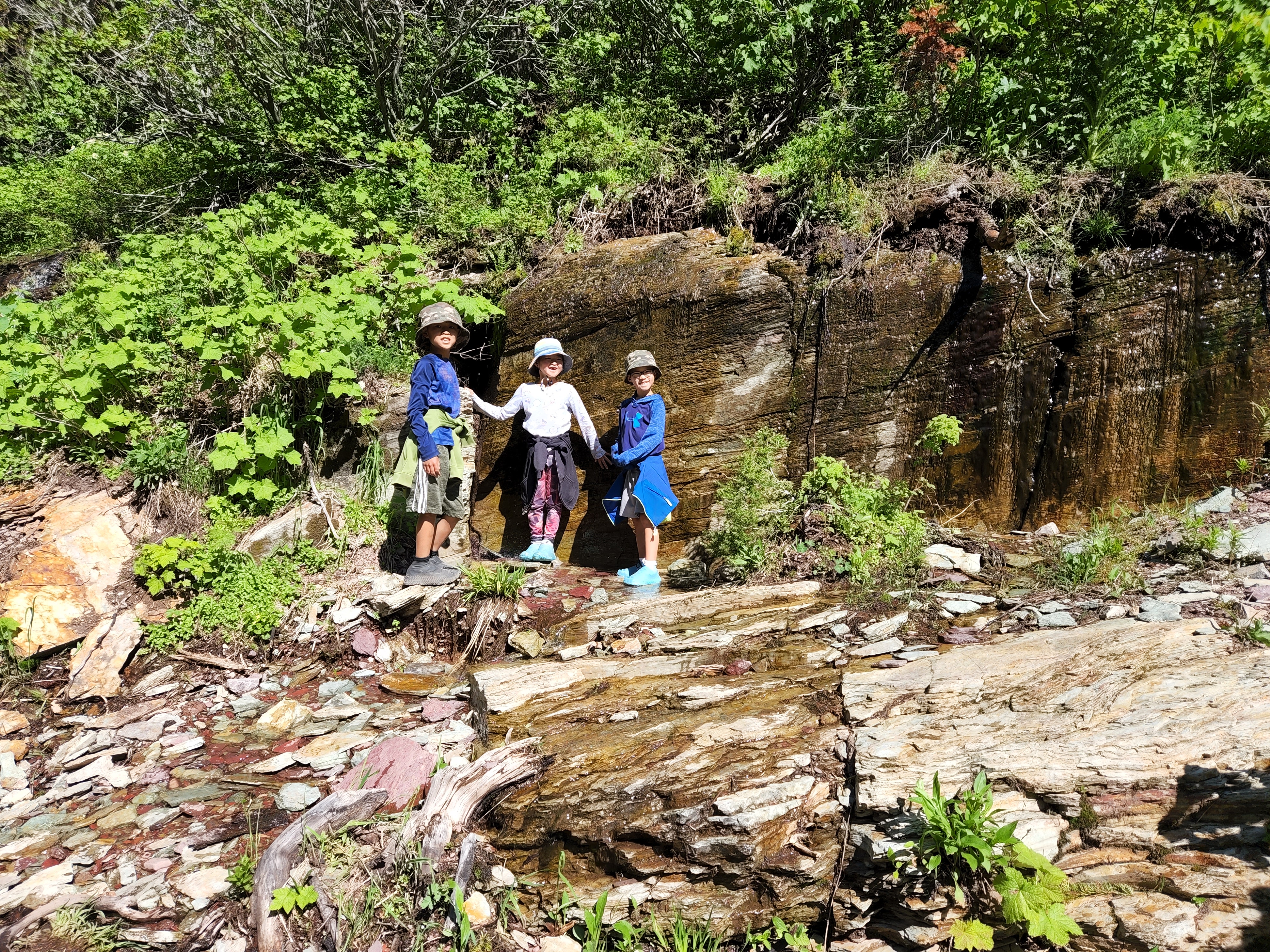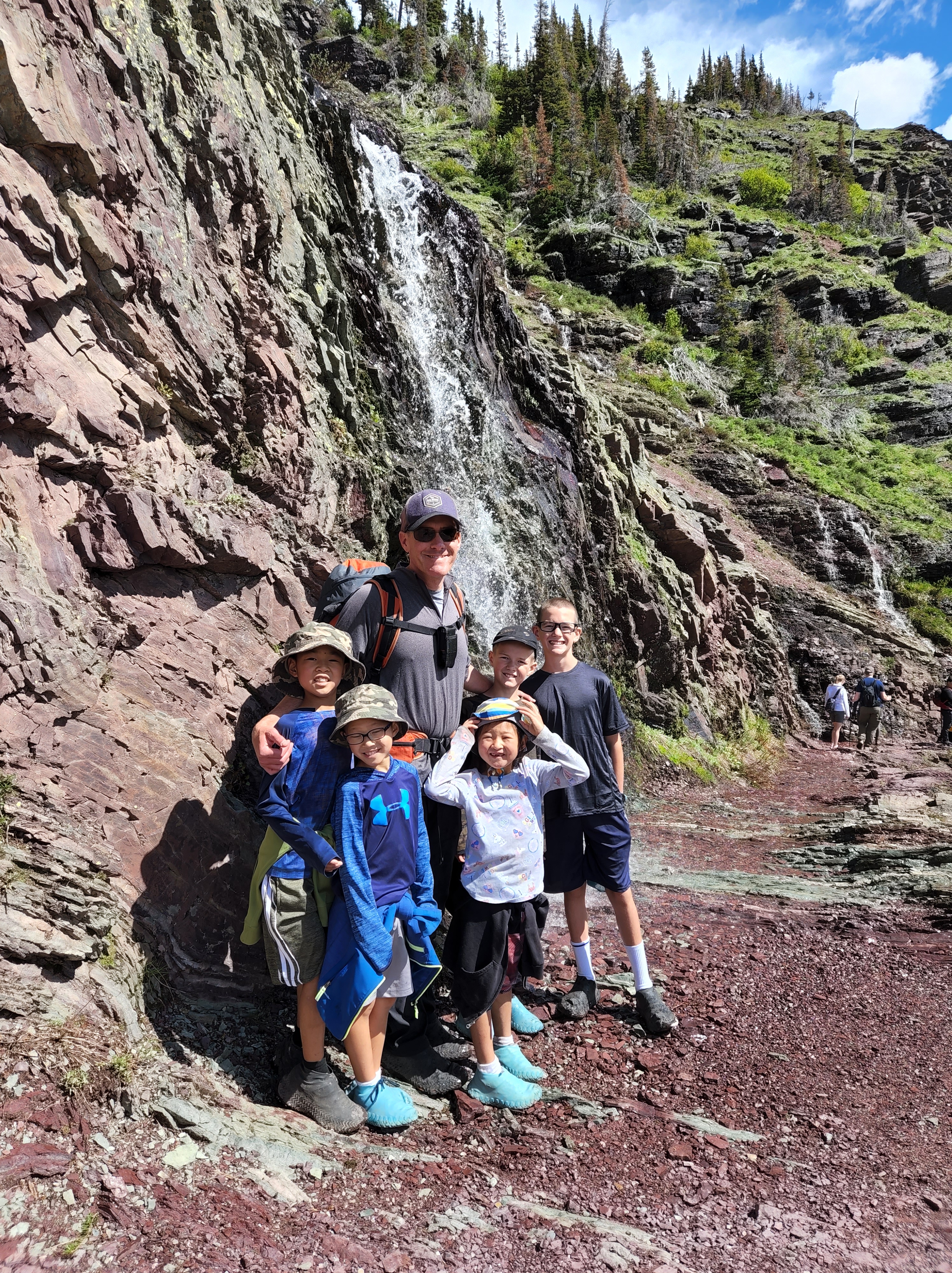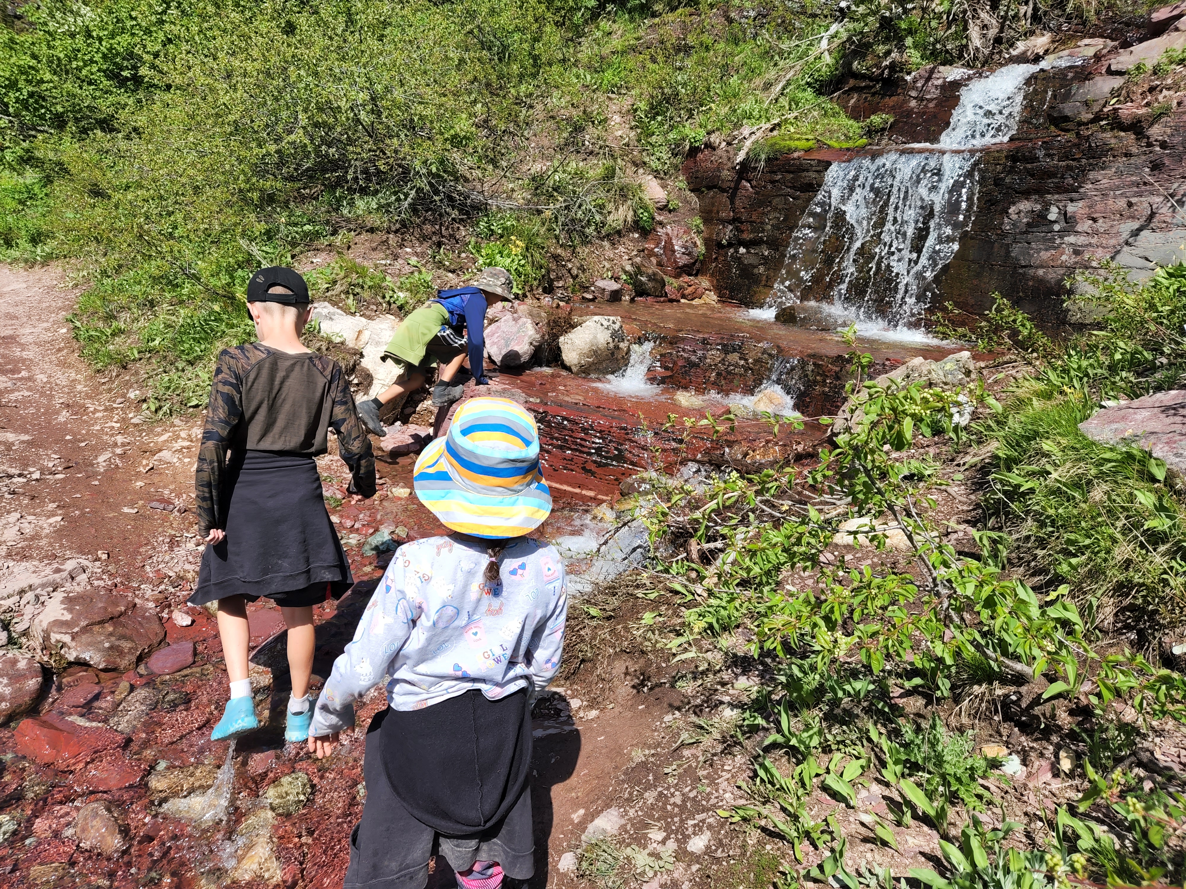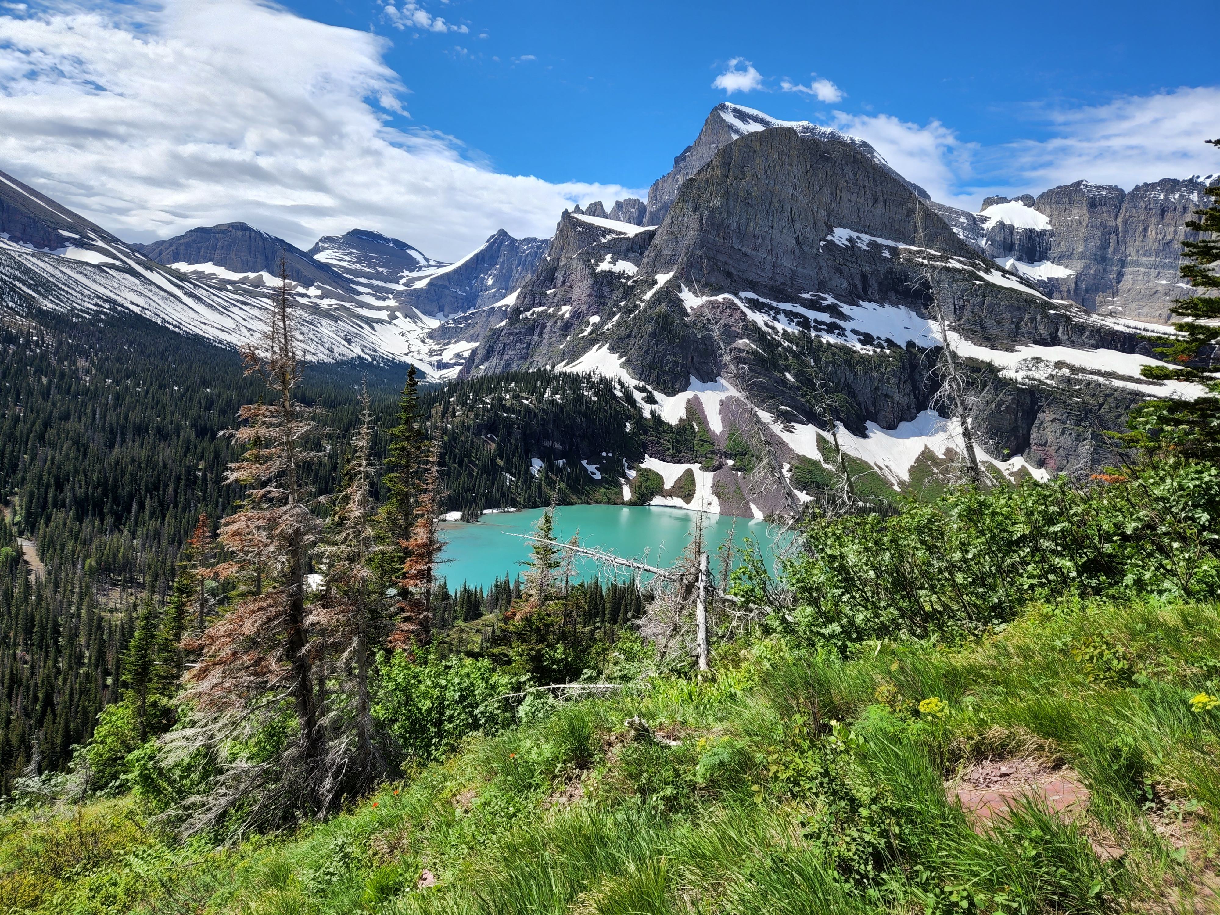 We started day 2 in Glacier early and were very excited to hike. Luckily thanks to Alltrails app I had read before we left that there was a lot of water crossing on the trail and so a quick amazon order got us some rubber shoe protectors which worked really well. They were fairly well shredded by the end of our hike, but they kept our feet a whole lot drier then they would’ve been. We also knew starting the hike that the trail was closed before the glacier because of all the snow fall that they have received so we knew we weren’t going to be able to see the glacier but knew the hike was going to be breathtaking nonetheless. We were not disappointed either. We hiked along Swiftcurrent Lake, Lake Josephine and then up over Grinnell Lake. And they were amazing and the colors were so vivid. And the waterfalls were amazing, I don’t know how many we crossed along the trail but each one was unique and beautiful. The weather was perfect as well, we started out with pretty cool weather but the sun slowly warmed up. By the end of the hike after lunch there was a storm moving in and we had a few raindrops but we couldn’t have asked for better weather. After getting back in our car we encountered two more grizzlies on the road as we were headed out.