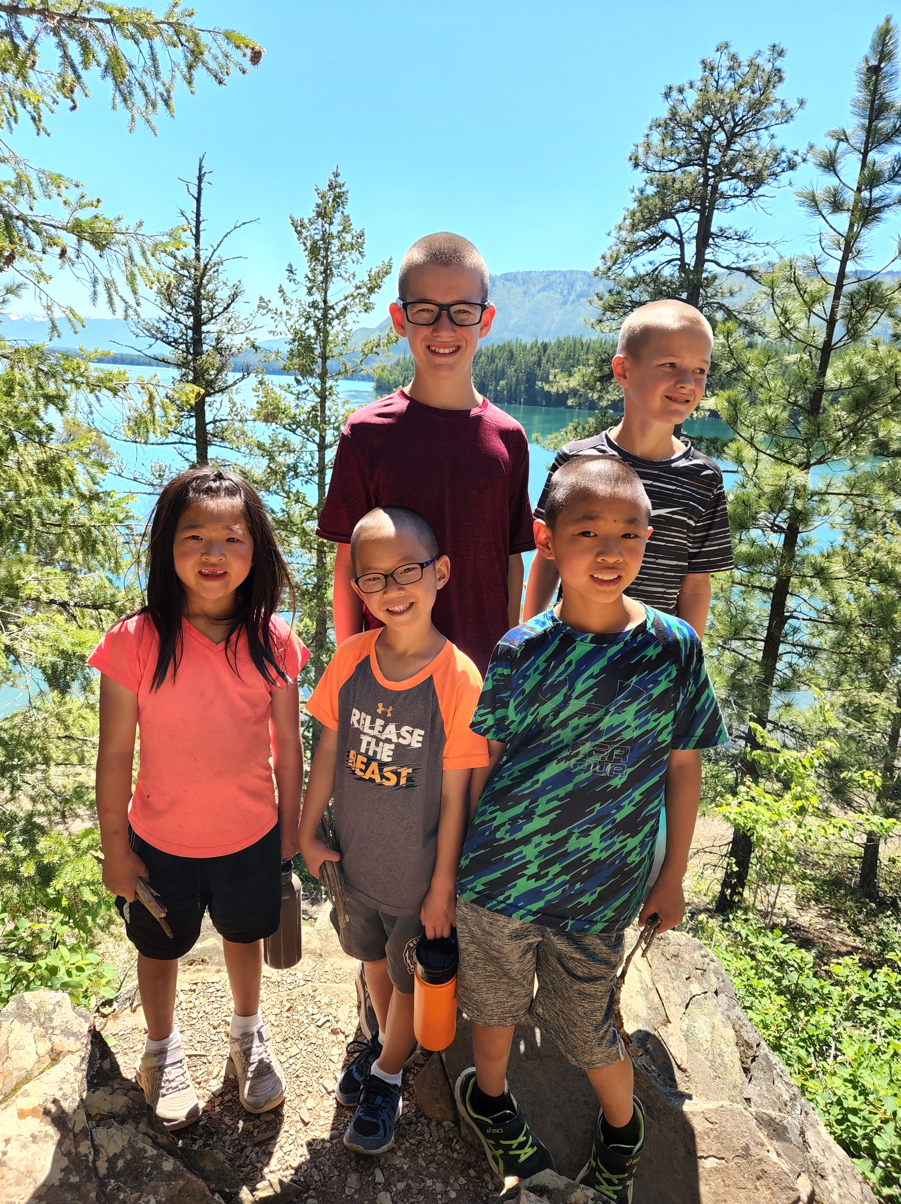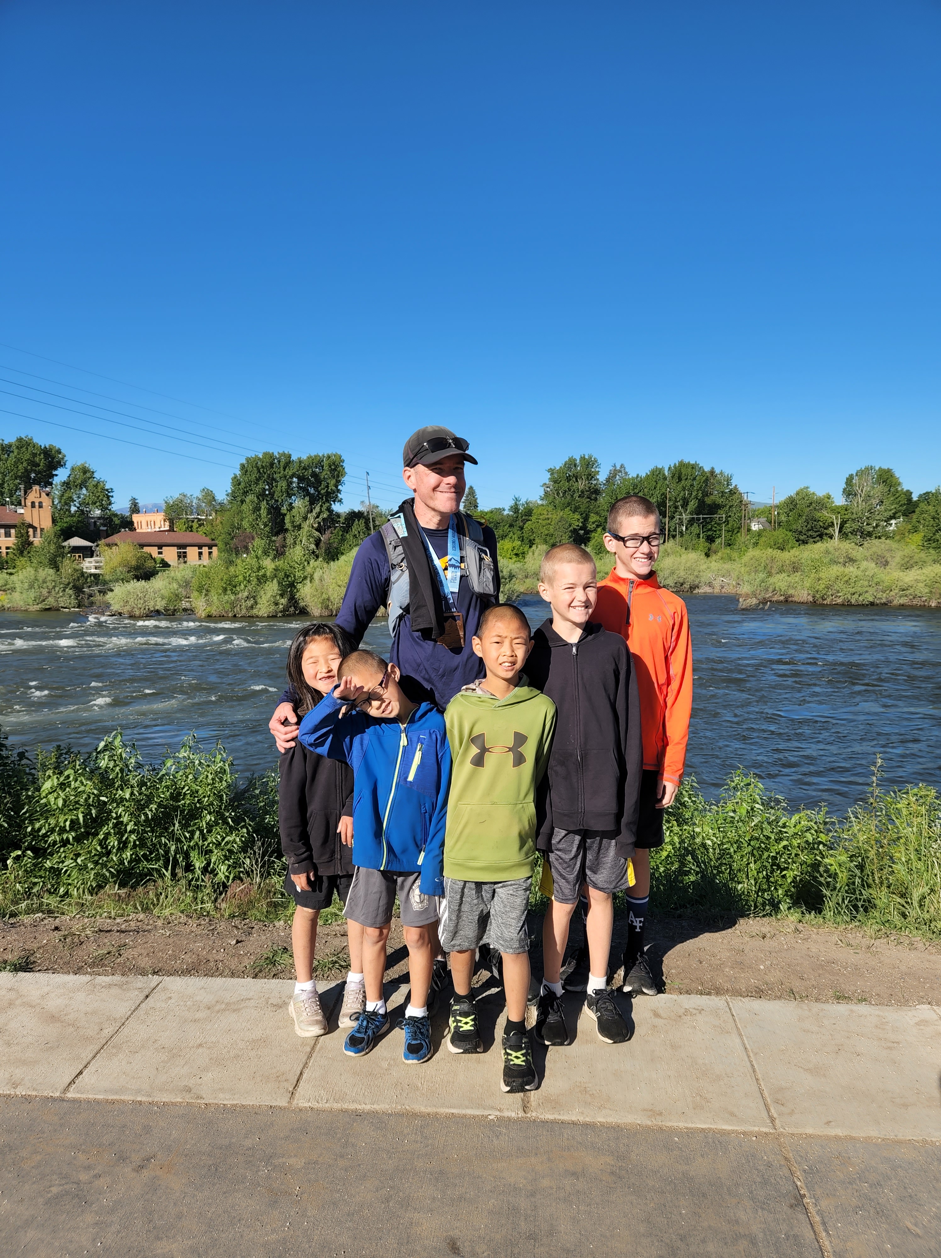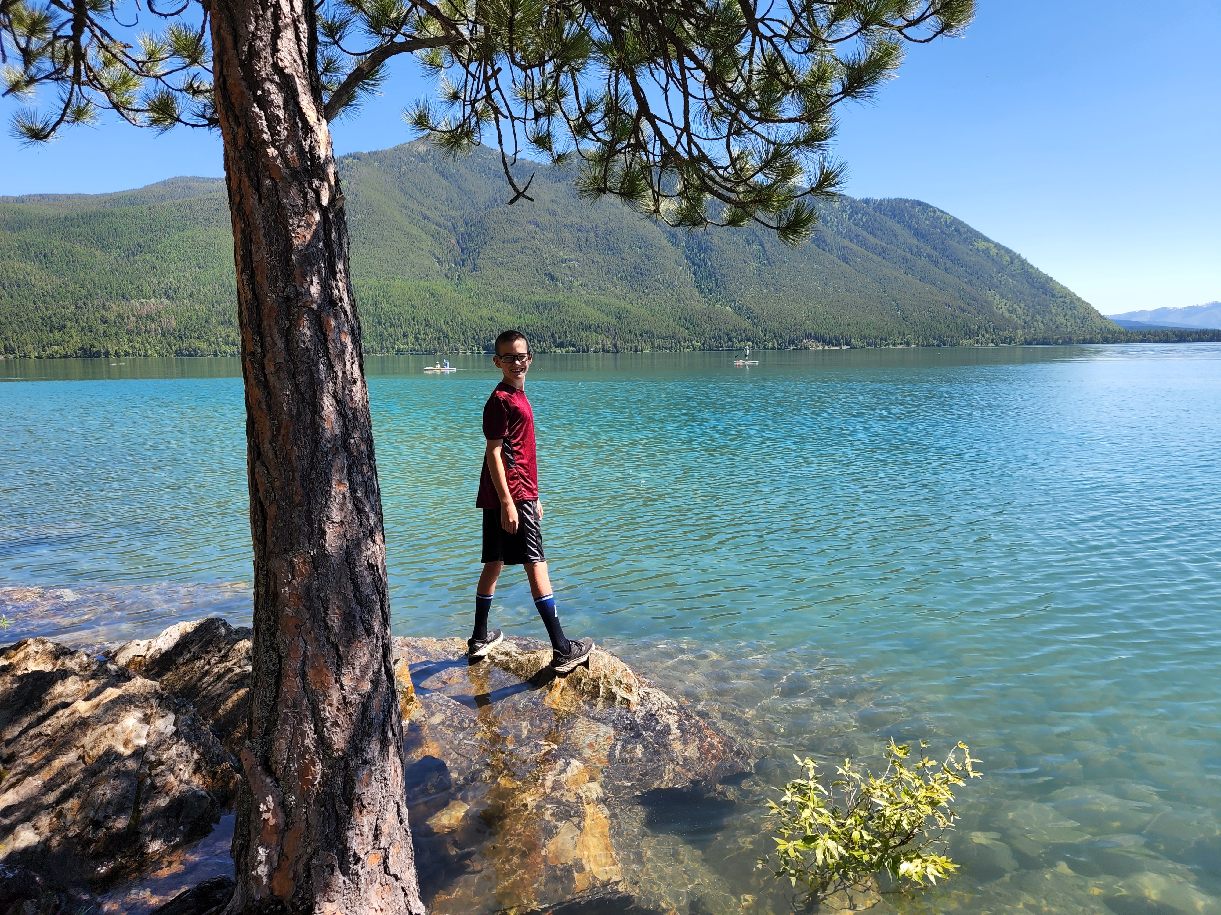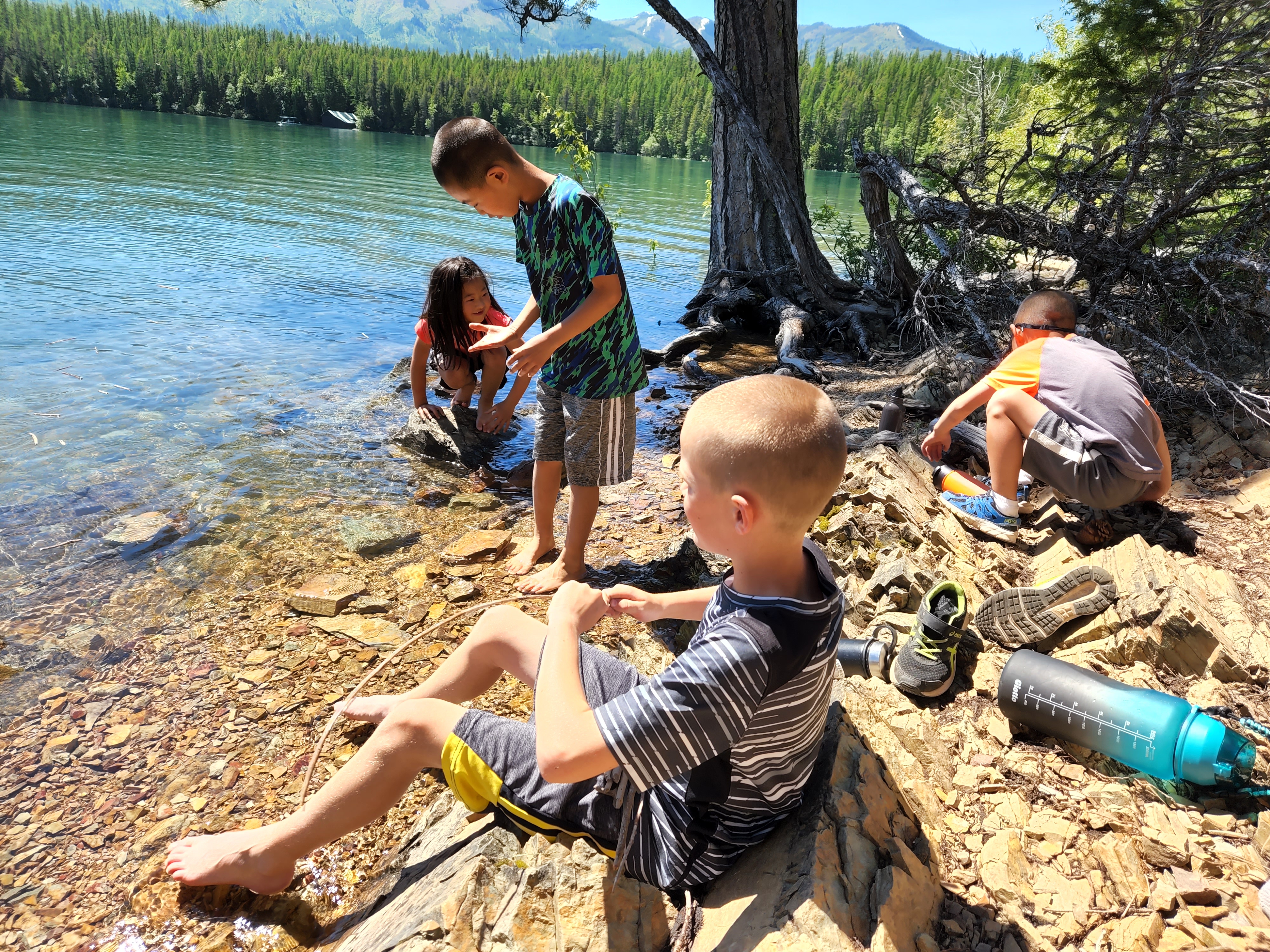 The Sunday of our trip started very similarly to the Saturday with us getting the kids up before the sun to load up the van only this time we were dropping Clint off at 4:15AM for the shuttles for his half marathon in Missoula. The kids and I were back at our Airbnb and in bed before 5AM. We actually got the idea for the trip from our friend Lindsay who lives in Maine and who we met at the Trailfest last year while helping with a medical emergency during the first race in Bryce. The kids and I woke up a while later and loaded up the Airbnb and then headed back into Missoula to meet Clint. He had just finished as we were parking and so we walked up the river to the finish area. Meanwhile I was getting updates from Lindsay as she made her way through her first marathon. We found a park to play at and let Clint get a little recovery while we waiting for her to finish. We got to cheer her over the final bridge and watch her cross the line and then meet up with her and her family. Afterwards we loaded up in the car and headed up to the west side of Glacier National Park (we’d been on the east side prior). We did a little hike to the shore of Lake McDonald and enjoyed sticking our feet in the cool clear water and throwing lots of rocks in the lake. The day was warm but we had a great time.