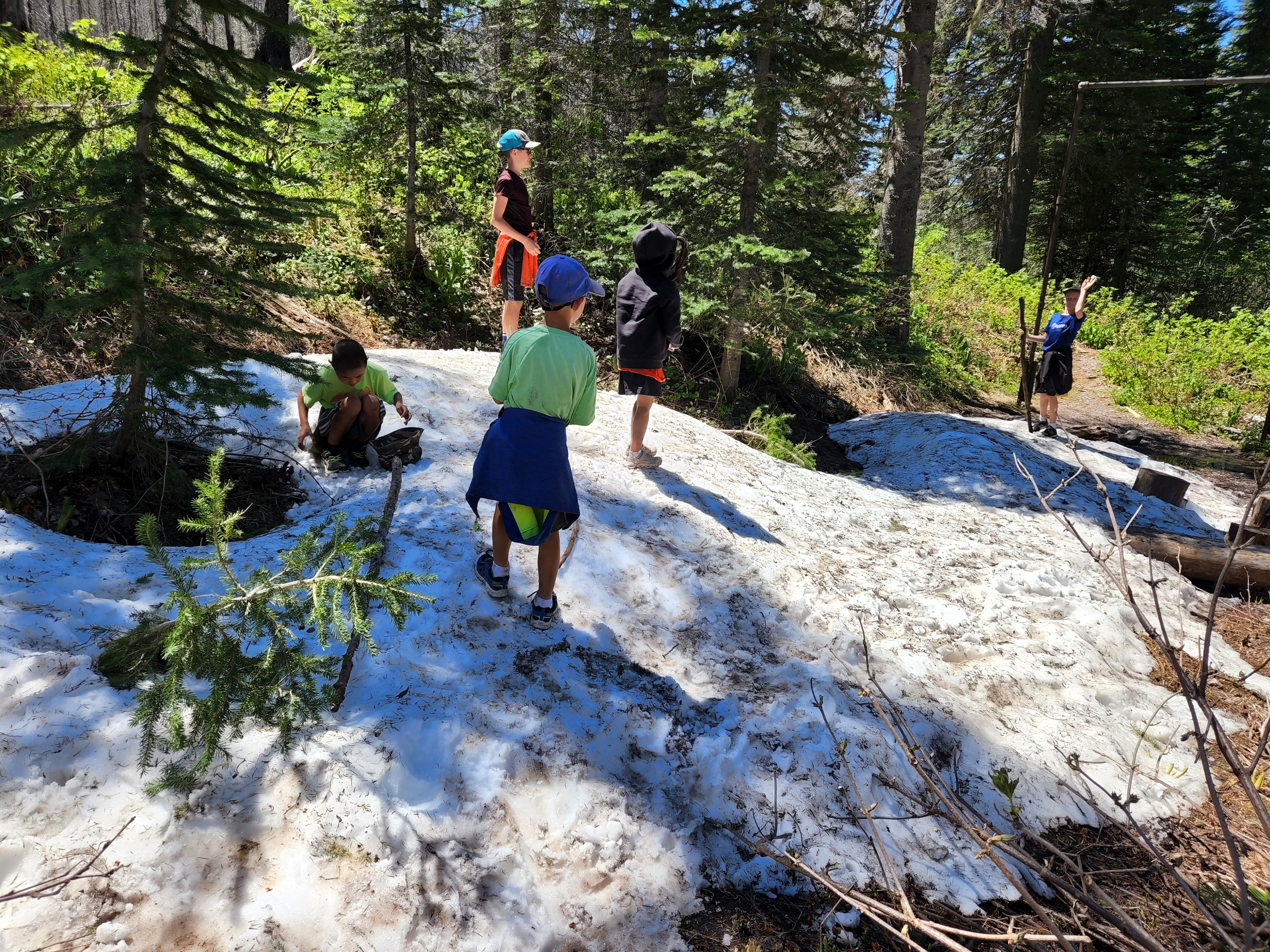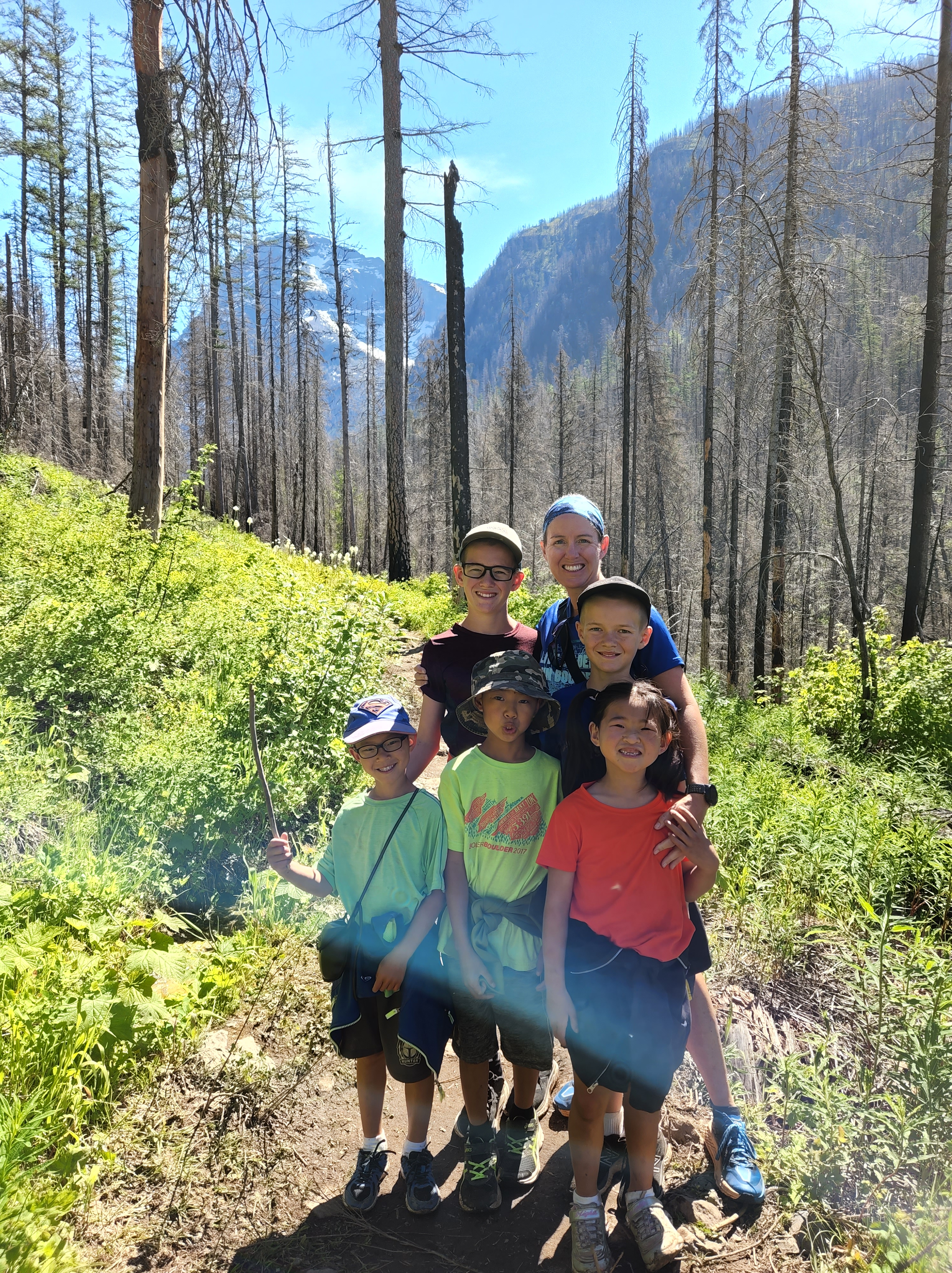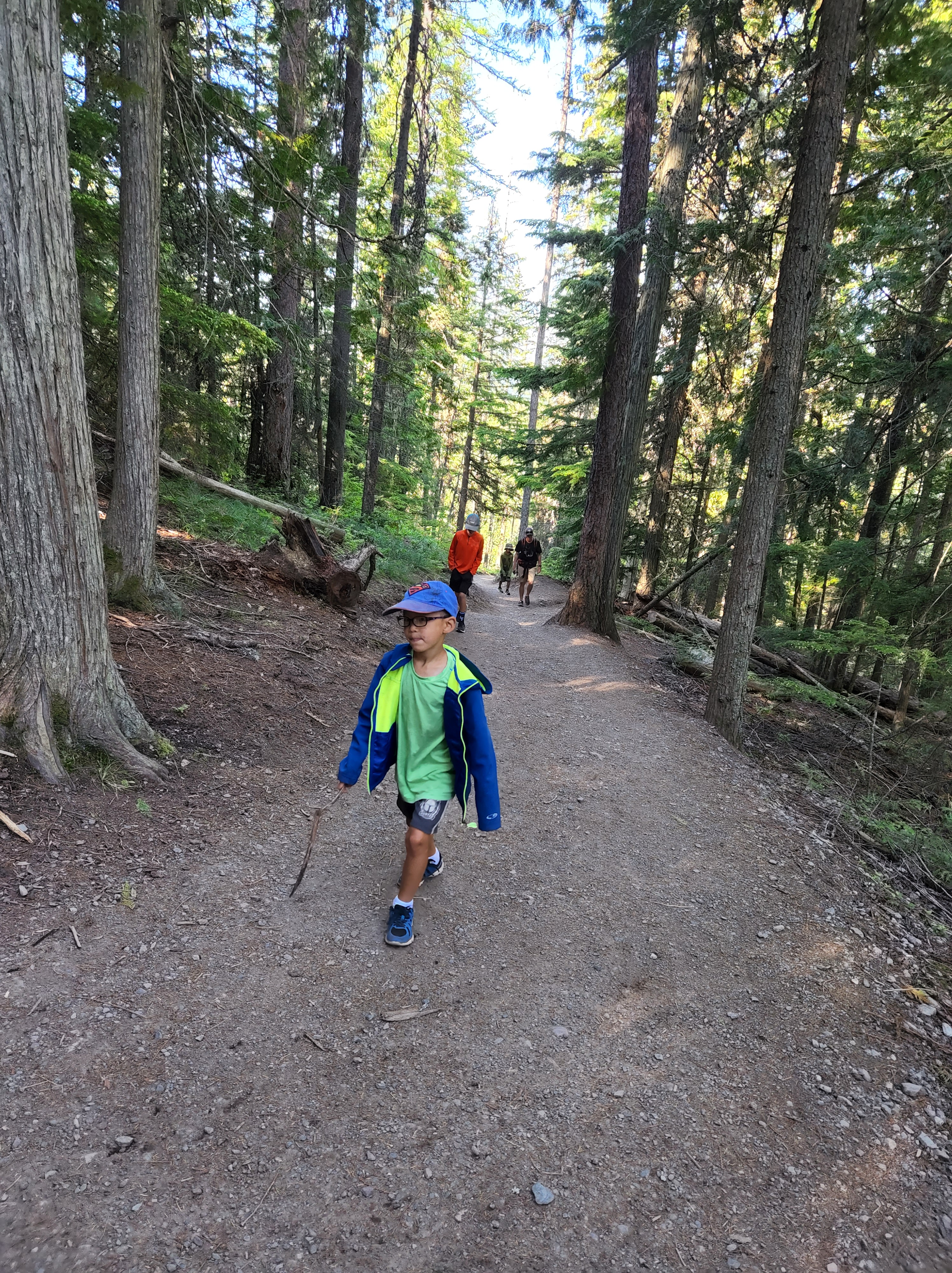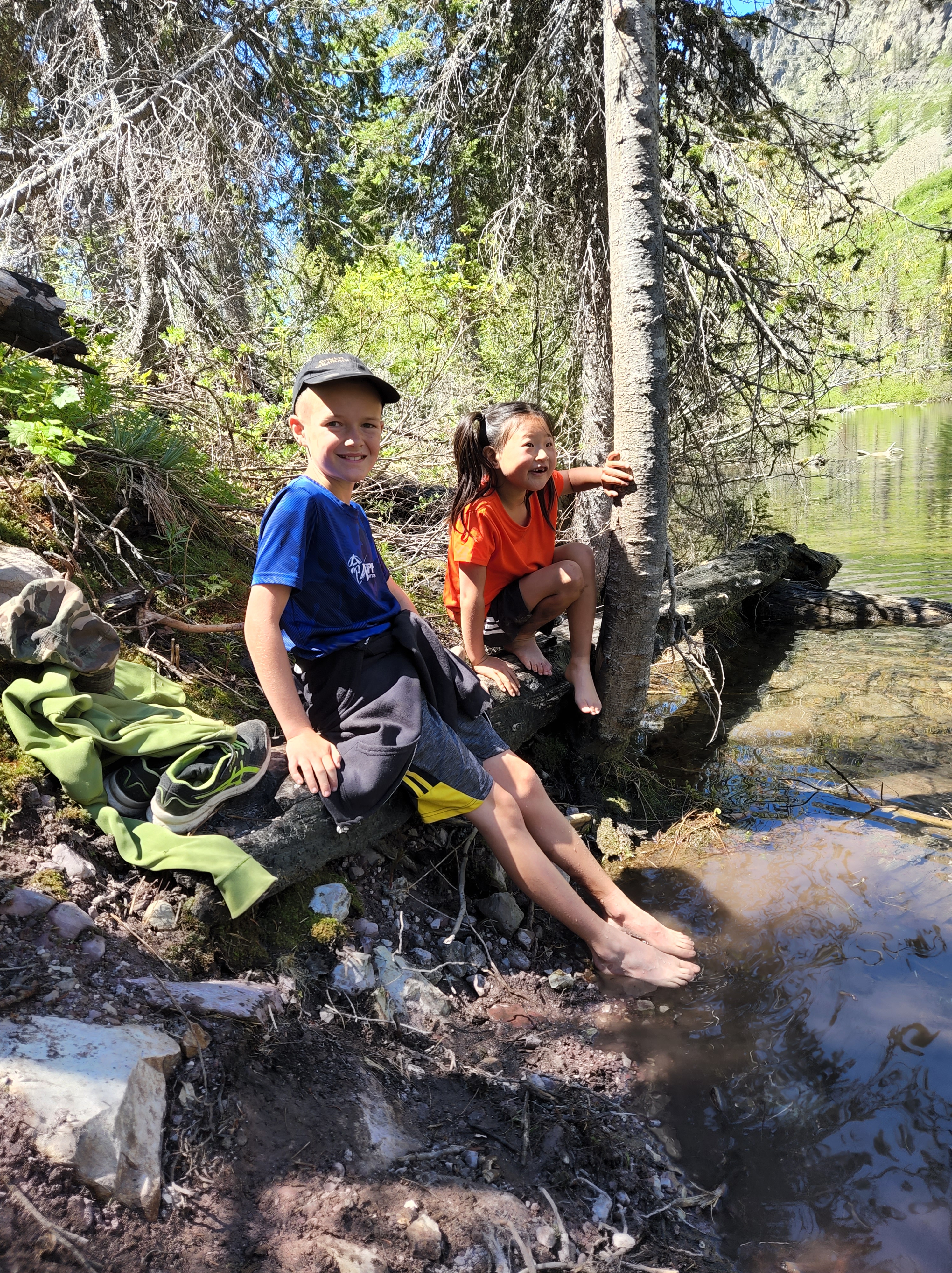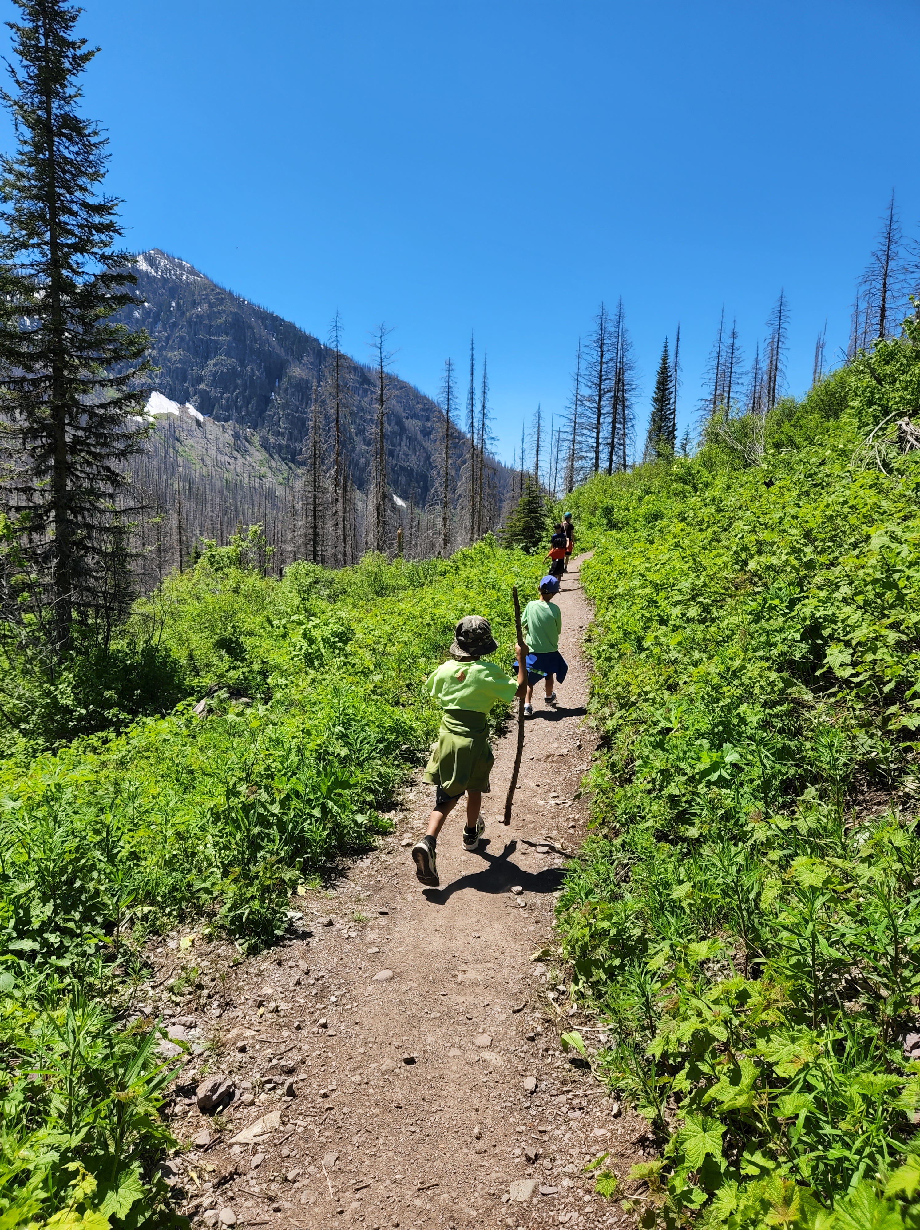 Sometimes despite the best planning and such the plans don’t work out. I had researched a ton of hikes and everything for Glacier but unfortunately the famed Going to the Sun Road was still closed because of snow and avalanche dangers and the hikes I had planned for our Monday in Glacier involved going on that road. So we had to figure out a different hike and so we chose Snyder Lake and we were not disappointed. It was very strep at times but gorgeous all along the way. There were very few people as well because access to even the open parts of Going to the Sun Road were still limited by having pre-time passes that we had snagged a few months before. The hike did take us through an old burn section from 2003 I think and we could see where the forest was re-growing and coming back. The lake at the top was beautiful and the kids didn’t hesitate to put their feet in. A little butterfly really seemed to like Edric’s hat and kept landing on it which was super fun. And there was a big area of snow on the hillside which everyone had fun making snowballs in (we even ambushed Clint when he wasn’t aware with a bunch of snow balls). On the way down we ended up encountering rather closely two grizzlies. They were up on the hill to our right and then intially went up and over the ridge, we were stopped a fair distance away with another couple hikers and the kids did great about staying close and taking all the precautions. However we realized with the other two hikers that the ridge they just went over lead right down to where the trail was also going. So we preceded cautiously and turns out they just wanted to drink and play in the stream the crossed the trail. The two bears didn’t really care about us about 20 yards away but we were all quite nervous crossing the stream so near to them. It was a great hike and even though it wasn’t the initial plan it still worked out great and we had a good time.