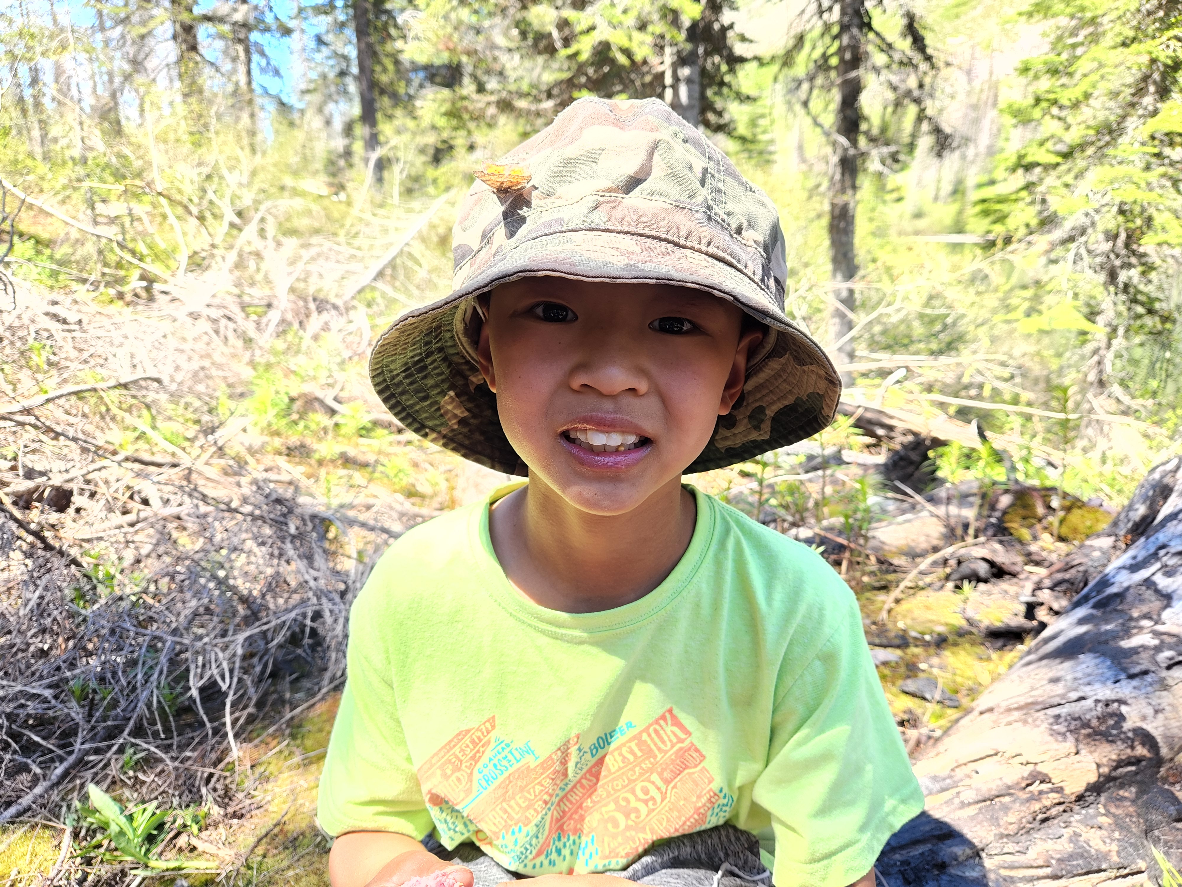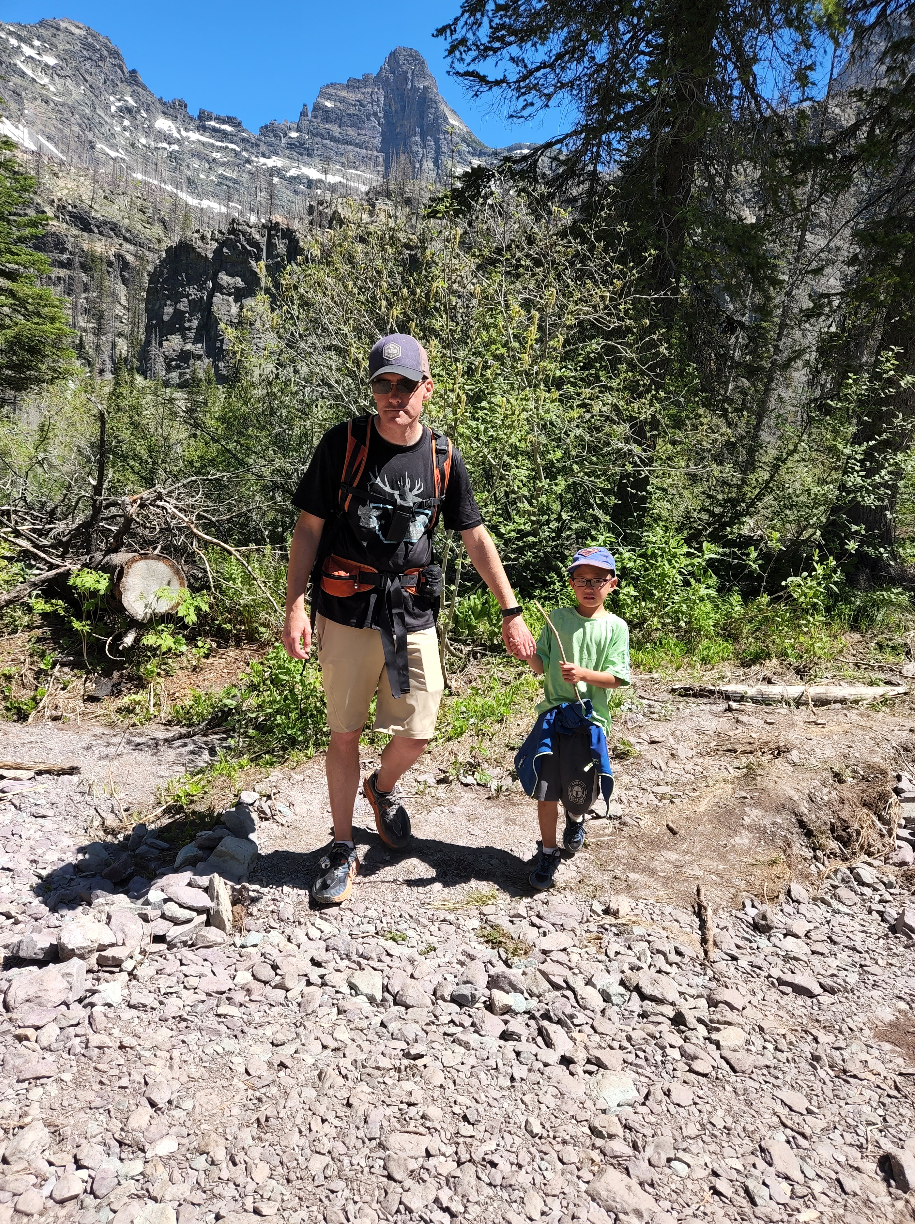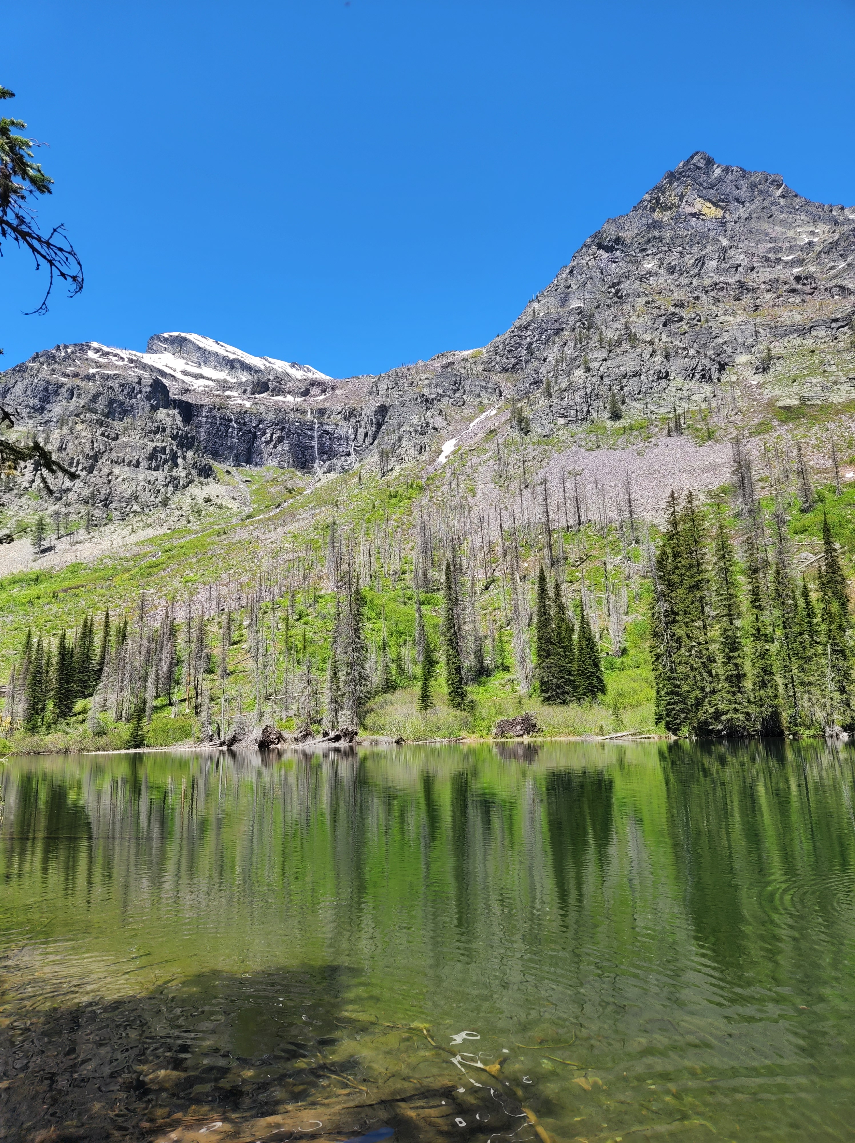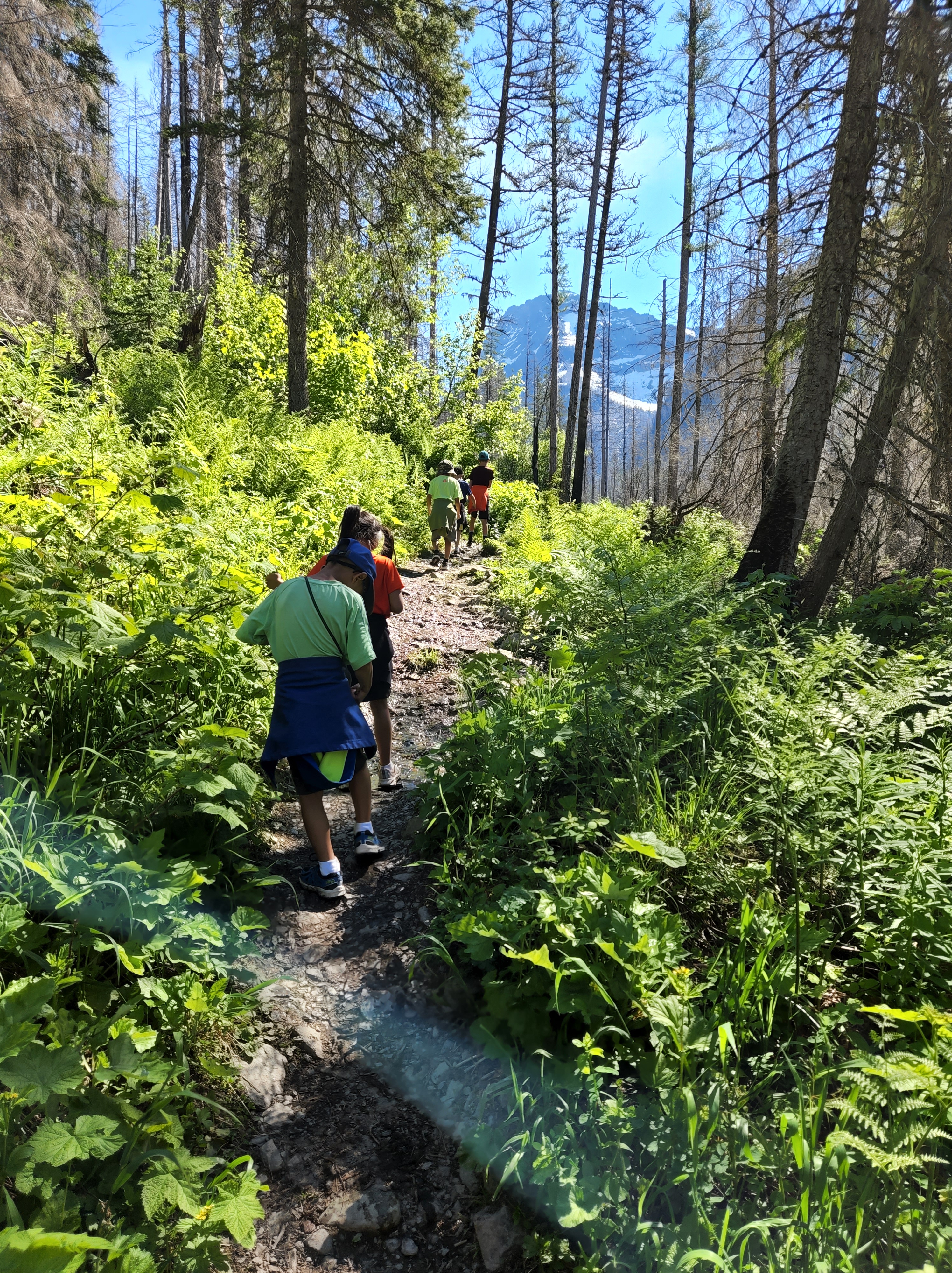 Sometimes despite the best planning and such the plans don’t work out. I had researched a ton of hikes and everything for Glacier but unfortunately the famed Going to the Sun Road was still closed because of snow and avalanche dangers and the hikes I had planned for our Monday in Glacier involved going on that road. So we had to figure out a different hike and so we chose Snyder Lake and we were not disappointed. It was very strep at times but gorgeous all along the way. There were very few people as well because access to even the open parts of Going to the Sun Road were still limited by having pre-time passes that we had snagged a few months before. The hike did take us through an old burn section from 2003 I think and we could see where the forest was re-growing and coming back. The lake at the top was beautiful and the kids didn’t hesitate to put their feet in. A little butterfly really seemed to like Edric’s hat and kept landing on it which was super fun. And there was a big area of snow on the hillside which everyone had fun making snowballs in (we even ambushed Clint when he wasn’t aware with a bunch of snow balls). On the way down we ended up encountering rather closely two grizzlies. They were up on the hill to our right and then intially went up and over the ridge, we were stopped a fair distance away with another couple hikers and the kids did great about staying close and taking all the precautions. However we realized with the other two hikers that the ridge they just went over lead right down to where the trail was also going. So we preceded cautiously and turns out they just wanted to drink and play in the stream the crossed the trail. The two bears didn’t really care about us about 20 yards away but we were all quite nervous crossing the stream so near to them. It was a great hike and even though it wasn’t the initial plan it still worked out great and we had a good time.
