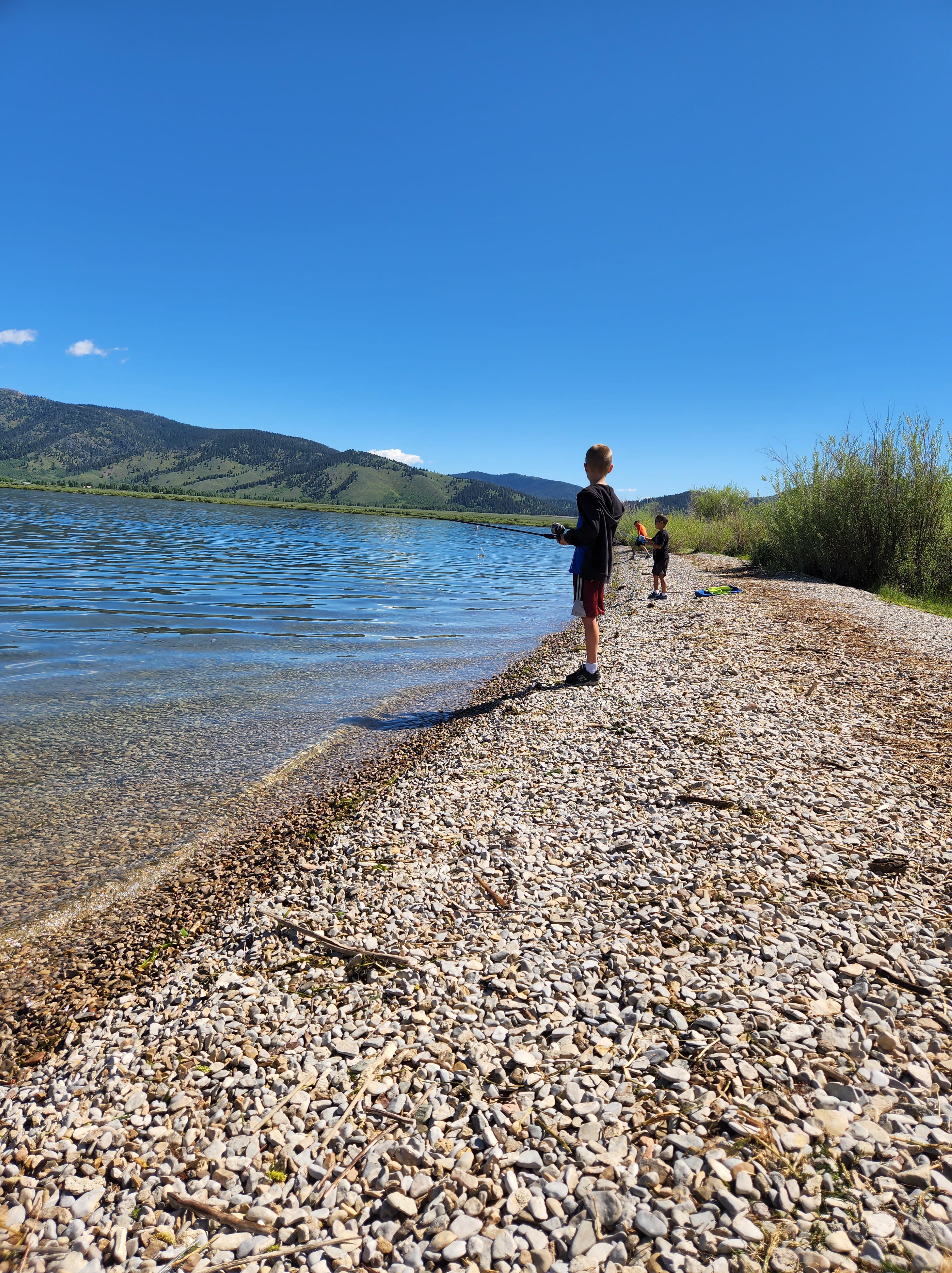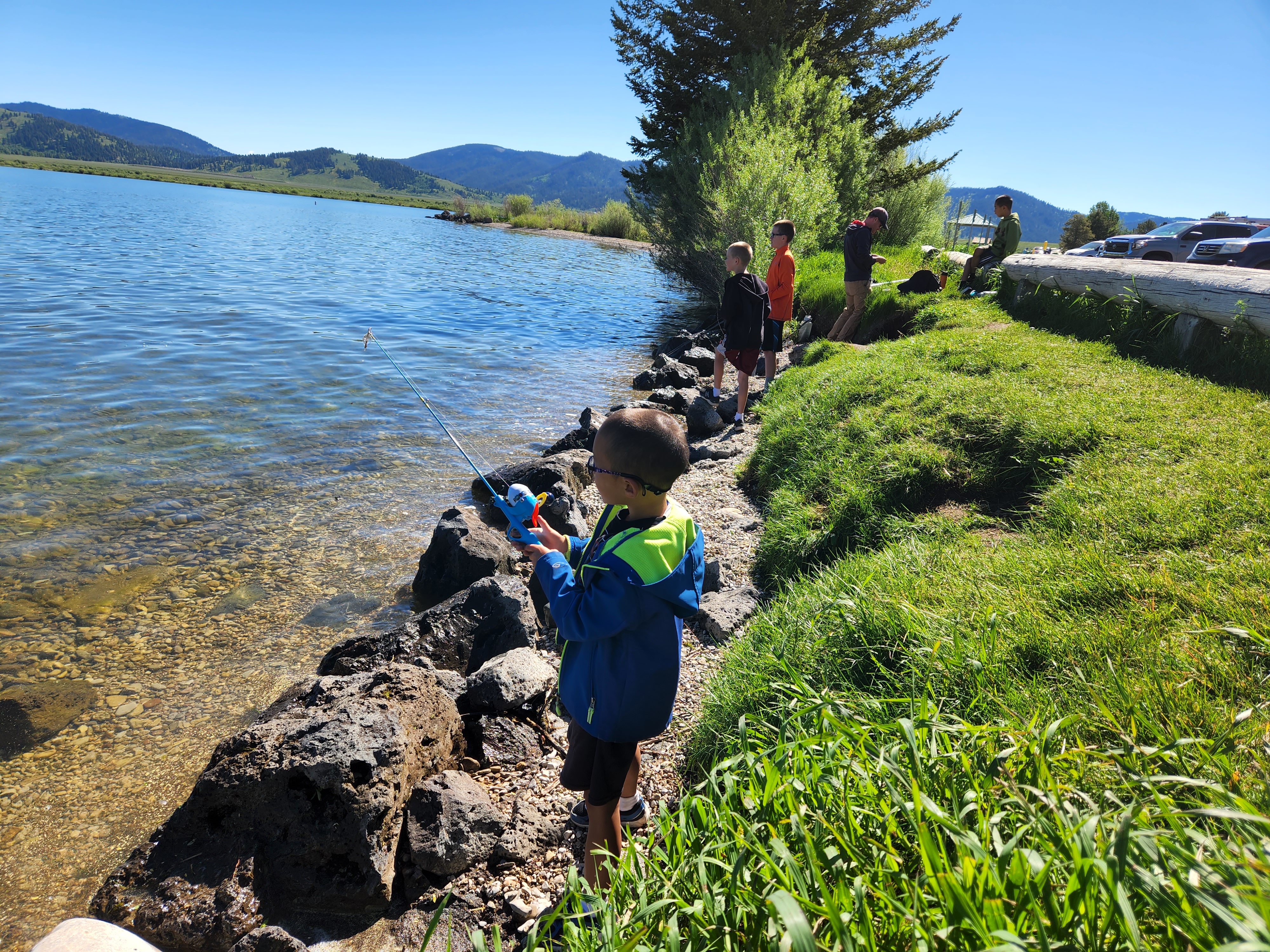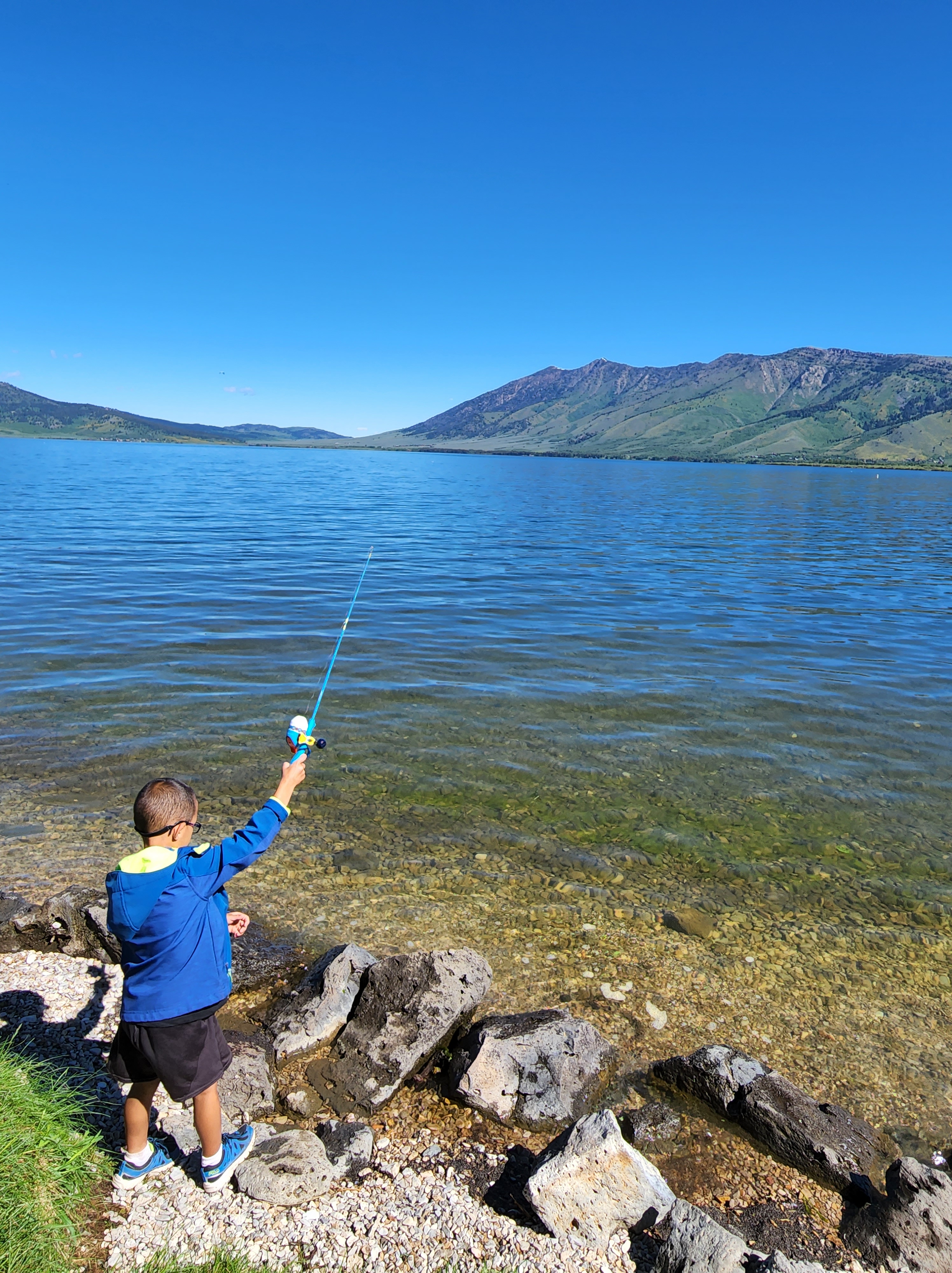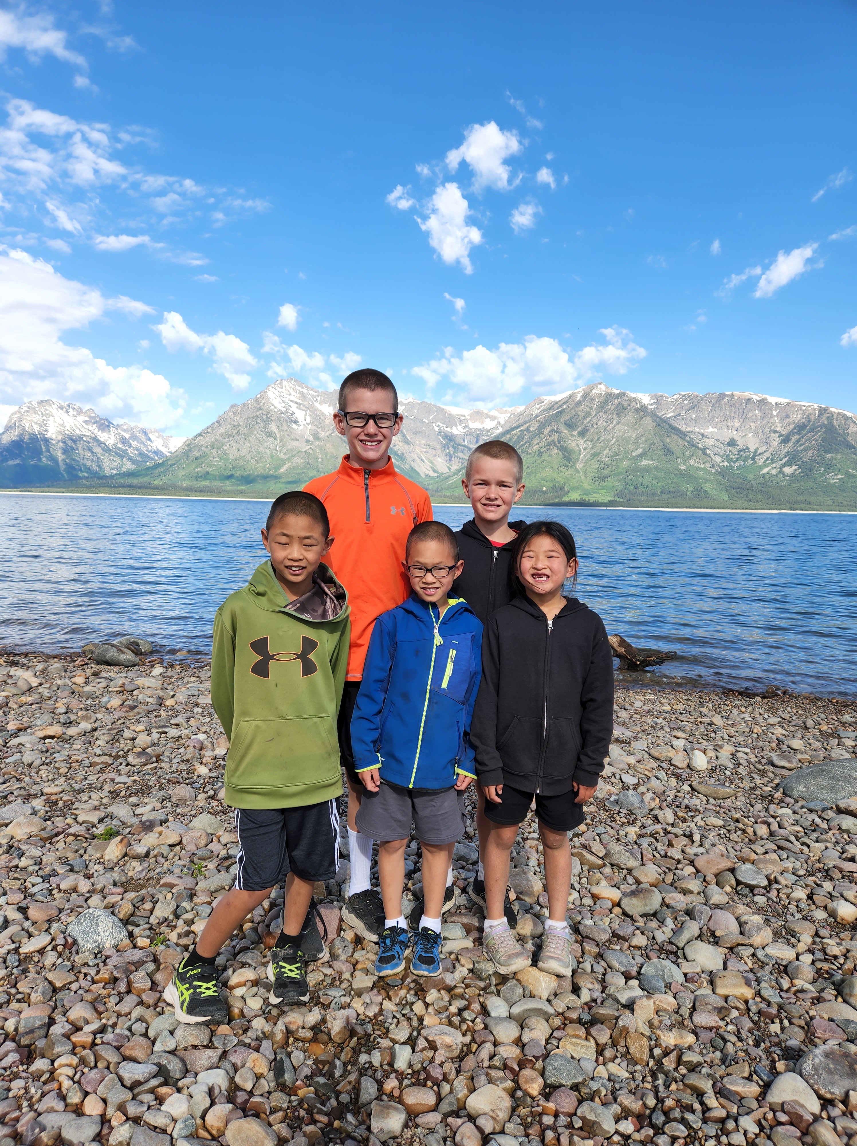 Because of the flooding in Yellowstone we were limited to only 1 day exploring instead of how we had initially planned, so we went with plan B and spent the day fishing in Idaho at Henry’s Lake. It was beautiful. I can’t say we were real successful at catching many fish. I think Clint and I spent the majority of the time untangling Coppelia’s line. When we weren’t untangling her line we were untangling one of the other kids’ lines, but about 90% of the time was spent on her line. All she had to do was breath it seemed and her line would end up in a million knots. Clint did manage to get a few casts in, but only a few. And we did catch 3 fish…..kind of, Paxton, Edric, and Caedmon each managed to snag a minnow with the hook on their lines. And they were so proud. I suggested that we use those minnows as bait but that made a certain 10 year old cry so we did not do that. After a number of hours of line de-tangling and attempted fishing we called it and headed to West Yellowstone for some ice cream which scored points all around. We had a very long drive the next day back home and went through Grand Tetons and stopped and enjoyed it for just a bit. It is gorgeous and definitely some place that we will need to visit again in the future. All in all between Glacier and Yellowstone the kids hiked over 50 miles and we had a blast. It was a really good trip and we have all sorts of memories from it.