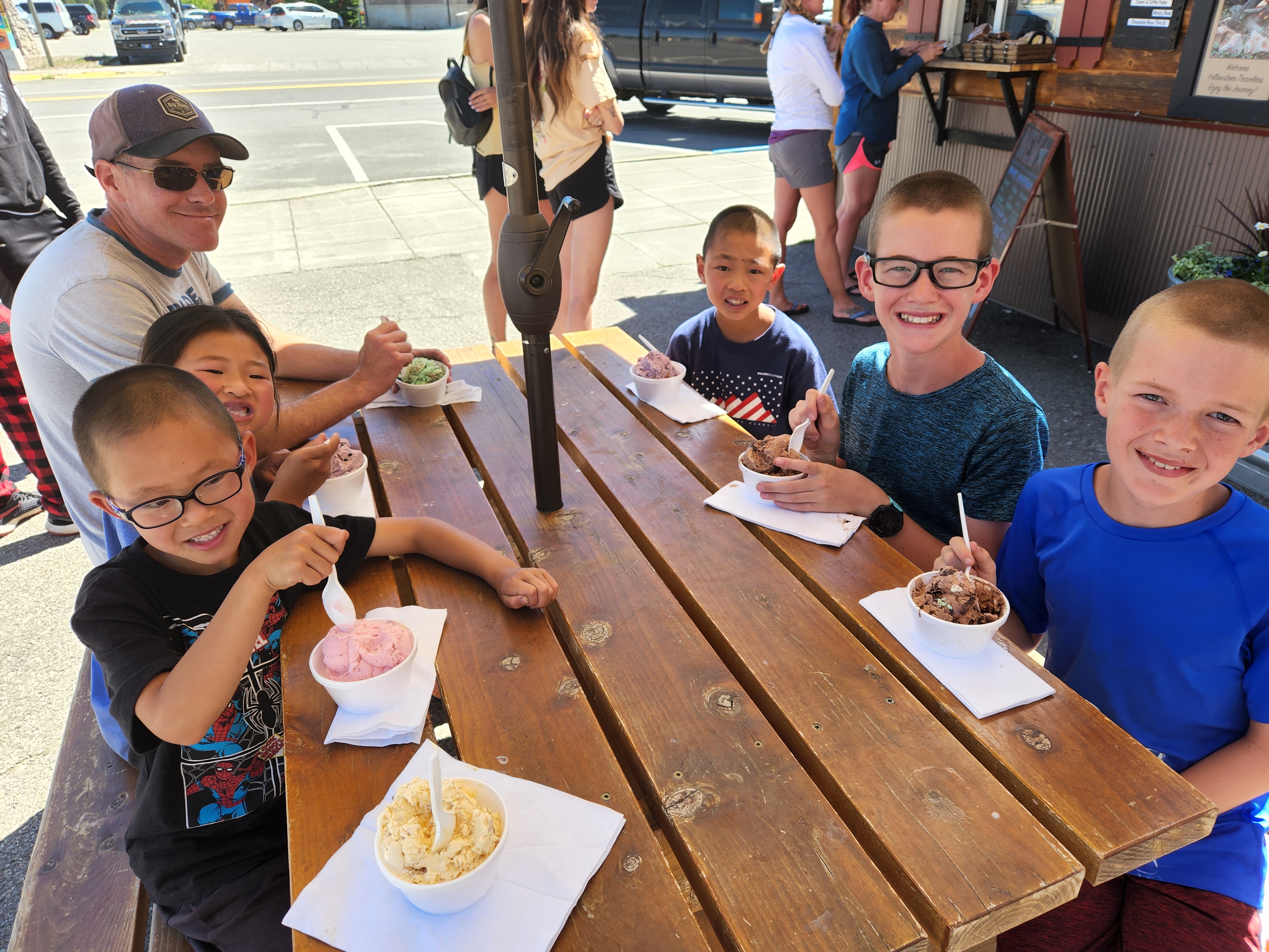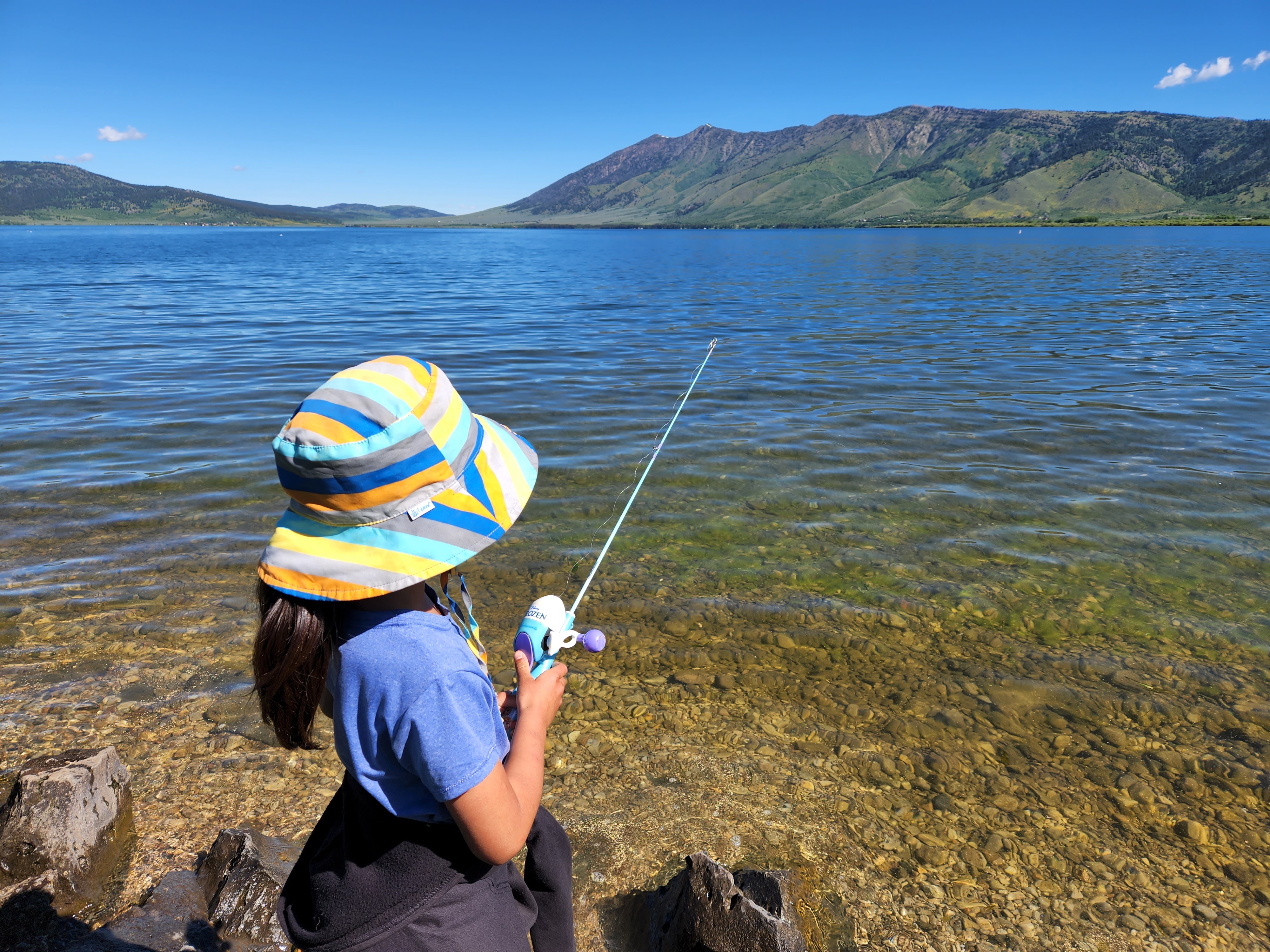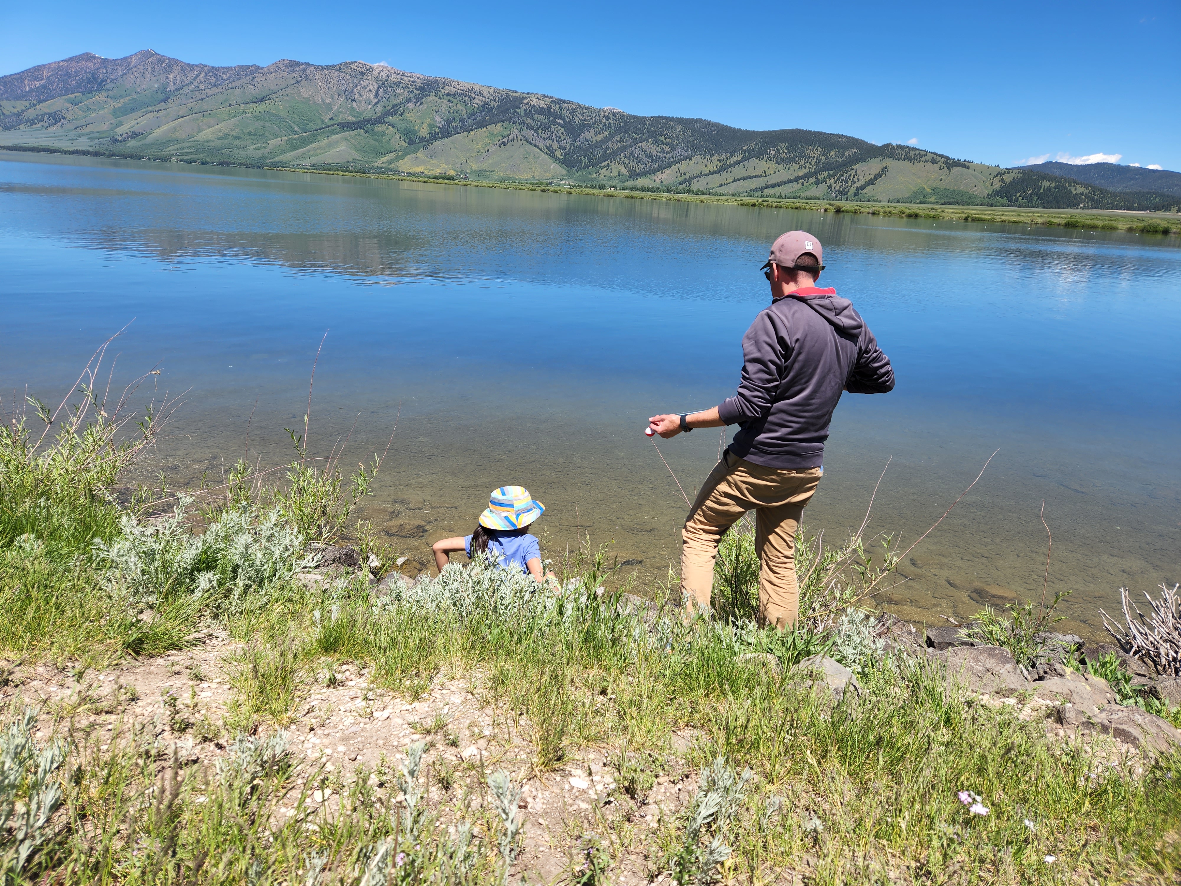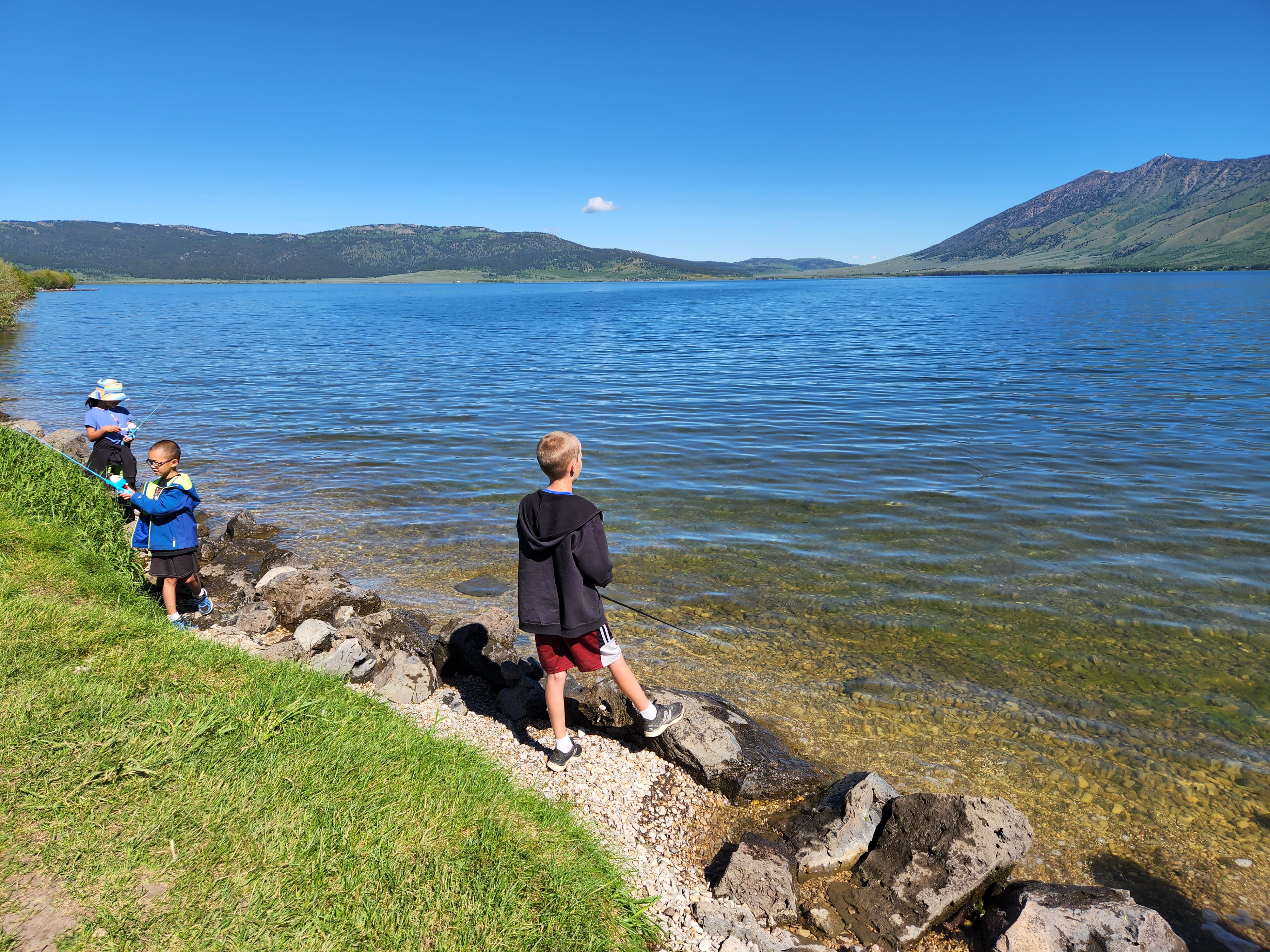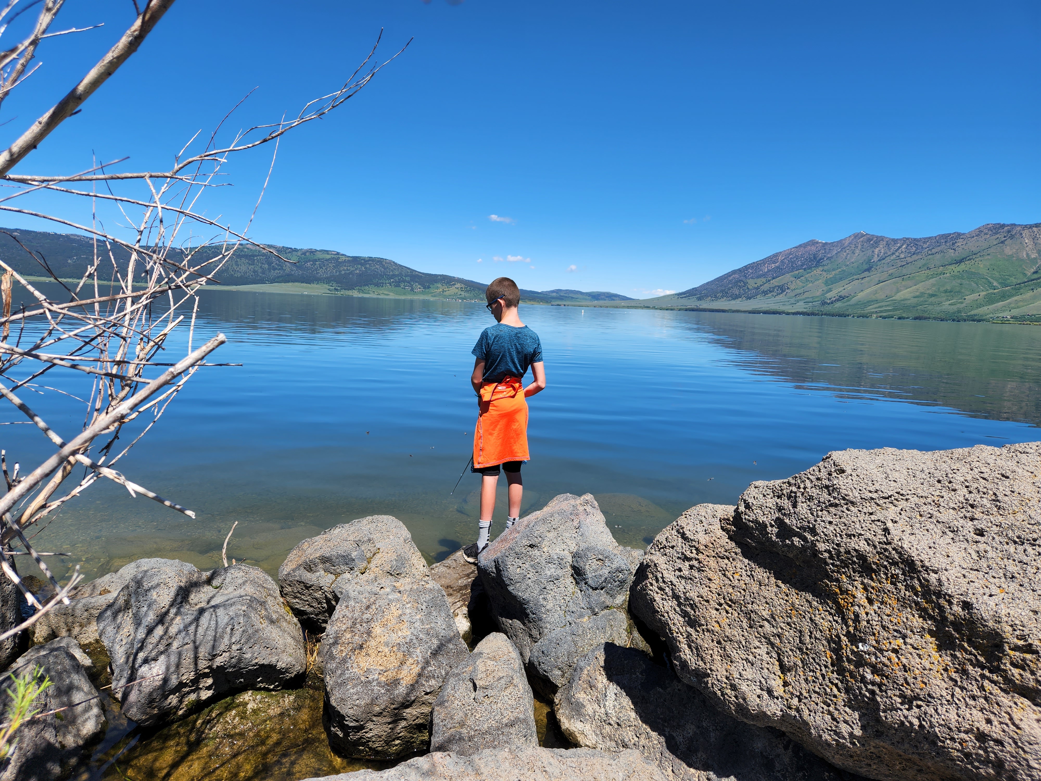 Because of the flooding in Yellowstone we were limited to only 1 day exploring instead of how we had initially planned, so we went with plan B and spent the day fishing in Idaho at Henry’s Lake. It was beautiful. I can’t say we were real successful at catching many fish. I think Clint and I spent the majority of the time untangling Coppelia’s line. When we weren’t untangling her line we were untangling one of the other kids’ lines, but about 90% of the time was spent on her line. All she had to do was breath it seemed and her line would end up in a million knots. Clint did manage to get a few casts in, but only a few. And we did catch 3 fish…..kind of, Paxton, Edric, and Caedmon each managed to snag a minnow with the hook on their lines. And they were so proud. I suggested that we use those minnows as bait but that made a certain 10 year old cry so we did not do that. After a number of hours of line de-tangling and attempted fishing we called it and headed to West Yellowstone for some ice cream which scored points all around. We had a very long drive the next day back home and went through Grand Tetons and stopped and enjoyed it for just a bit. It is gorgeous and definitely some place that we will need to visit again in the future. All in all between Glacier and Yellowstone the kids hiked over 50 miles and we had a blast. It was a really good trip and we have all sorts of memories from it.