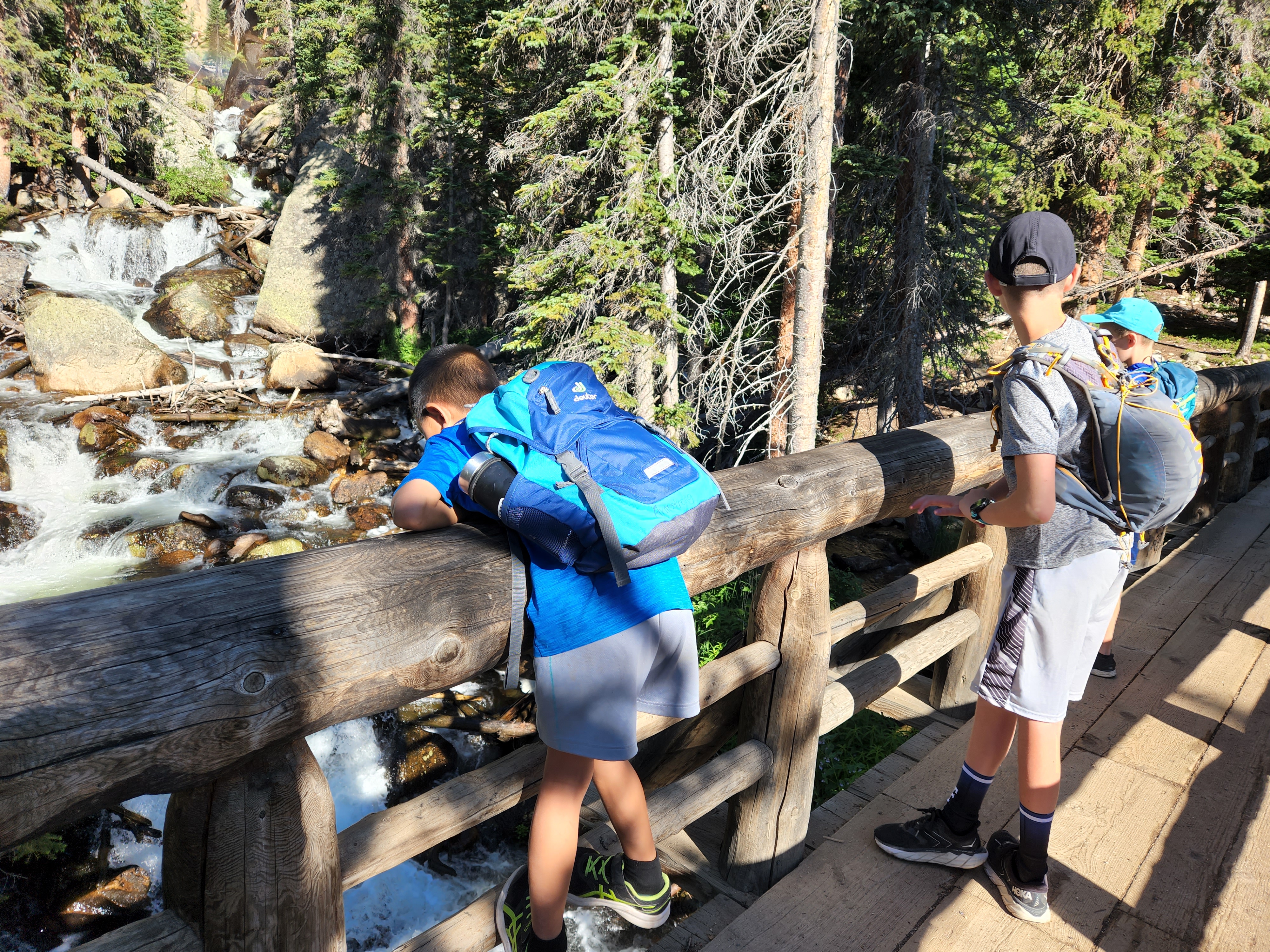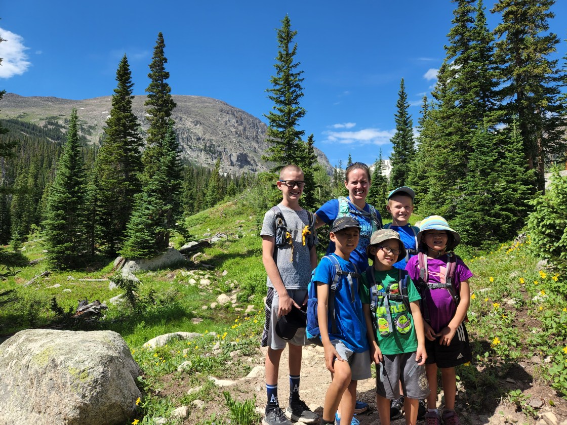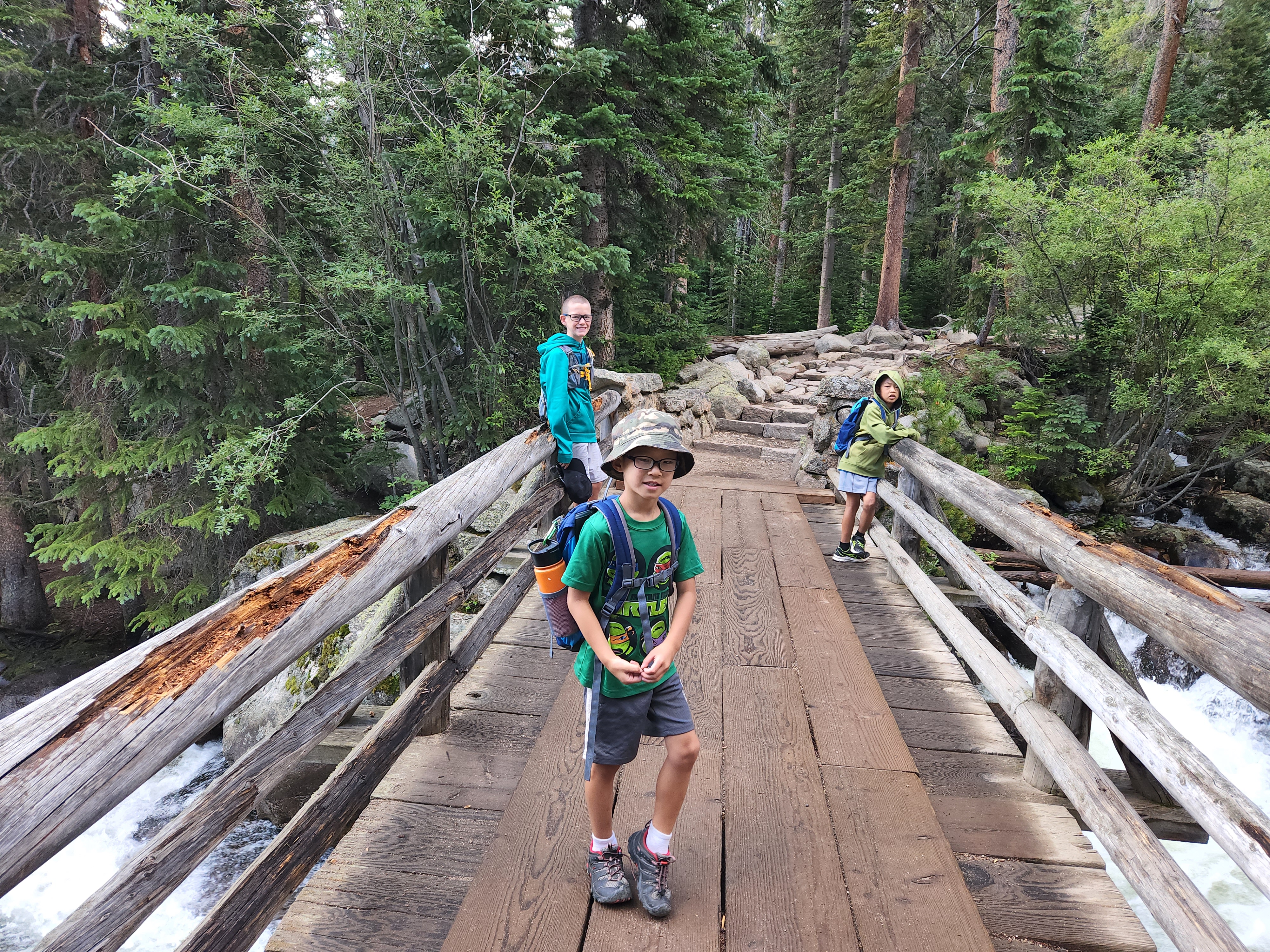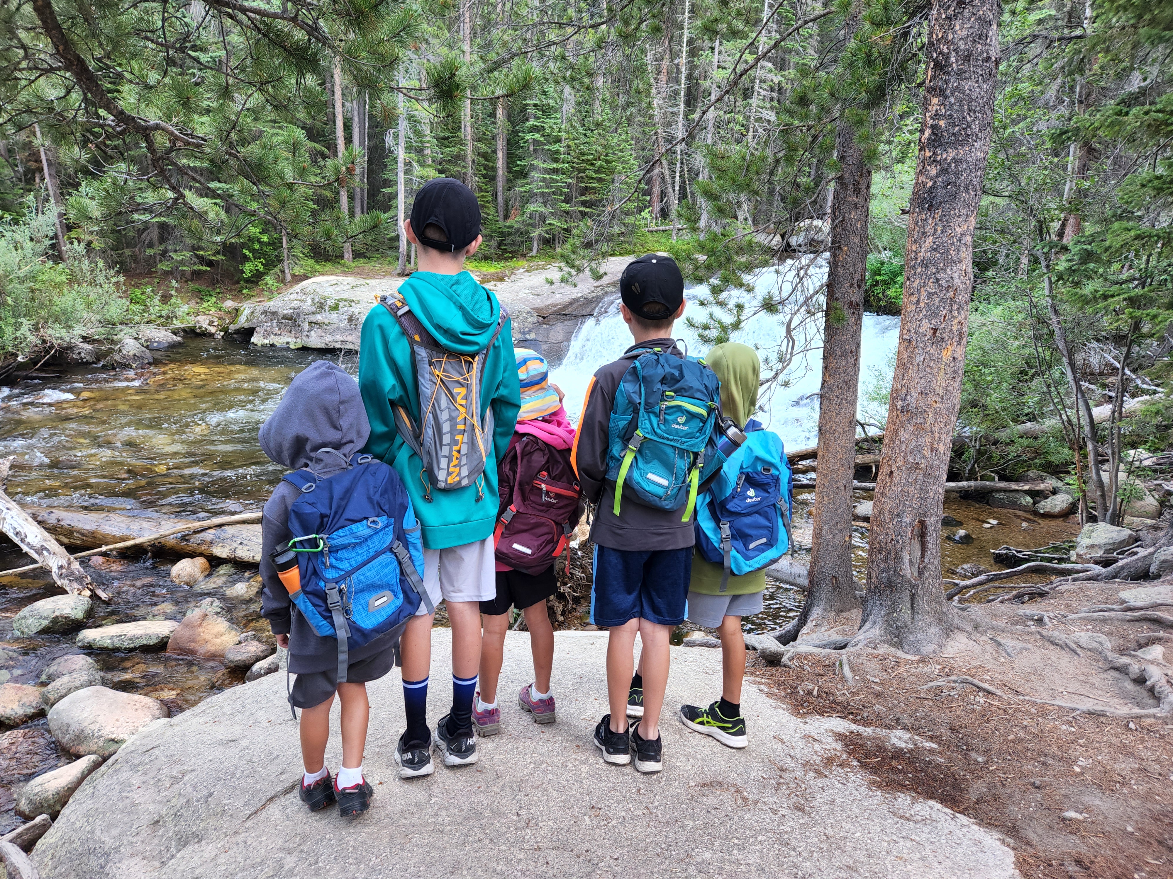 We decided to go hiking a couple of weeks ago. The plan was originally to hike to Chasm Lake at the foot of Longs Peak, but despite leaving early and getting to the trail head by 6AM there were no parking spots. So we drove down the road a bit to Ouzel Lake Trailhead and did that hike. On our way to the trailhead there were two moose running along the side of the road which was a pretty amazing way to start the hike. The hike was amazing. Gorgeous waterfalls all along the way, breathtaking scenery and some pretty amazing kid hikers. They hiked 11 miles in total and had great attitudes. They all carried bags with their own waters (which we refilled if needed) to get ready for our backpacking trip in a couple of weeks. Because we started so early and then got to the stop by mid morning when we made it down it was just after lunch (which we had already eaten at the top), so we headed into Estes Park for ice cream because that is the best way to finish a hike.