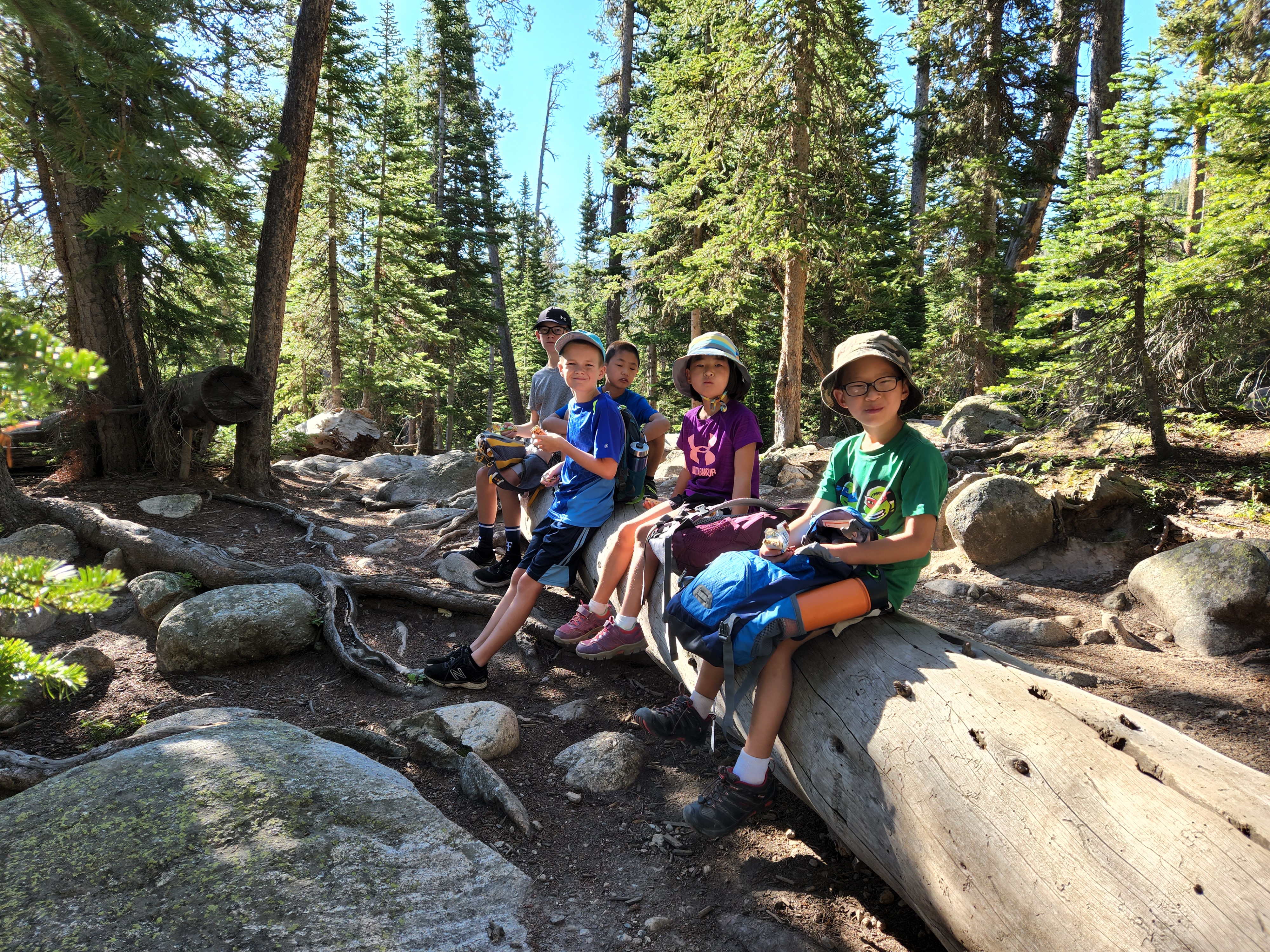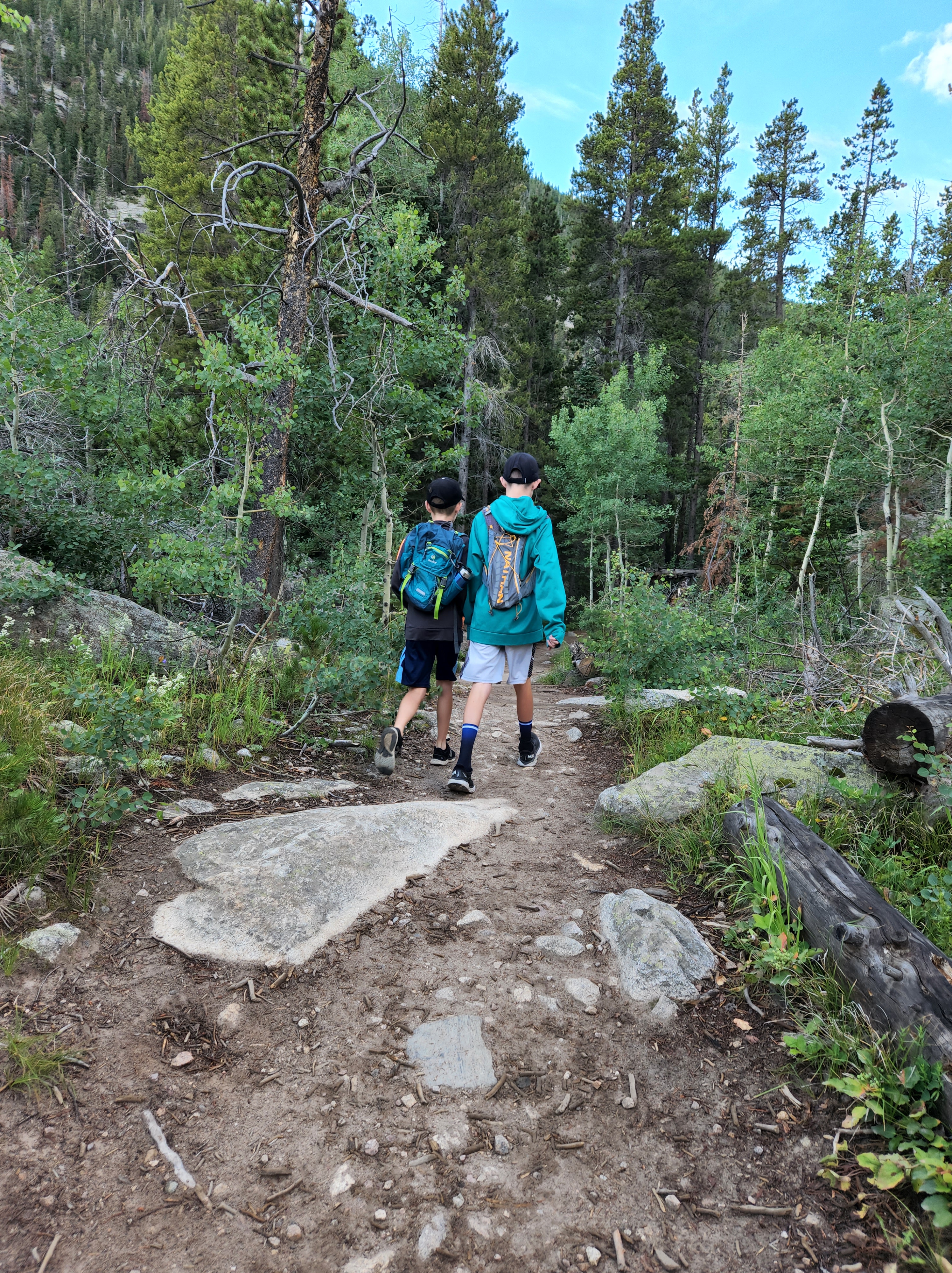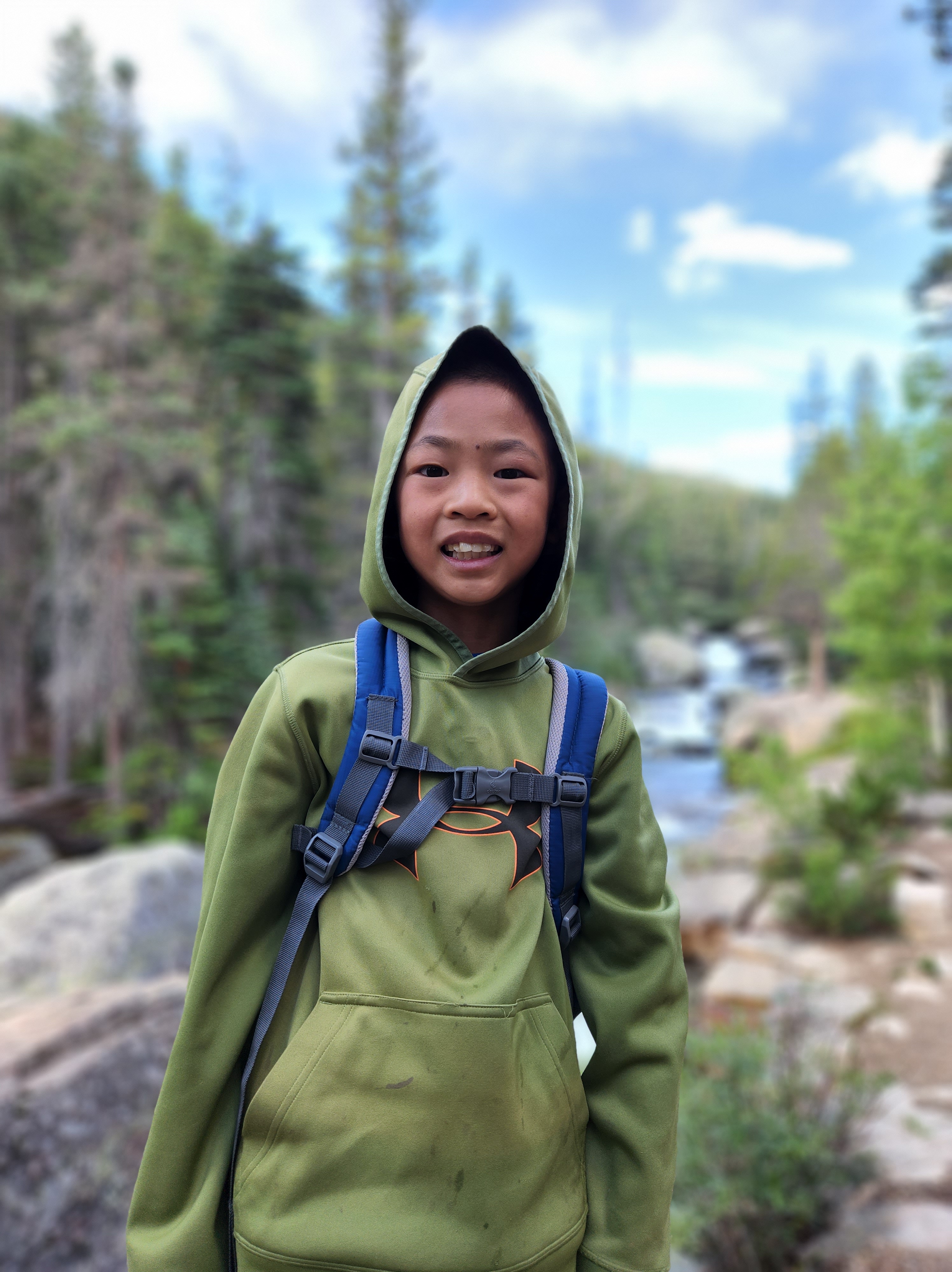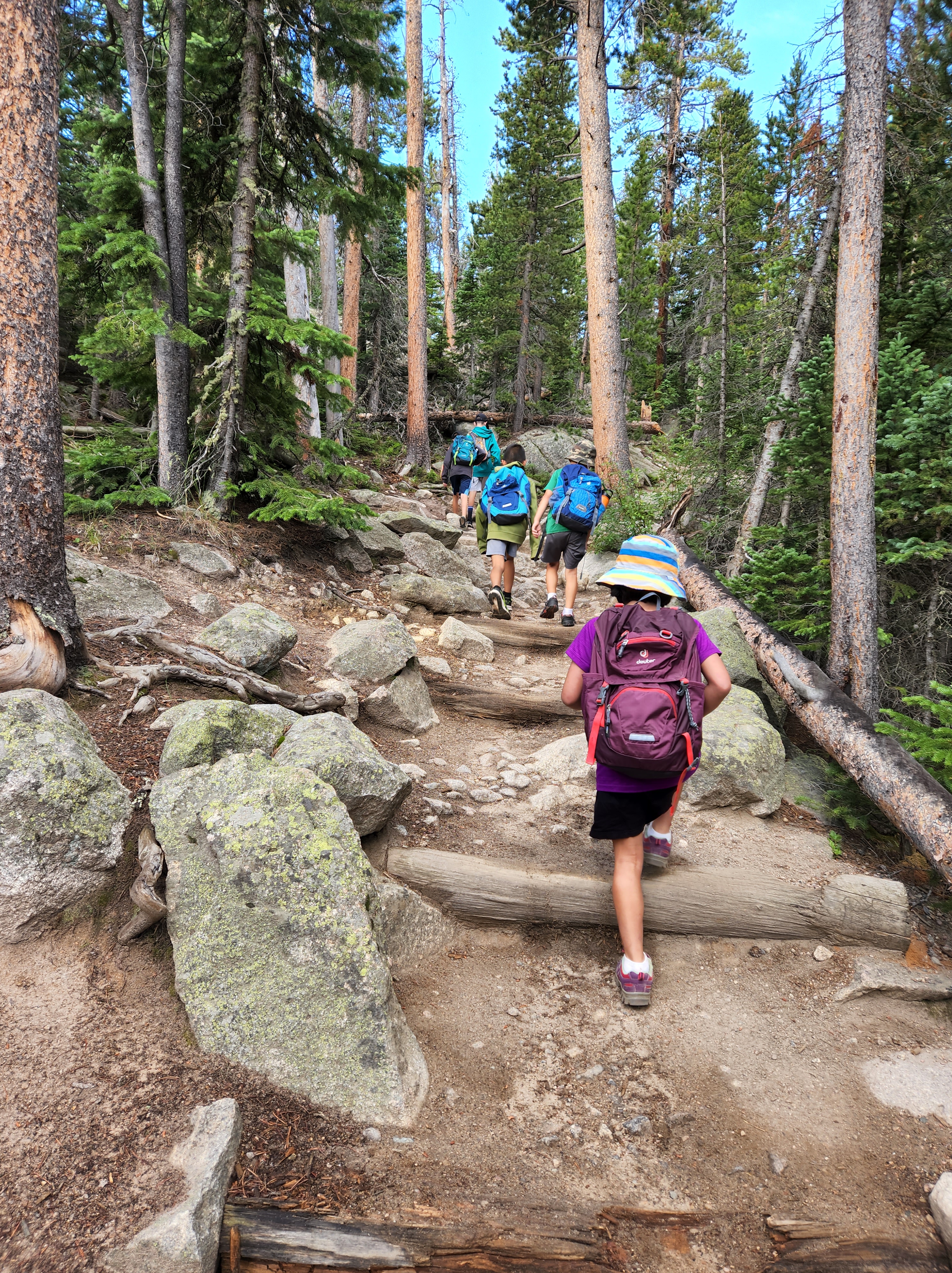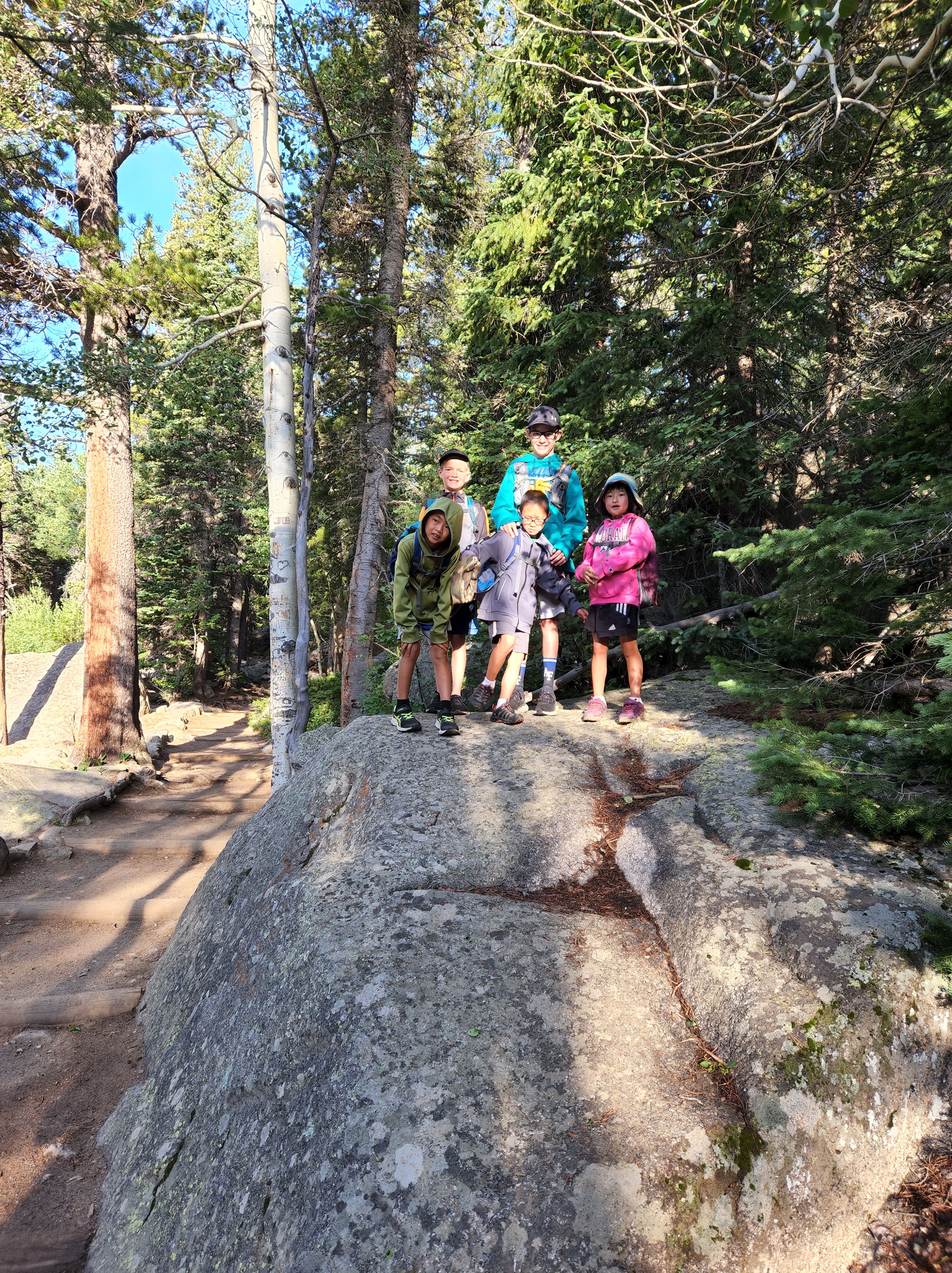 We decided to go hiking a couple of weeks ago. The plan was originally to hike to Chasm Lake at the foot of Longs Peak, but despite leaving early and getting to the trail head by 6AM there were no parking spots. So we drove down the road a bit to Ouzel Lake Trailhead and did that hike. On our way to the trailhead there were two moose running along the side of the road which was a pretty amazing way to start the hike. The hike was amazing. Gorgeous waterfalls all along the way, breathtaking scenery and some pretty amazing kid hikers. They hiked 11 miles in total and had great attitudes. They all carried bags with their own waters (which we refilled if needed) to get ready for our backpacking trip in a couple of weeks. Because we started so early and then got to the stop by mid morning when we made it down it was just after lunch (which we had already eaten at the top), so we headed into Estes Park for ice cream because that is the best way to finish a hike.