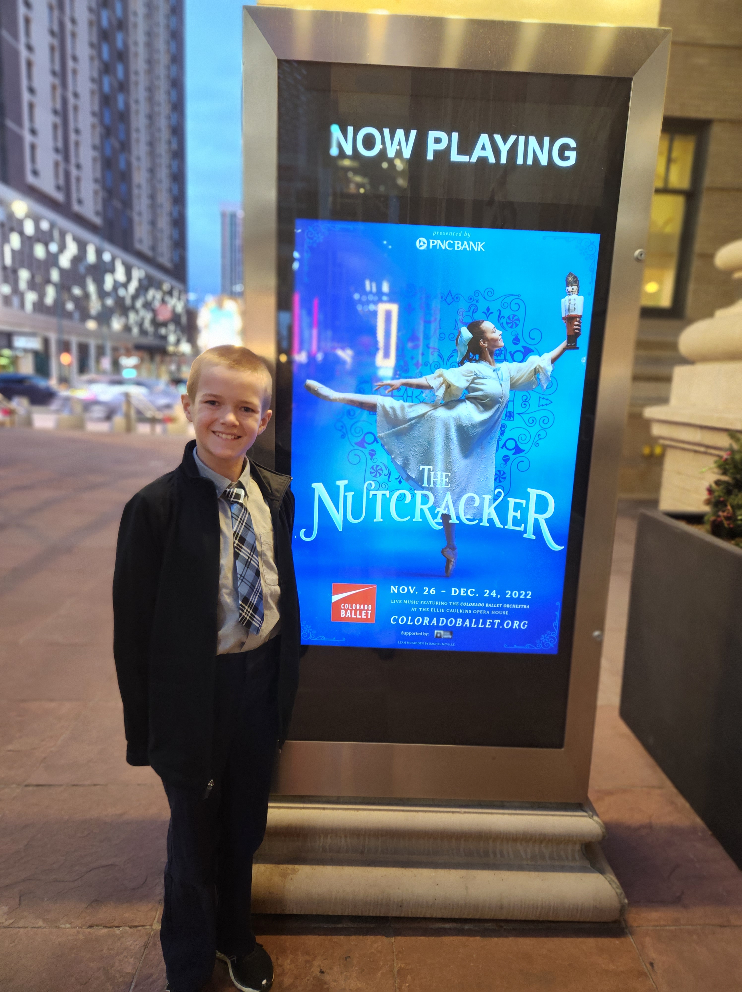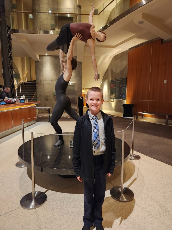Because Caedmon doesn’t actually get to see the Nutcracker show because he is in it and we have to wait for his company to post and make available the recording of his shows we have made it a tradition to go to the Colorado Ballet production in Denver and watch one of their shows. And Caedmon has it down, he has his favorite sandwich shop where he knows he can get a gluten free sandwich and then he likes to be first inline before the doors open at the opera house to get in. Once in he goes to get his photo taken in front of the ballet statues and then walks each of the floors in the lobby all the way to the top. This year we found a new set of ballet statues as we explored all the floors. And then of course he is first in line in front of the door that is closest to wherever we are sitting and I’m pretty sure we were the first ones in our seats when the doors opened. And he loved every minute of the ballet. He waited in the lobby after to see if he could find any dancers to tell them good job but we didn’t find any. Nonetheless it was a successful fun night enjoying one of his favorite things.