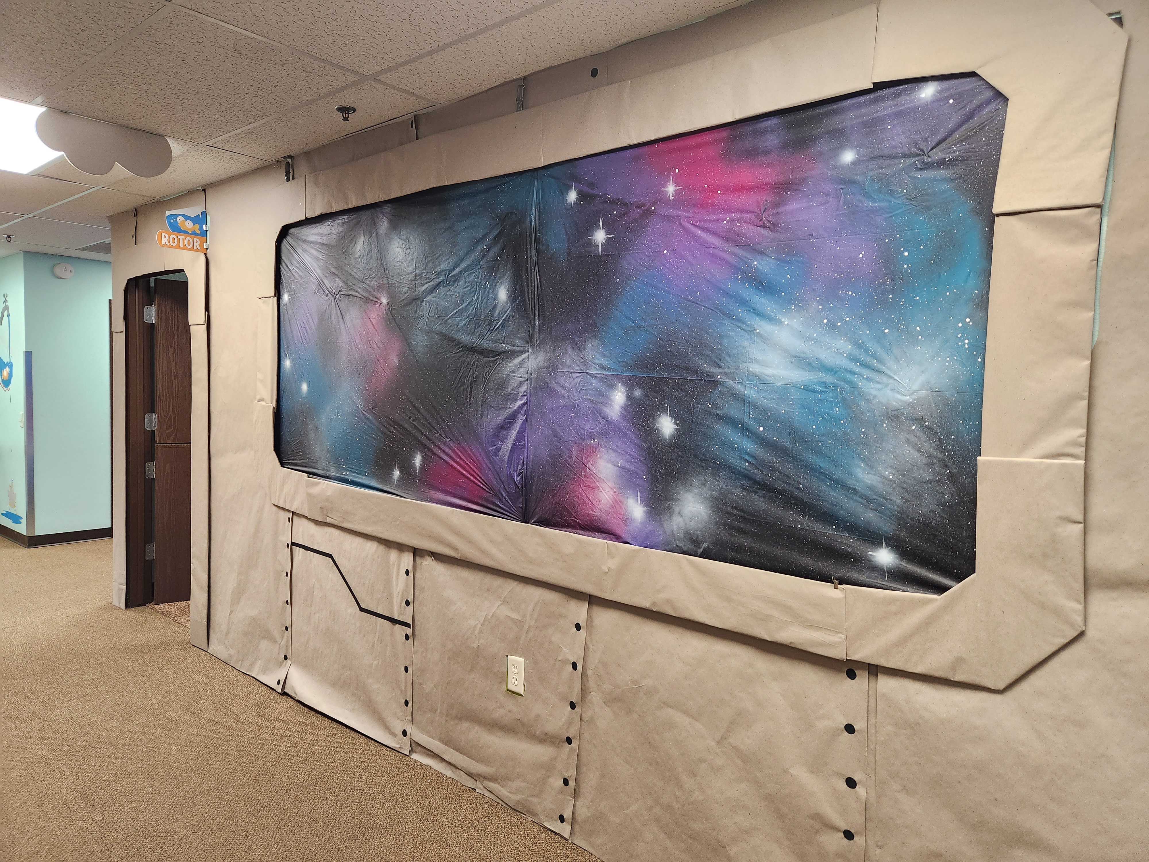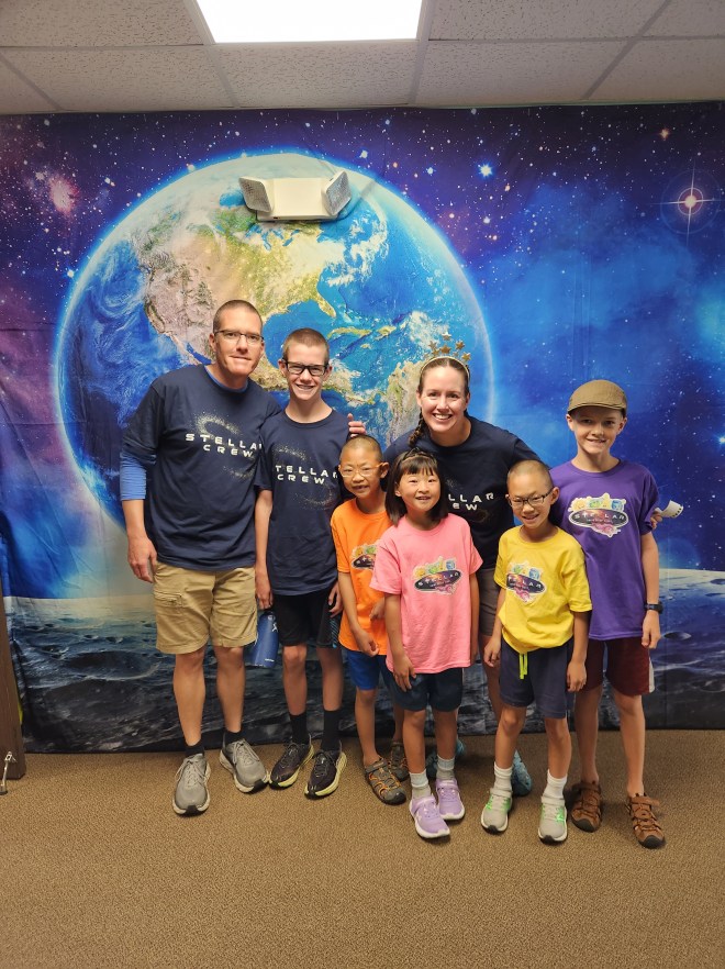 Last week we got to blast off with our church’s VBS. Since we finished up homeschool early in May our family actually spent some mornings helping build and put together some of the decorations that were used. Paxton and Leighton worked on the control tower, Clint, Edric and Coppelia worked on the rockets and Caedmon helped with the satellite. We spent a little time helping set up before everything kicked off. Clint and I were both “crew leaders” which meant we had 4-6 kids we were in charge of. Leighton helped as an “assistant crew leader” meaning that he helped one of the small groups, and Caedmon was on the song team helping teach everyone the songs and motions each day. We had a blast all week, there were science experiments for the elementary kids, and I helped in preschool which meant we had craft time and playground time. The preschool kids also had a huge space station that was all done in glow in the dark paint and black lights that we got to explore and play in each day while the elementary kids played crazy games. There was Bible teaching and of course yummy snacks. All in all they had over 130 kids, but then 125 volunteers that made it all come together. The volunteers ranged in ages 12-80+ and did everything from leading groups to handing out snacks to giving band aides and checking Bible verses. It was amazing to work along side so many and have fun the entire week. We were all tired by the end but it was well worth it. I didn’t get many photos during the week, but here are a few.