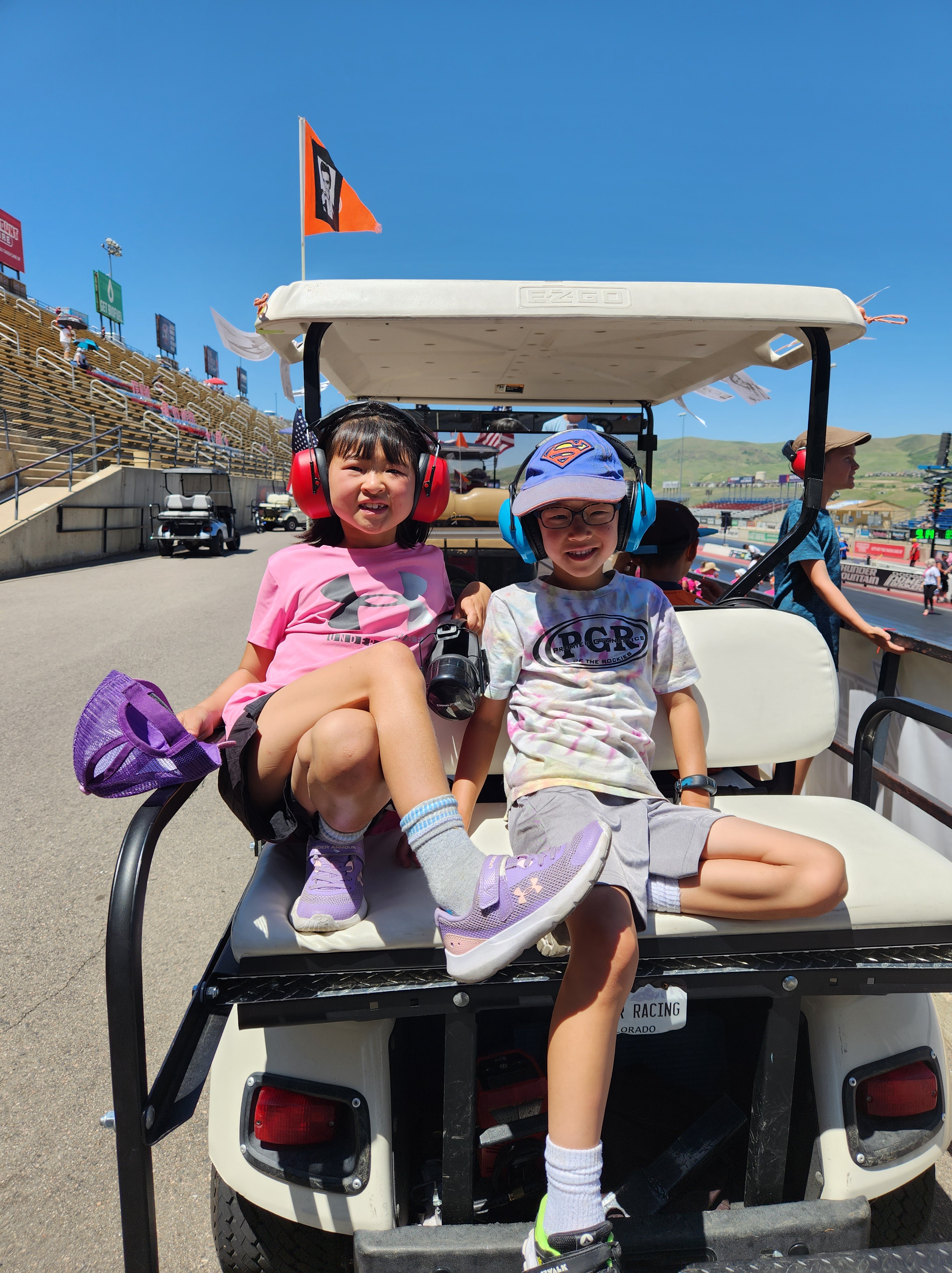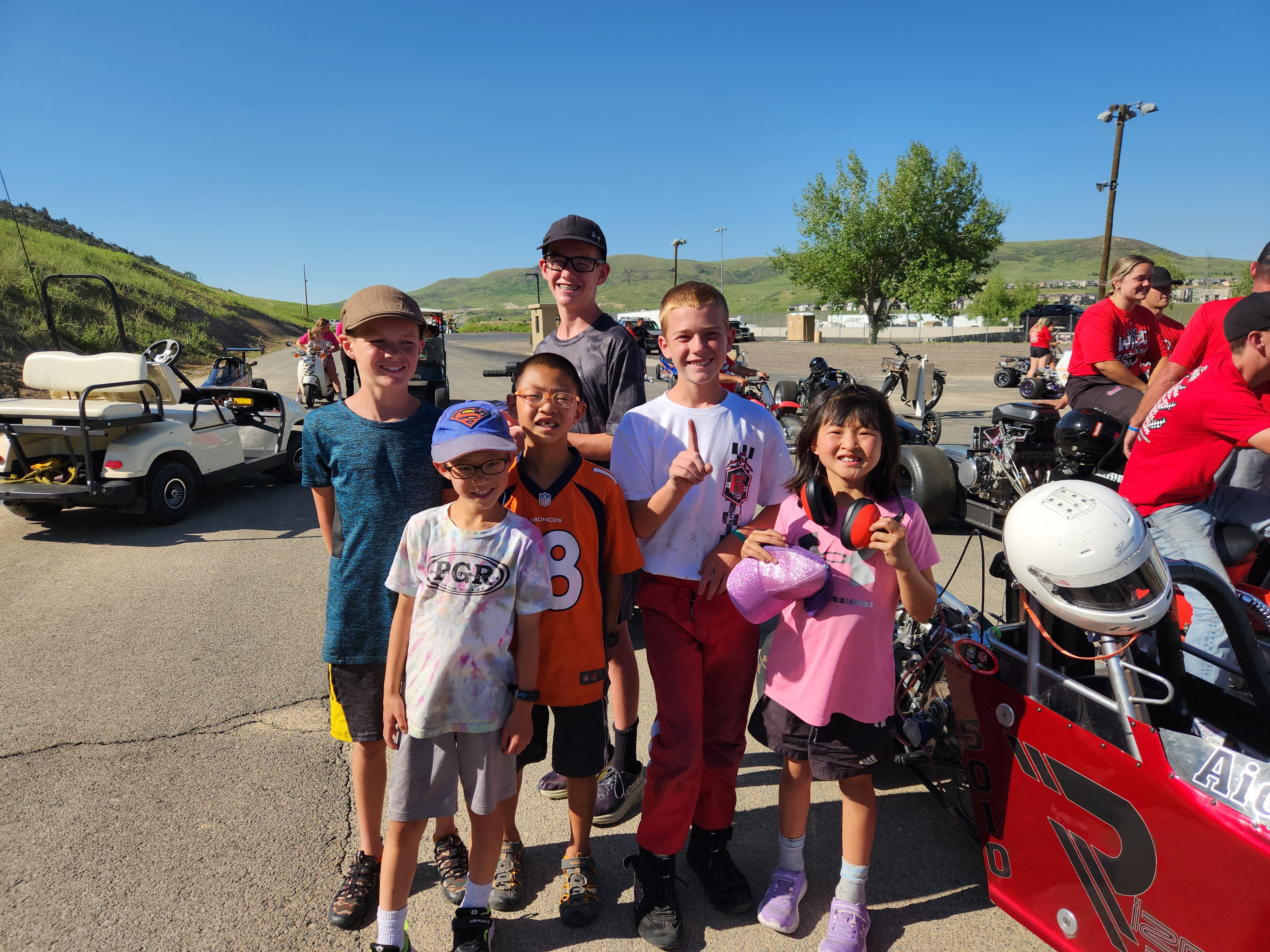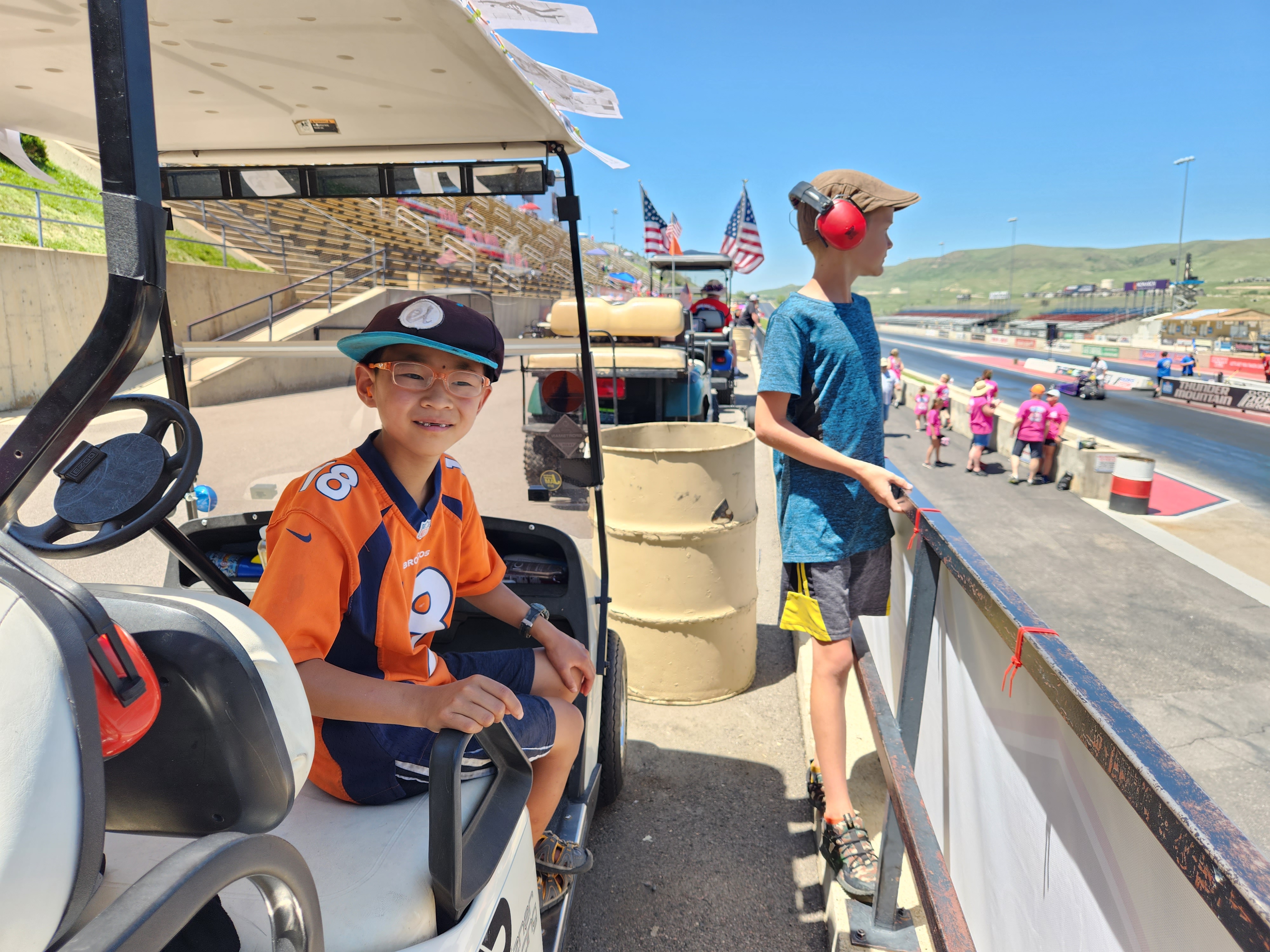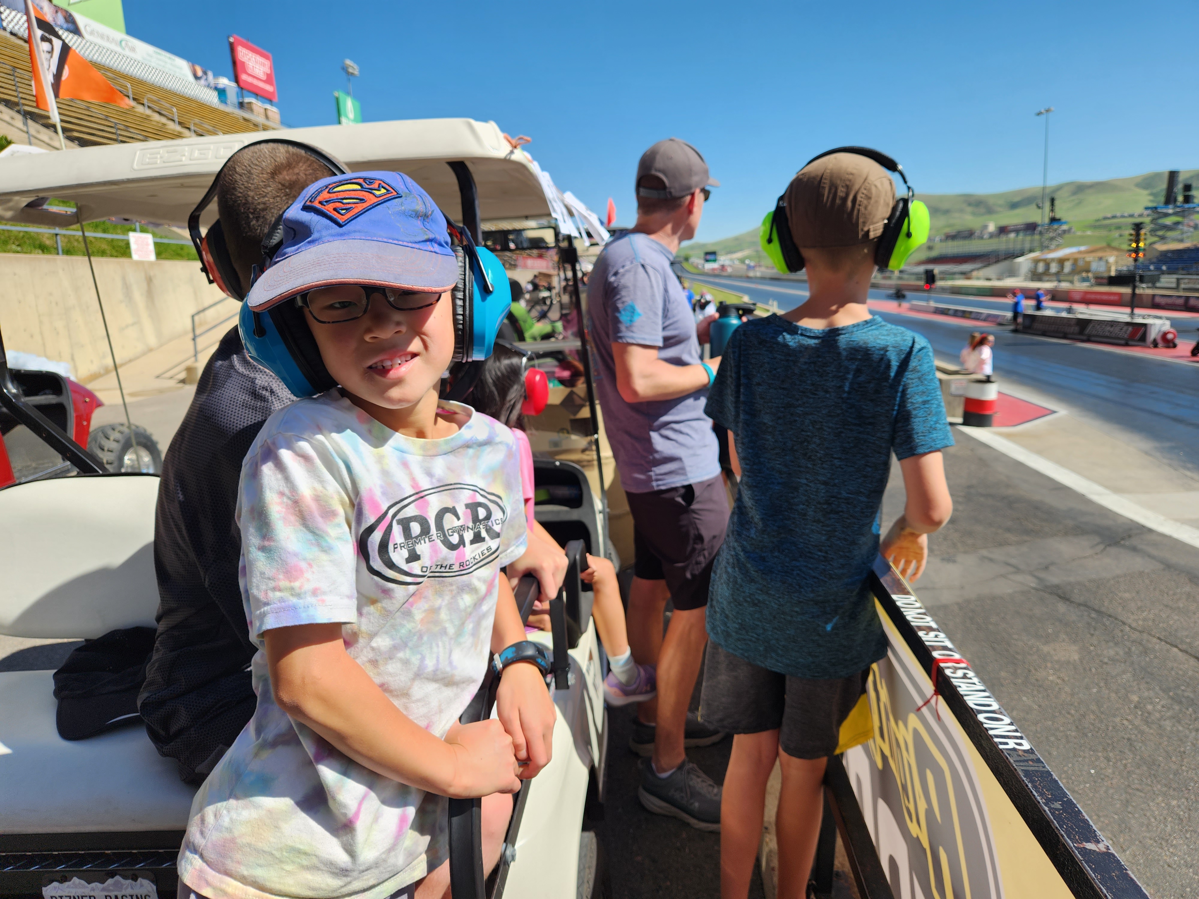It’s only taken a number of years but we finally made it out to watch our friends do their junior drag racing this past Saturday and it was a blast. Andie (their daughter) and Leighton were in preschool together way back when (both will start high school this fall!!!!) and Aiden (their youngest son) have been at Apex together since kindergarten and I’m pretty much sure are joined at the hip….in fact I think a couple teachers can’t tell them apart because they are never apart. It turned out that Saturday was the Western Conference National Finals so we chose a big day to cheer our friends on. We knew nothing but were quickly schooled and learned all day long how things went. Everyone had ear muff or ear plugs for when we were down at the track. I think the kids favorite parts were when we hauled the dragsters down to the track or back from the finish area because it meant that they got to ride in them as we pulled them with the golf cart. Although Paxton’s favorite part was probably when Miss Sheri let him steer the golf cart back to the trailer, he thought he was big stuff for sure. After the morning timing rounds the competition begin in the afternoon. Andie got eliminated in the first round, but then took the kids to the bouncy houses so I think they still had fun. Aiden ended up going through each round and made it to the finals. We were all excited to cheer him on and ultimately he ended up winning and walking away with the 11 year old championship which was super exciting. We had a great day and enjoyed supporting our friends and enjoyed learning all things dragster racing.