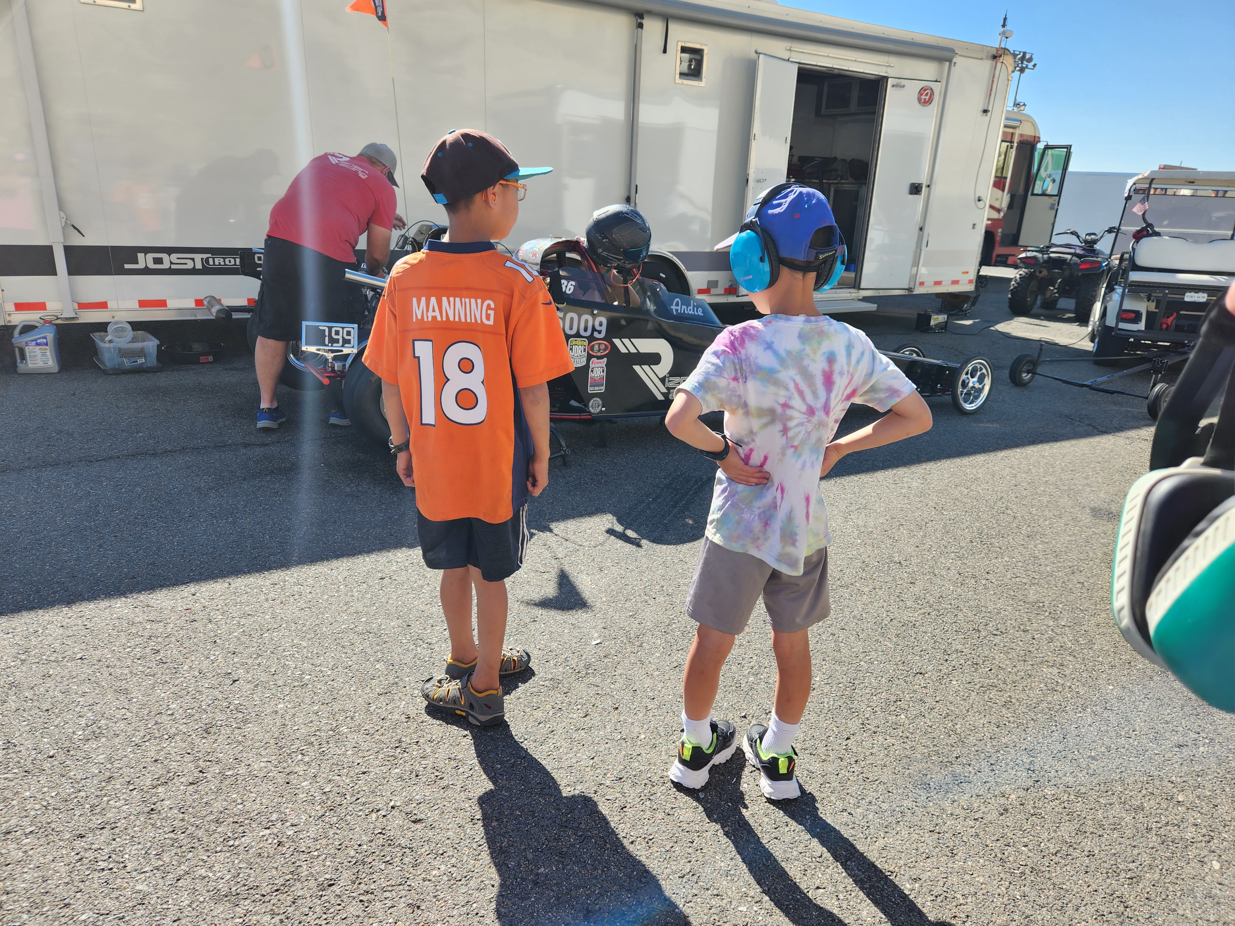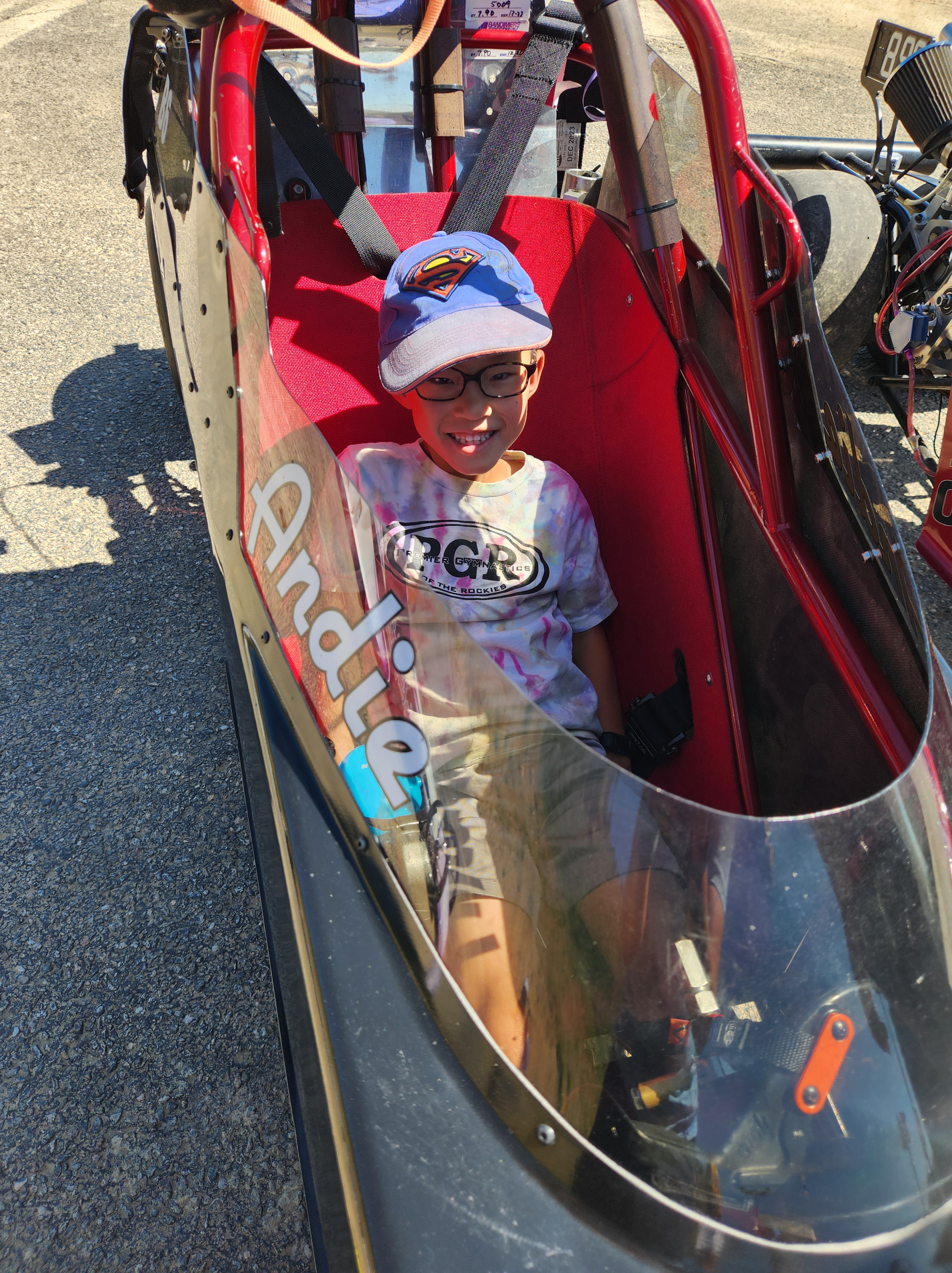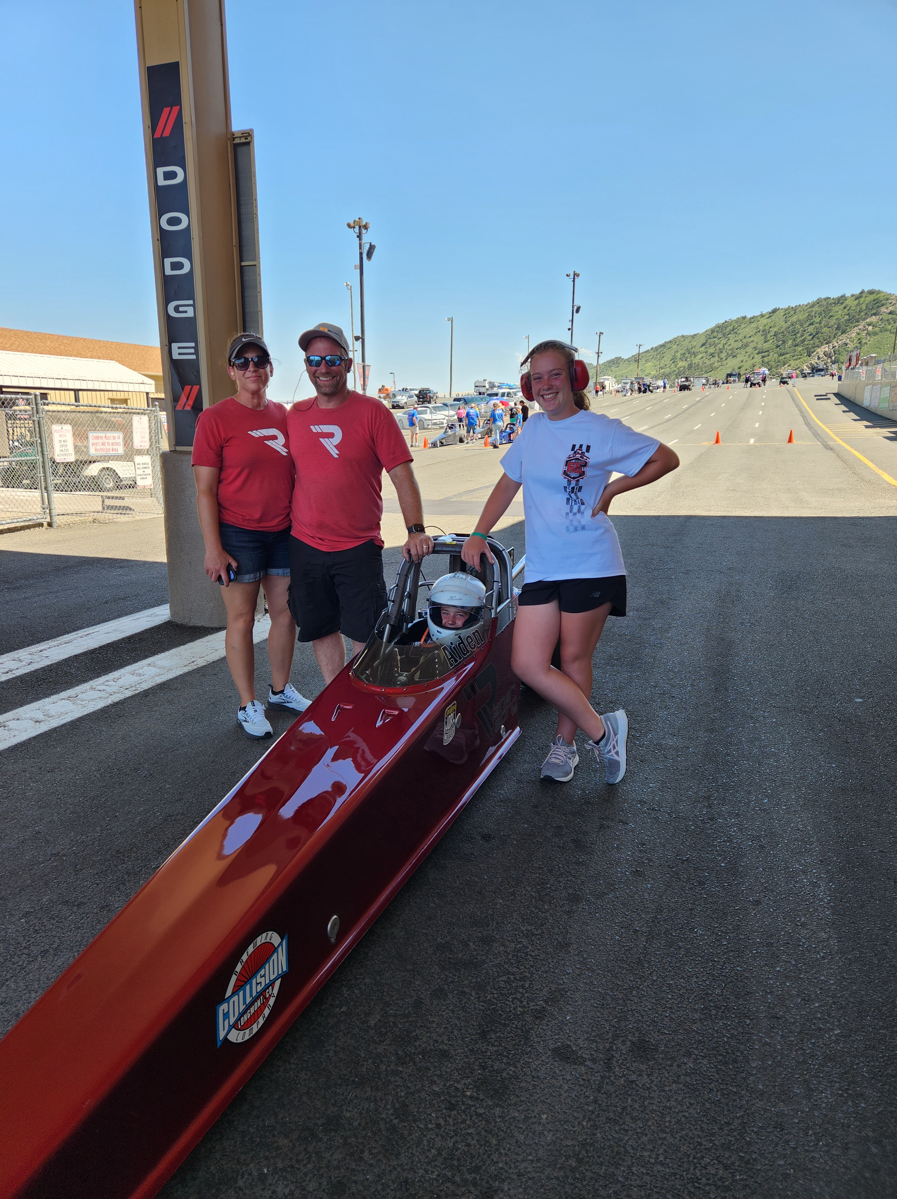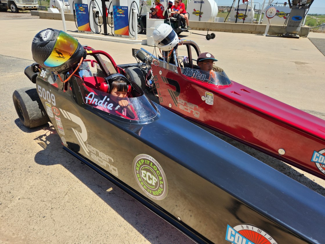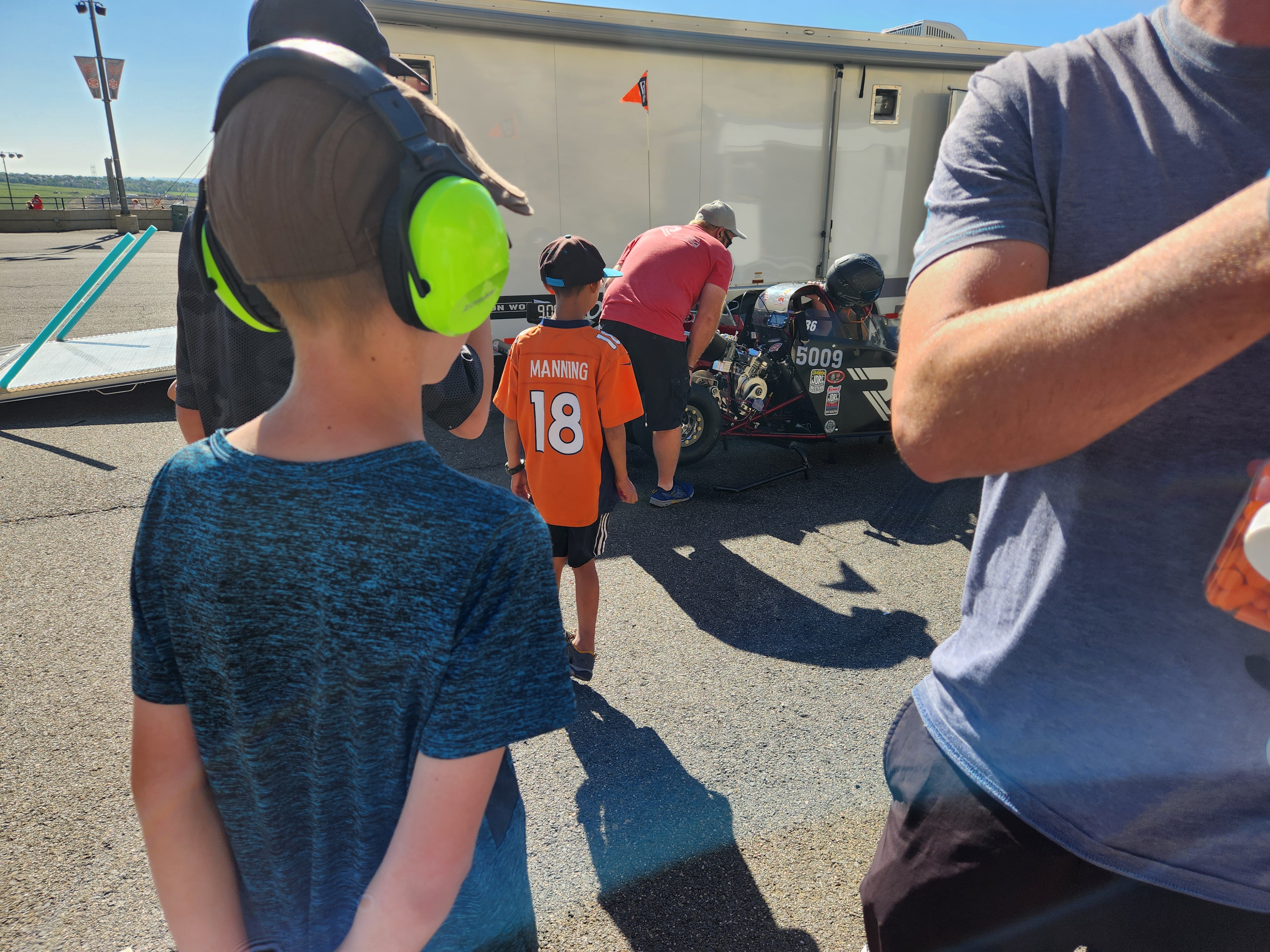 It’s only taken a number of years but we finally made it out to watch our friends do their junior drag racing this past Saturday and it was a blast. Andie (their daughter) and Leighton were in preschool together way back when (both will start high school this fall!!!!) and Aiden (their youngest son) have been at Apex together since kindergarten and I’m pretty much sure are joined at the hip….in fact I think a couple teachers can’t tell them apart because they are never apart. It turned out that Saturday was the Western Conference National Finals so we chose a big day to cheer our friends on. We knew nothing but were quickly schooled and learned all day long how things went. Everyone had ear muff or ear plugs for when we were down at the track. I think the kids favorite parts were when we hauled the dragsters down to the track or back from the finish area because it meant that they got to ride in them as we pulled them with the golf cart. Although Paxton’s favorite part was probably when Miss Sheri let him steer the golf cart back to the trailer, he thought he was big stuff for sure. After the morning timing rounds the competition begin in the afternoon. Andie got eliminated in the first round, but then took the kids to the bouncy houses so I think they still had fun. Aiden ended up going through each round and made it to the finals. We were all excited to cheer him on and ultimately he ended up winning and walking away with the 11 year old championship which was super exciting. We had a great day and enjoyed supporting our friends and enjoyed learning all things dragster racing.