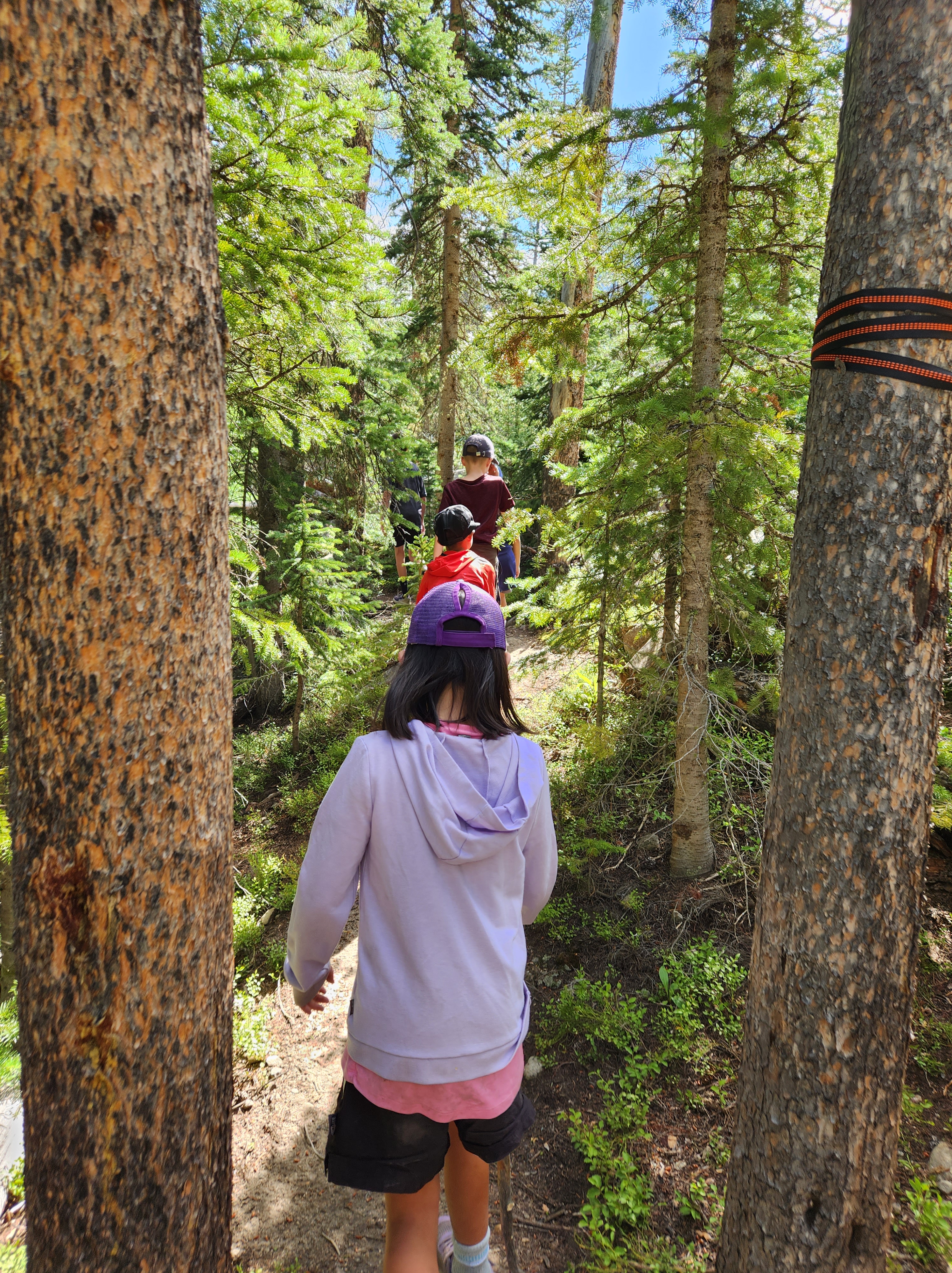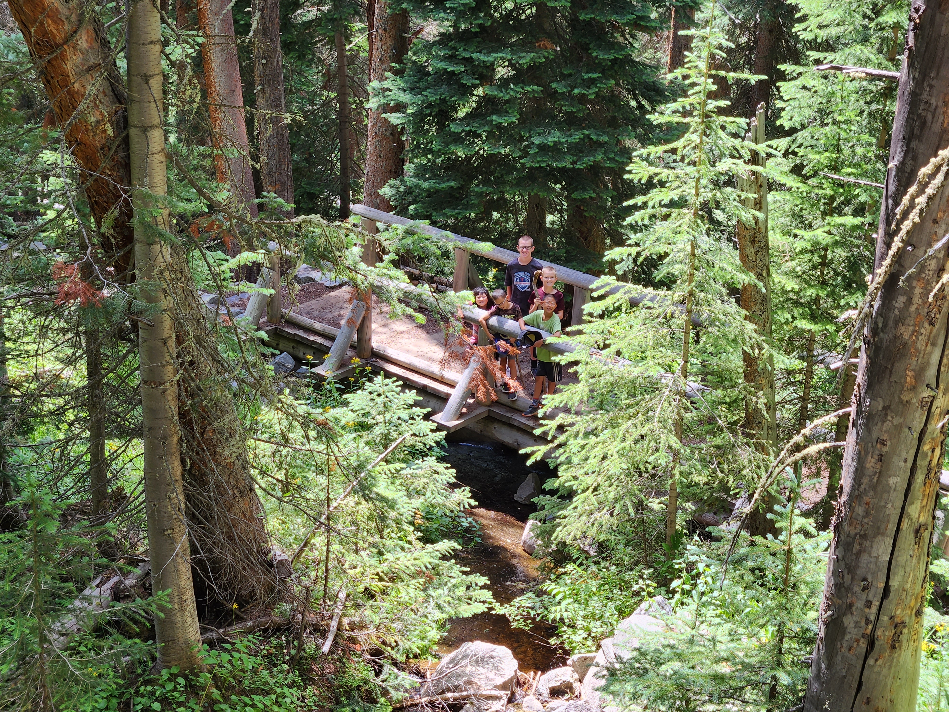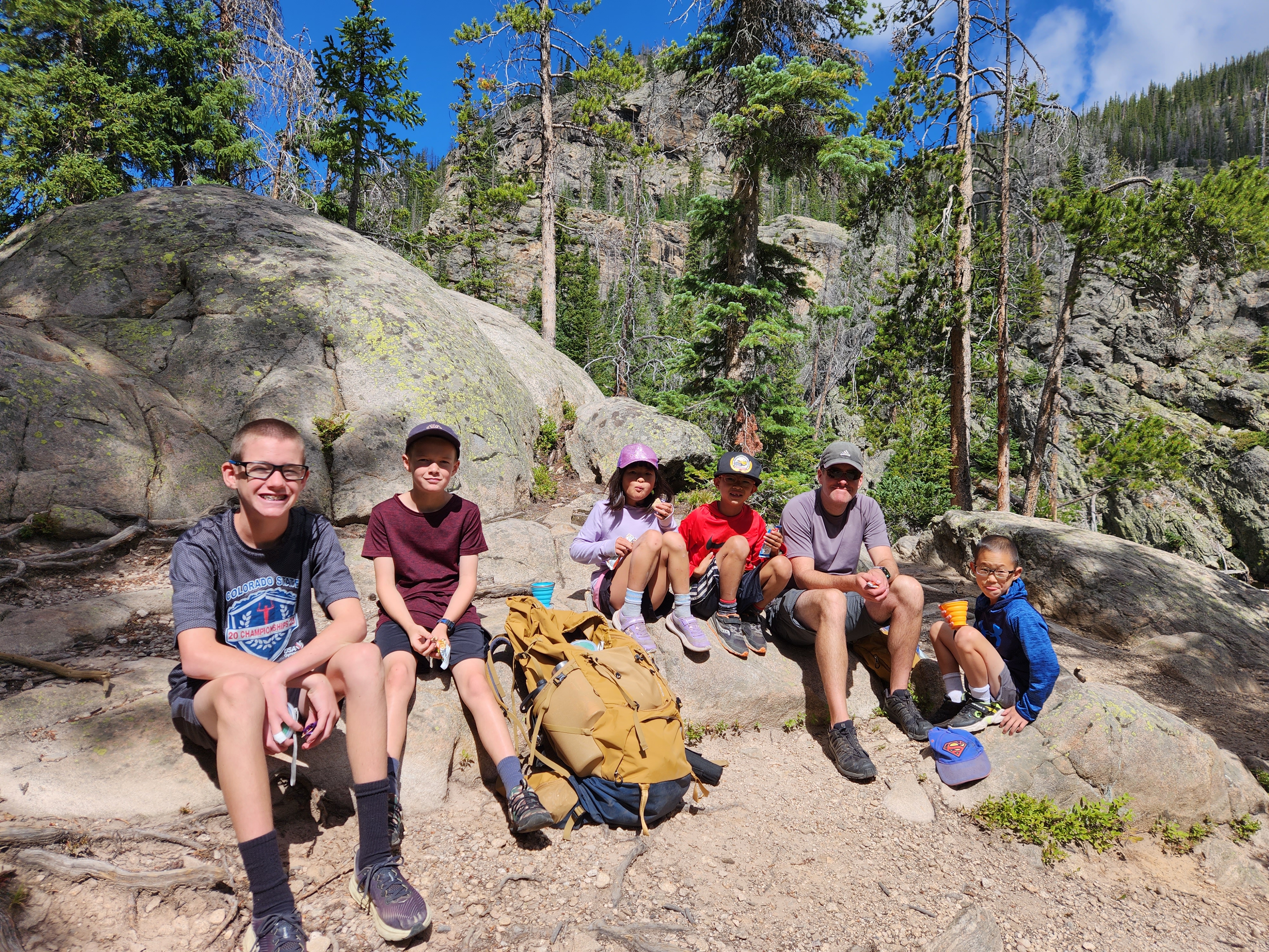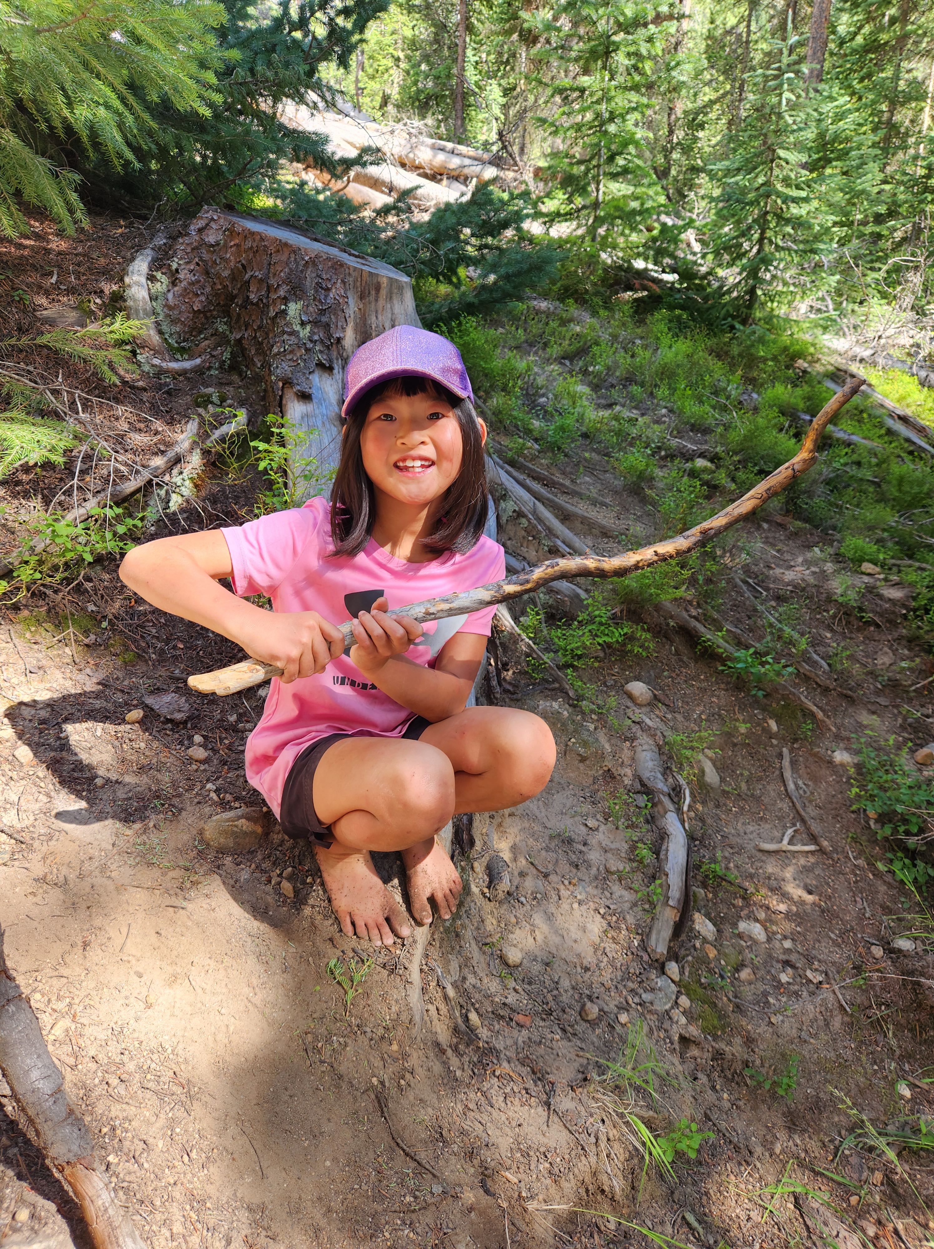 As usual I am way behind in my blogging. This is from our second day backpacking. We woke up chilly, I think the temp was in the low 40s, but as the sun came up we slowly warmed up. After a good breakfast we packed lunch and waters and snacks and headed out on the trail farther up. The trail was beautiful and very lush. Paxton found a couple little streams to jump over and there were all sorts of waterfalls. We came to Lone Pine Lake and everyone threw rocks in and we ate our snacks. Then we continued up the trail another 1-2 miles to Lake Verna and it was beautiful and we were the only ones there. Caedmon and Edric promptly threw in the biggest log they could find (calling it the Titanic). We ate lunch and just enjoyed the quiet and beauty for quite awhile. After hiking back down to our site we spent the remainder of the afternoon playing in the headwaters of the Colorado River. Coppelia insisted on fishing with her stick and was quite upset that no fish were biting on the attached grass, she then got the idea to chase grasshoppers around trying to catch them to attach to her line. Edric decided to just use some dried coconut from our trail mix and put it on a hook that Clint had fashioned and whittled out of wood. Neither had any luck….and we tried to tell Edric that we weren’t so sure that the fish in the Colorado River were coconut eating fish…..maybe that was a little too tropical for them. We had a great evening and slept decently well. The next morning we packed up camp and headed down the mountain. We had a great time and everyone is already planning our next trip next summer.