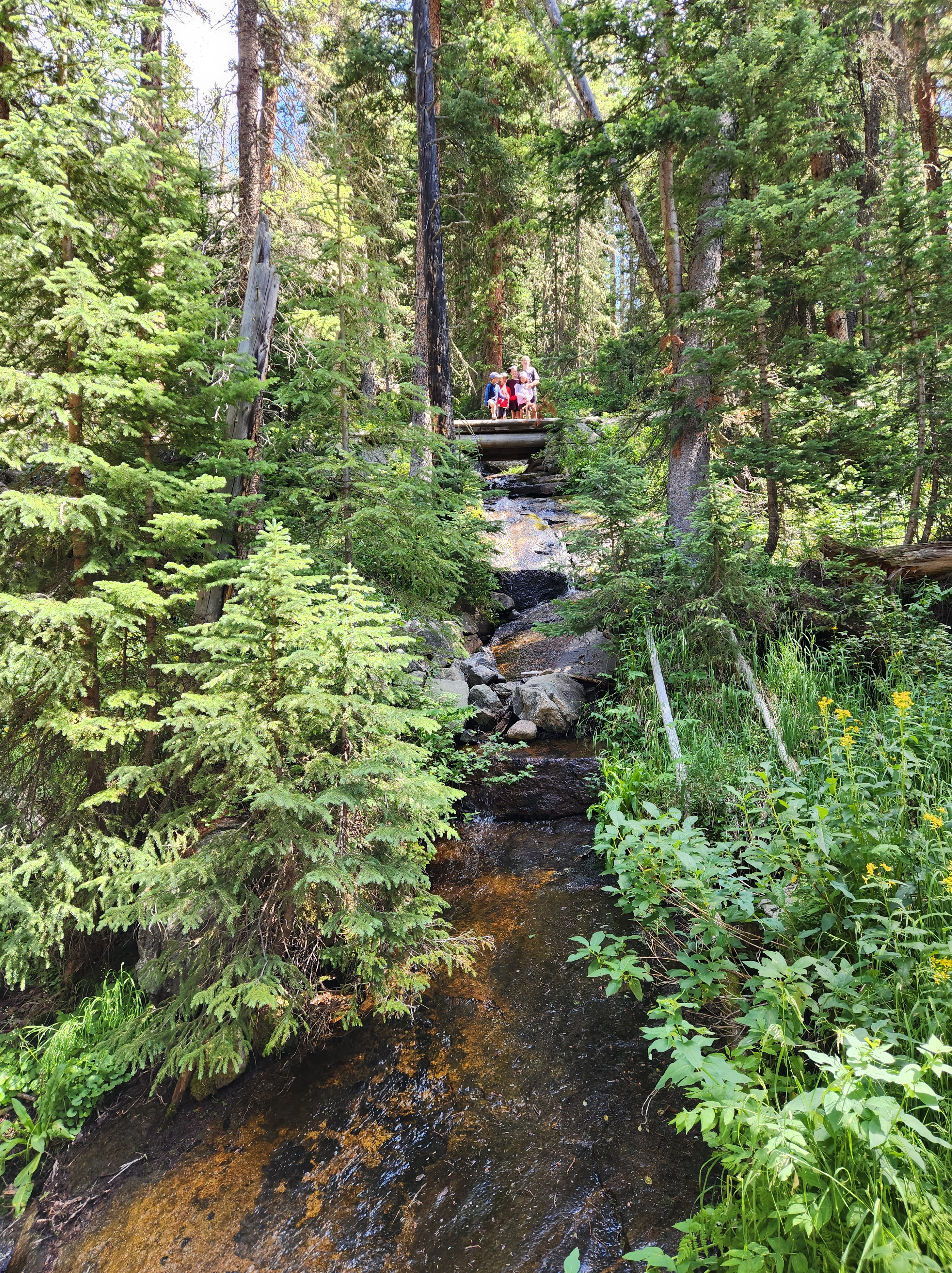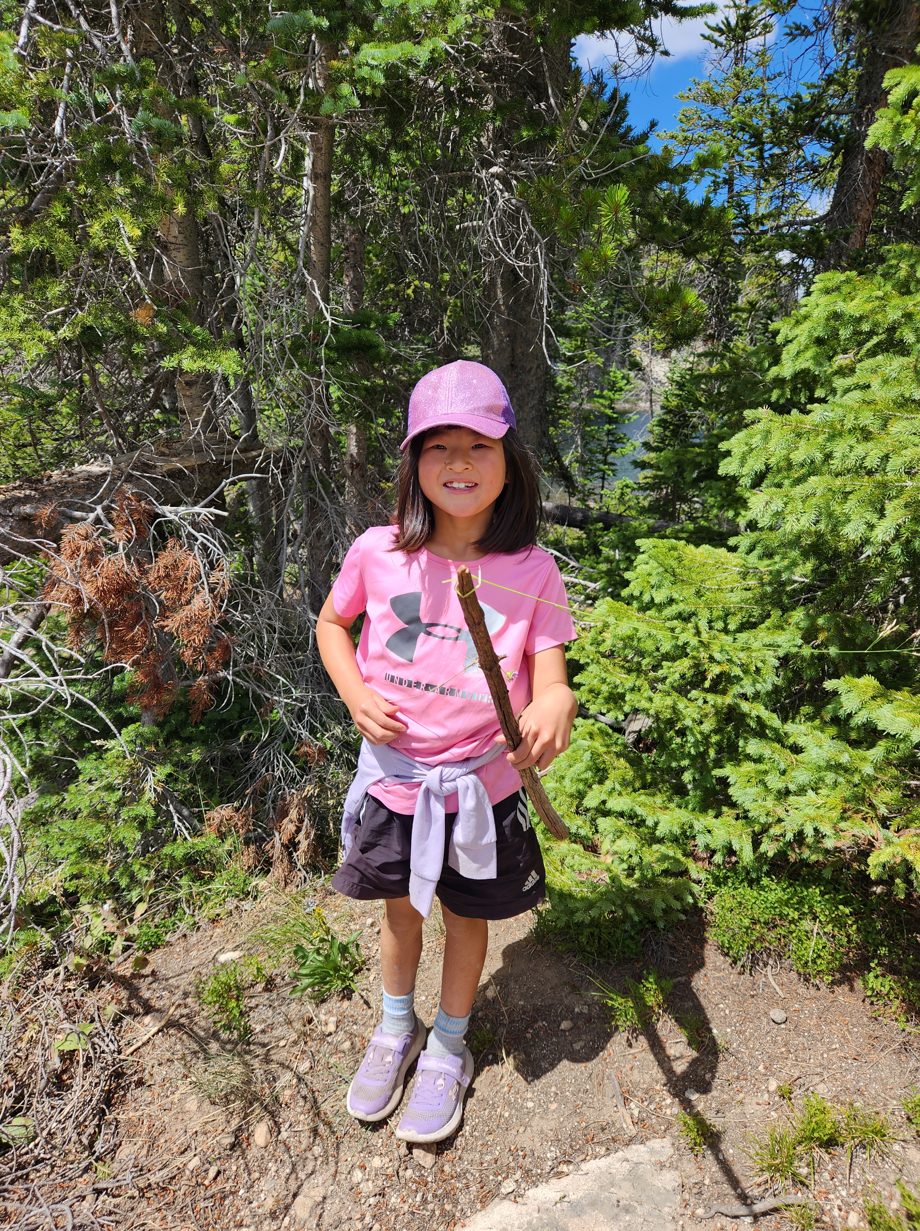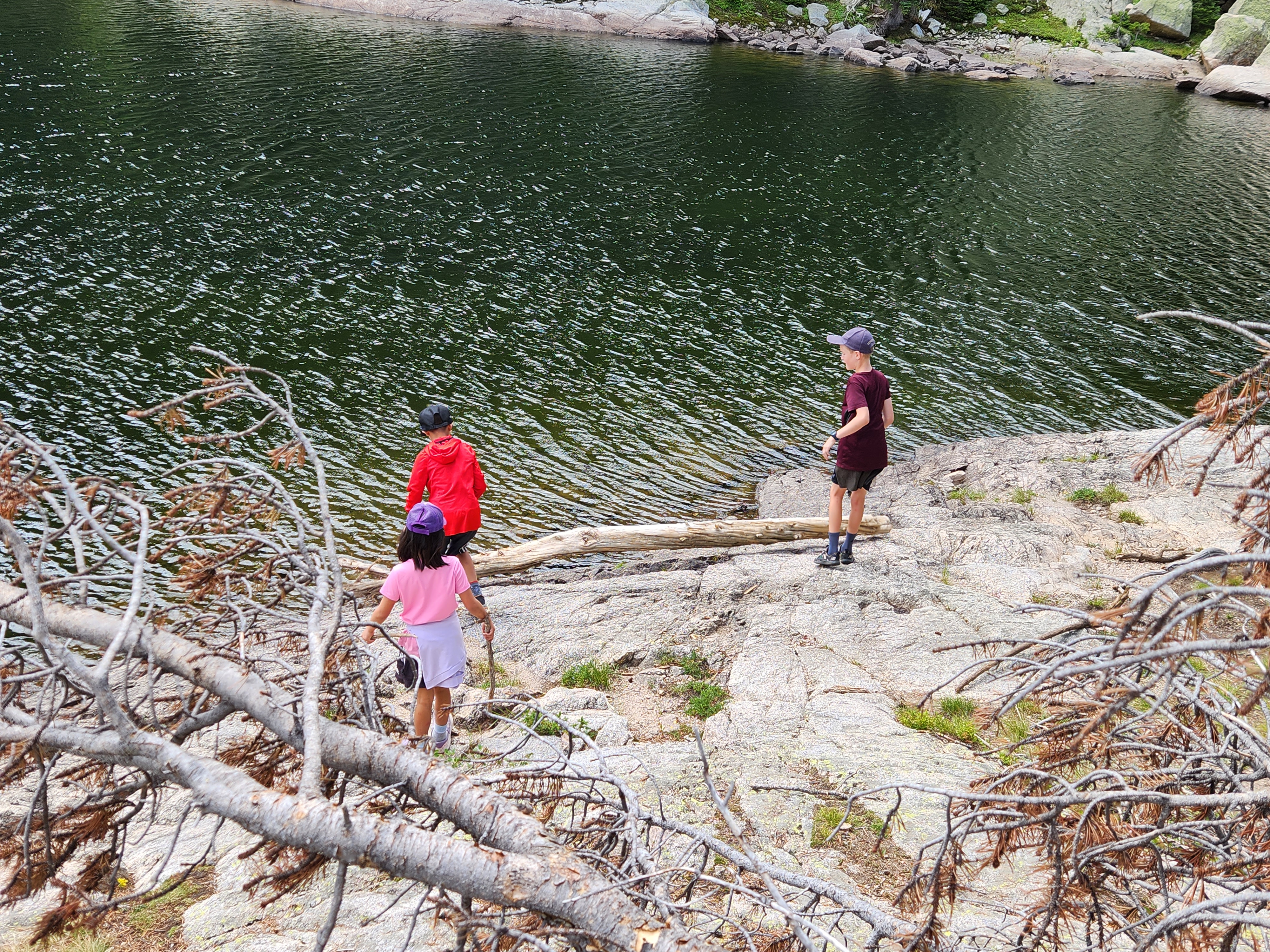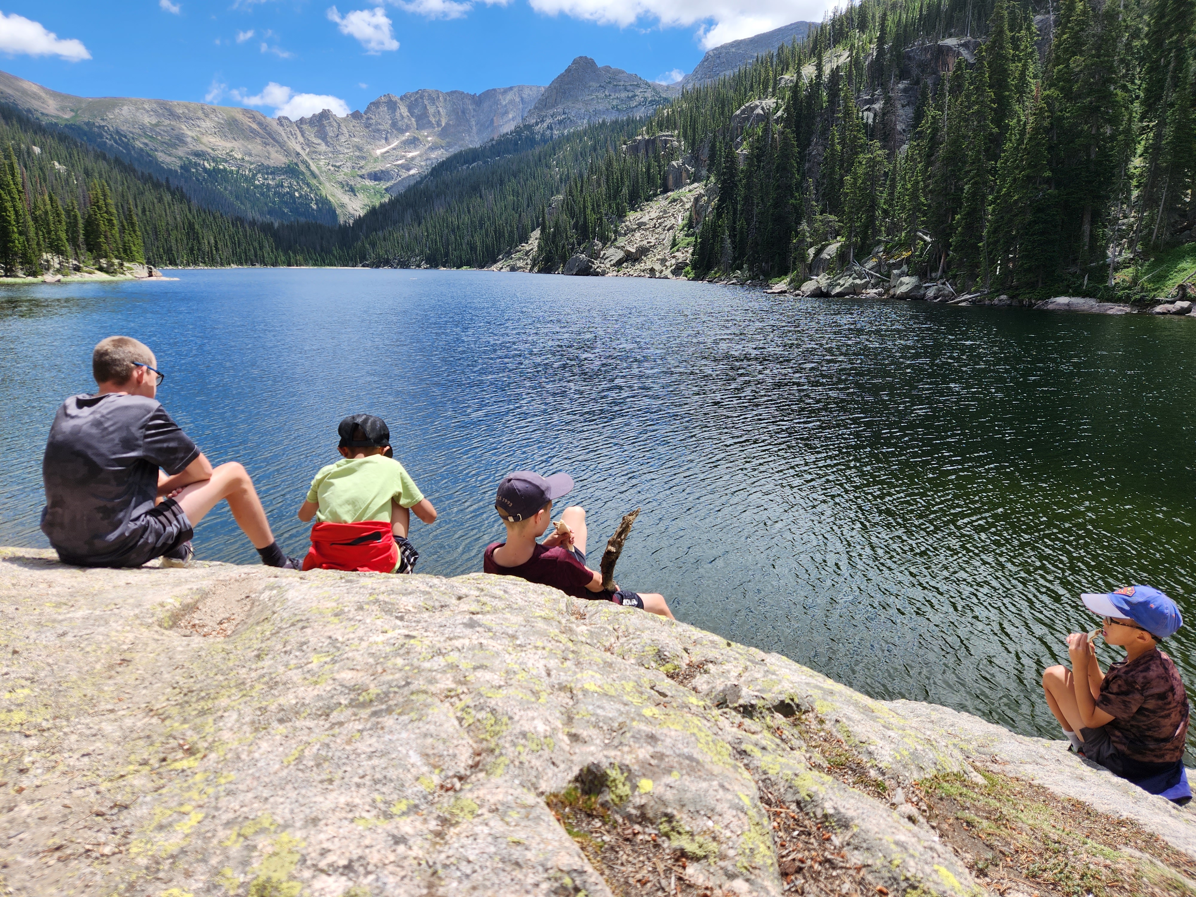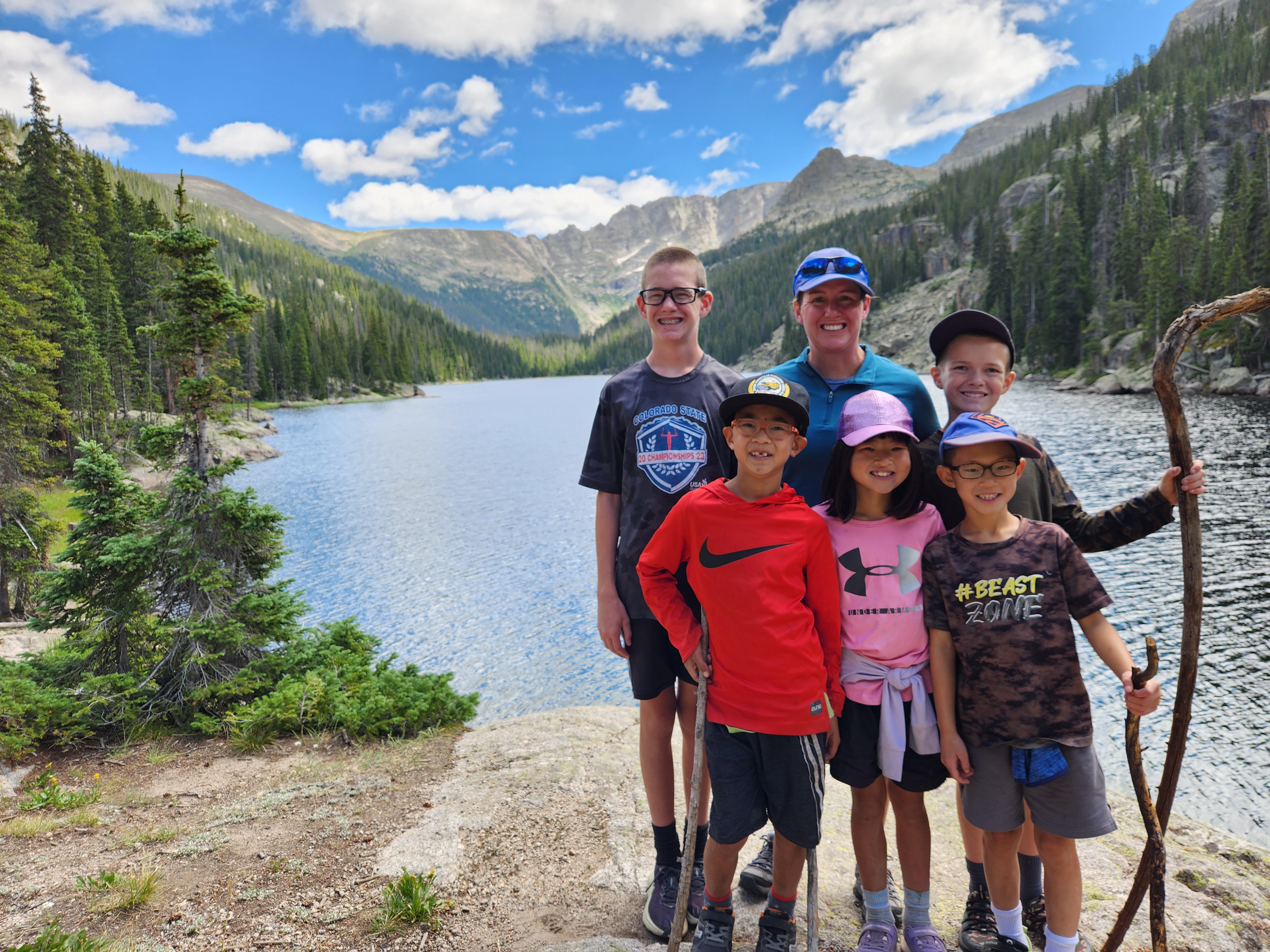 As usual I am way behind in my blogging. This is from our second day backpacking. We woke up chilly, I think the temp was in the low 40s, but as the sun came up we slowly warmed up. After a good breakfast we packed lunch and waters and snacks and headed out on the trail farther up. The trail was beautiful and very lush. Paxton found a couple little streams to jump over and there were all sorts of waterfalls. We came to Lone Pine Lake and everyone threw rocks in and we ate our snacks. Then we continued up the trail another 1-2 miles to Lake Verna and it was beautiful and we were the only ones there. Caedmon and Edric promptly threw in the biggest log they could find (calling it the Titanic). We ate lunch and just enjoyed the quiet and beauty for quite awhile. After hiking back down to our site we spent the remainder of the afternoon playing in the headwaters of the Colorado River. Coppelia insisted on fishing with her stick and was quite upset that no fish were biting on the attached grass, she then got the idea to chase grasshoppers around trying to catch them to attach to her line. Edric decided to just use some dried coconut from our trail mix and put it on a hook that Clint had fashioned and whittled out of wood. Neither had any luck….and we tried to tell Edric that we weren’t so sure that the fish in the Colorado River were coconut eating fish…..maybe that was a little too tropical for them. We had a great evening and slept decently well. The next morning we packed up camp and headed down the mountain. We had a great time and everyone is already planning our next trip next summer.