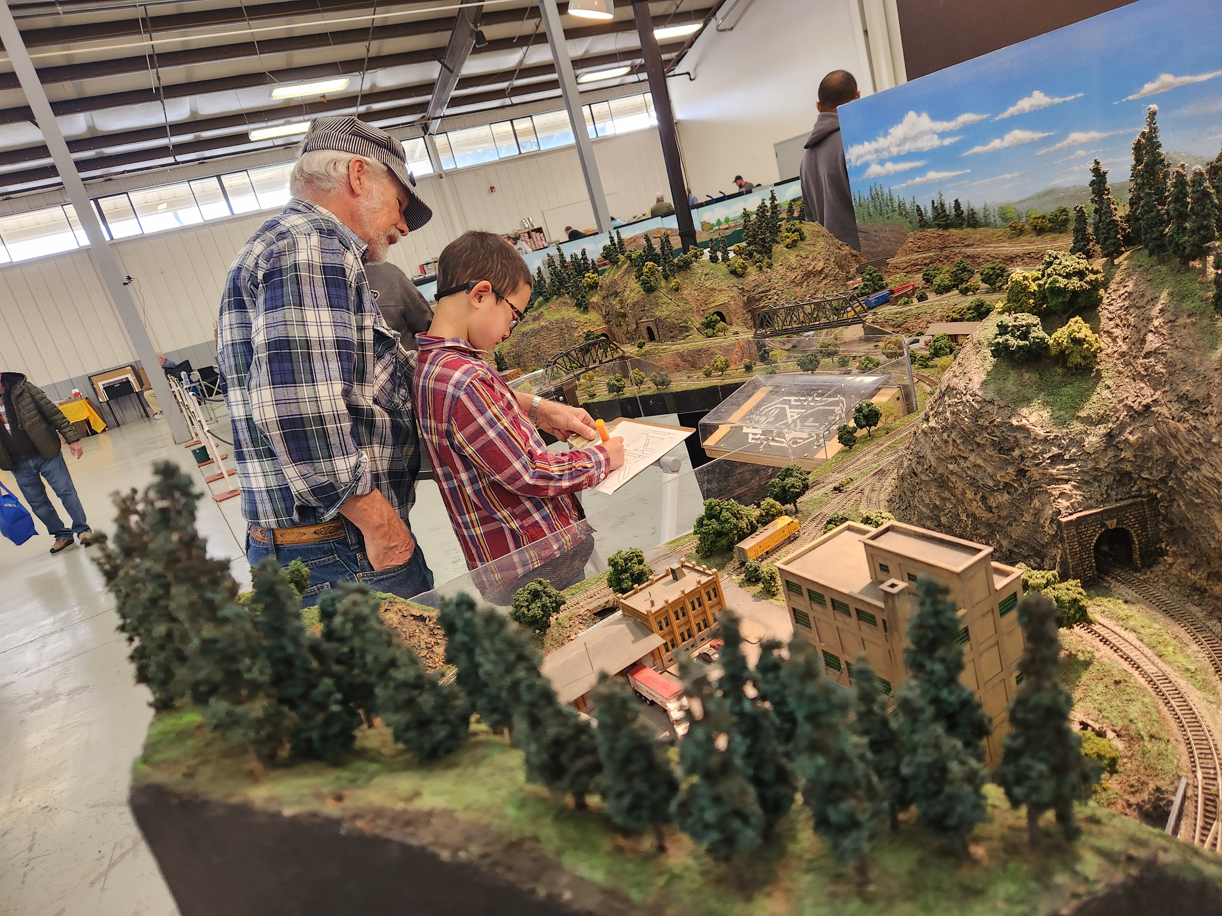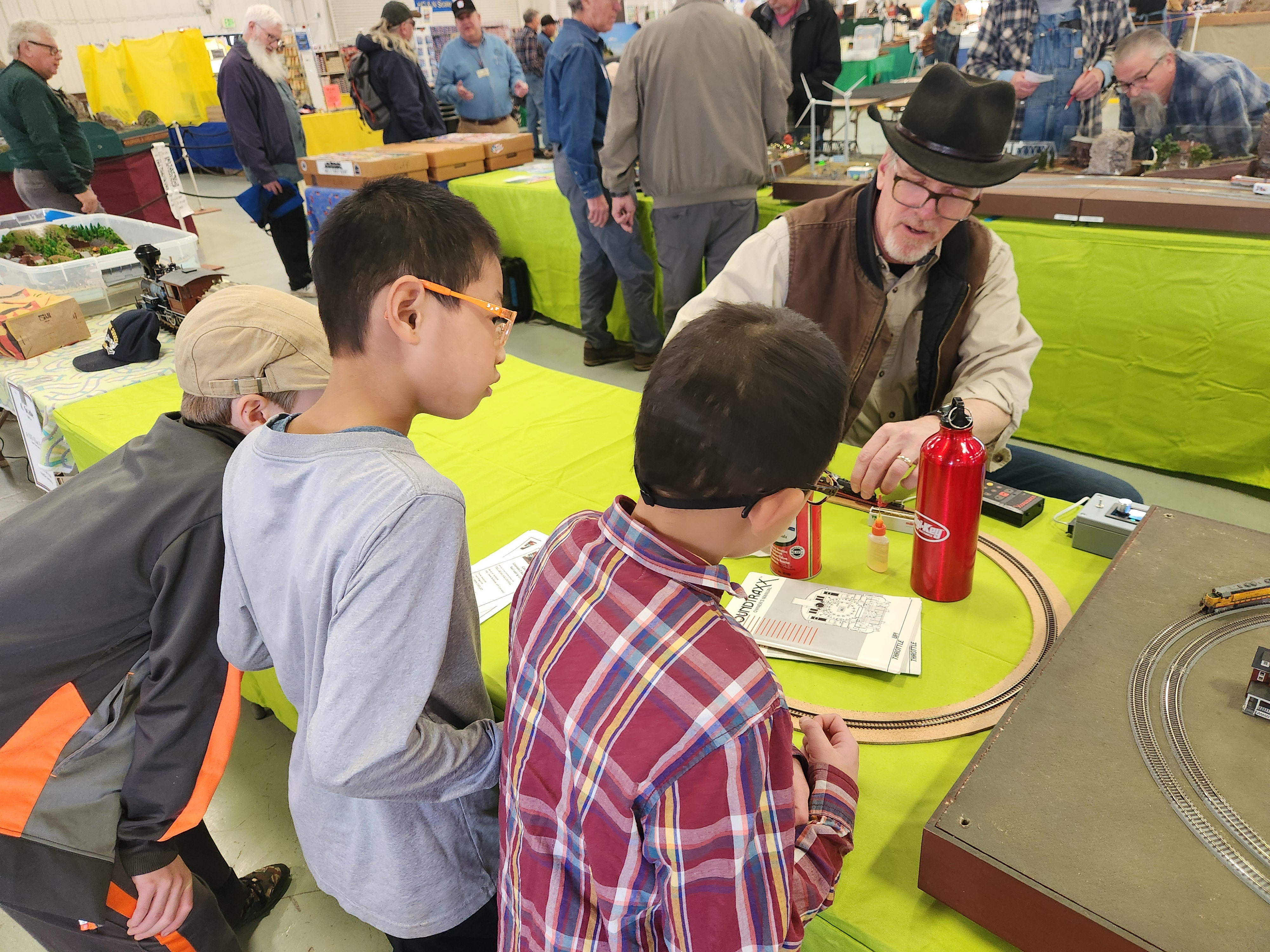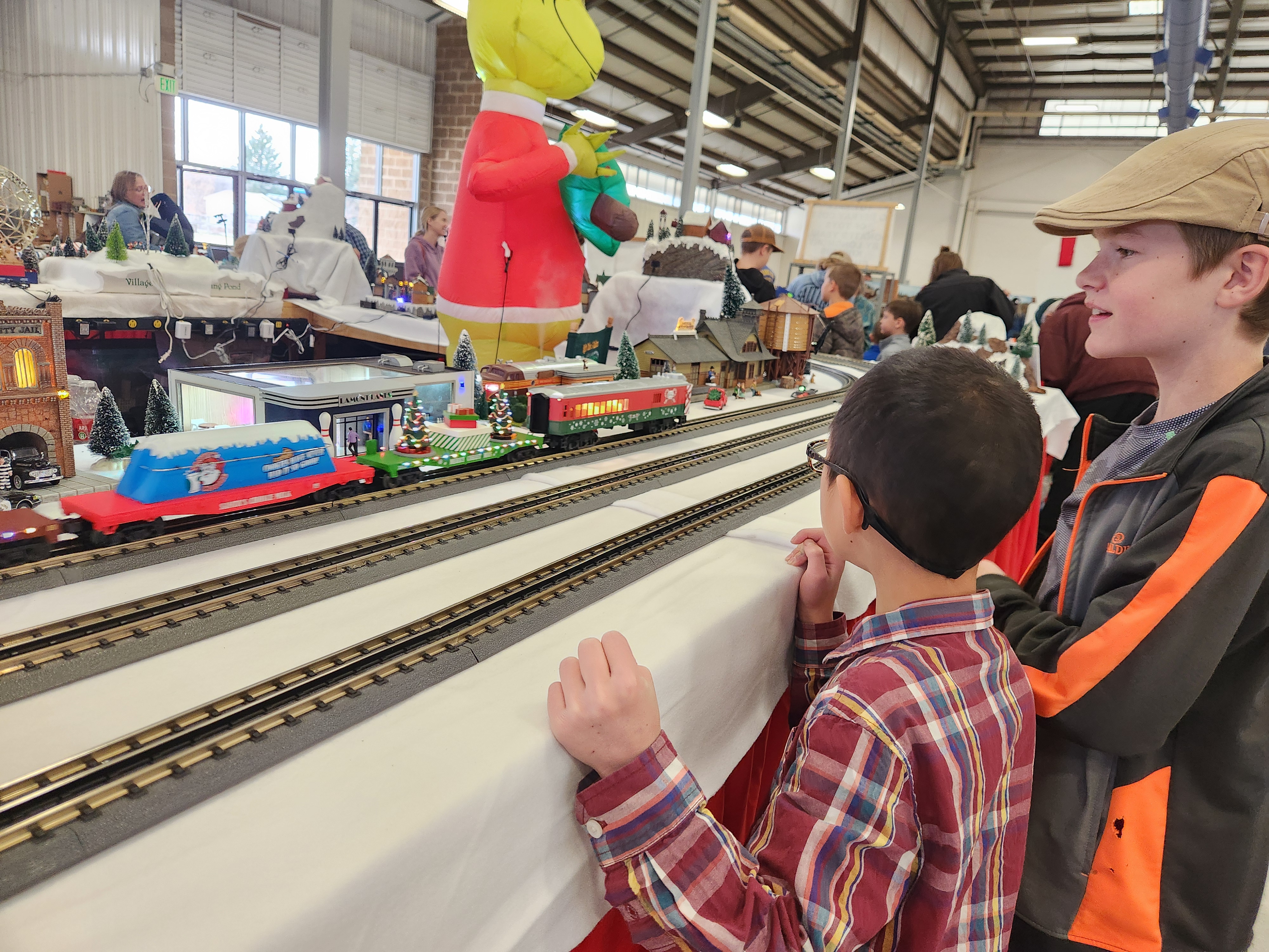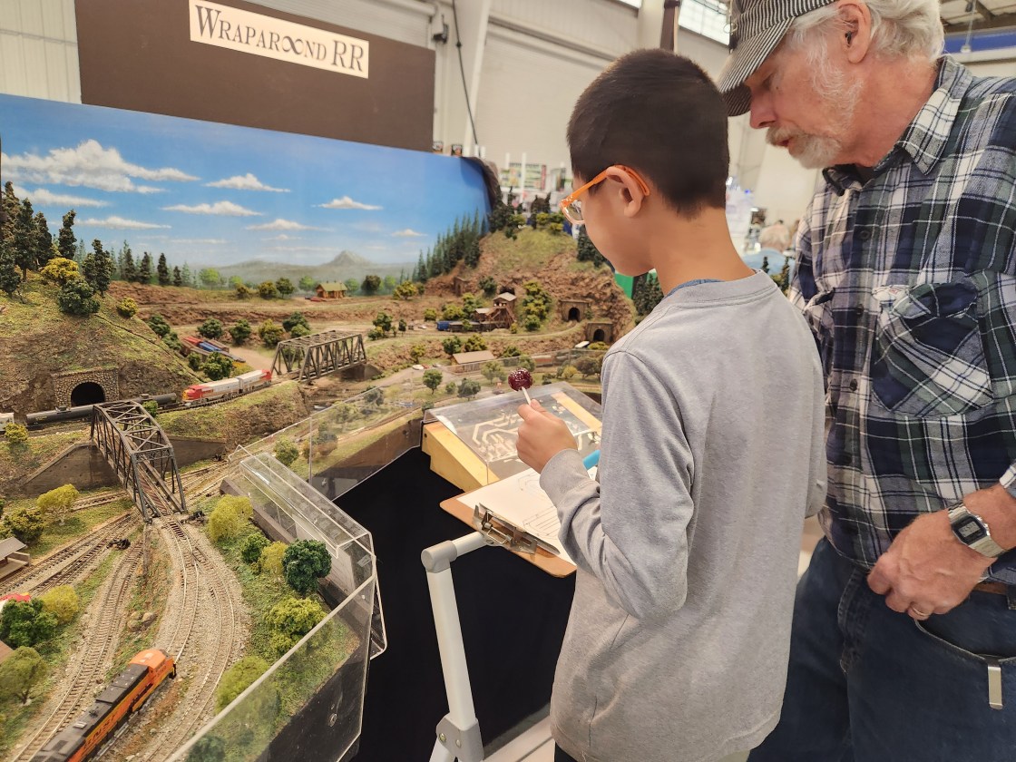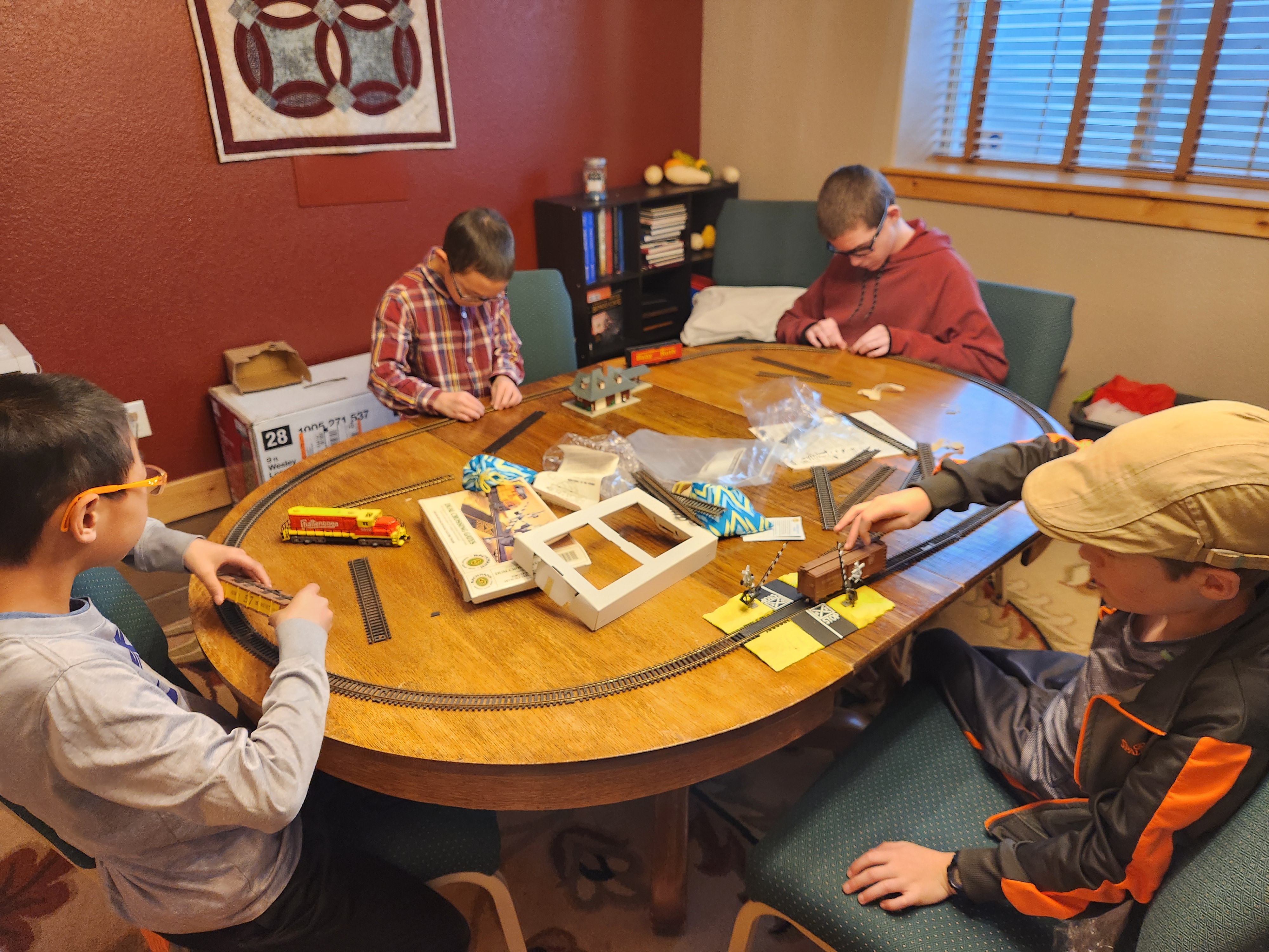 A couple of Fridays ago I took all the boys with me to visit the train show. I didn’t tell them what we were doing and they were all surprised. There was also a rock/mineral show going on in the same building and while we walked through that, the boys loved the trains. There were model trains of all sizes. Many had search and finds in the landscapes/cityscapes that they had set up. The train conductors were all proud of their model trains and enjoyed sharing them with all the kids and explaining how they had made them and built the sets. One of the guys had a number of different tracks that wrapped around and had blank maps that they kids could trace and follow the trains and their routes through all the tunnels and highlight their routes on the blank maps. Edric has also been my biggest train fan and he actually found a train engine for sale for 10$ which was about 10% the price of what a new one was going through and then also found some tracks for 1$. He was very excited and used his own money. Later he was talking with one of train set builders, (the same one with the maps and tunnels) and proudly showed him his new train engine. The sweet gentleman asked if he had any cars to go, and Edric said he was going to build his set over time and save up his money. Well that guy took me and Edric out to his car where he had some train cars and set pieces that he was going to give away and he loaded Edric up. I don’t remember the last time I had seen him smile so much. It was a really sweet moment. Caedmon also ran into a couple of his good friends. When we got home all the boys got busy setting up the new train and tracks.