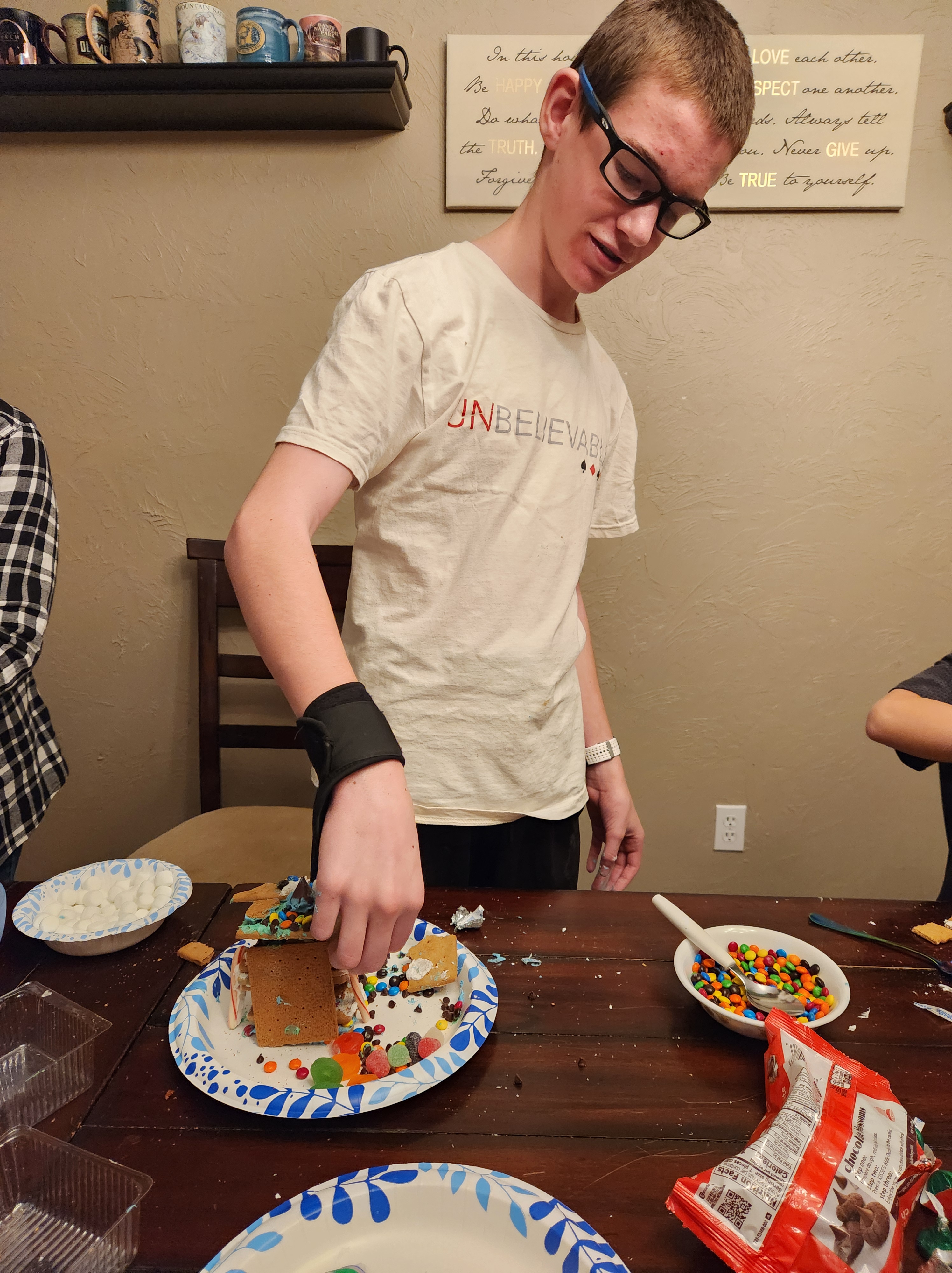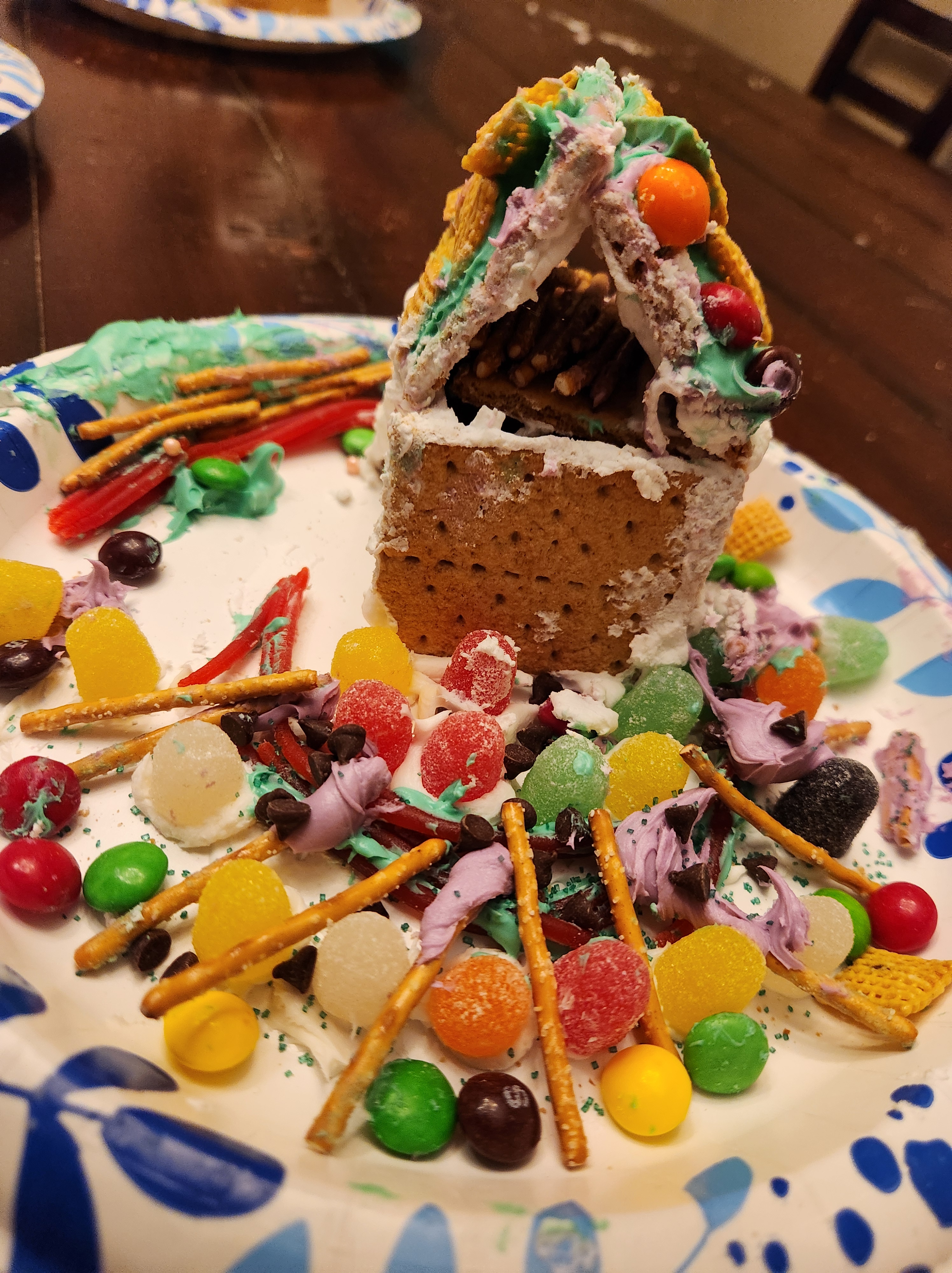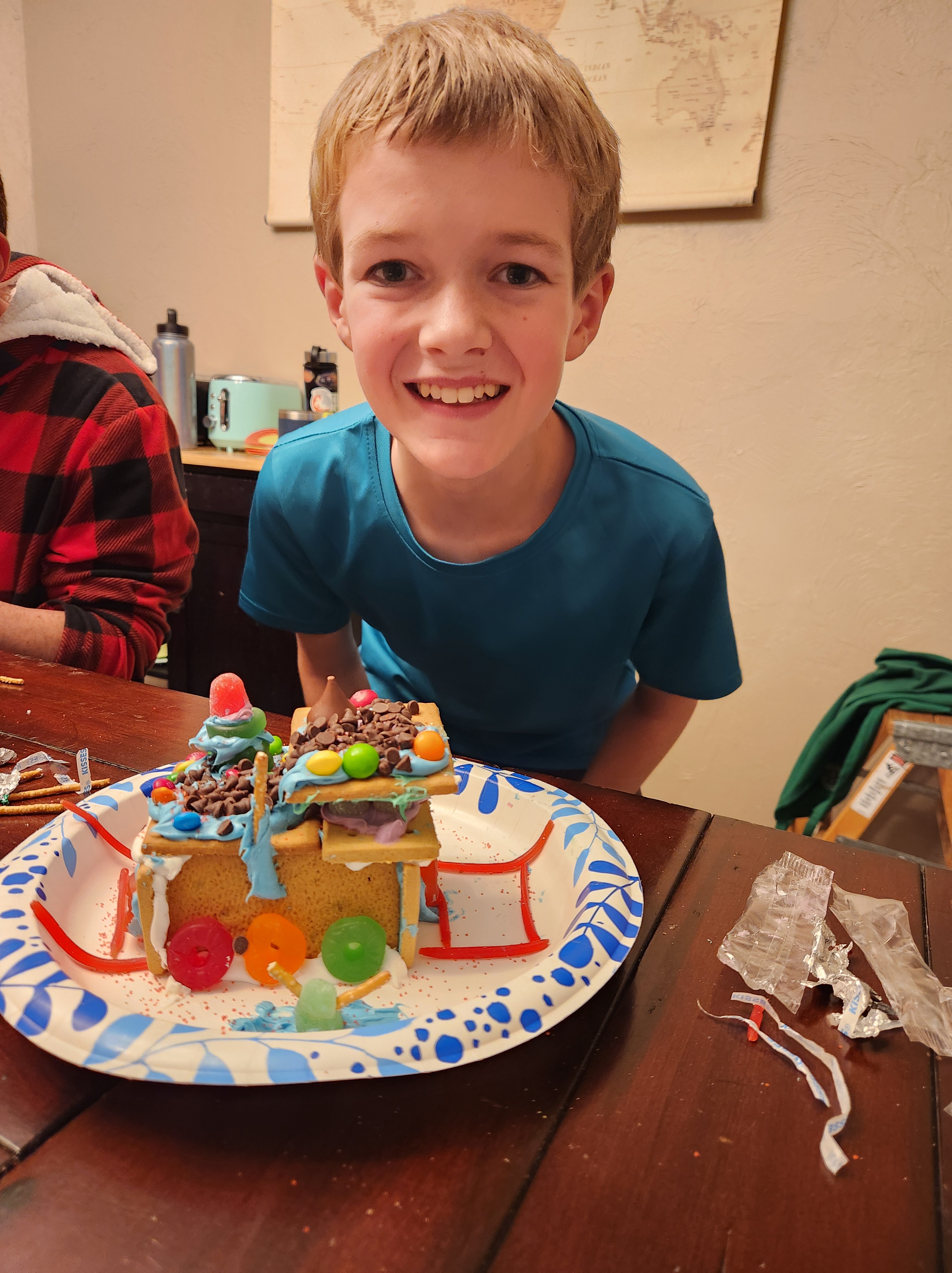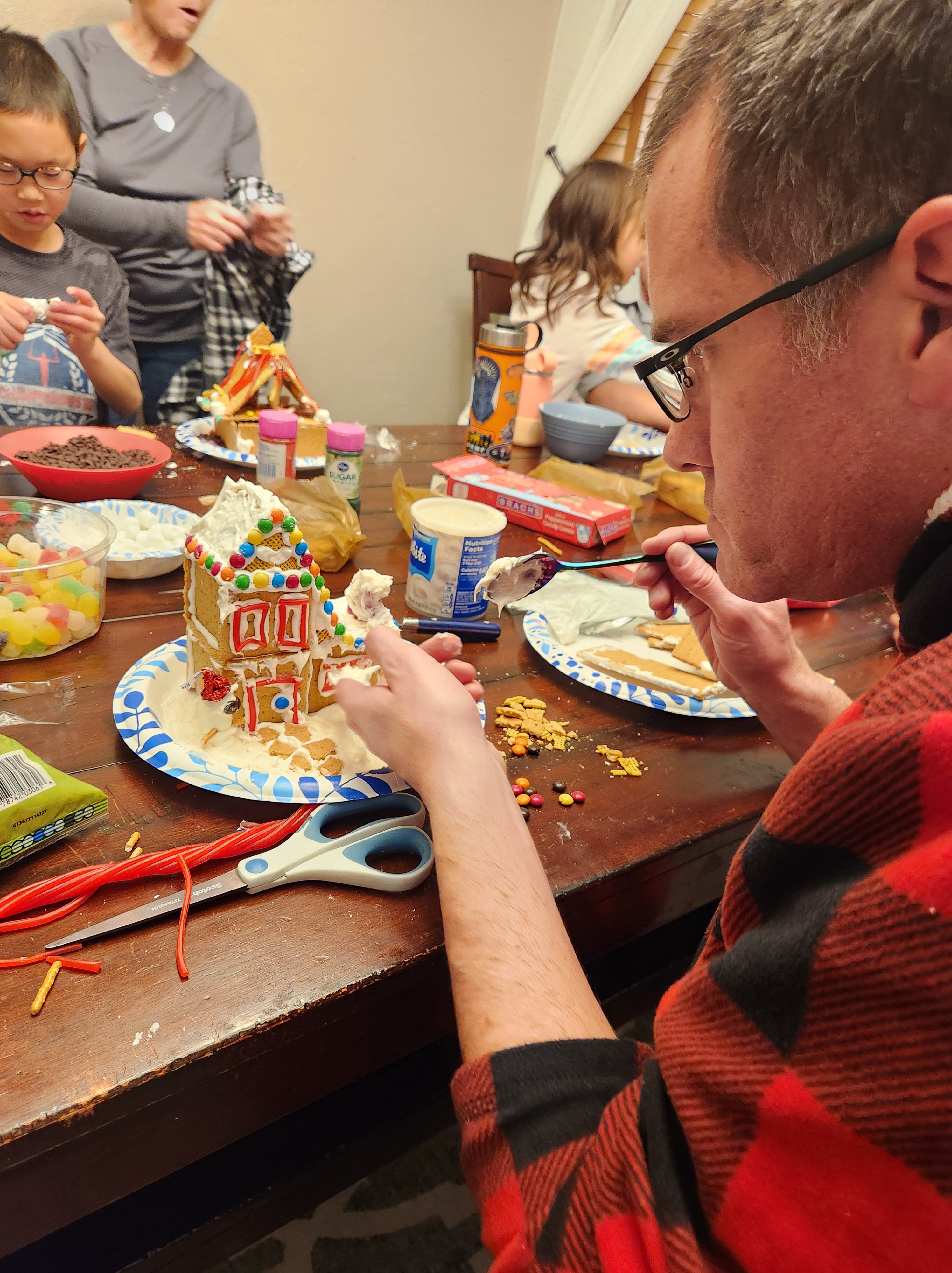 We had a family gingerbread house decorating night to celebrate my dad’s birthday and just for fun. My dad teamed up with my niece Johanna and my mom ended up as the chief construction manager for a few different houses but then ultimately was the judge for each house. Everyone had fun even if their houses fell apart or required some adjustments…..I may have stretched my luck and I just made a nice tent in the forrest next to a lake with fishing poles…..mine never fell over. Caedmon made a train and I teased Leighton based on how he had the candy canes set on the doors that he had made a “love shack” which of course just embarrassed him which was my whole point. I’m pretty sure my dad’s and niece’s fell over at least 3 different times. We all had a blast and it was a great way to spend the evening.