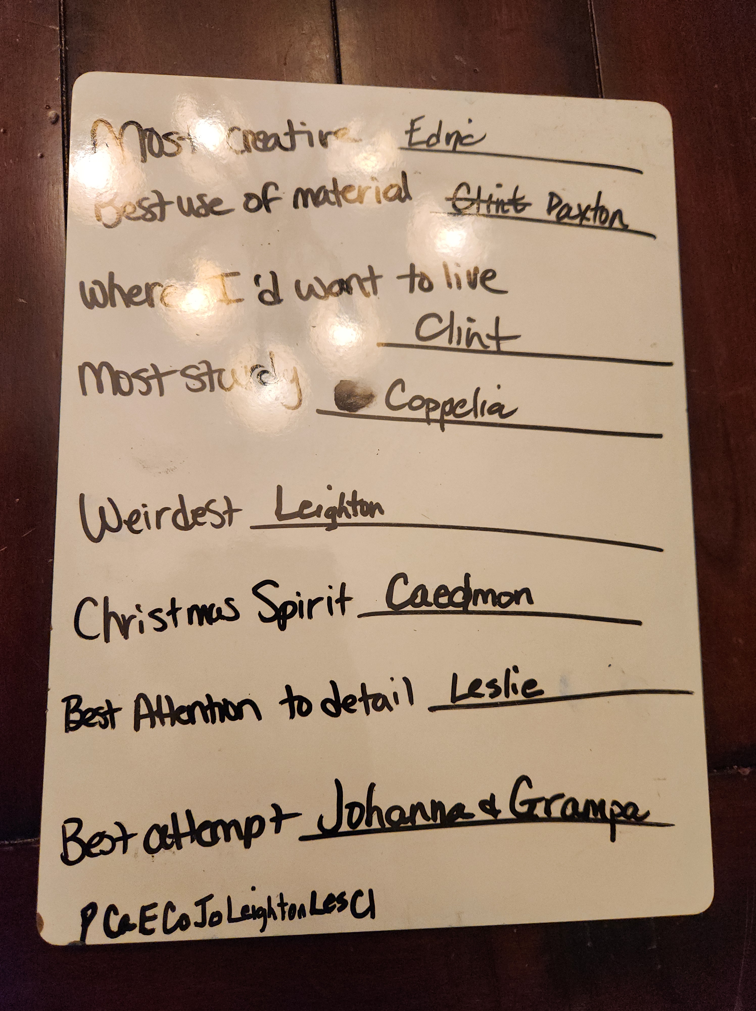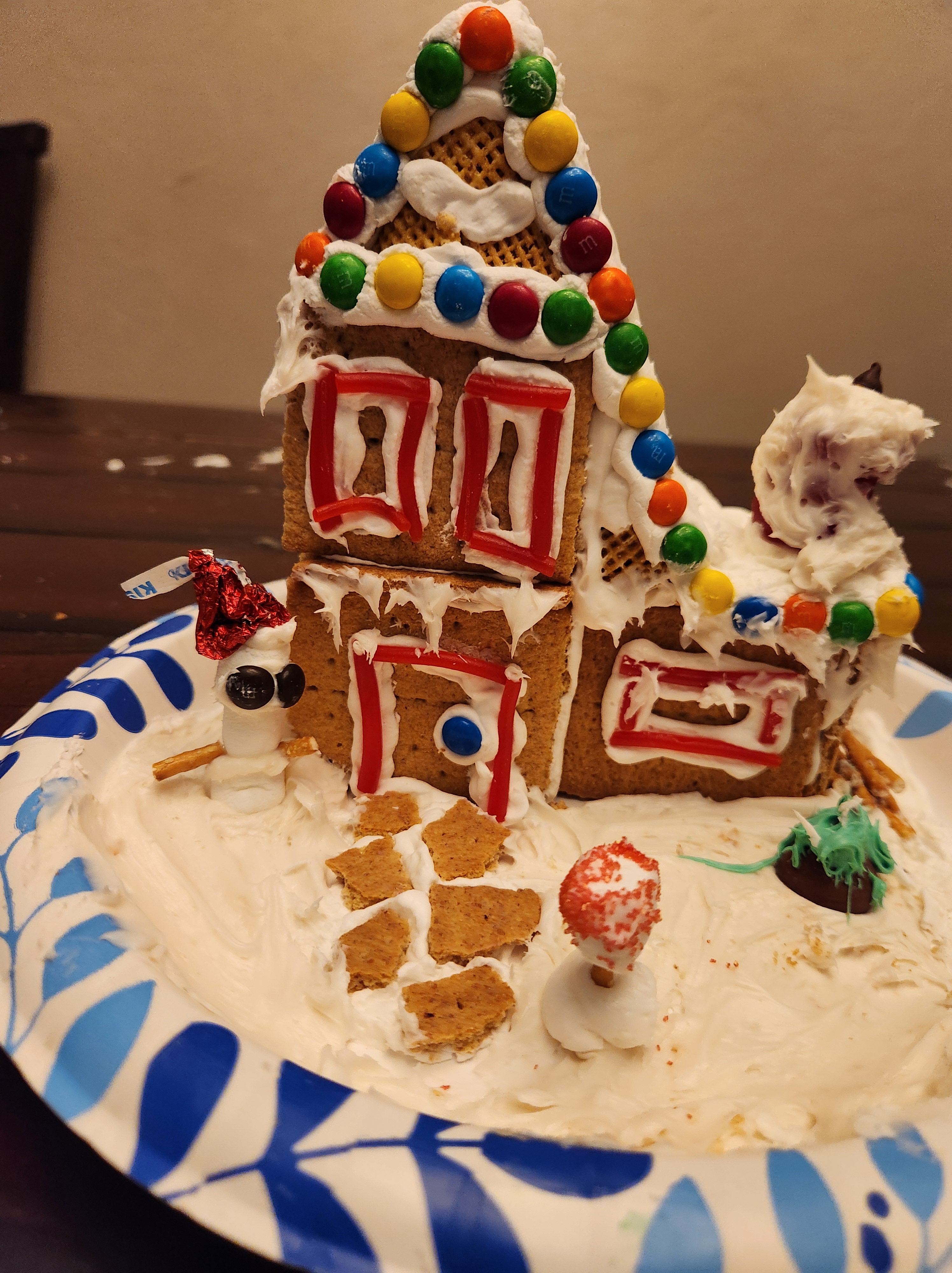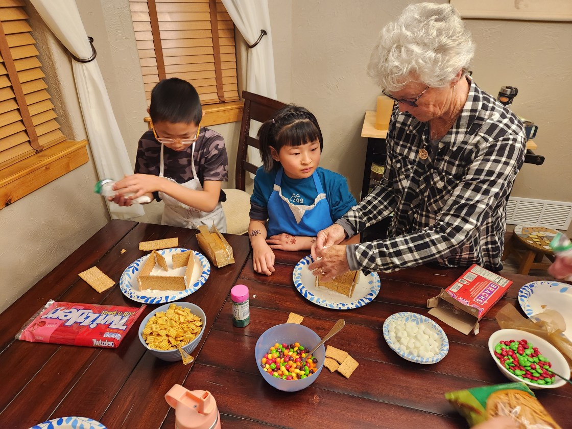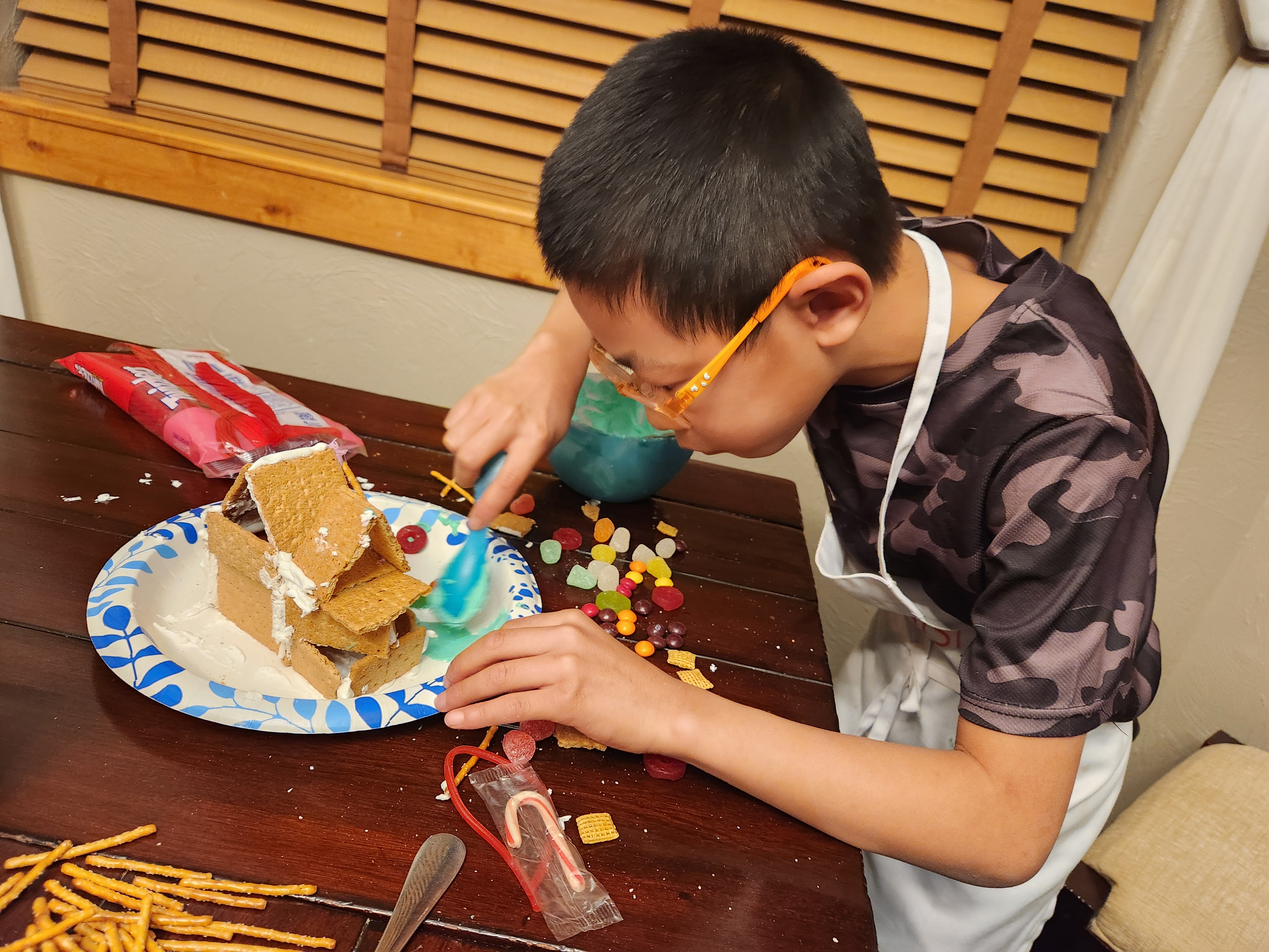 We had a family gingerbread house decorating night to celebrate my dad’s birthday and just for fun. My dad teamed up with my niece Johanna and my mom ended up as the chief construction manager for a few different houses but then ultimately was the judge for each house. Everyone had fun even if their houses fell apart or required some adjustments…..I may have stretched my luck and I just made a nice tent in the forrest next to a lake with fishing poles…..mine never fell over. Caedmon made a train and I teased Leighton based on how he had the candy canes set on the doors that he had made a “love shack” which of course just embarrassed him which was my whole point. I’m pretty sure my dad’s and niece’s fell over at least 3 different times. We all had a blast and it was a great way to spend the evening.