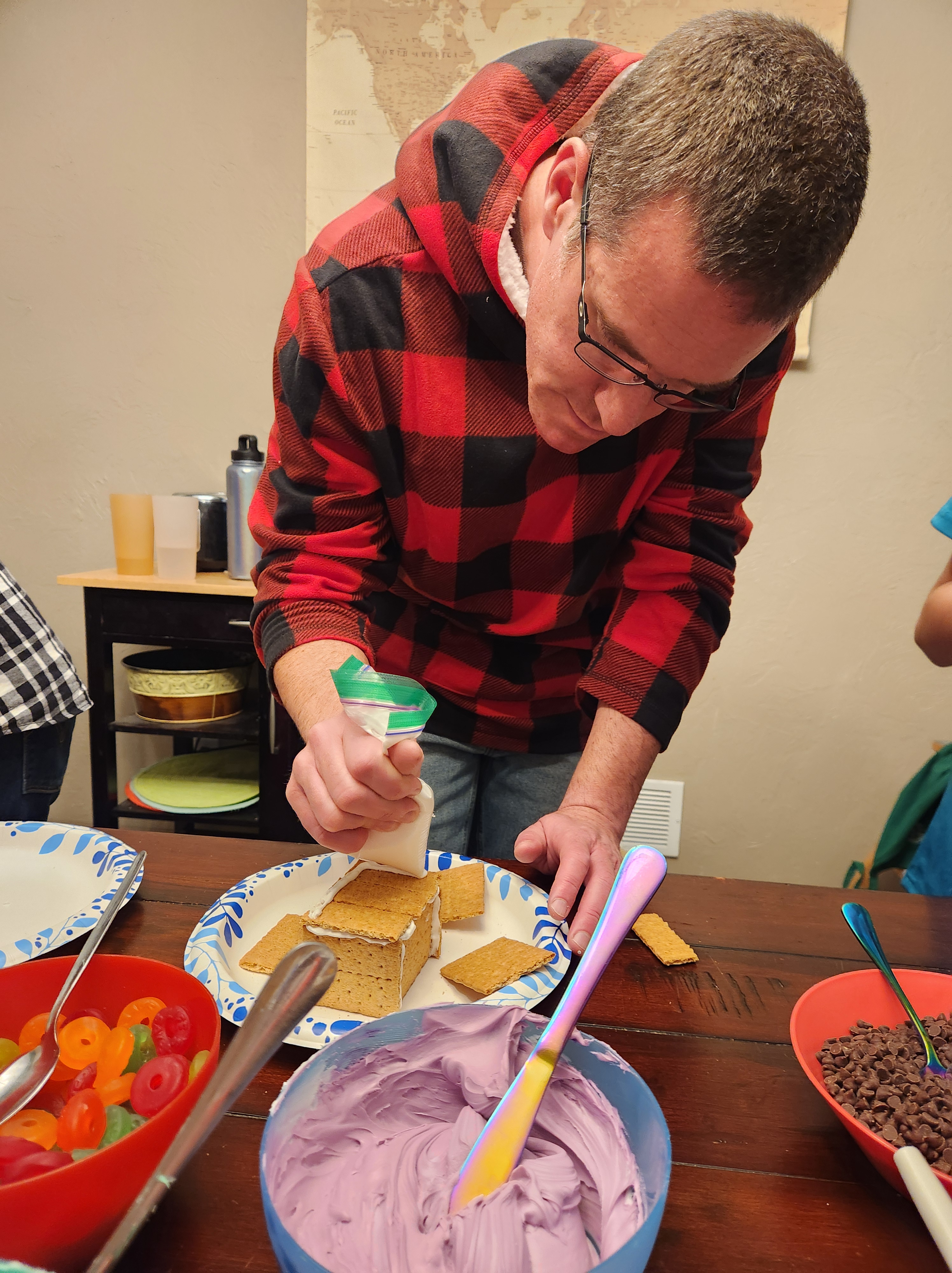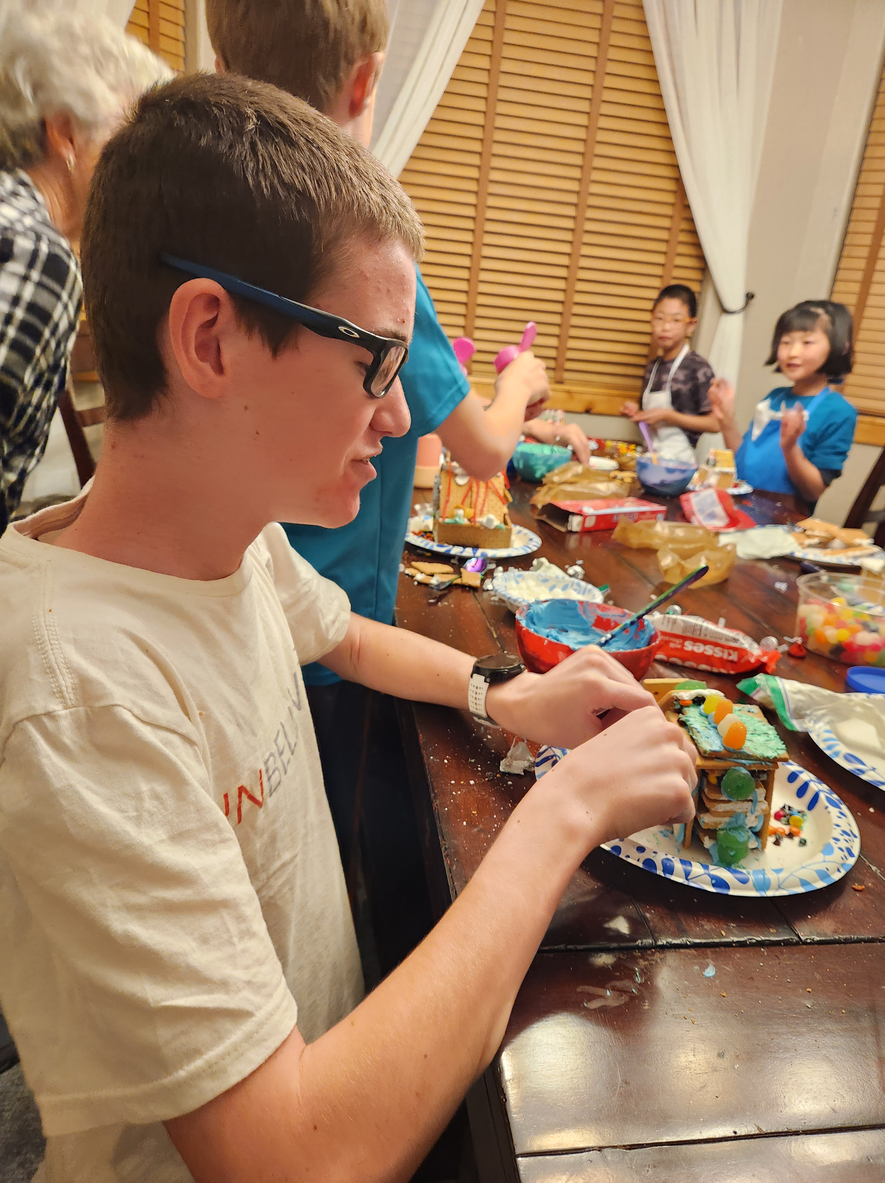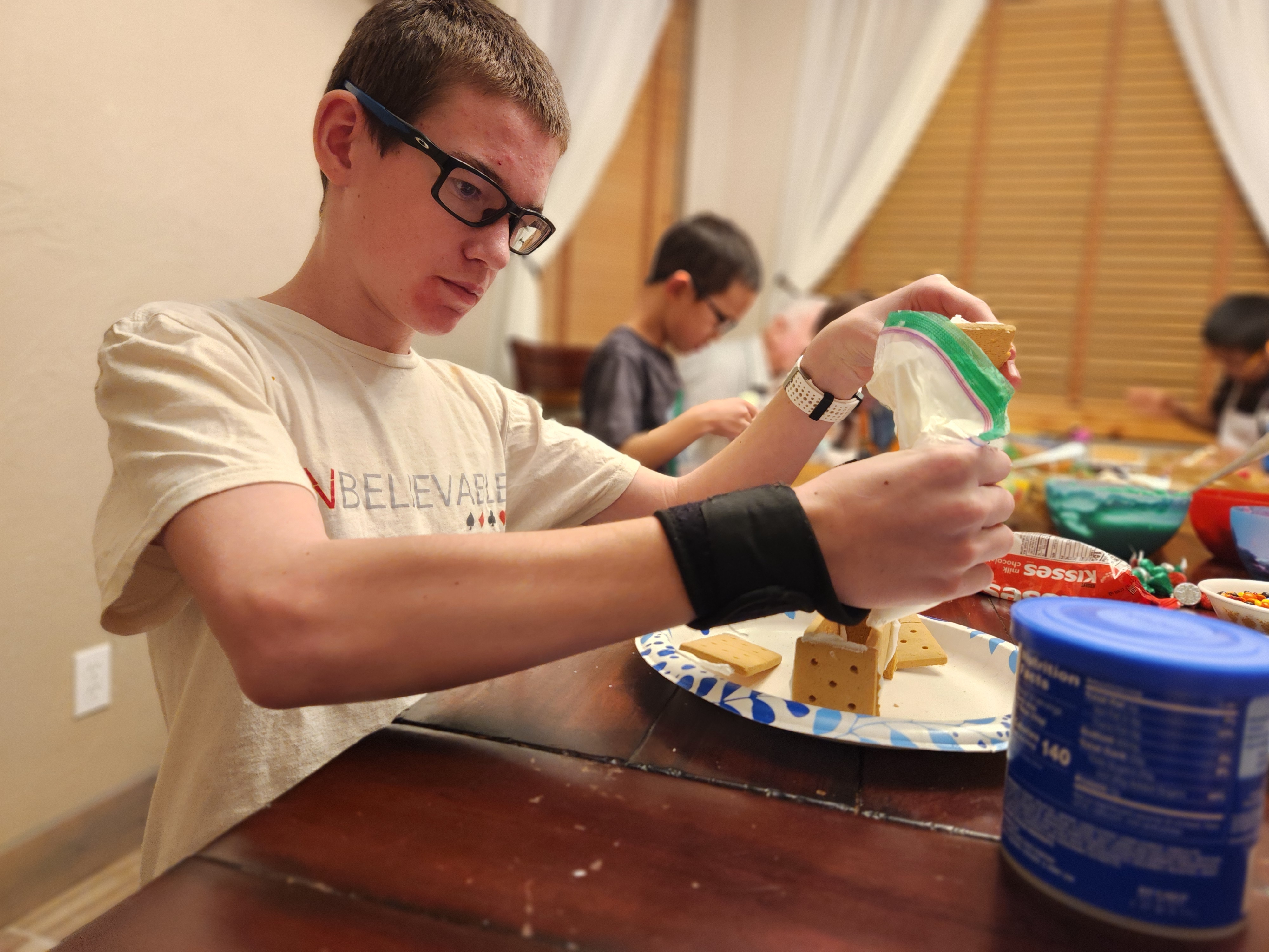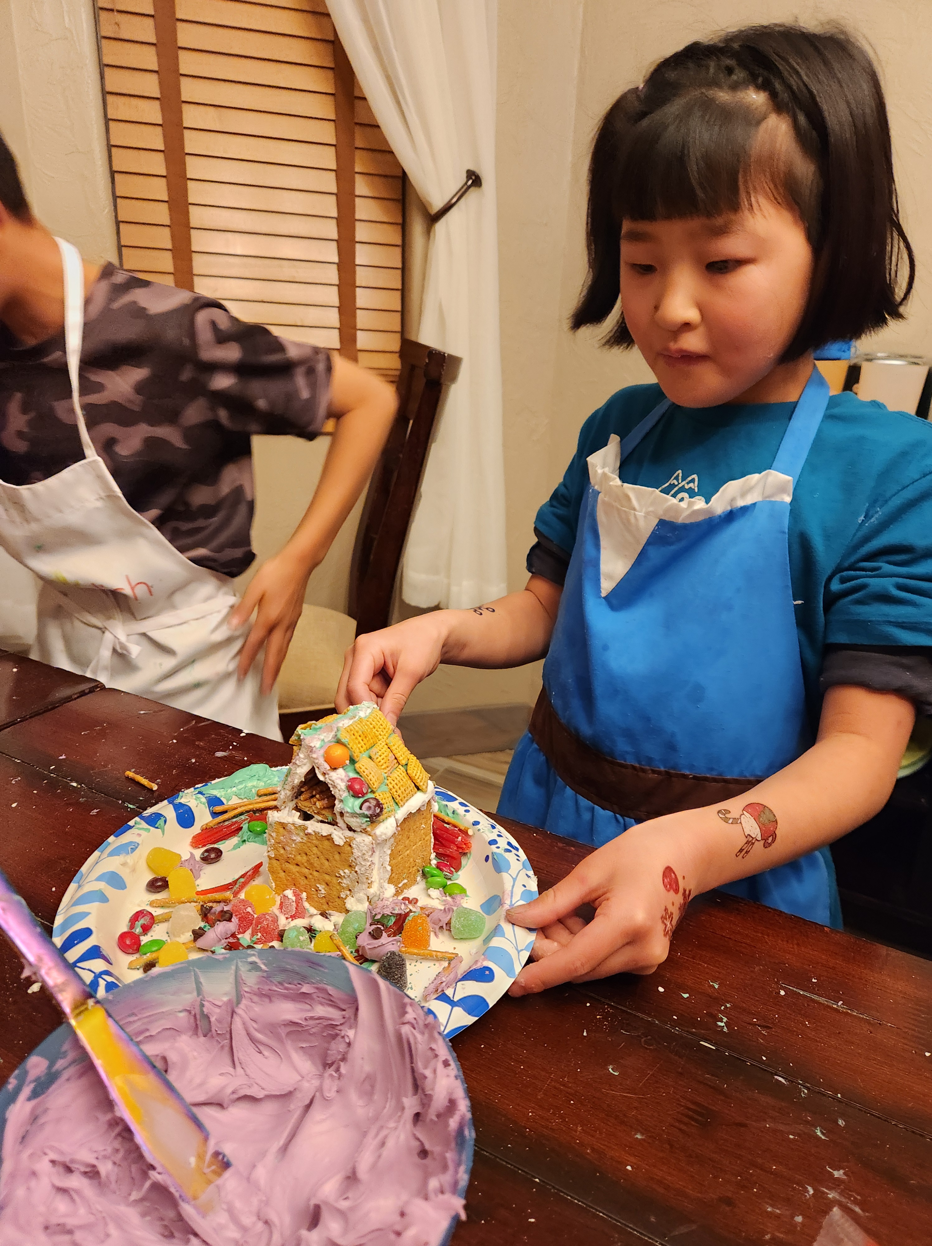 We had a family gingerbread house decorating night to celebrate my dad’s birthday and just for fun. My dad teamed up with my niece Johanna and my mom ended up as the chief construction manager for a few different houses but then ultimately was the judge for each house. Everyone had fun even if their houses fell apart or required some adjustments…..I may have stretched my luck and I just made a nice tent in the forrest next to a lake with fishing poles…..mine never fell over. Caedmon made a train and I teased Leighton based on how he had the candy canes set on the doors that he had made a “love shack” which of course just embarrassed him which was my whole point. I’m pretty sure my dad’s and niece’s fell over at least 3 different times. We all had a blast and it was a great way to spend the evening.