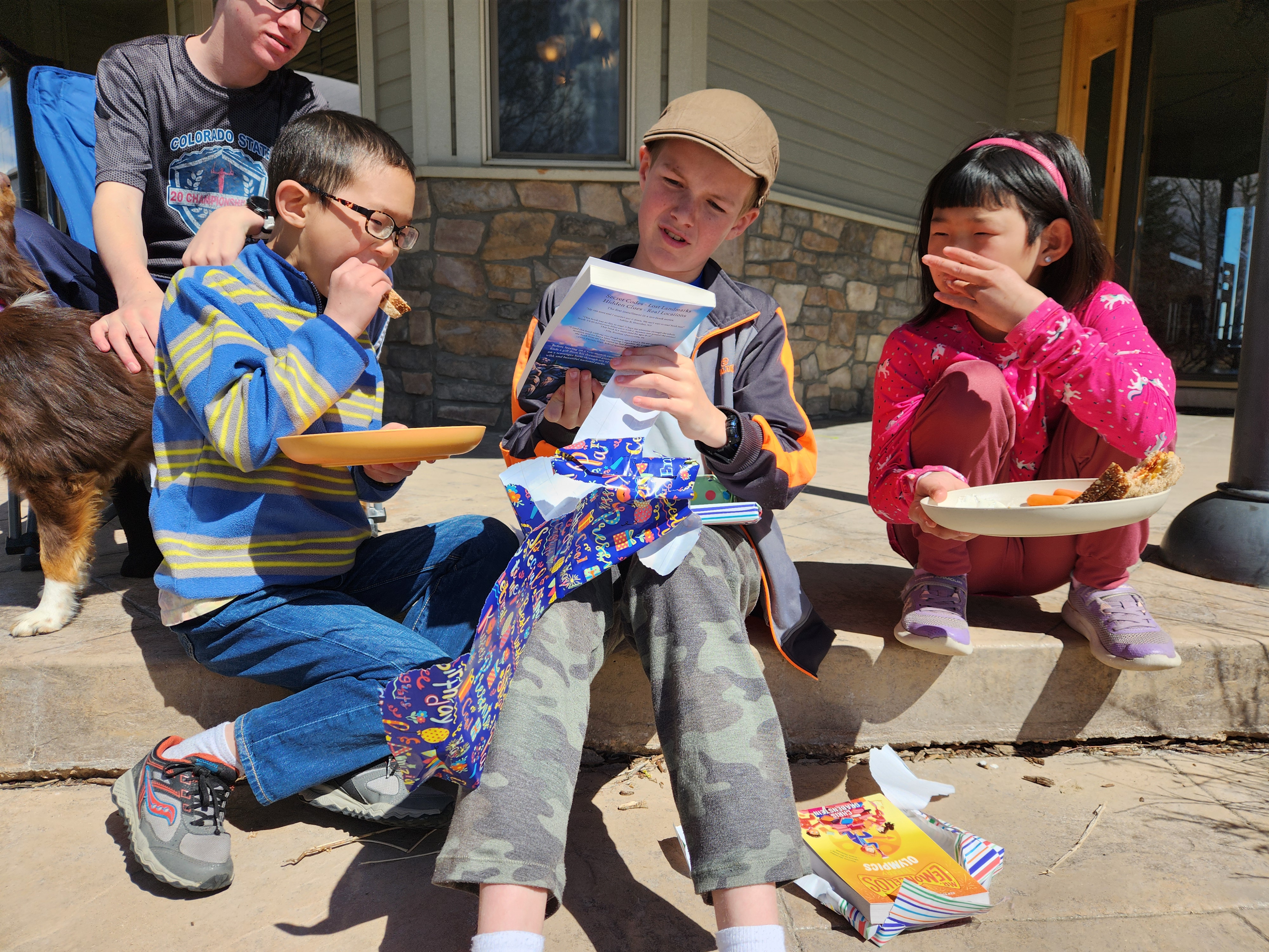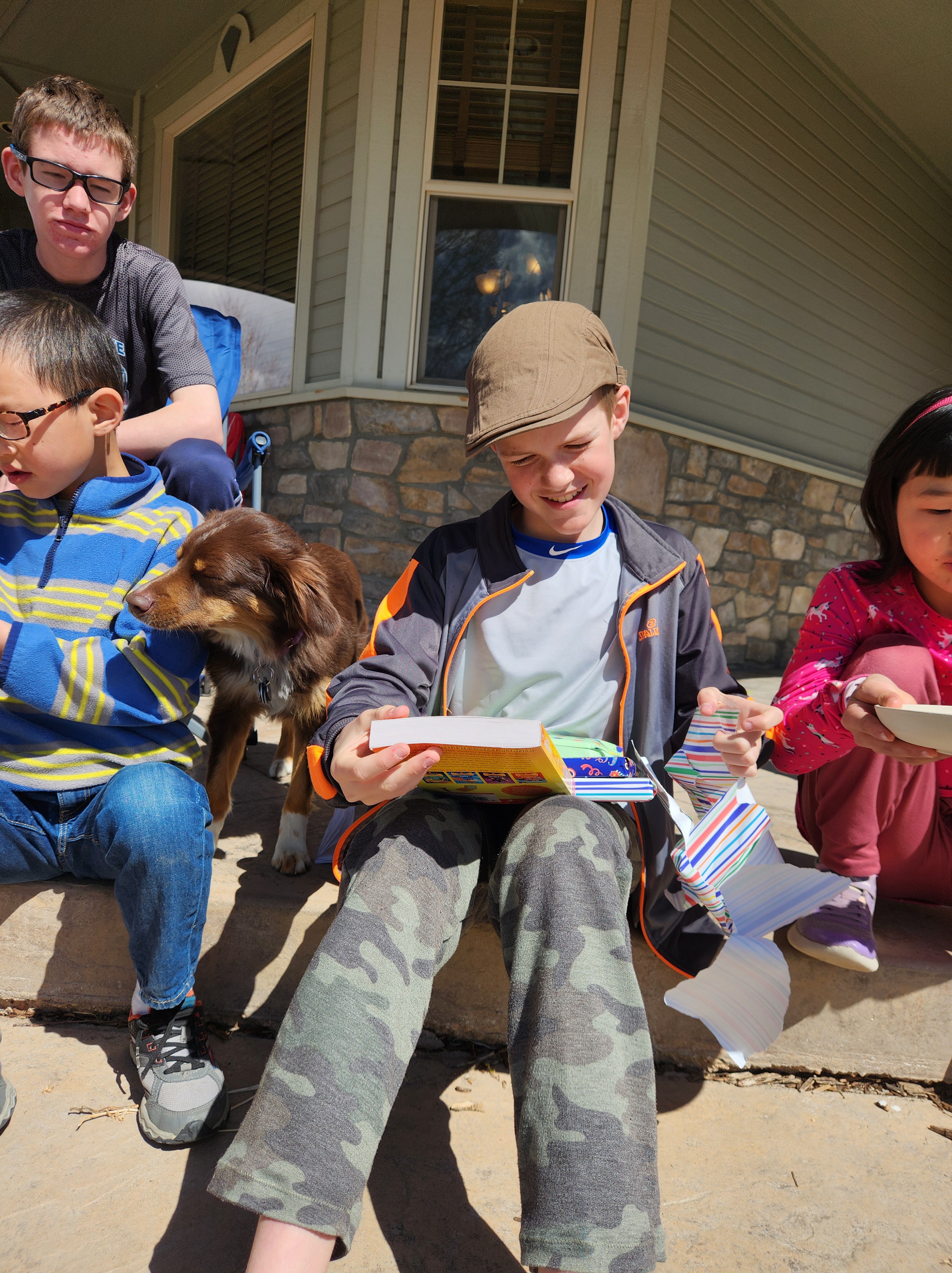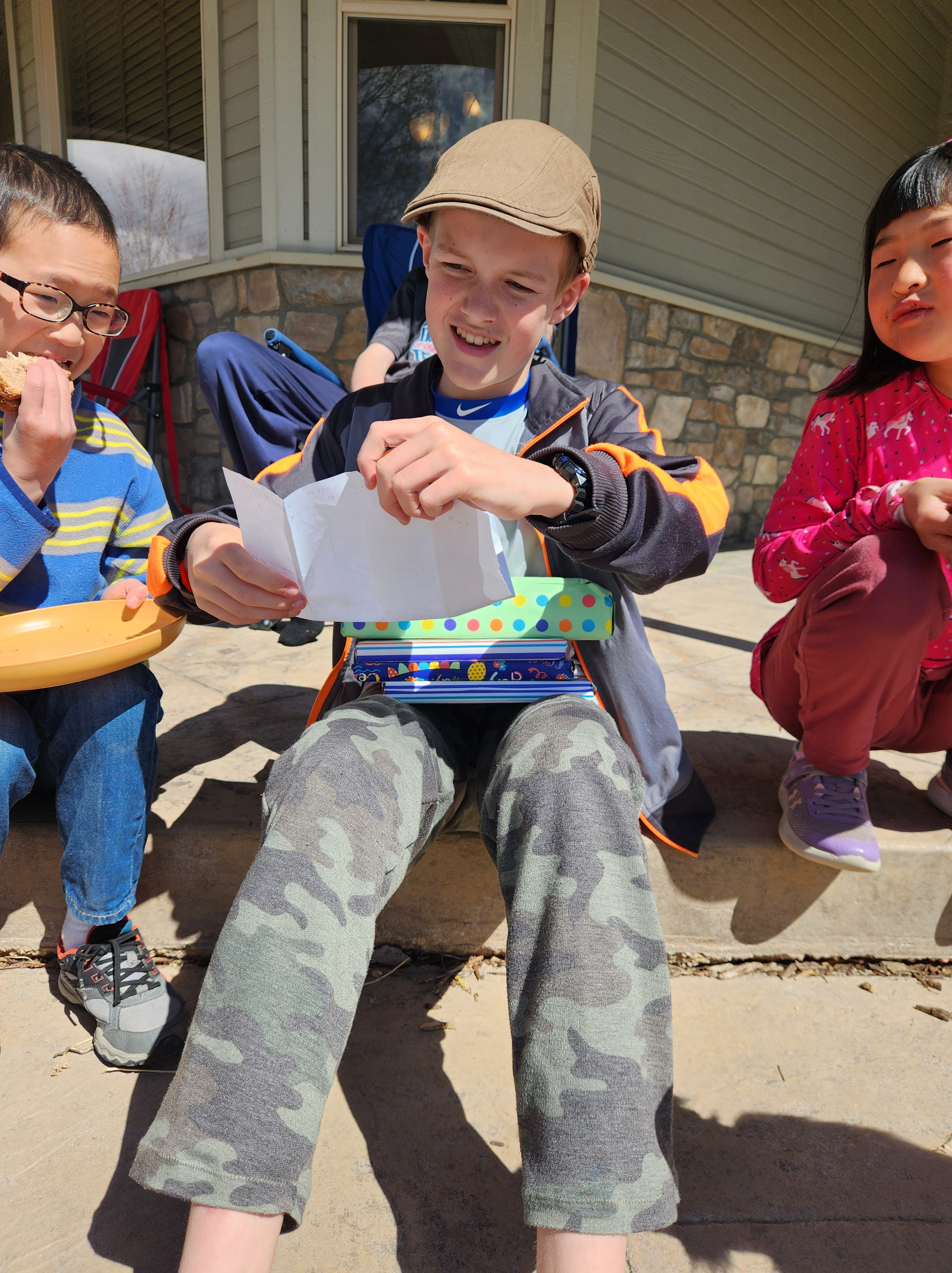 Caedmon turned 12 a couple of weeks ago and we had a fun time celebrating him. He is the first in a 5 month stretch of a birthday a month in our family. As has become tradition we spent an evening at the Colorado Ballet performance, this year it was Coppelia. We really enjoyed watching it and having a fun evening together. On his actual birthday the weather was gorgeous and we spent a lot of time outside. Caedmon got some Hardy Boys books and a game from my parents, a number of books from his siblings and some legos from Clint’s parents. He also got a Gabb Watch from Clint and I. It allows him to make calls and text but has no other internet or the ability to get online or anything. Given his age it is exactly what he needs right now and he was very excited about it. As is the tradition in our family we take each kid when they turn 12 on a trip, and Caedmon’s trip is coming up in June. He has decided he wants to go to Seattle and see Pacific Northwest Ballet perform and we will get to see their performance of Coppelia. So we are looking forward to that. Crazy to realize he is 12, but he is growing and having fun and brings so much life to each day. I’ve heard it rumored that the older high school boys are jealous of him when there is a all youth event because he always manages to have a gaggle of girls trailing after him.